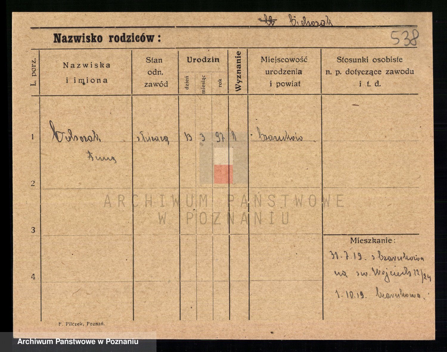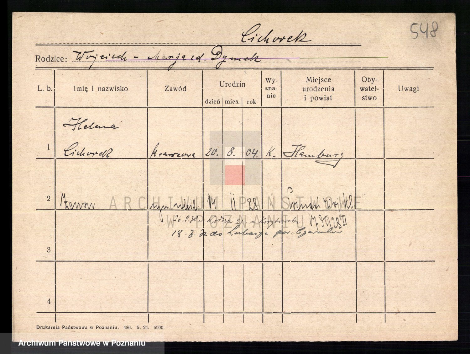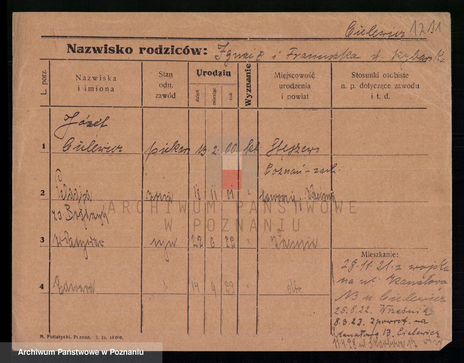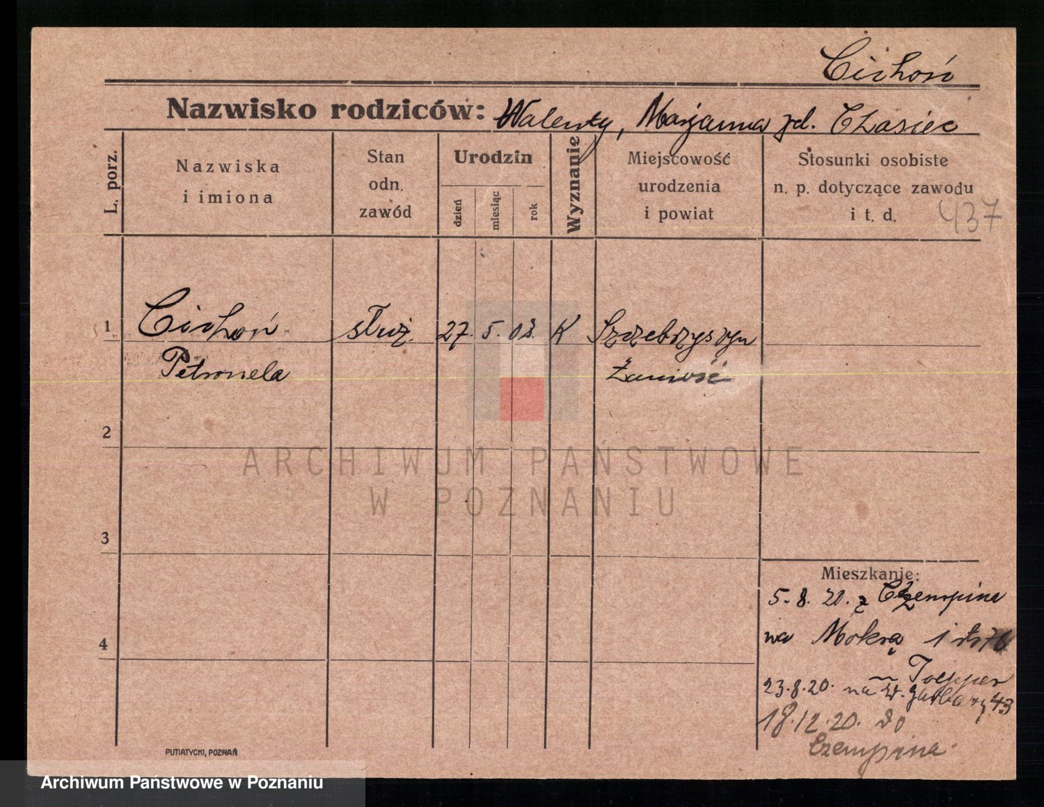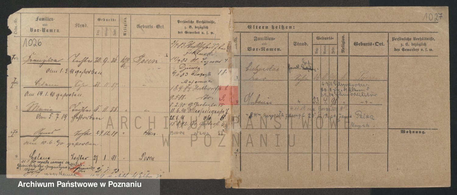 Podgląd karty osobowej dostępny jest po kliknięciu na nazwisko lub ikonkę karty. Można dokonywać powiększenia (ikony na górze) lub przechodzić między kolejnymi skanami (strzałki po bokach).
