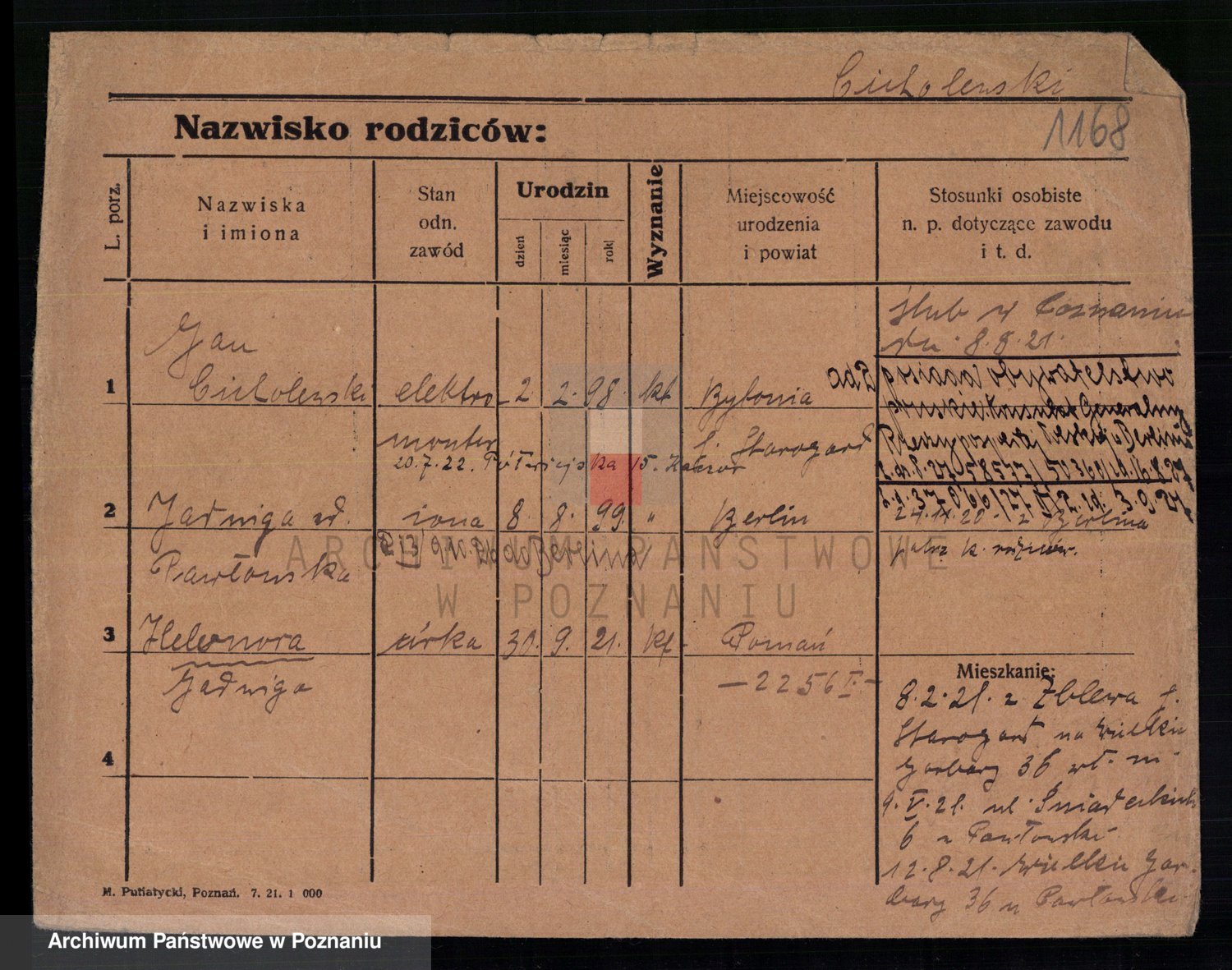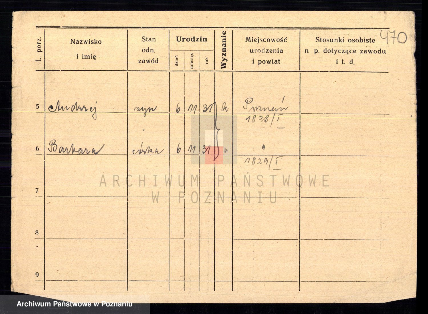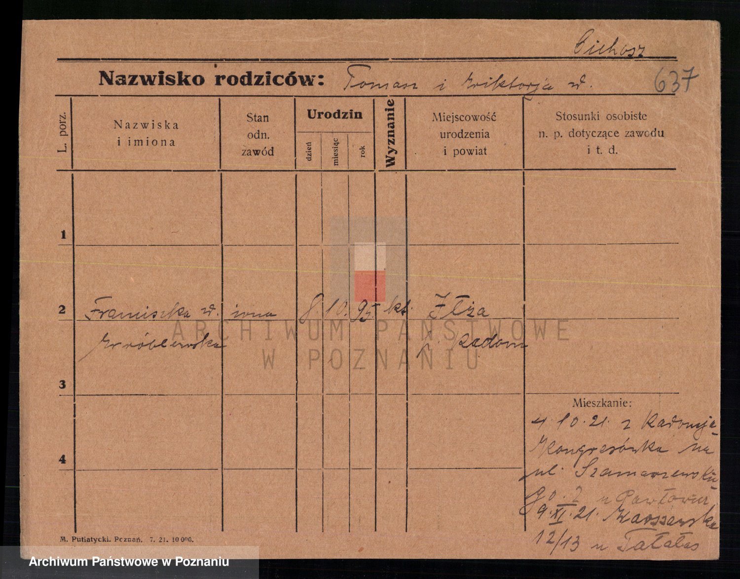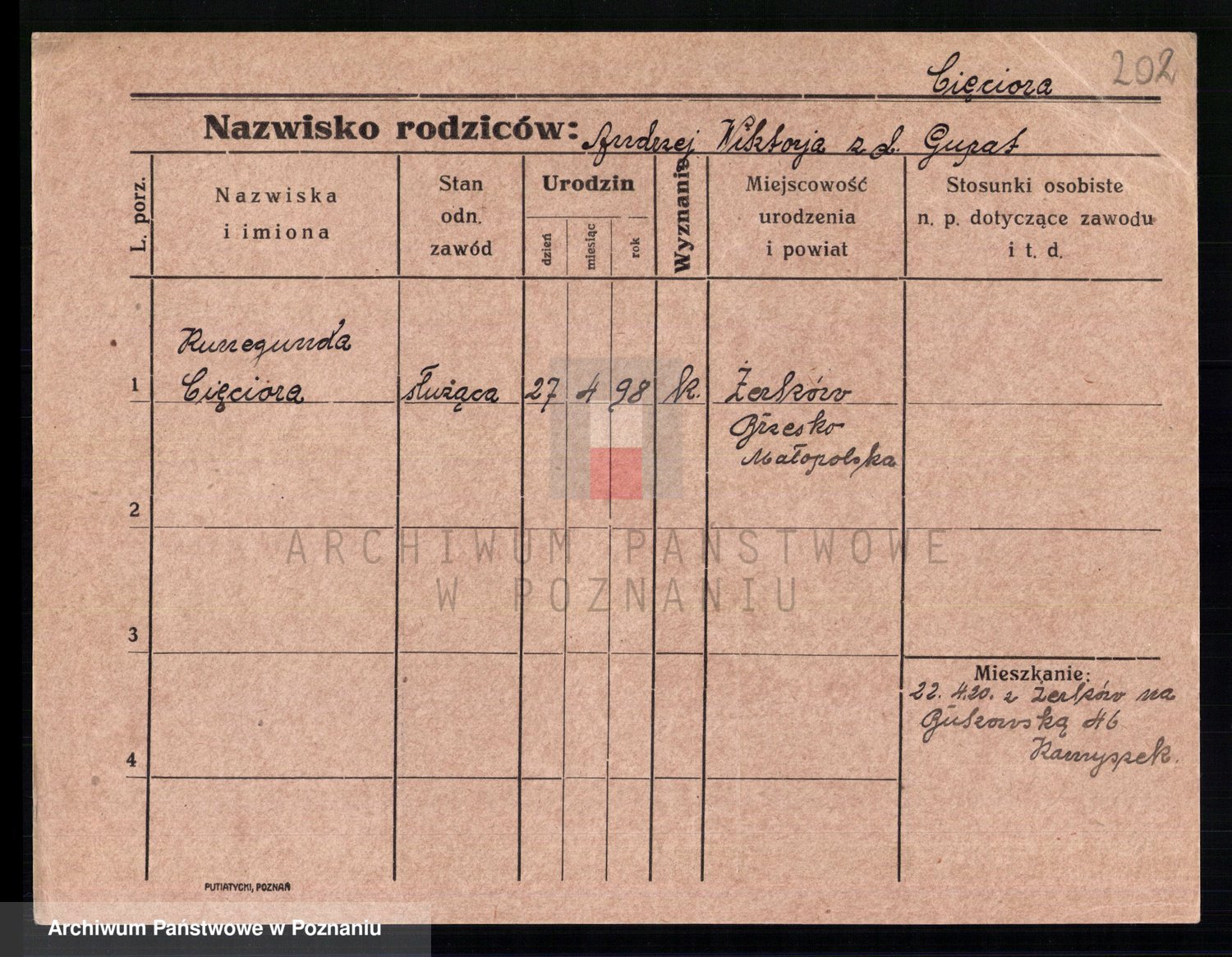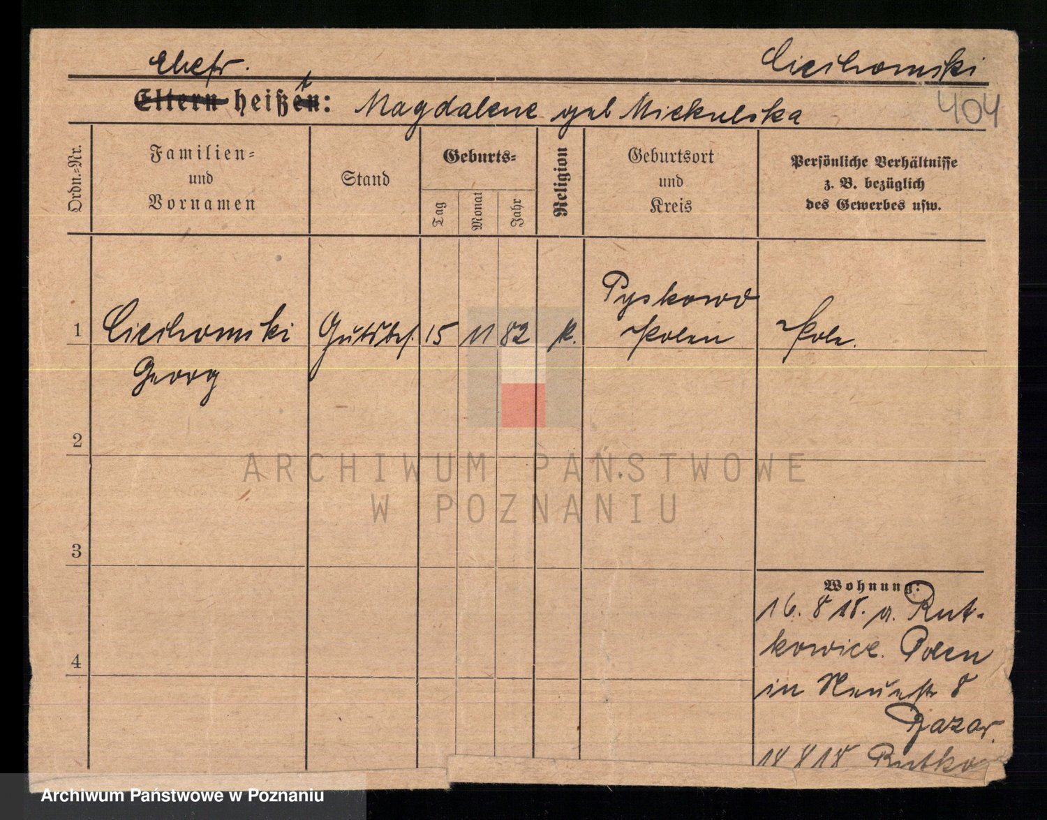 Podgląd karty osobowej dostępny jest po kliknięciu na nazwisko lub ikonkę karty. Można dokonywać powiększenia (ikony na górze) lub przechodzić między kolejnymi skanami (strzałki po bokach).