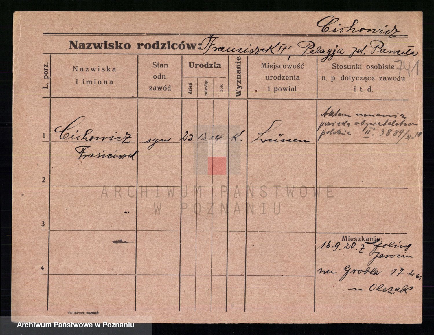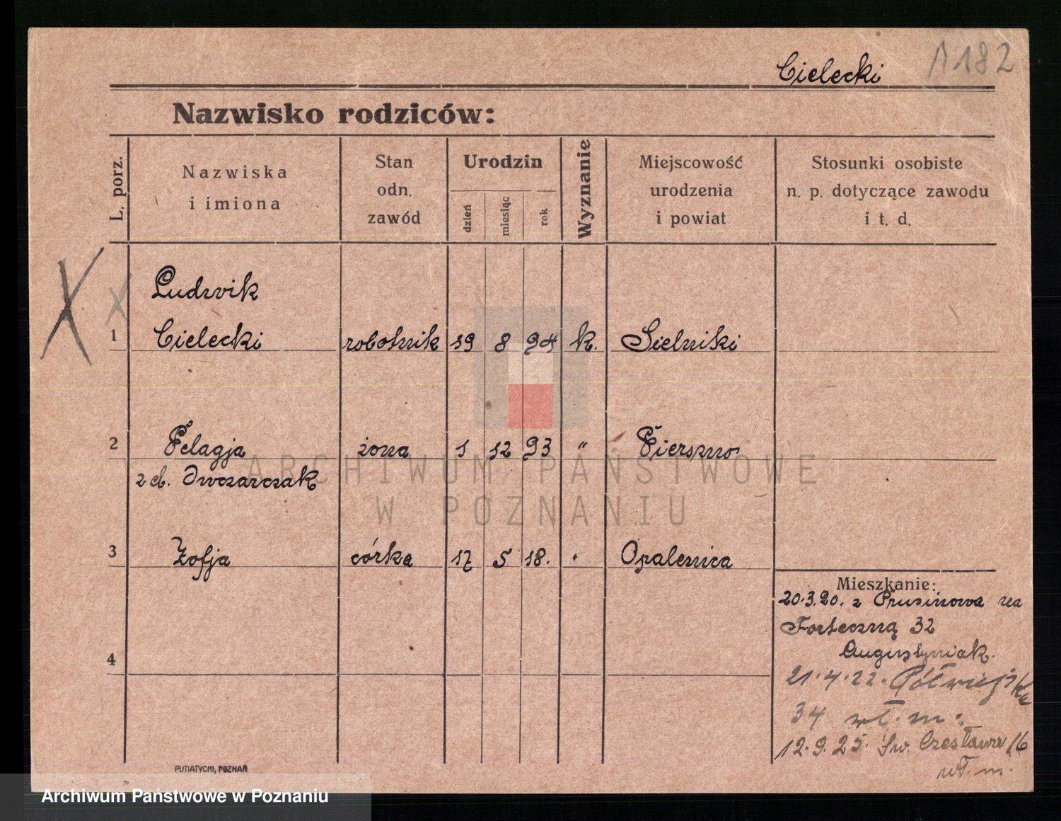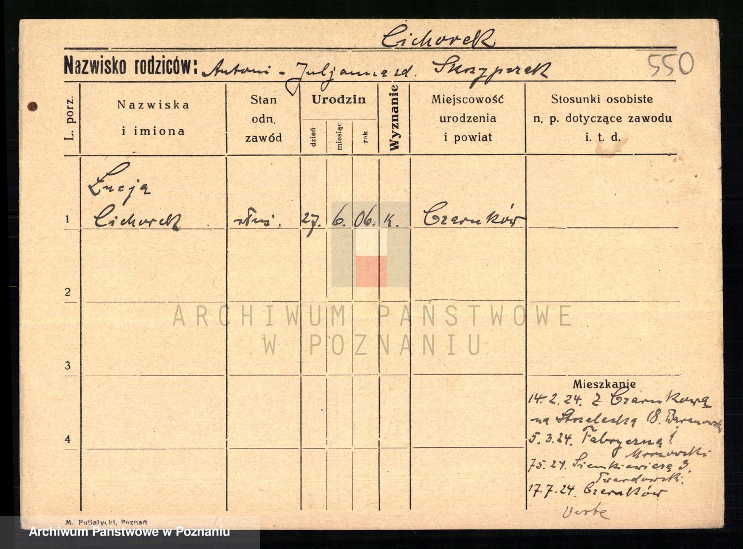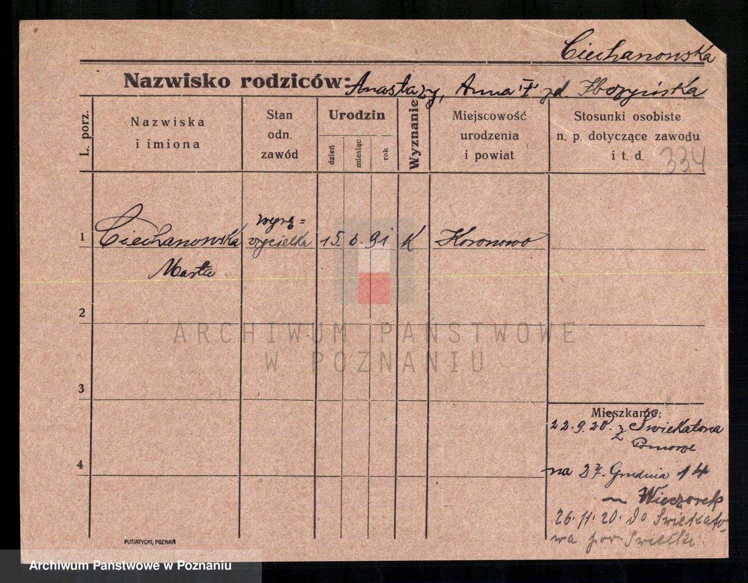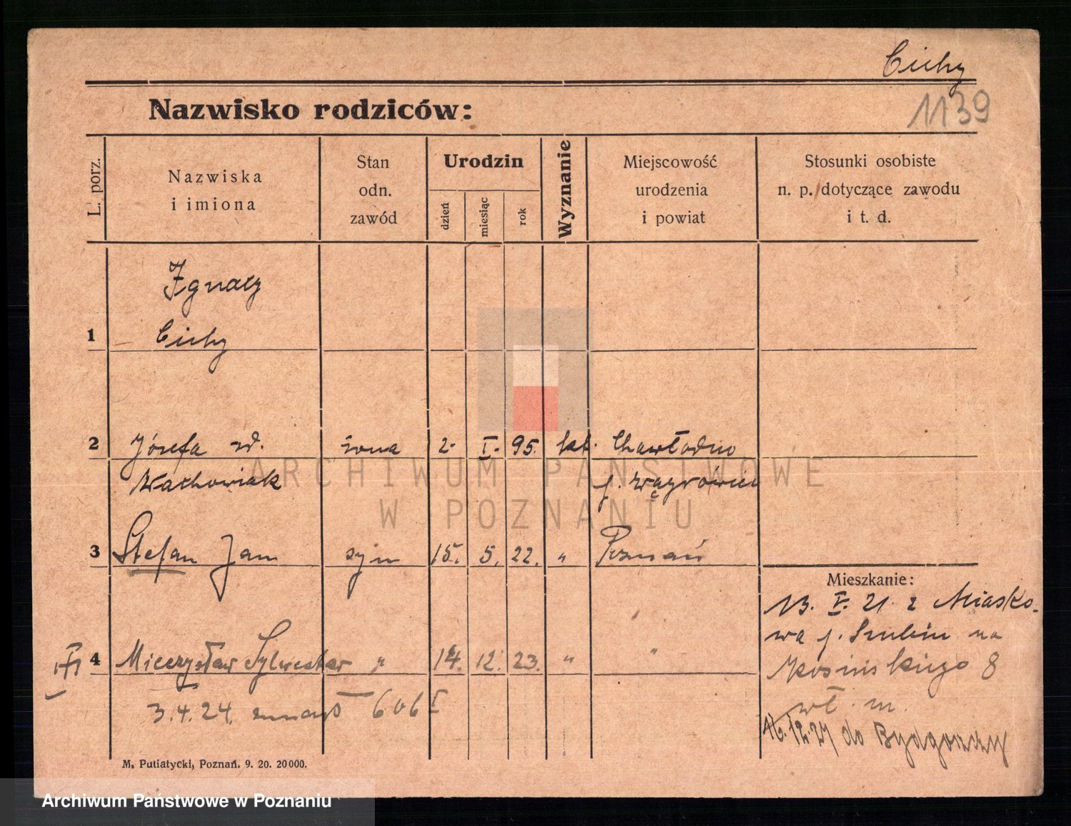 Podgląd karty osobowej dostępny jest po kliknięciu na nazwisko lub ikonkę karty. Można dokonywać powiększenia (ikony na górze) lub przechodzić między kolejnymi skanami (strzałki po bokach).
