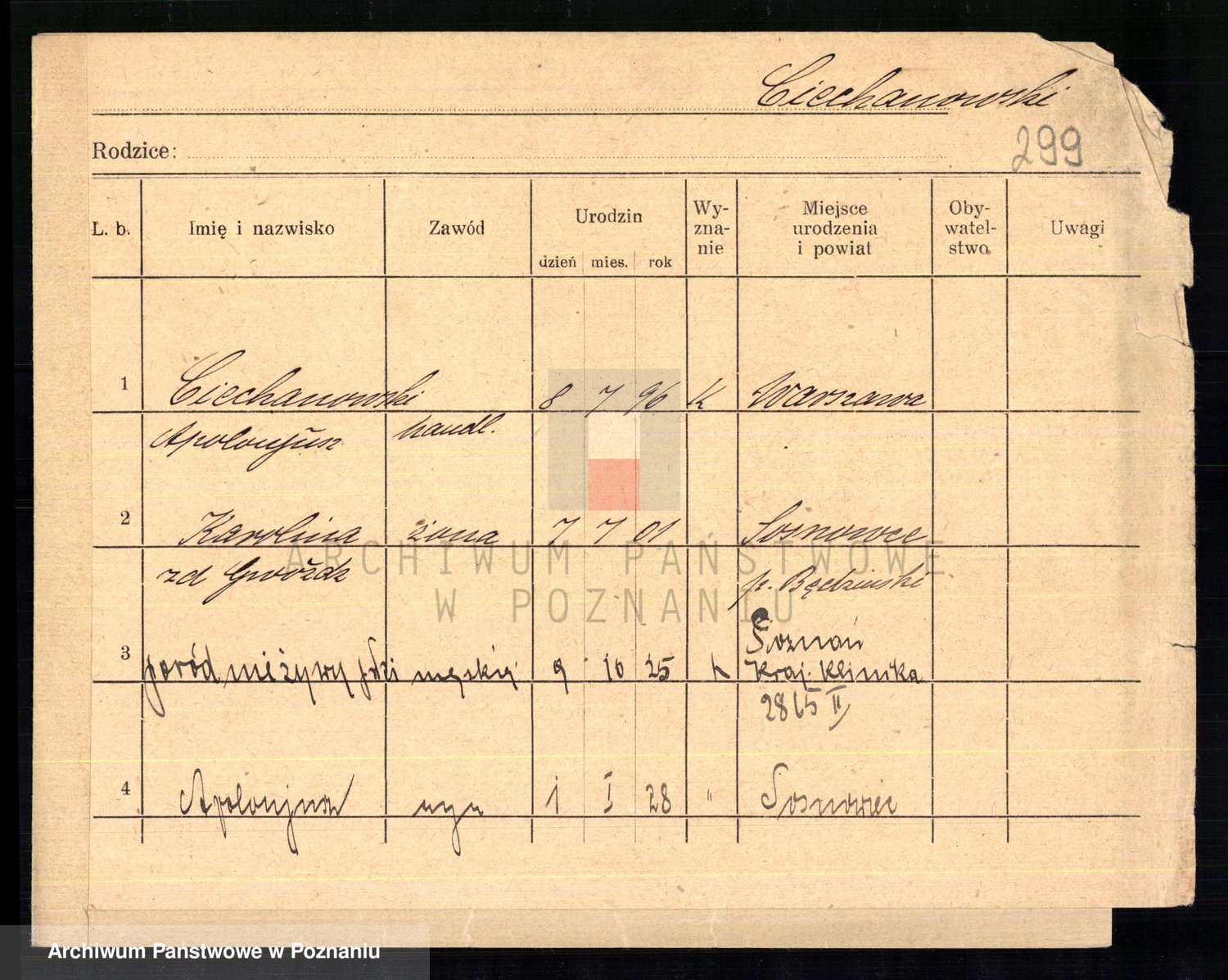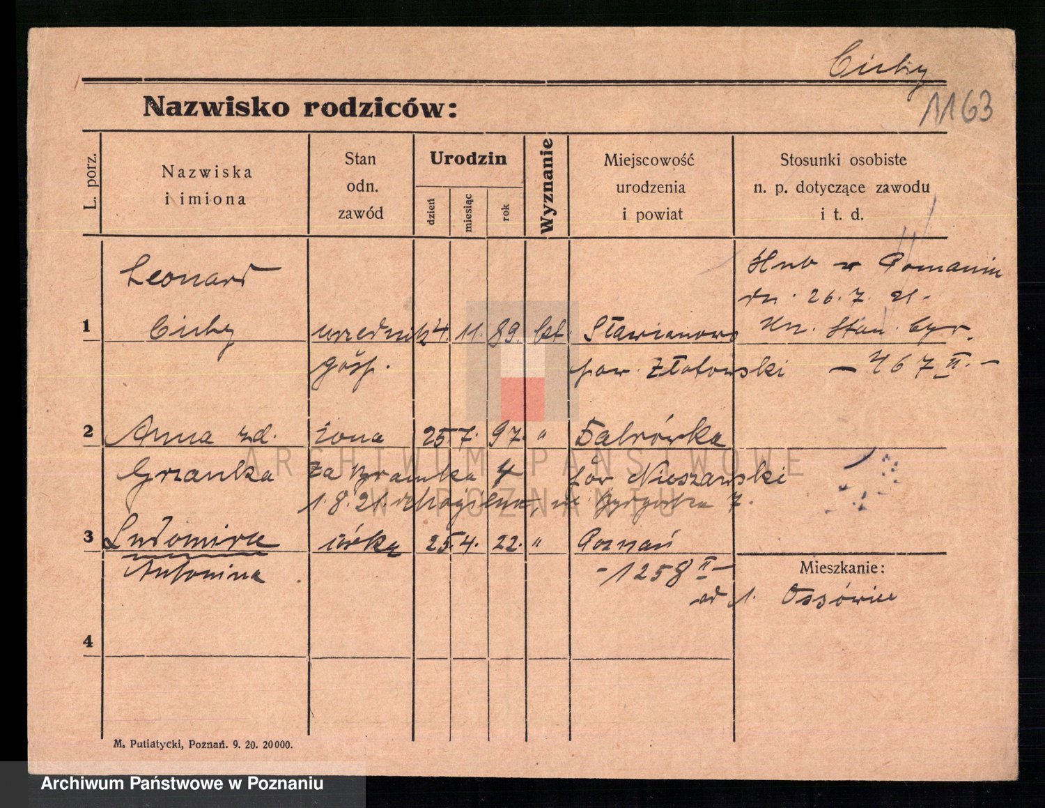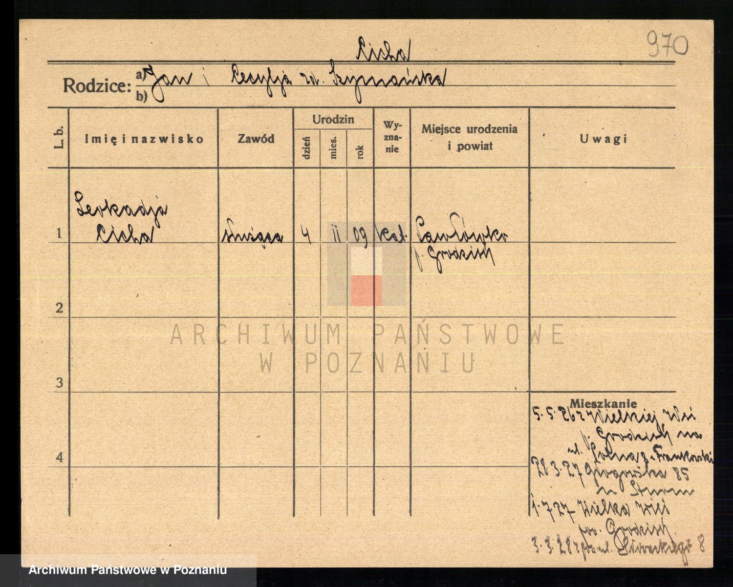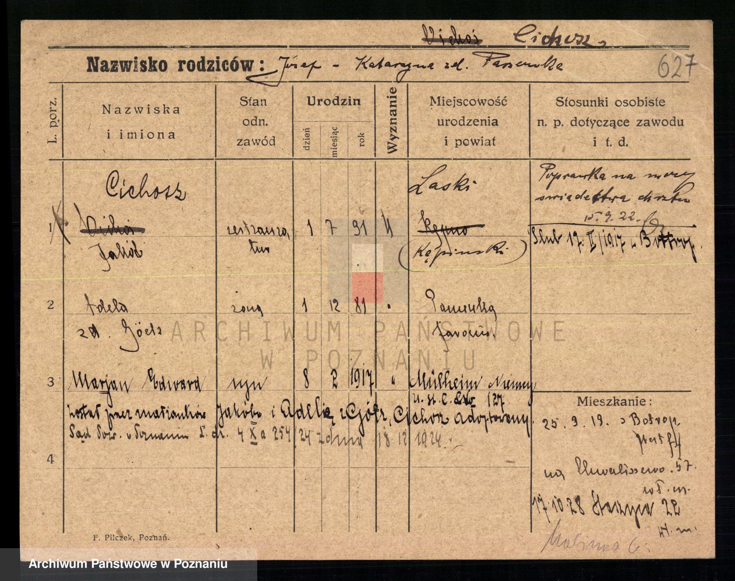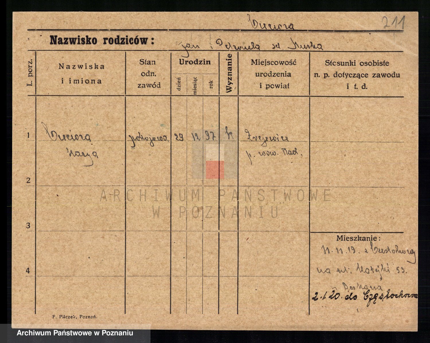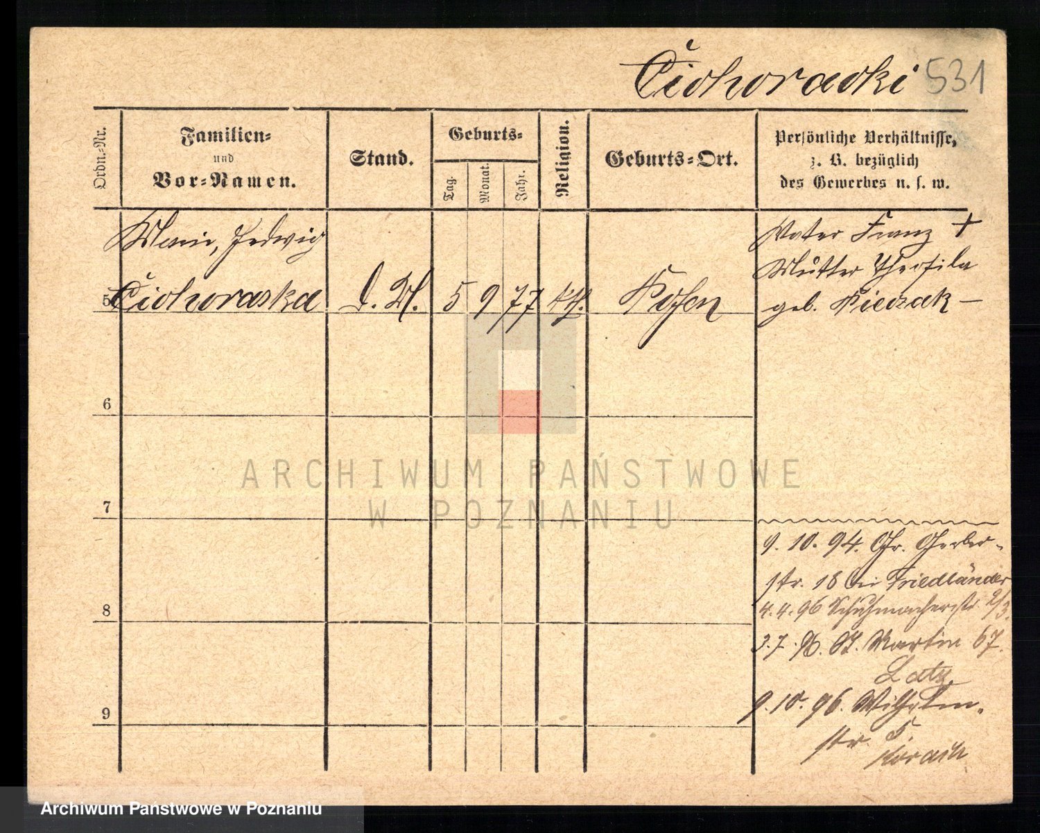 Podgląd karty osobowej dostępny jest po kliknięciu na nazwisko lub ikonkę karty. Można dokonywać powiększenia (ikony na górze) lub przechodzić między kolejnymi skanami (strzałki po bokach).
