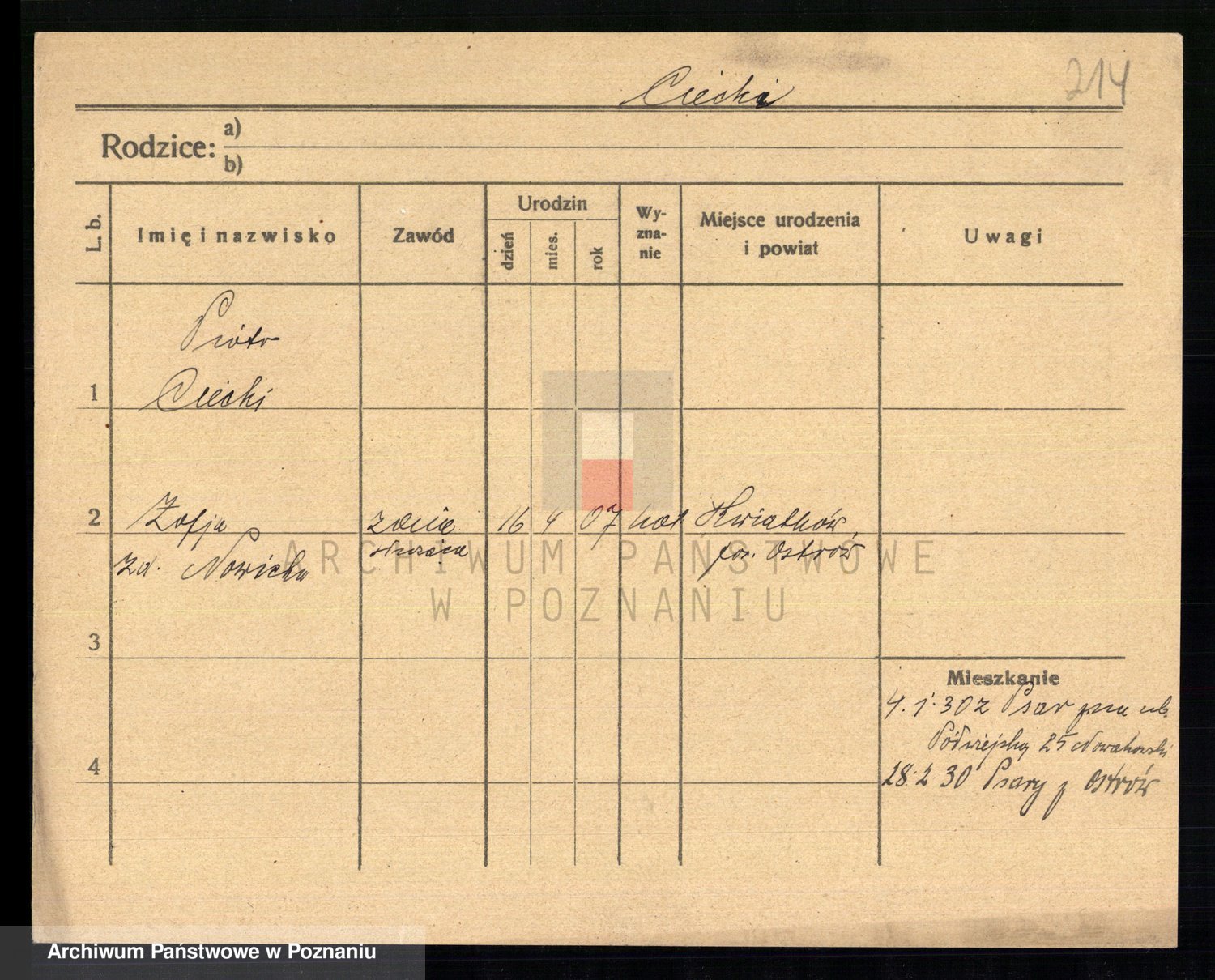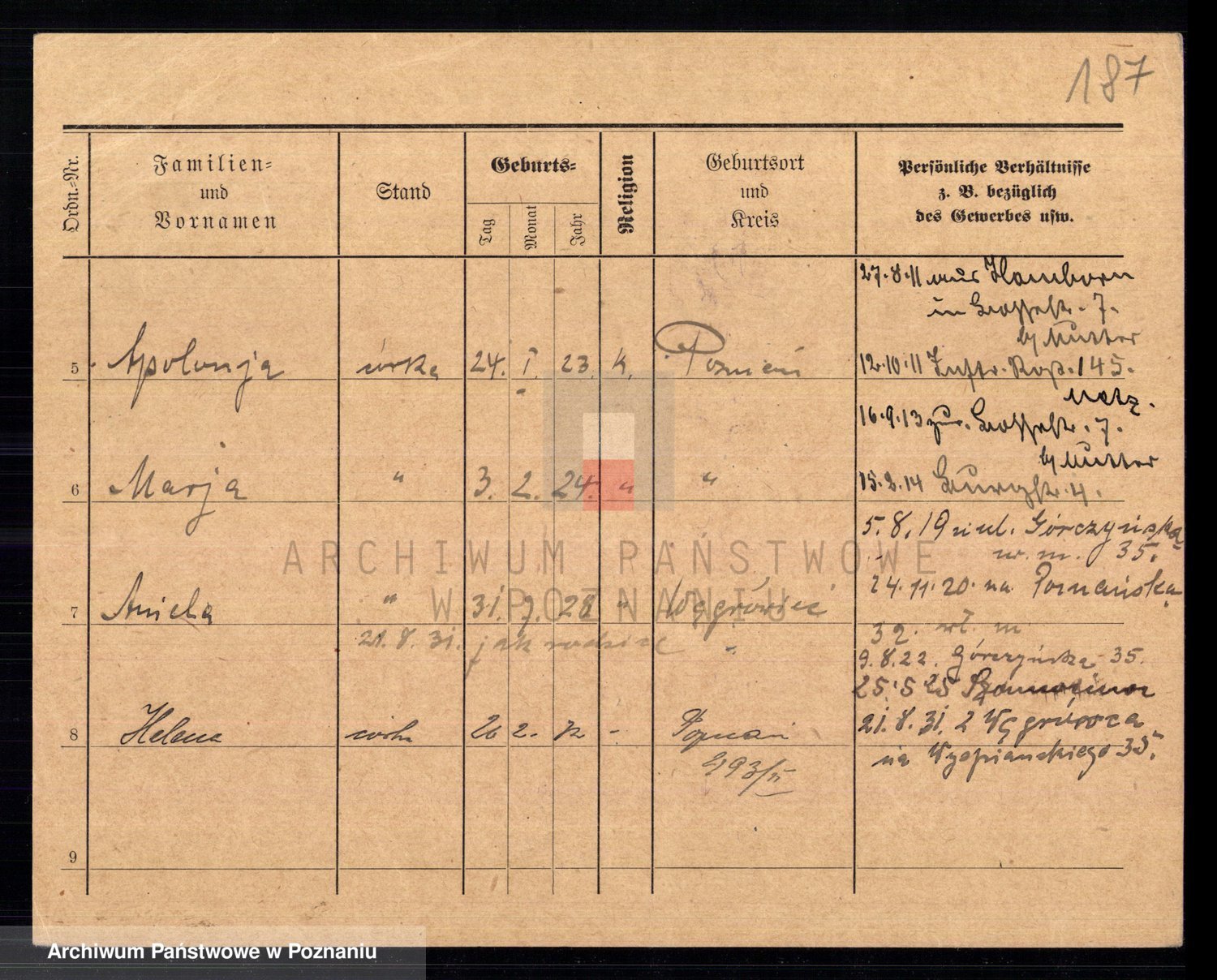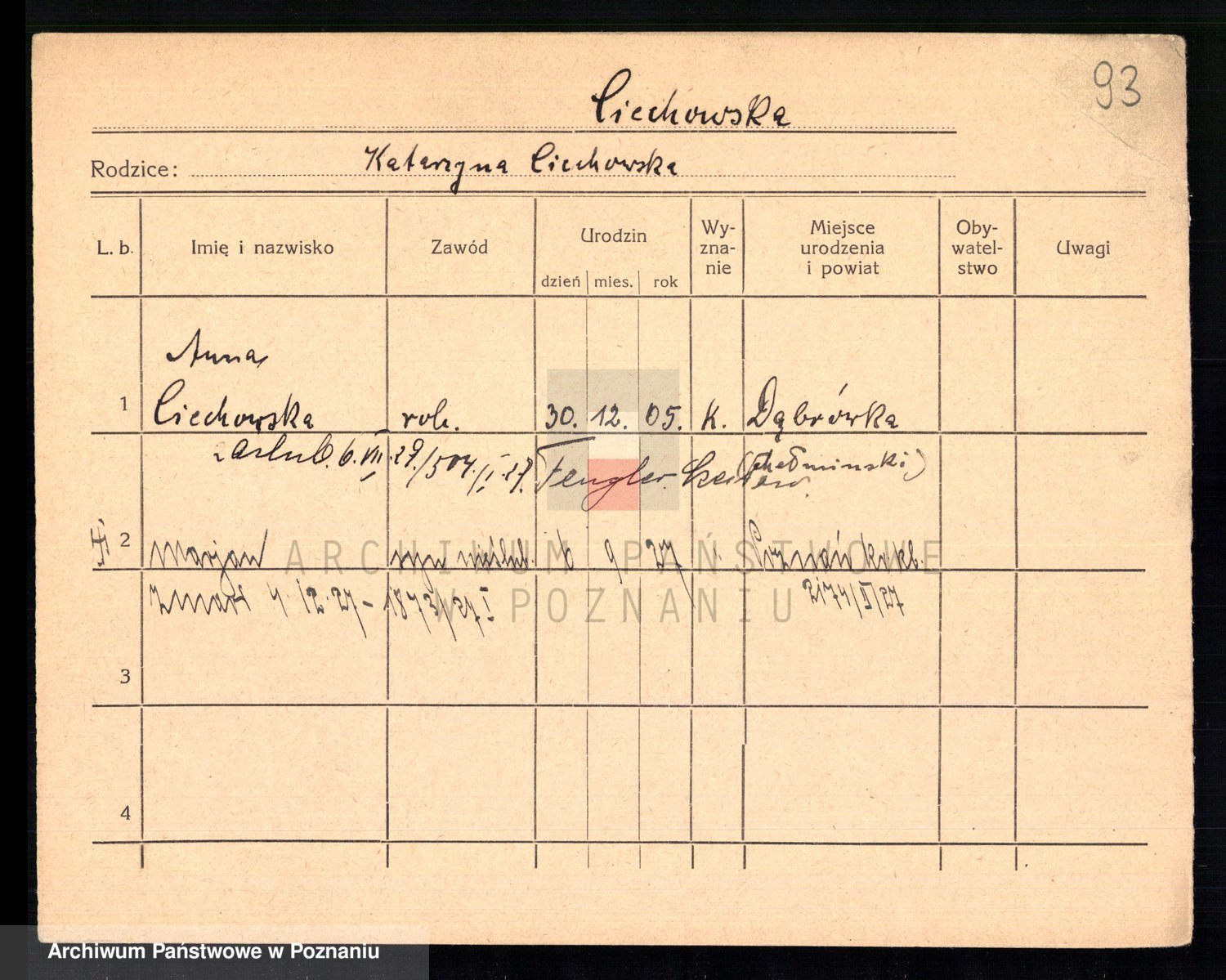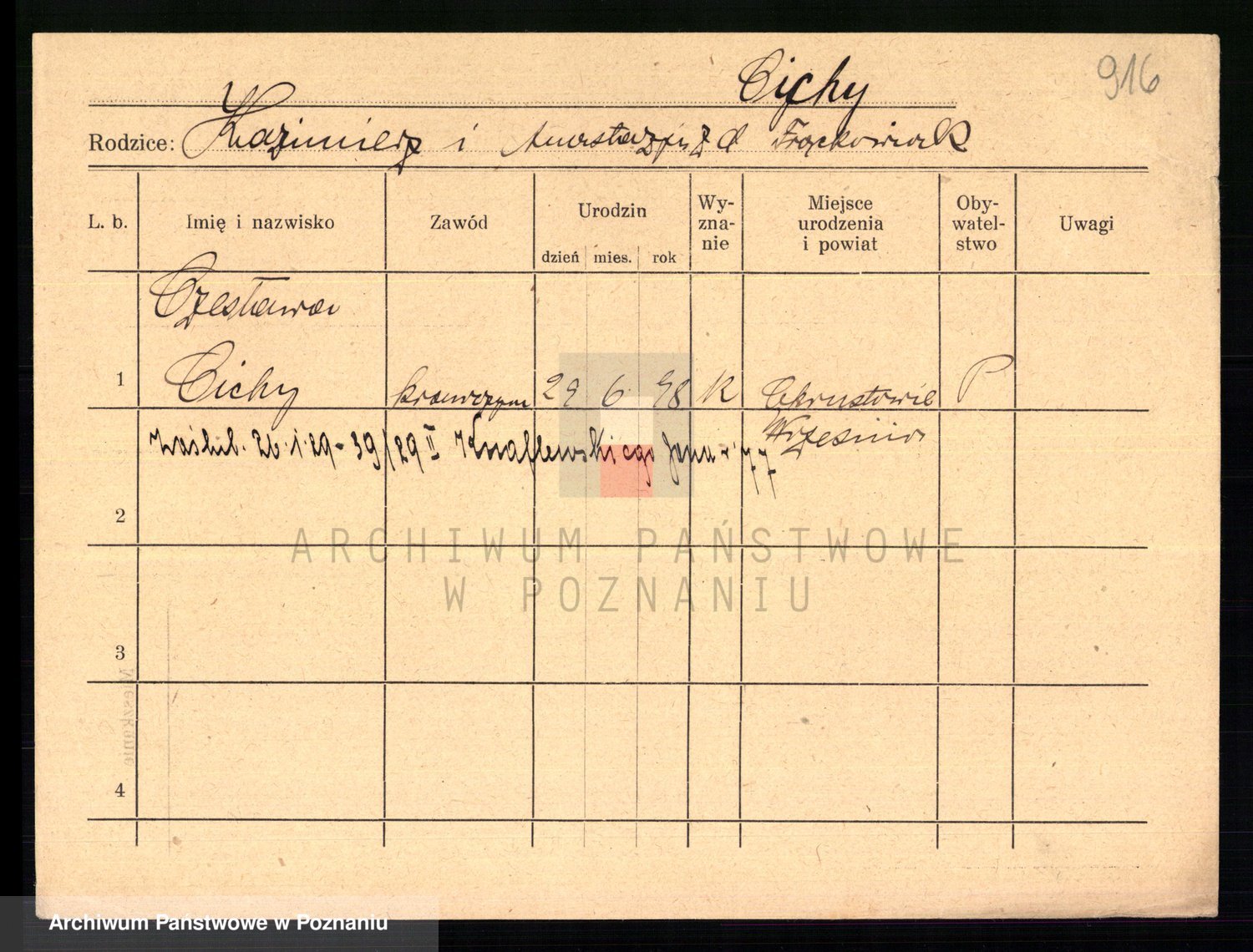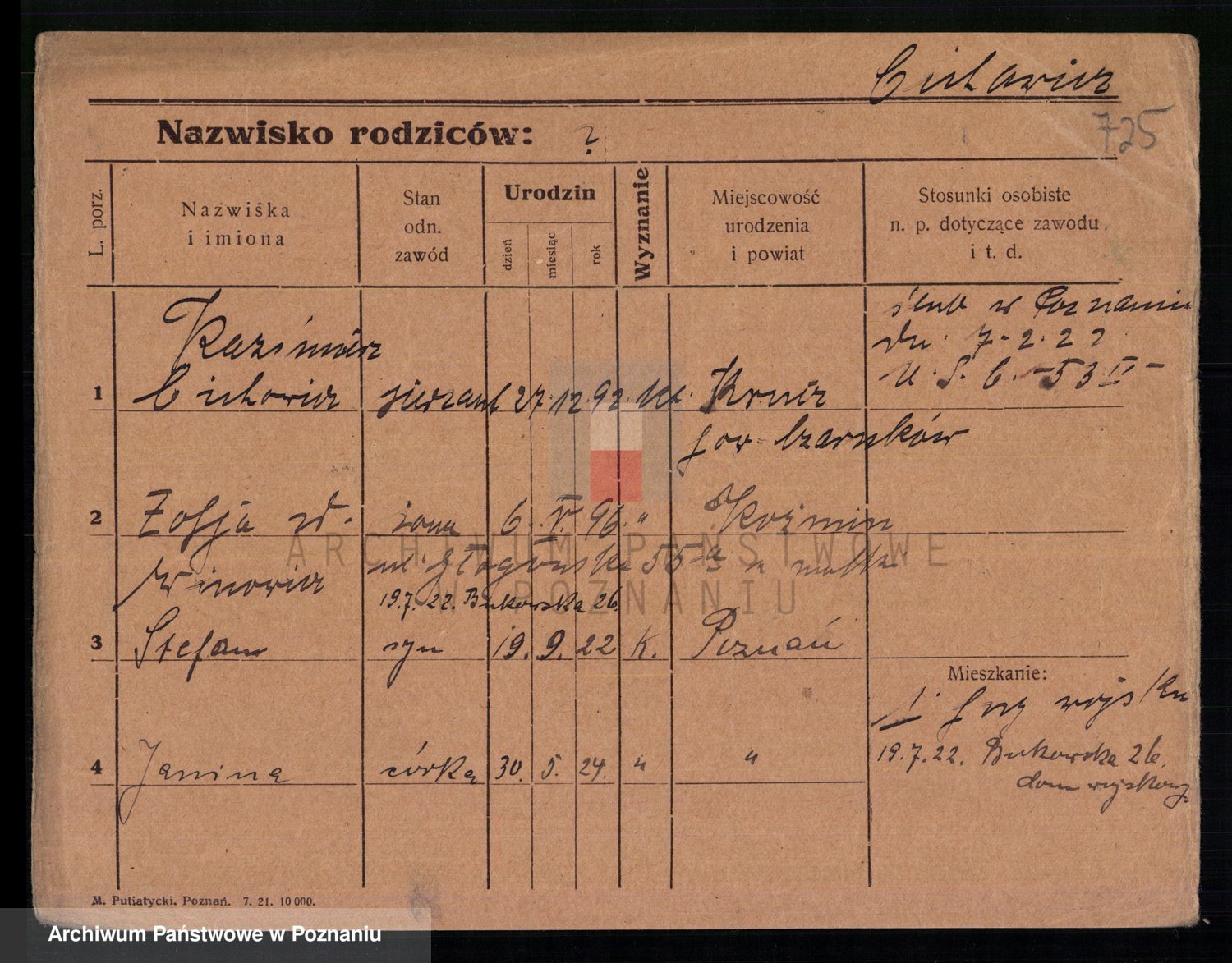 Podgląd karty osobowej dostępny jest po kliknięciu na nazwisko lub ikonkę karty. Można dokonywać powiększenia (ikony na górze) lub przechodzić między kolejnymi skanami (strzałki po bokach).