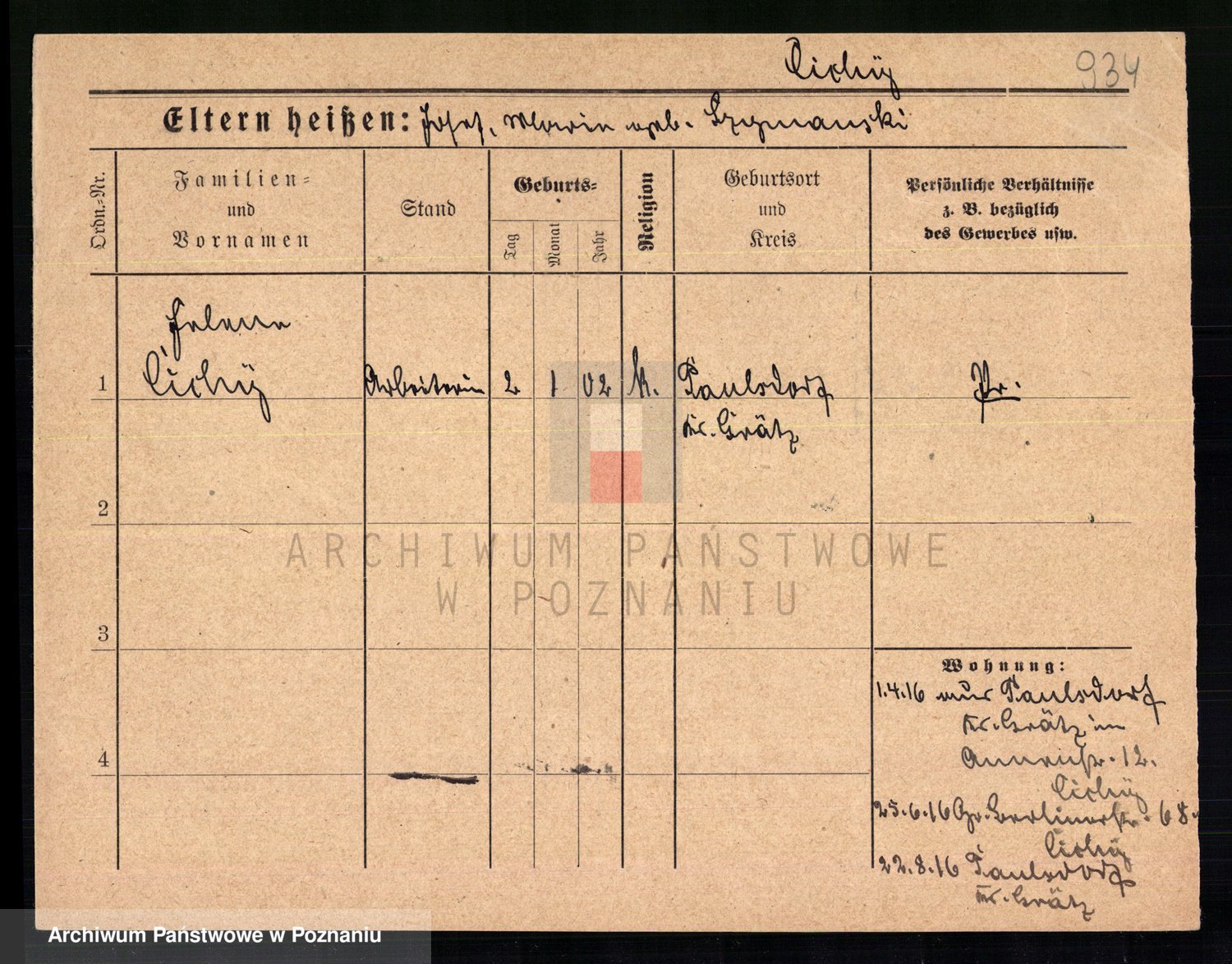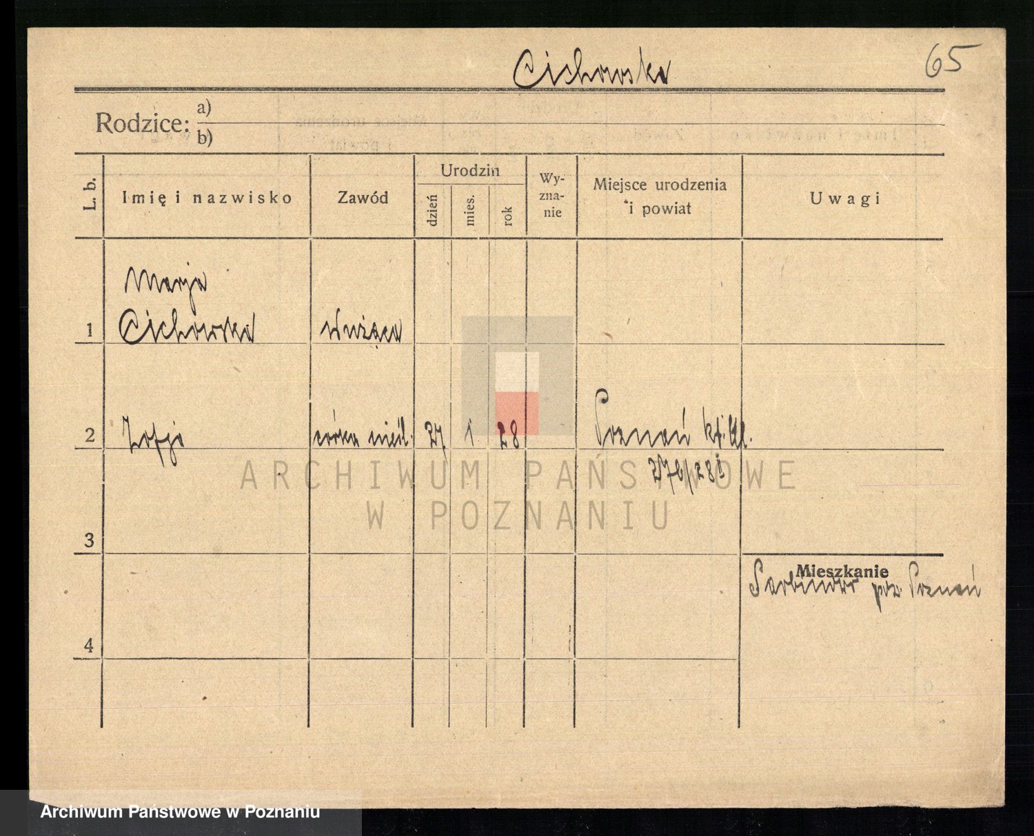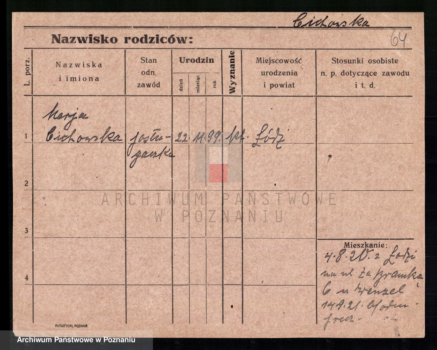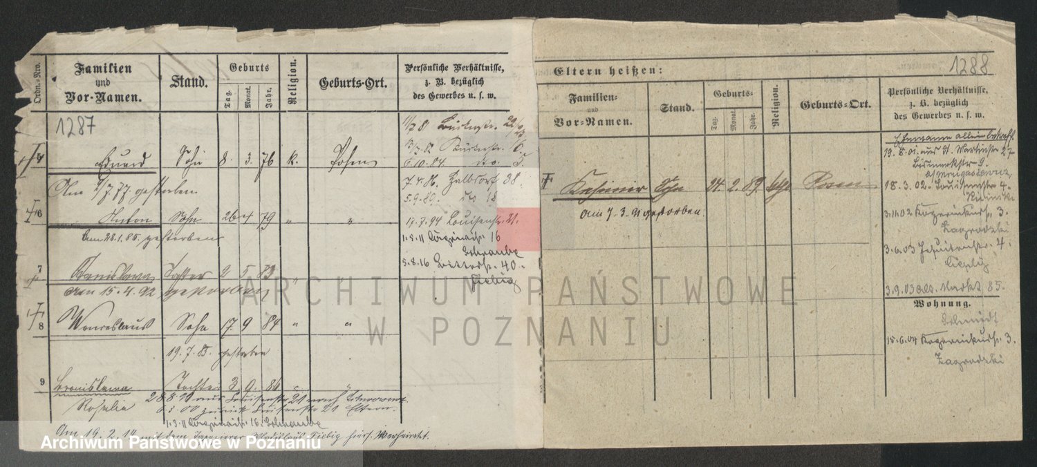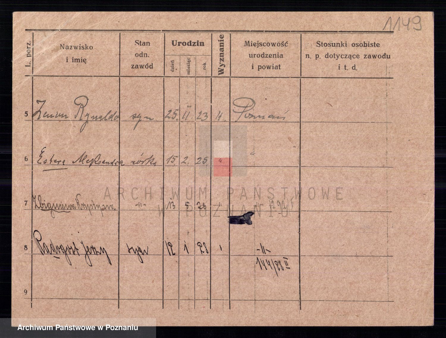 Podgląd karty osobowej dostępny jest po kliknięciu na nazwisko lub ikonkę karty. Można dokonywać powiększenia (ikony na górze) lub przechodzić między kolejnymi skanami (strzałki po bokach).