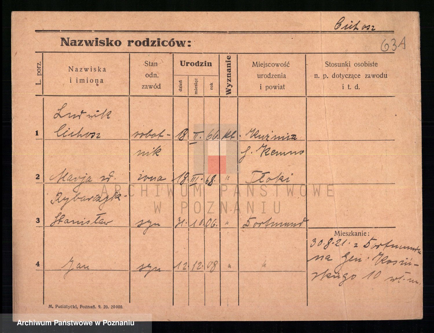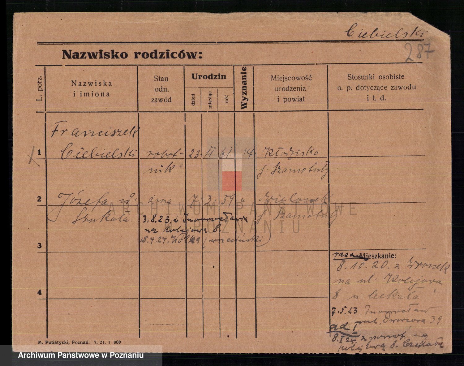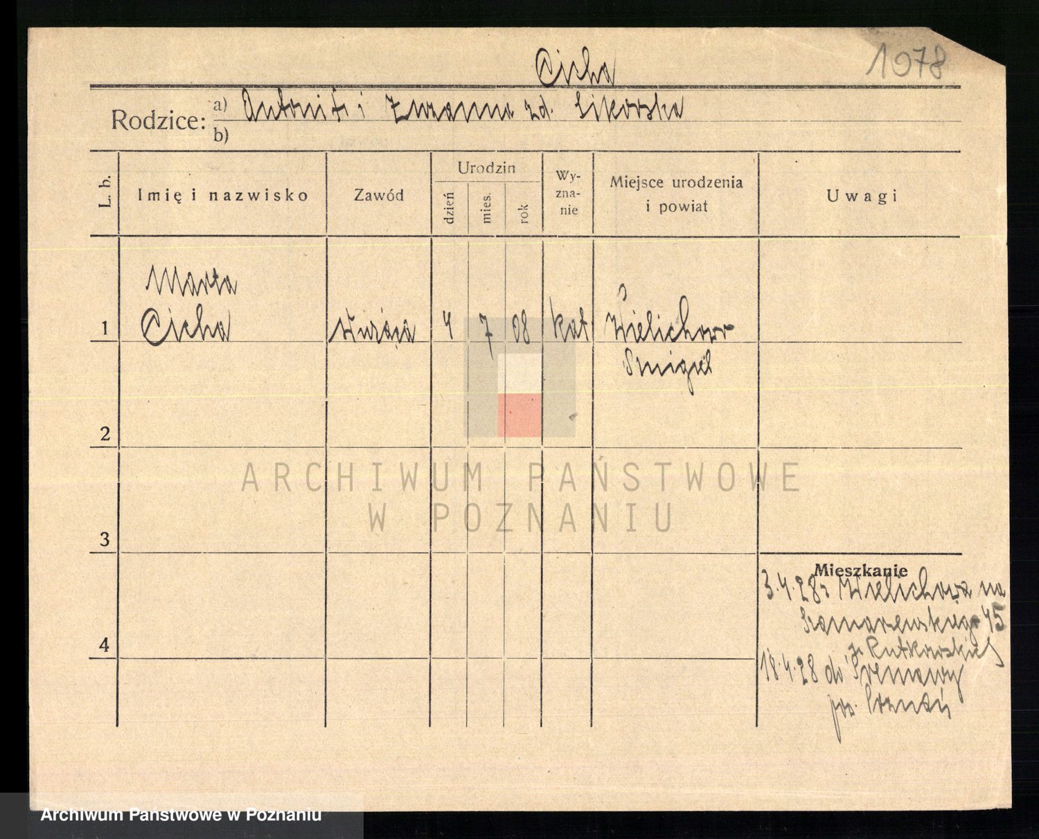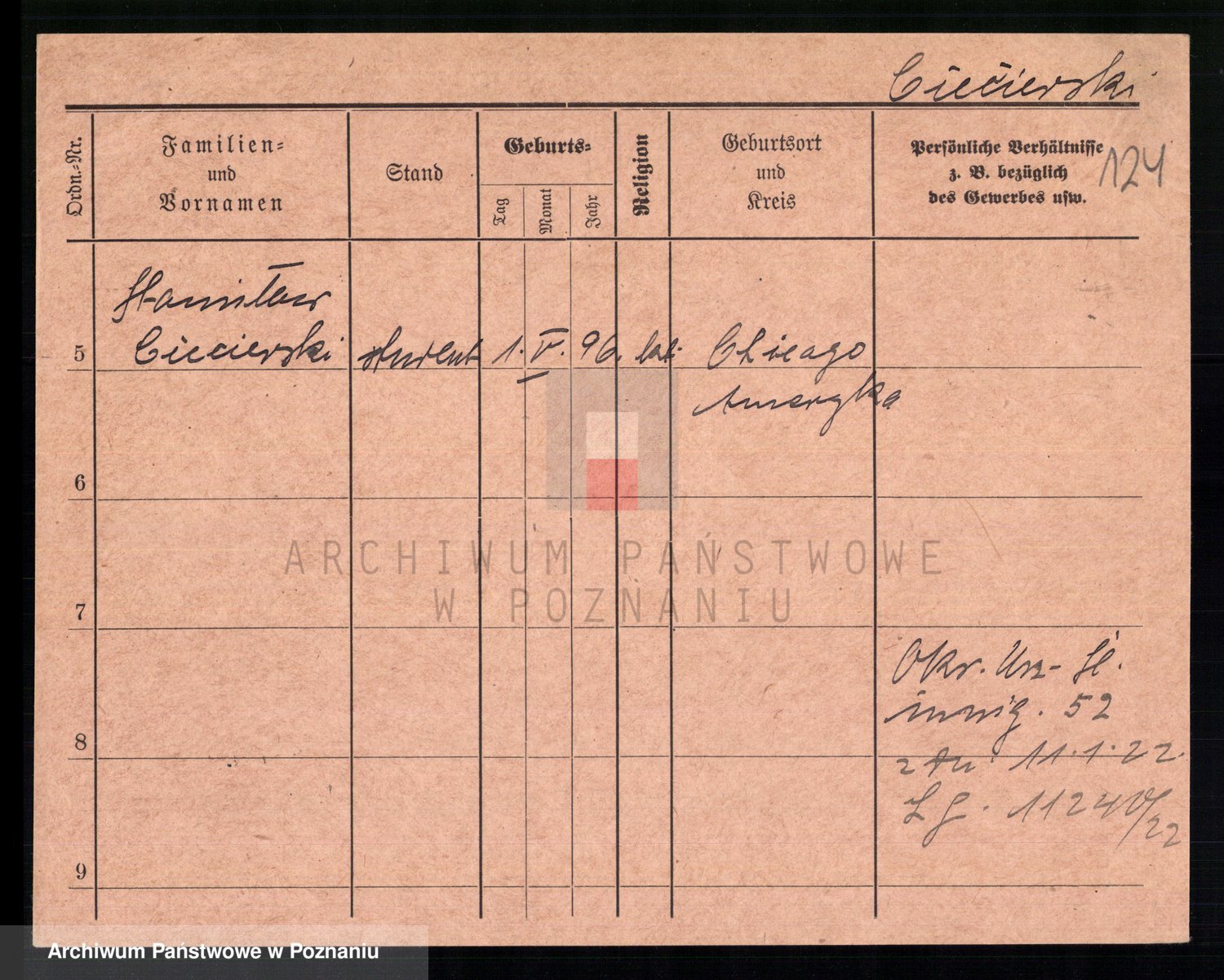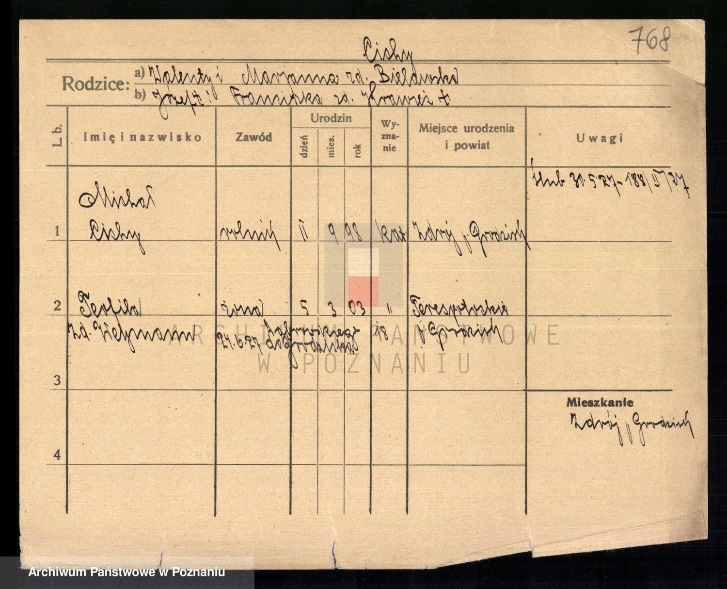 Podgląd karty osobowej dostępny jest po kliknięciu na nazwisko lub ikonkę karty. Można dokonywać powiększenia (ikony na górze) lub przechodzić między kolejnymi skanami (strzałki po bokach).