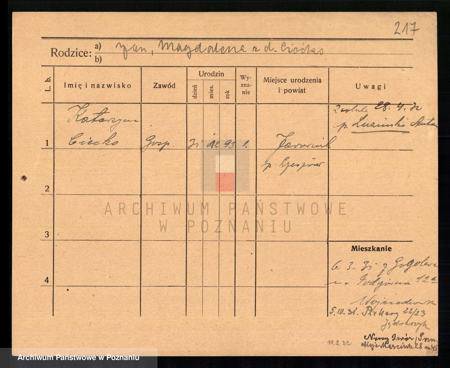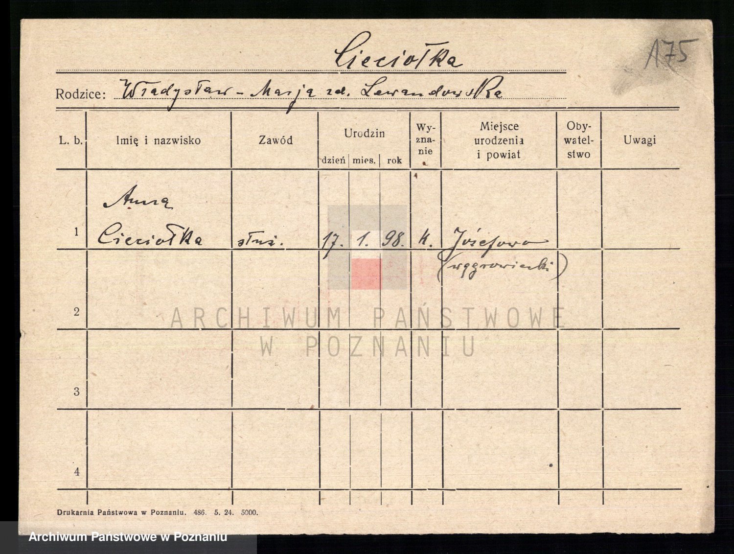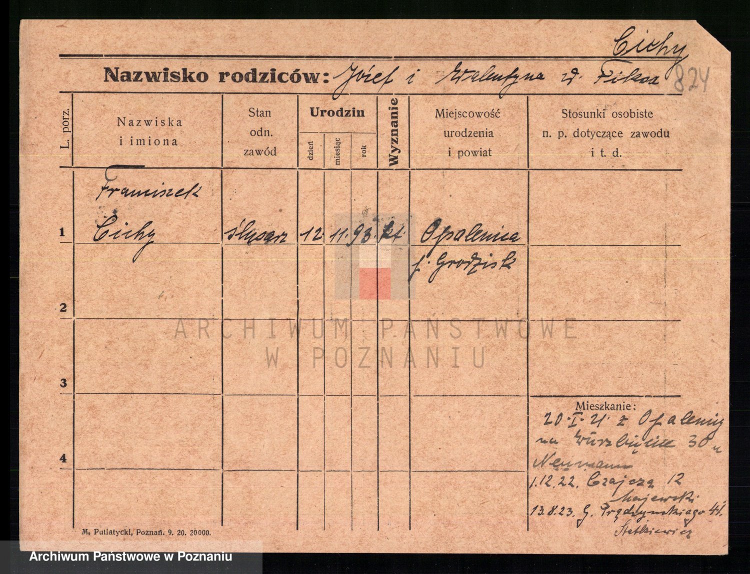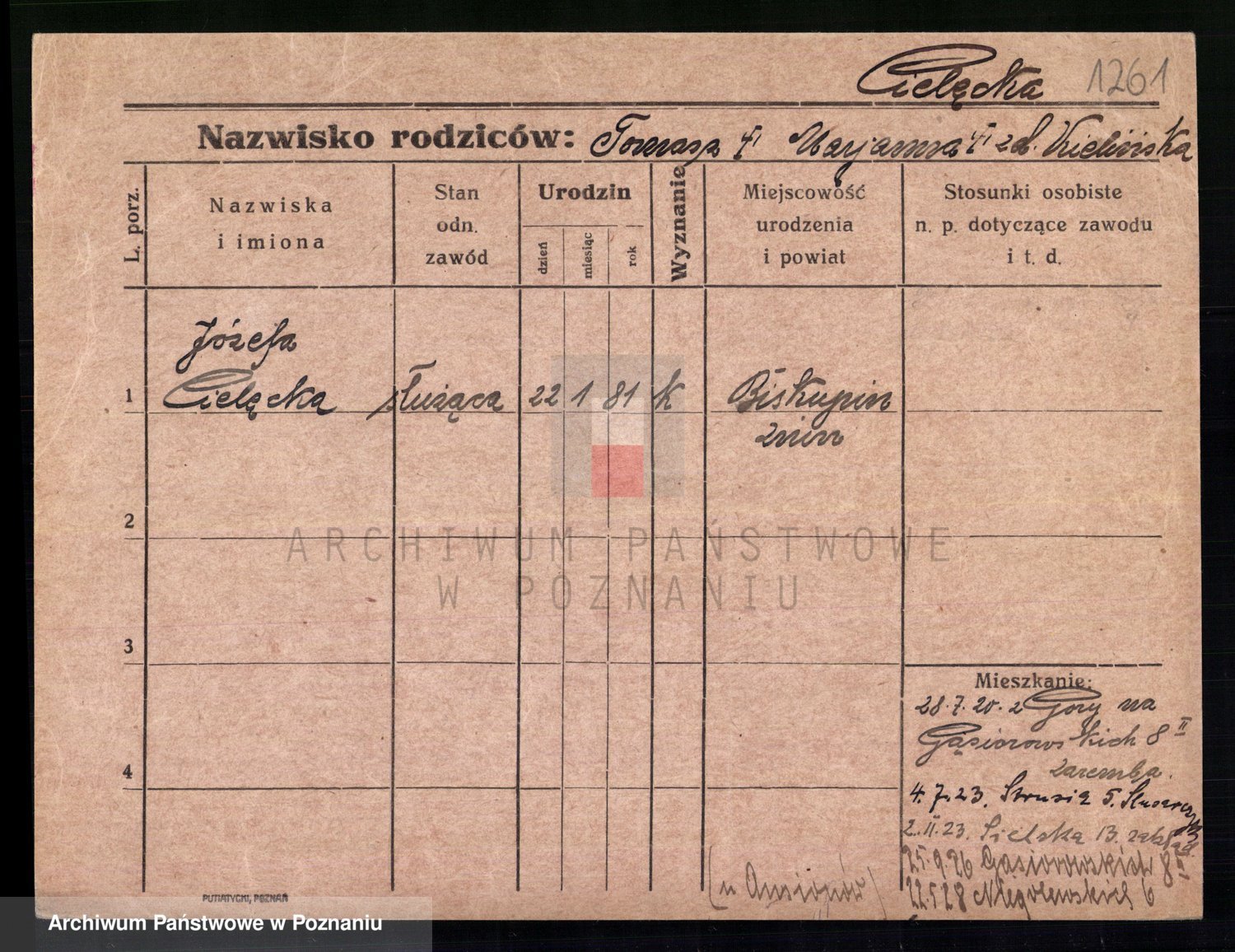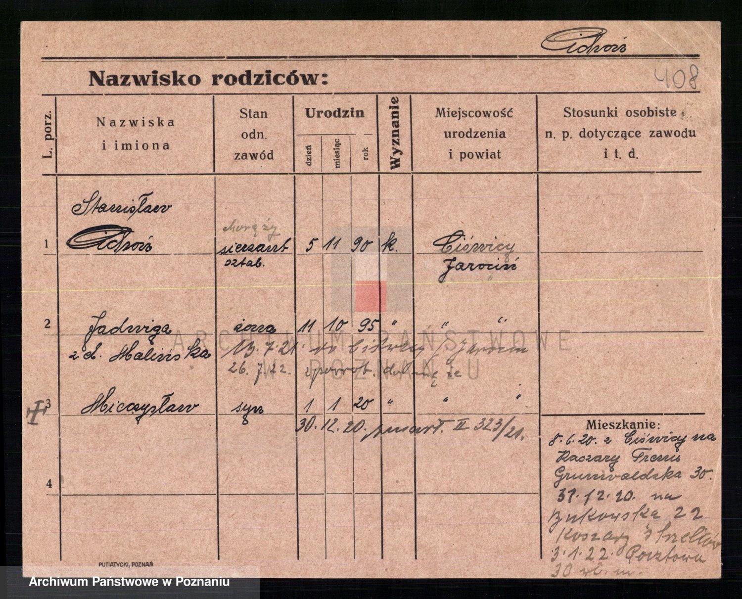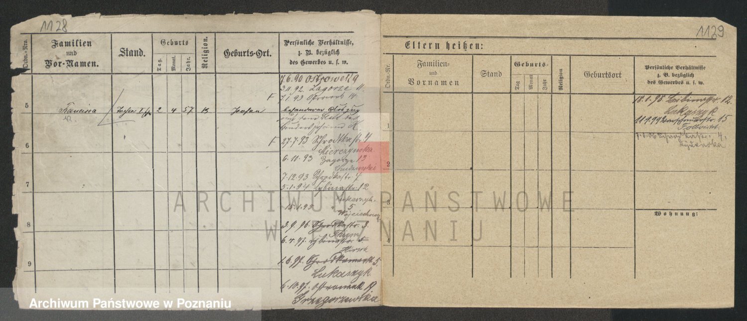 Podgląd karty osobowej dostępny jest po kliknięciu na nazwisko lub ikonkę karty. Można dokonywać powiększenia (ikony na górze) lub przechodzić między kolejnymi skanami (strzałki po bokach).