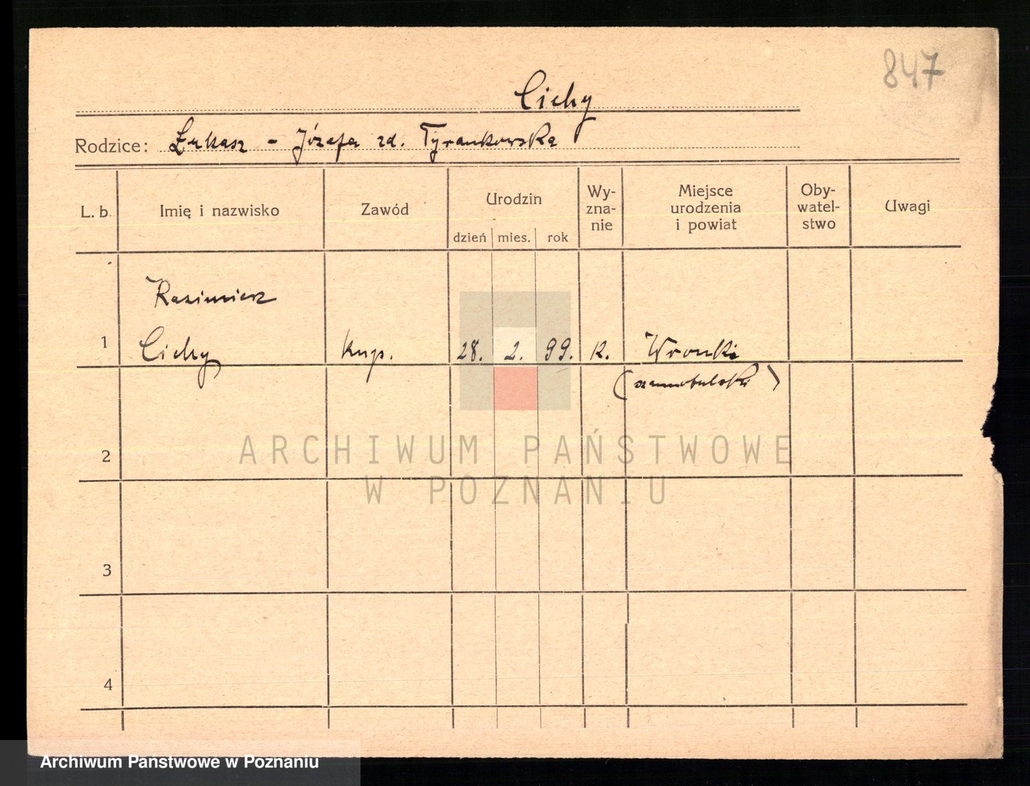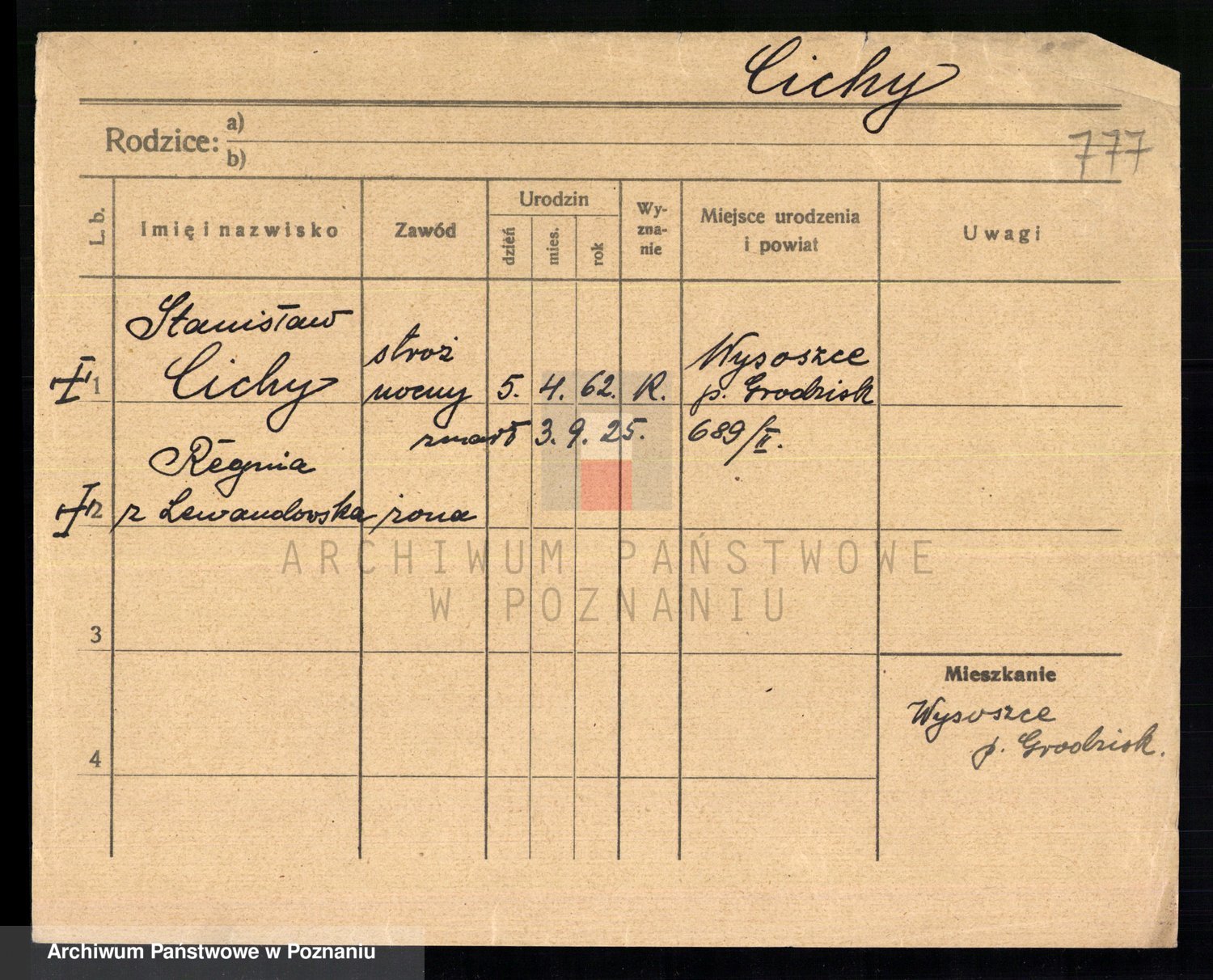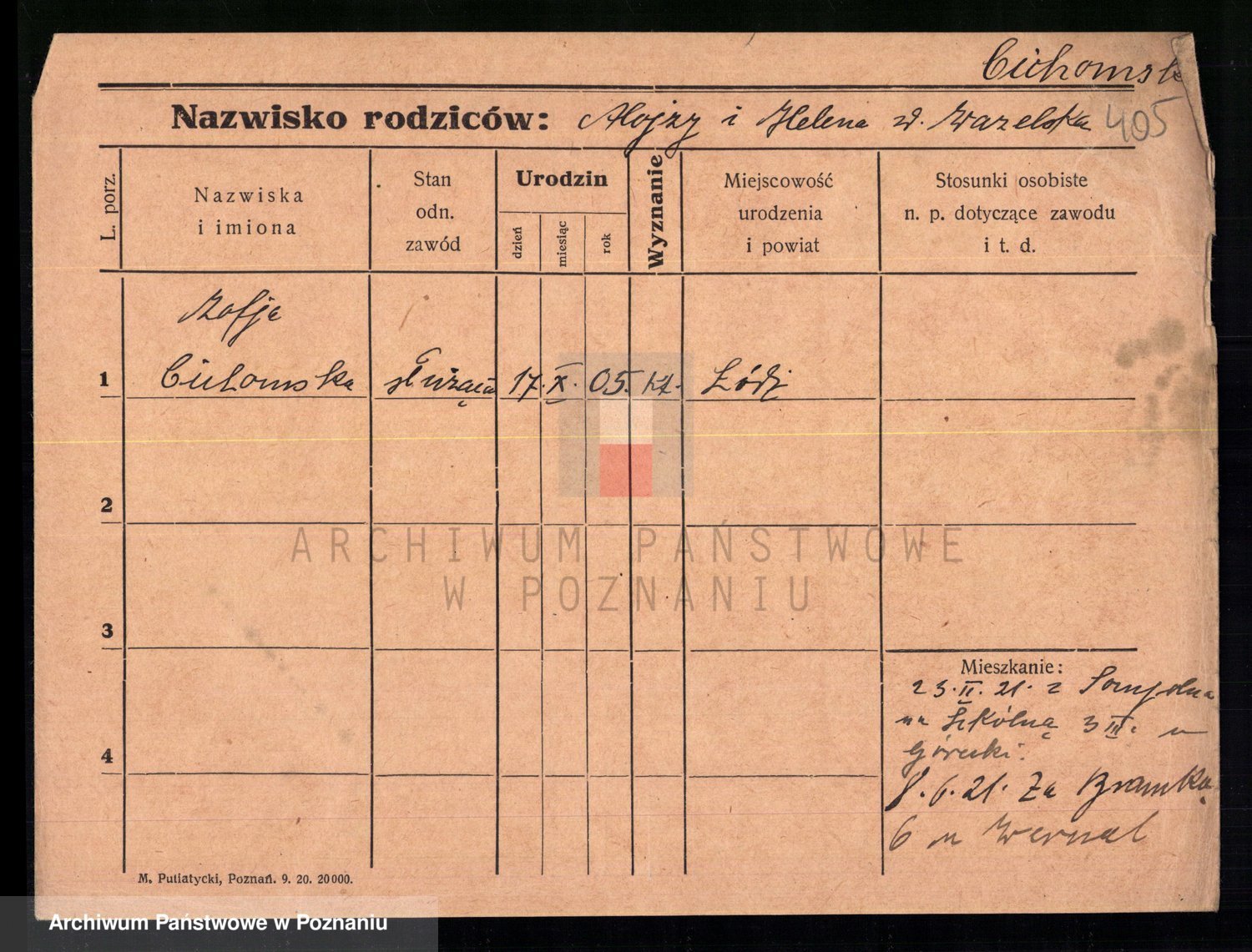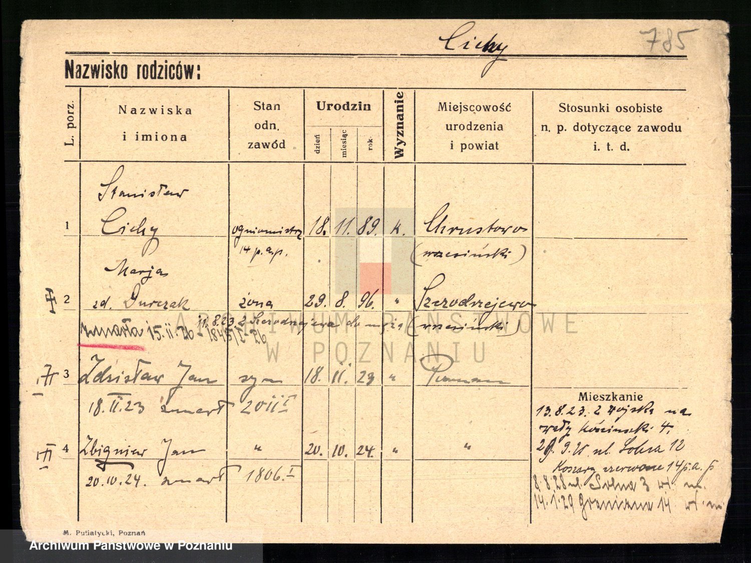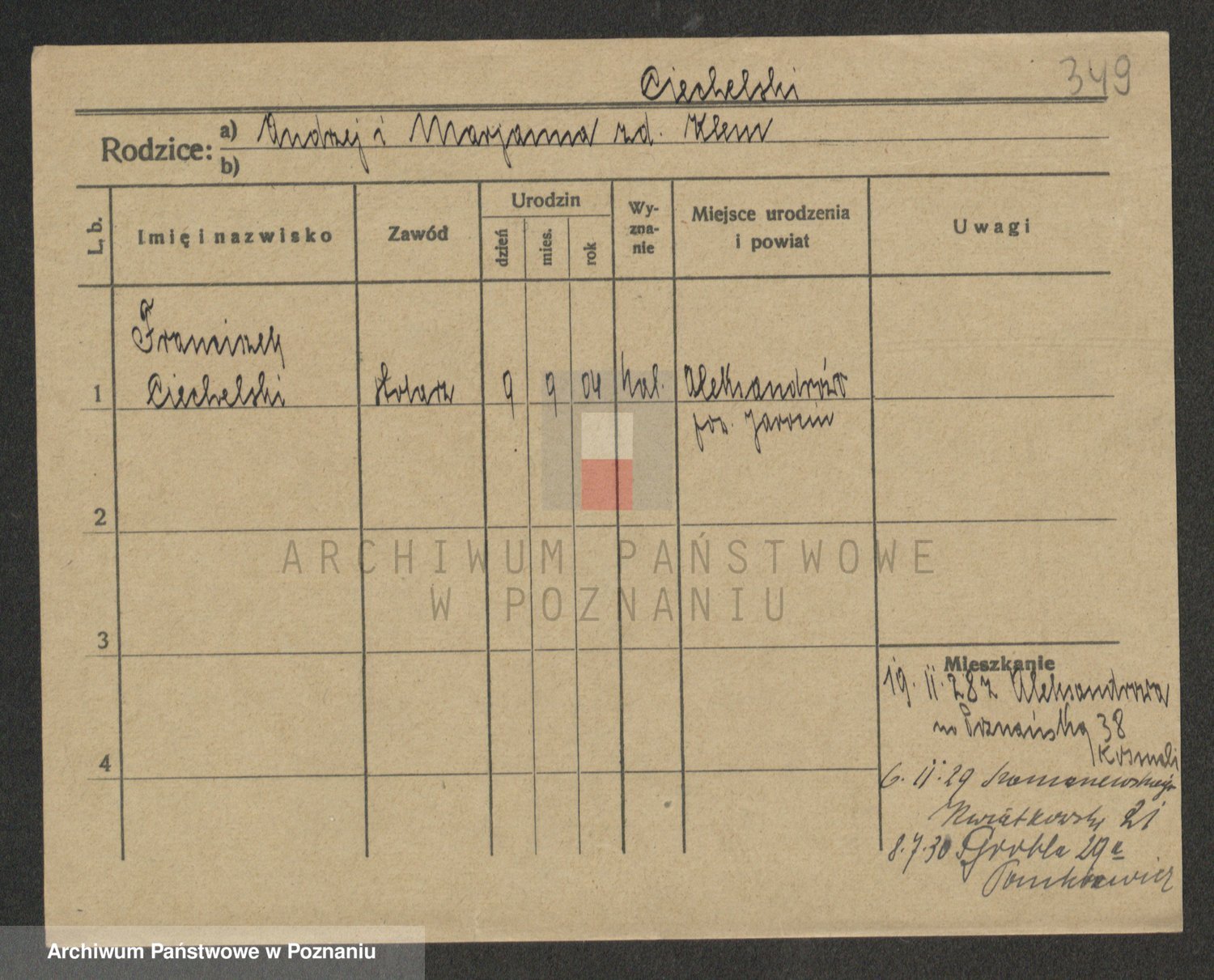 Podgląd karty osobowej dostępny jest po kliknięciu na nazwisko lub ikonkę karty. Można dokonywać powiększenia (ikony na górze) lub przechodzić między kolejnymi skanami (strzałki po bokach).