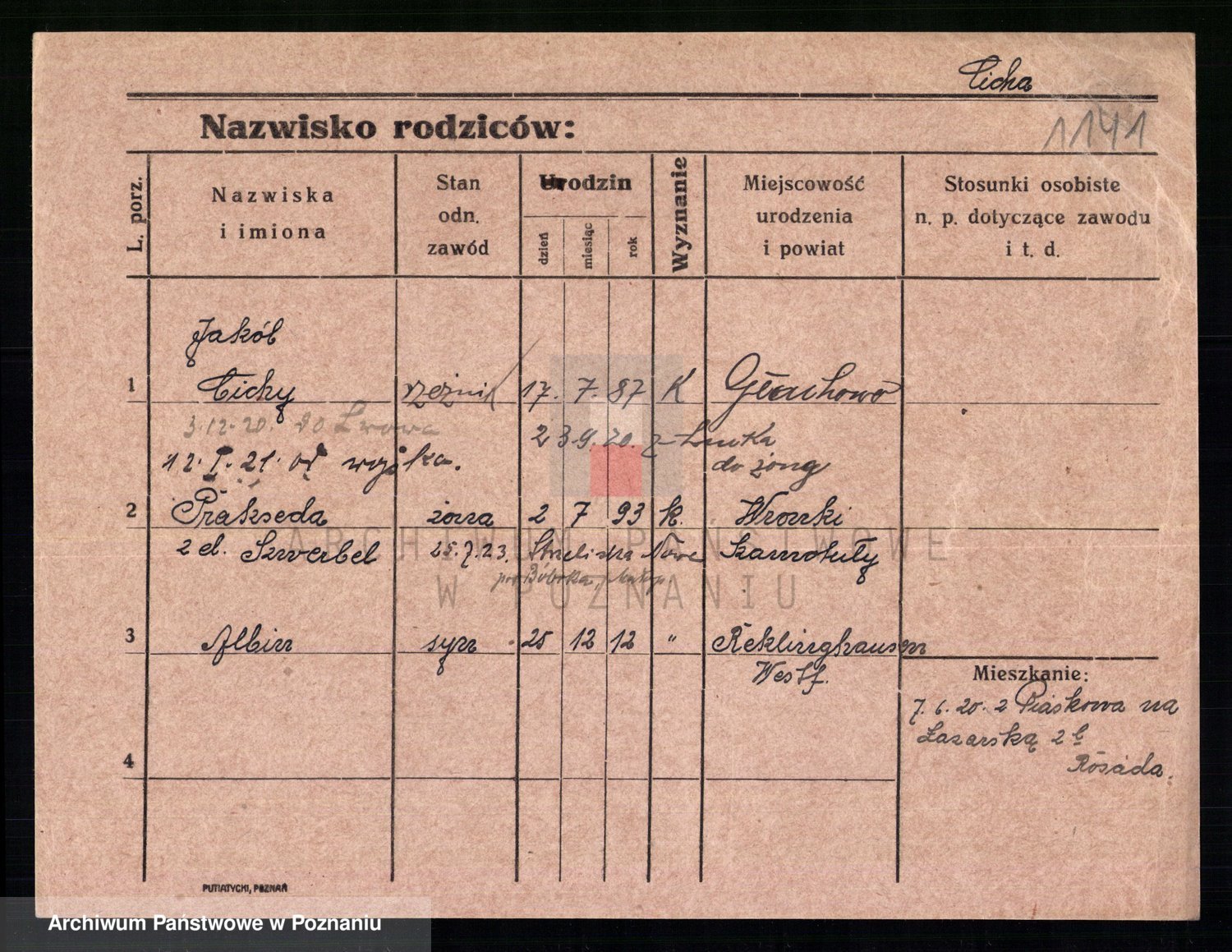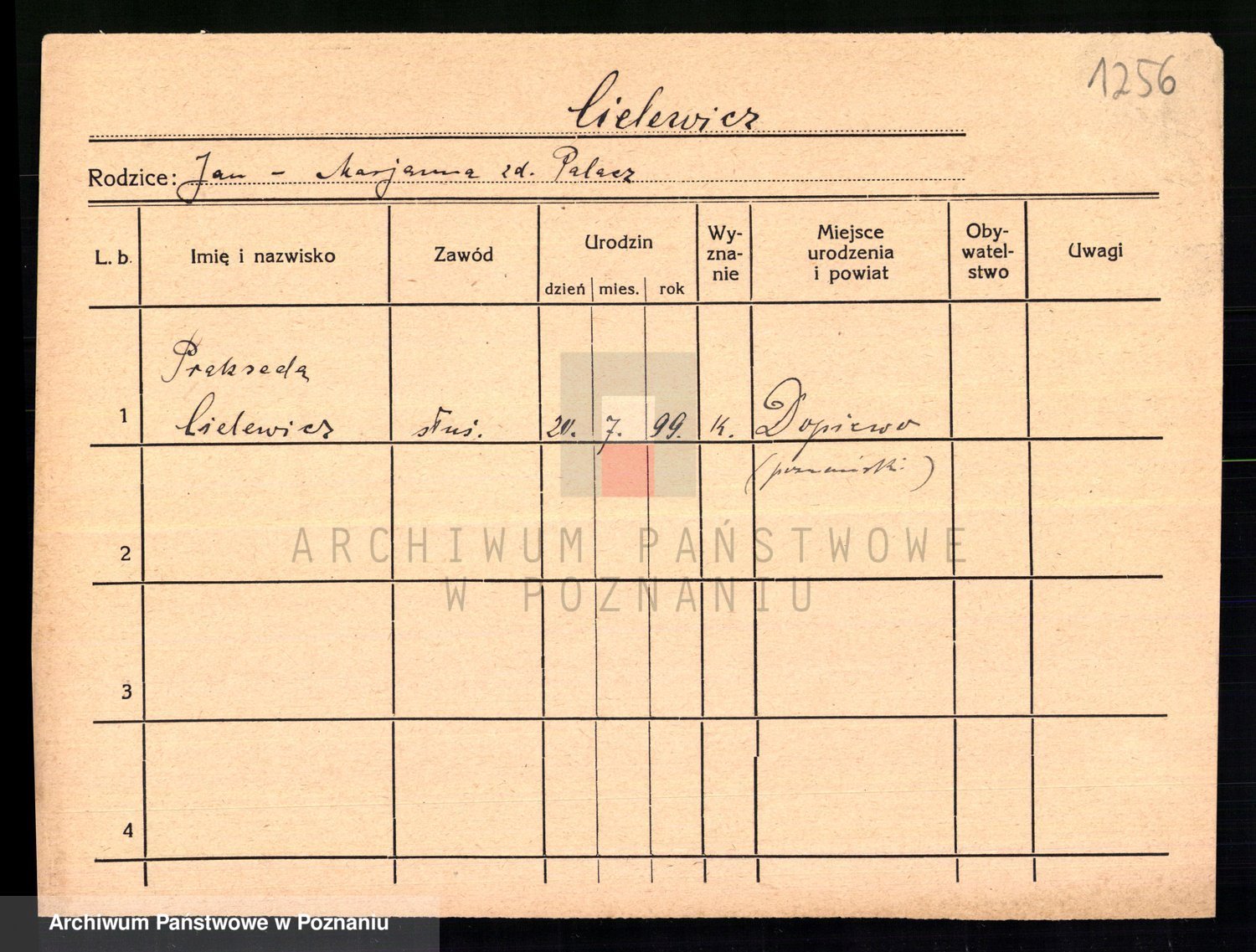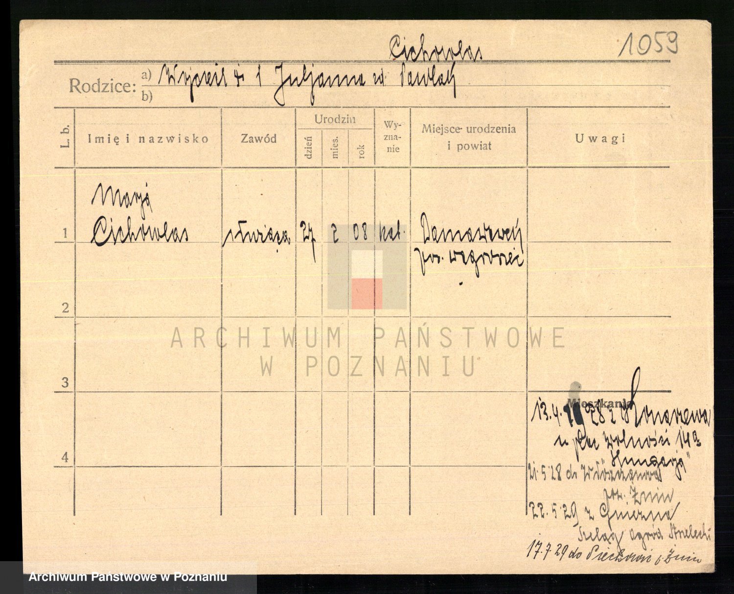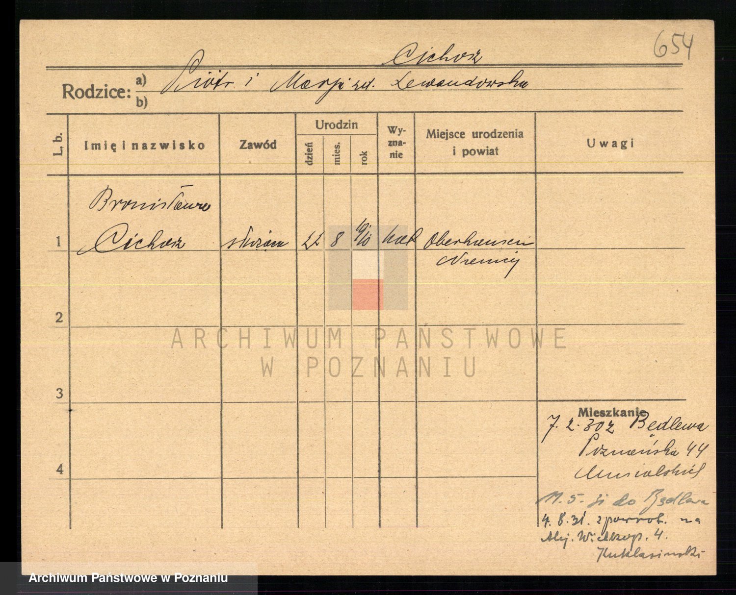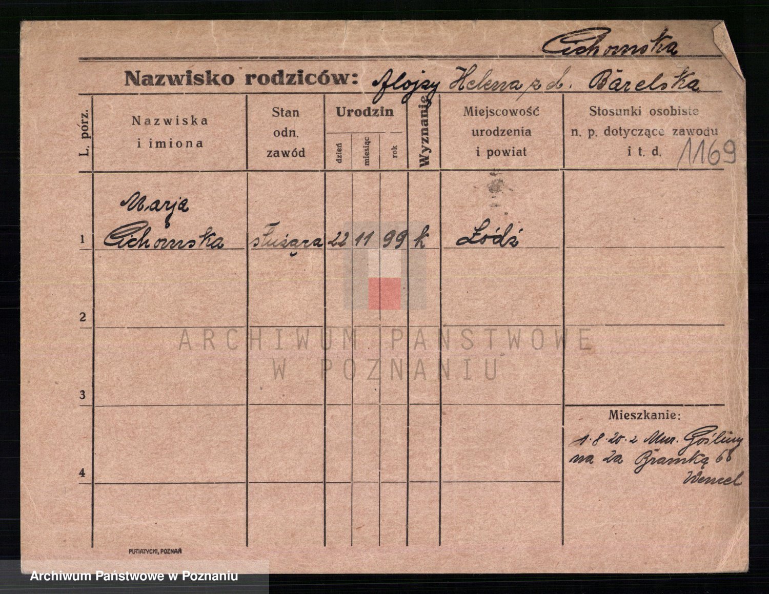 Podgląd karty osobowej dostępny jest po kliknięciu na nazwisko lub ikonkę karty. Można dokonywać powiększenia (ikony na górze) lub przechodzić między kolejnymi skanami (strzałki po bokach).