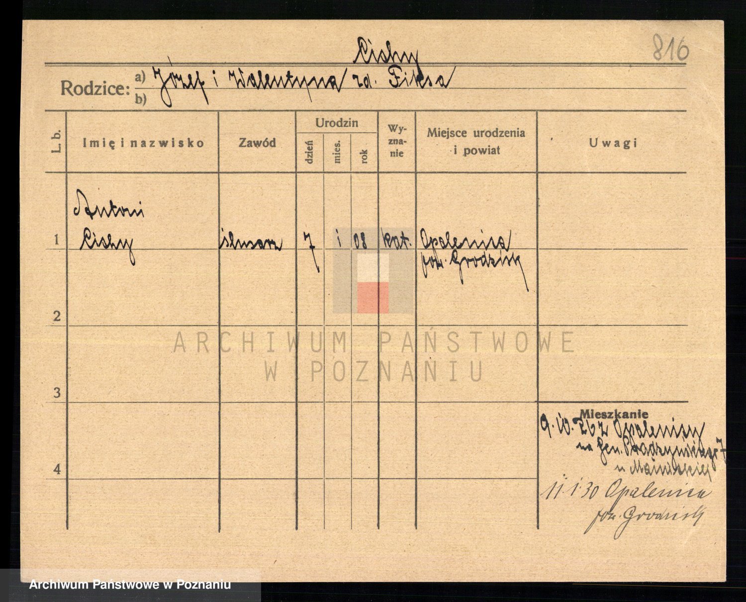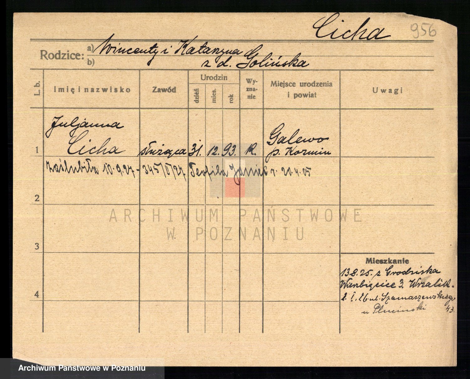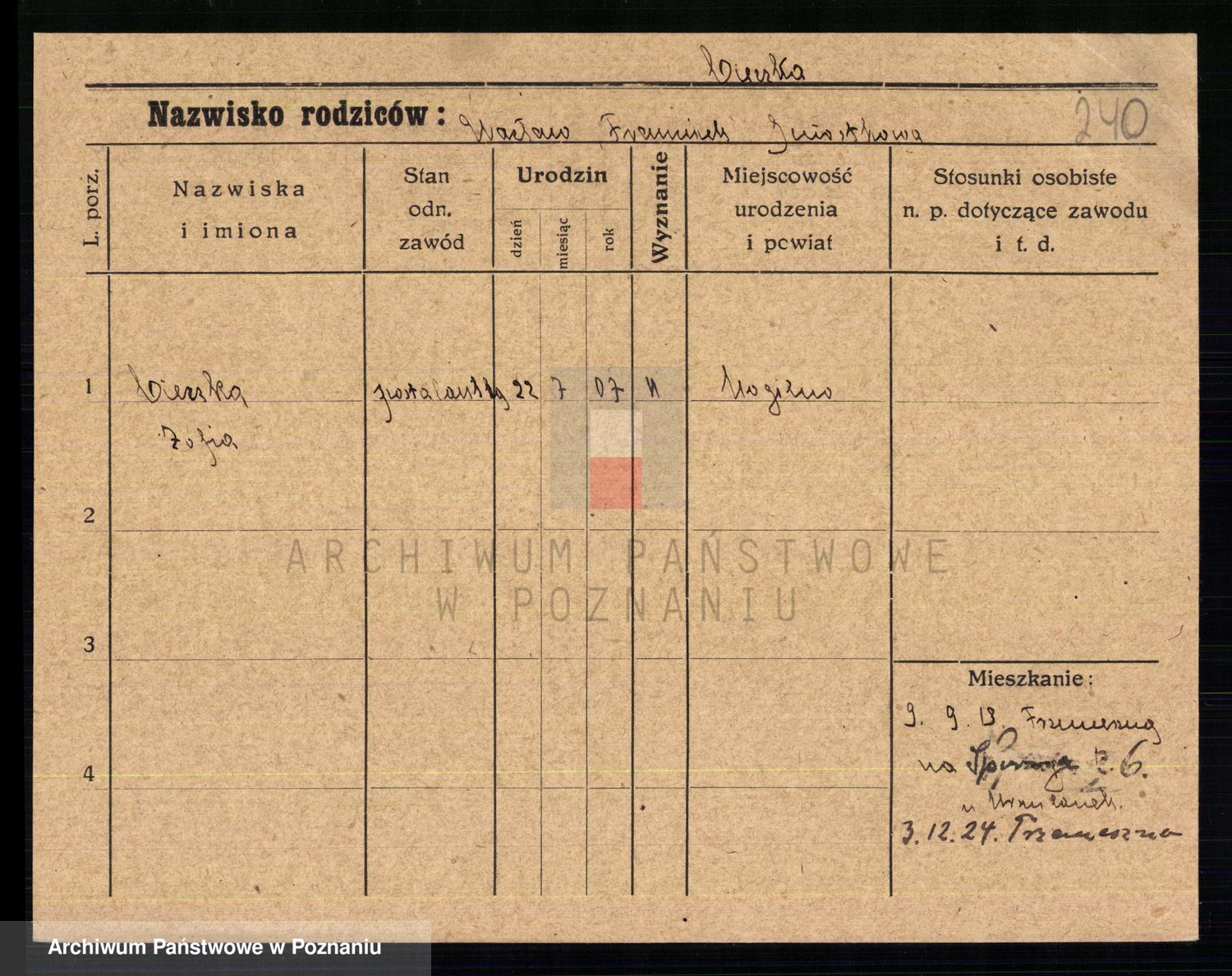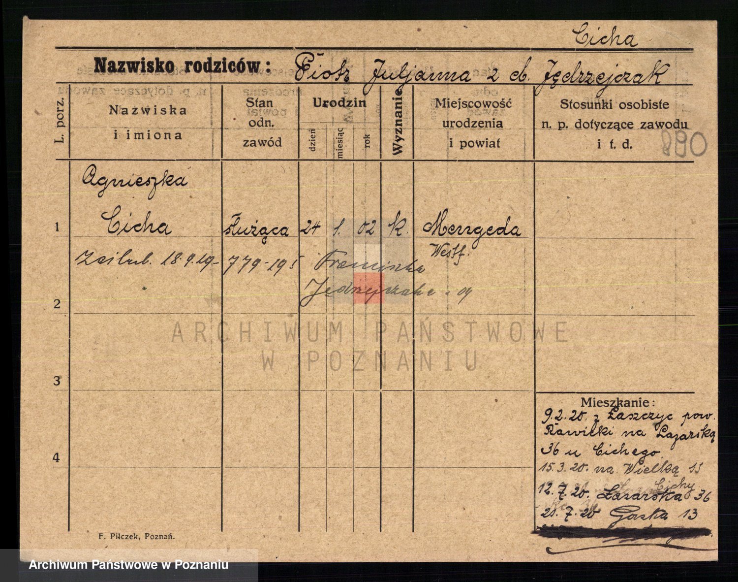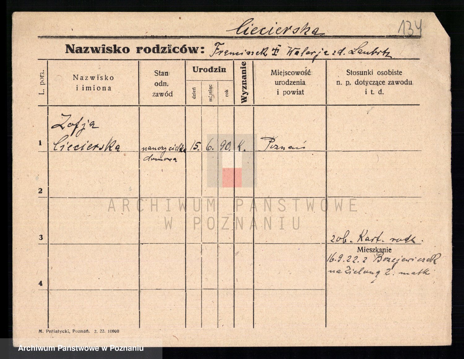 Podgląd karty osobowej dostępny jest po kliknięciu na nazwisko lub ikonkę karty. Można dokonywać powiększenia (ikony na górze) lub przechodzić między kolejnymi skanami (strzałki po bokach).