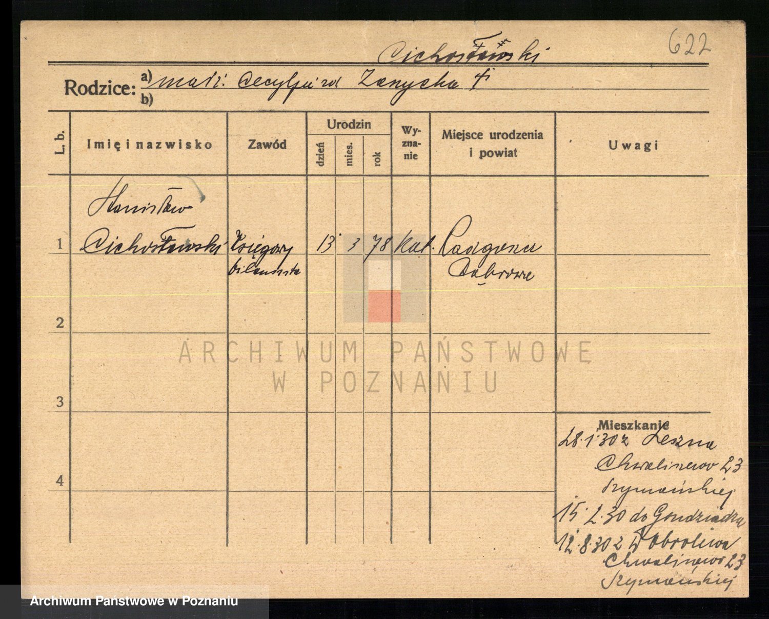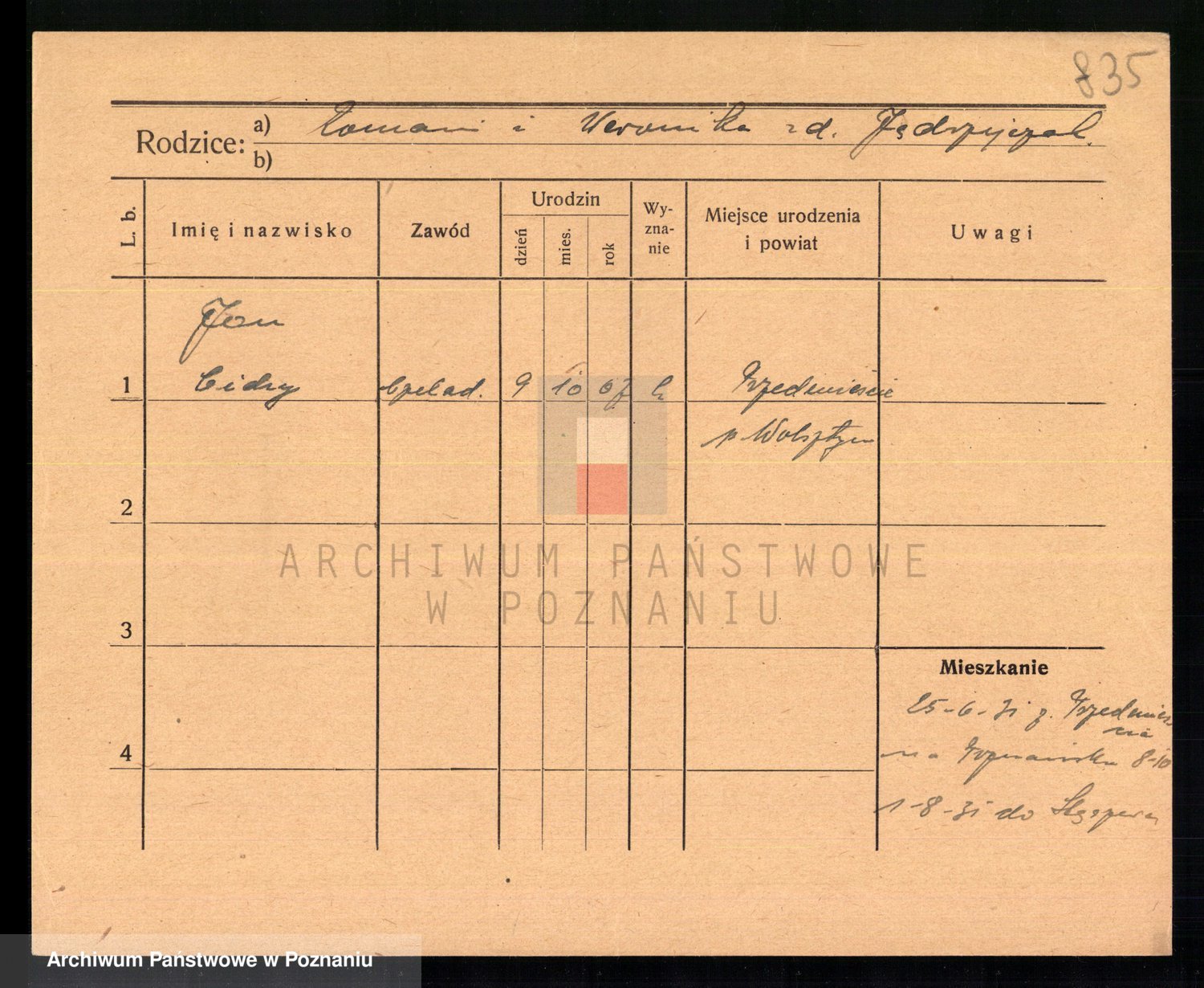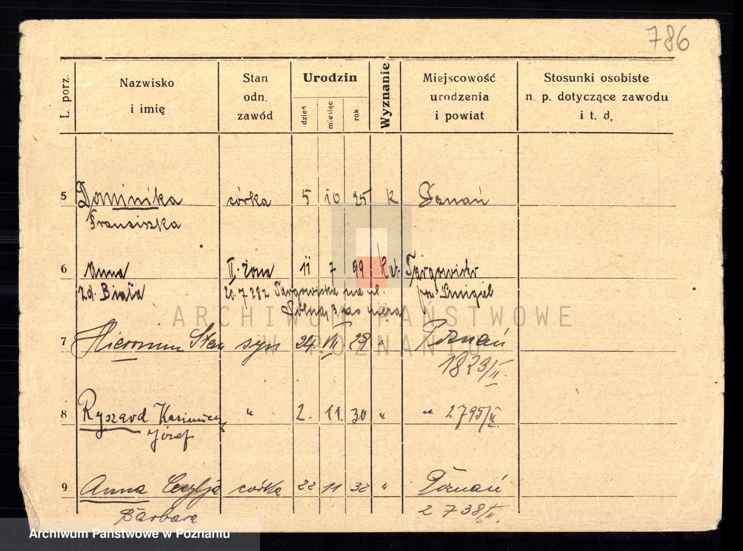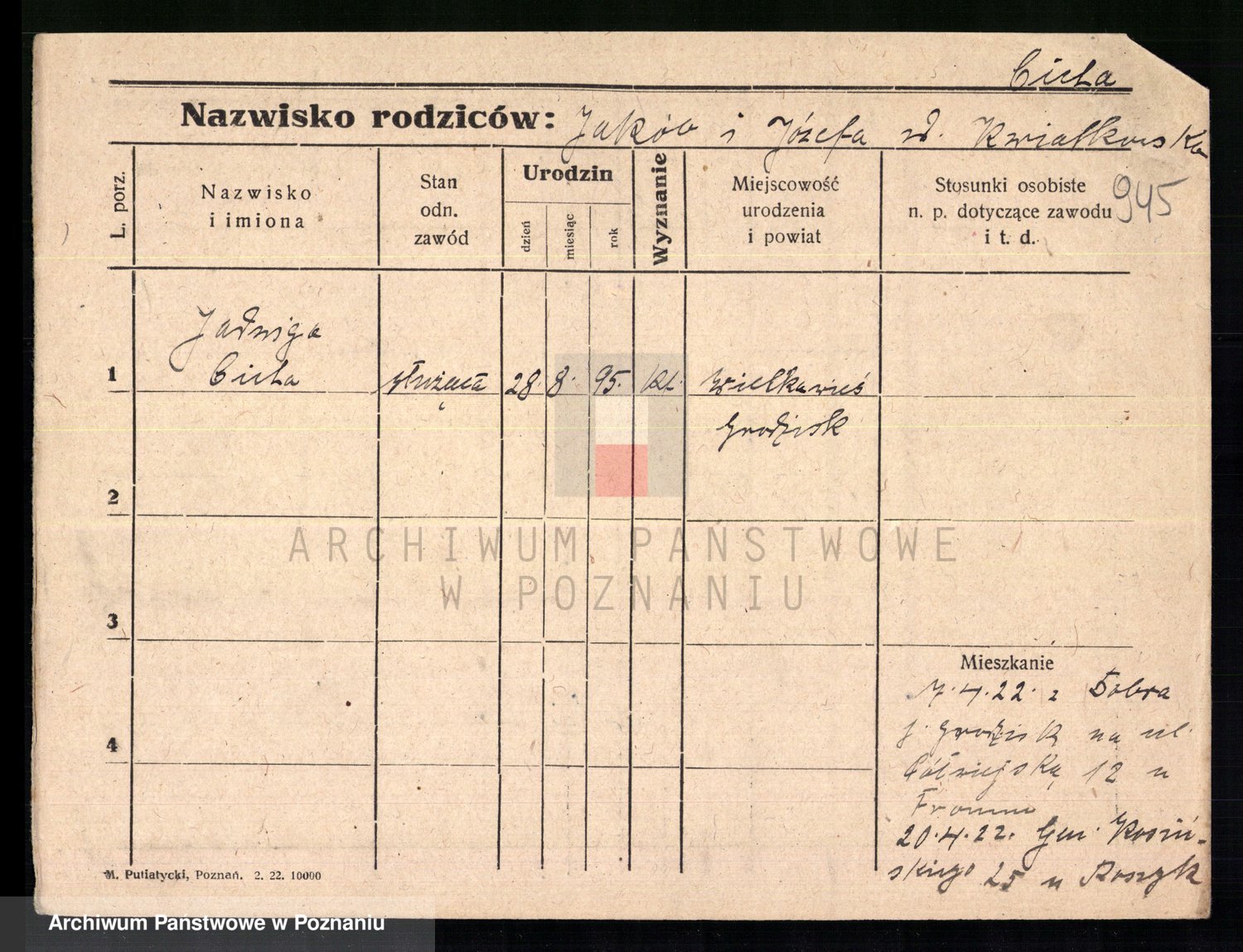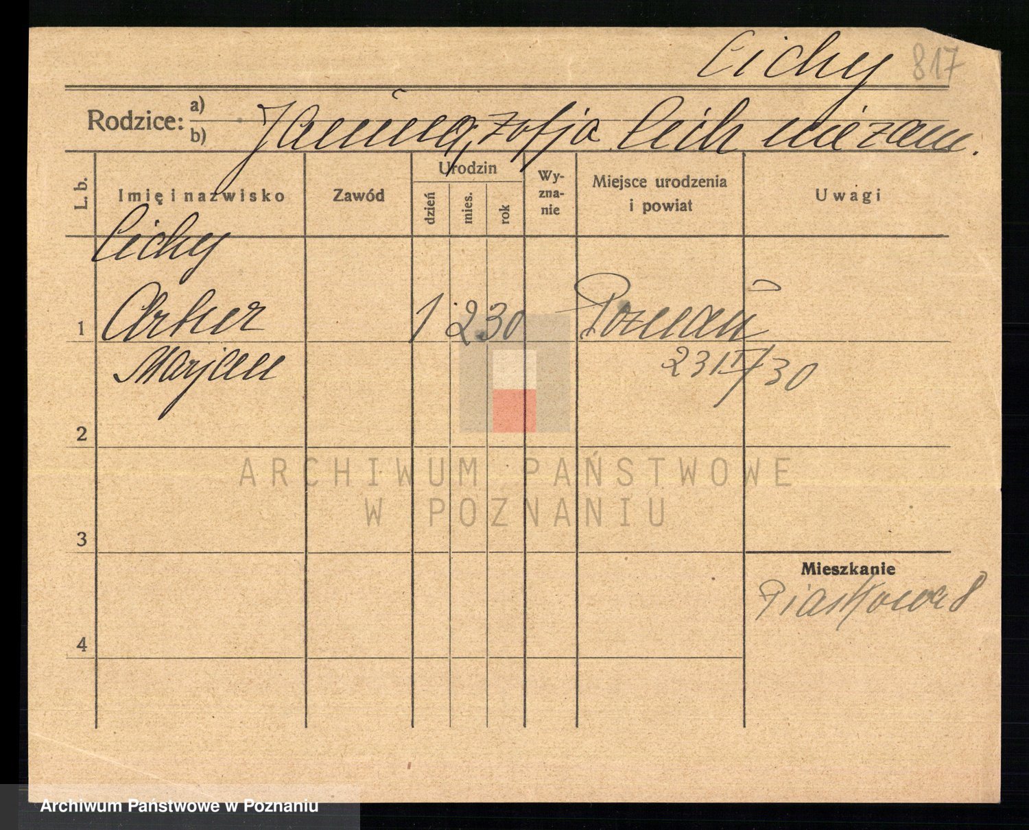 Podgląd karty osobowej dostępny jest po kliknięciu na nazwisko lub ikonkę karty. Można dokonywać powiększenia (ikony na górze) lub przechodzić między kolejnymi skanami (strzałki po bokach).