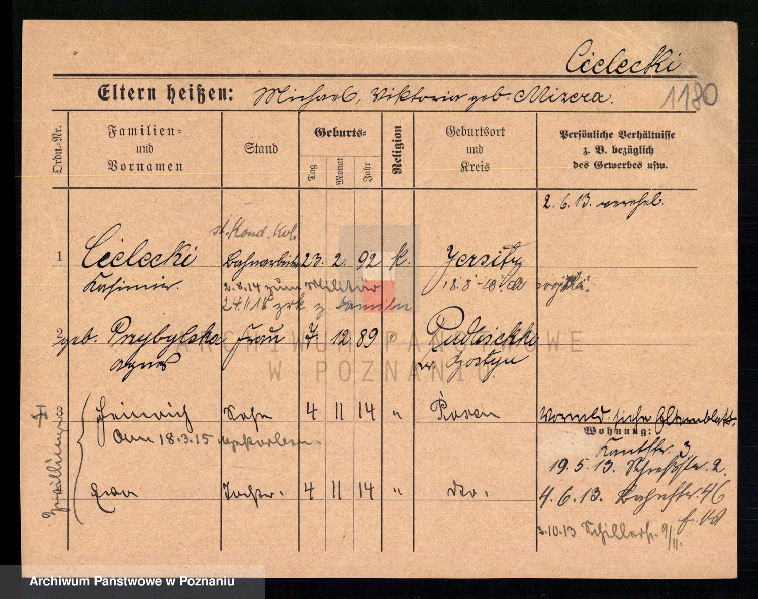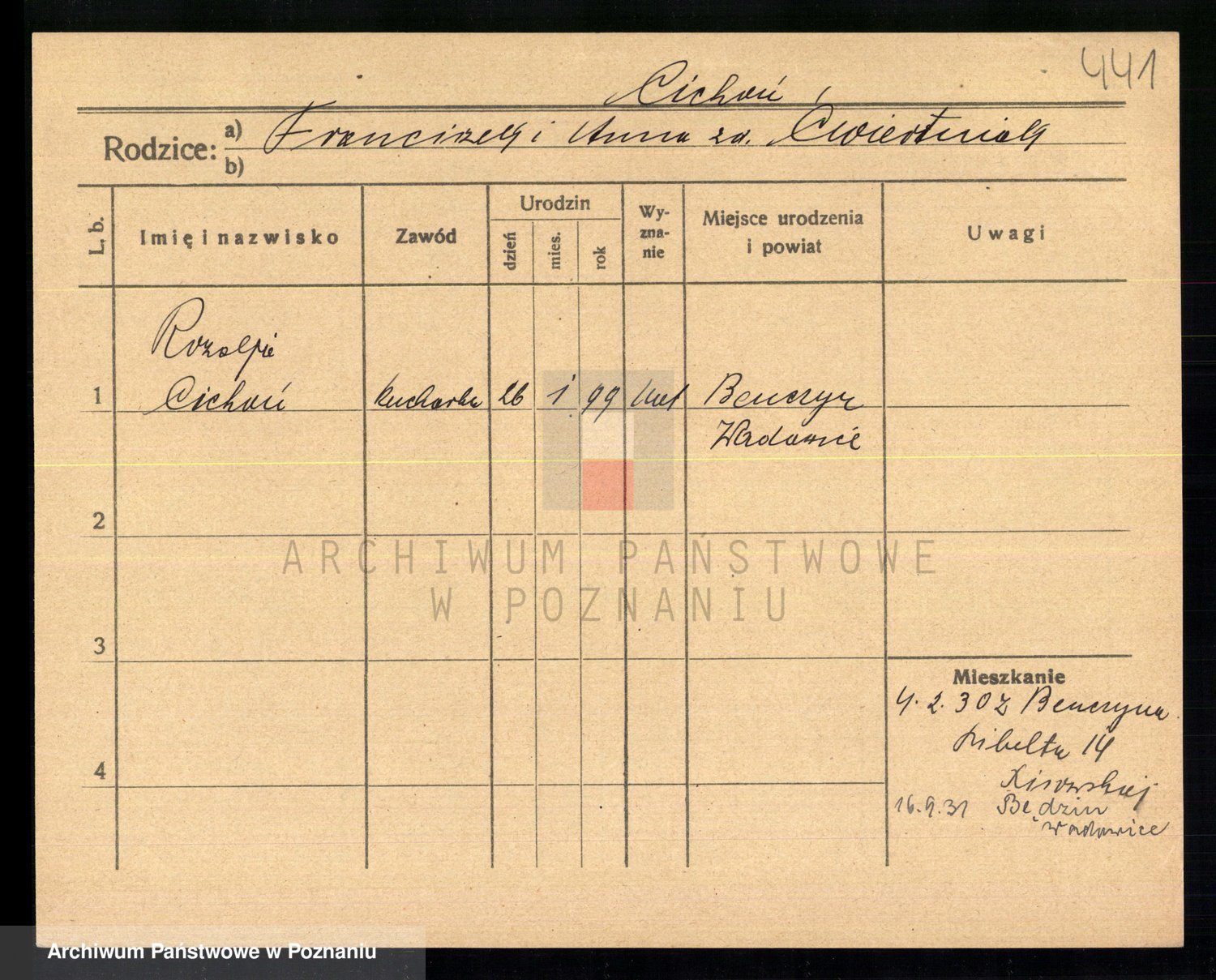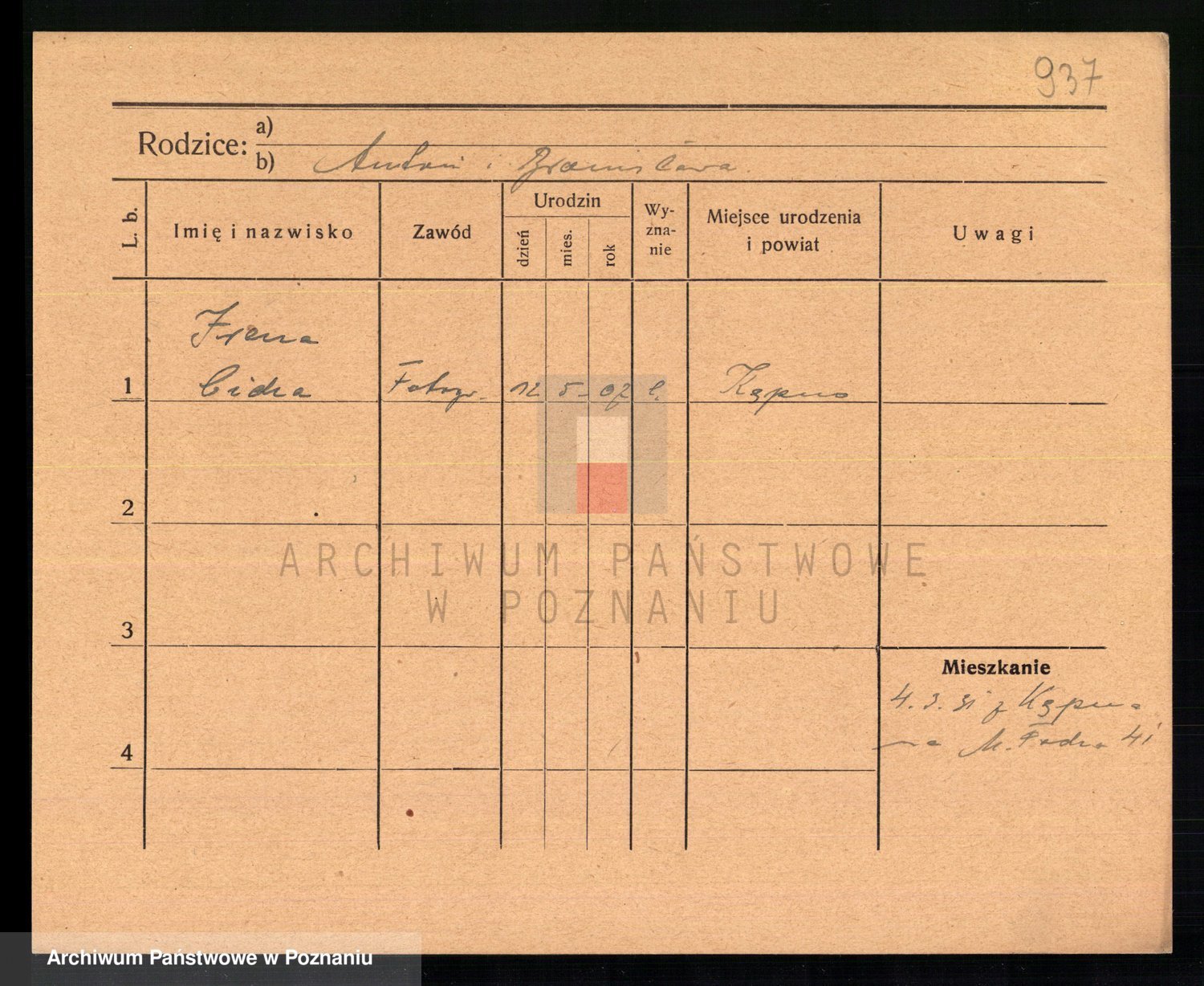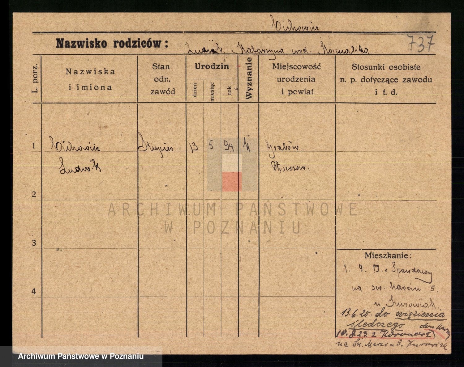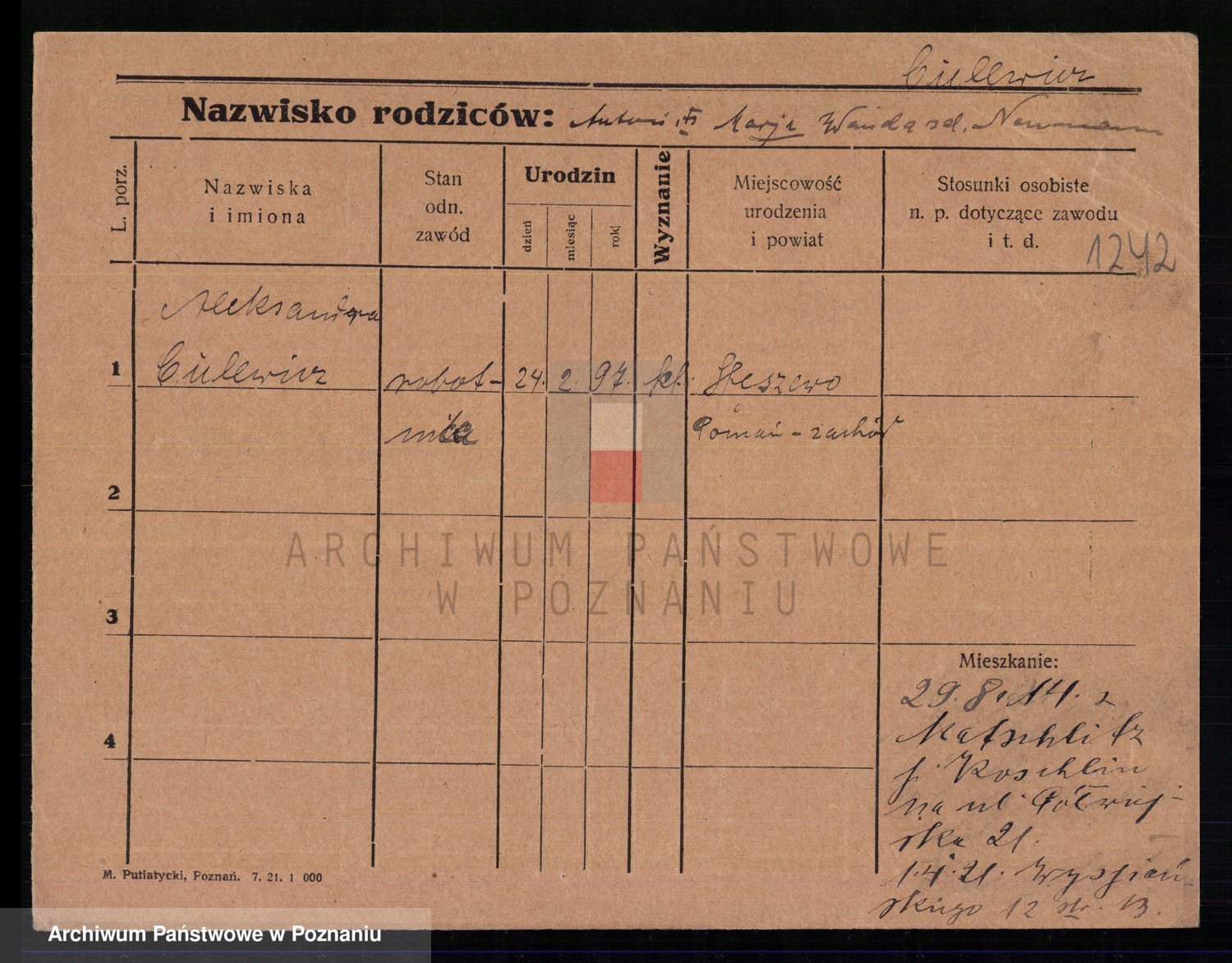 Podgląd karty osobowej dostępny jest po kliknięciu na nazwisko lub ikonkę karty. Można dokonywać powiększenia (ikony na górze) lub przechodzić między kolejnymi skanami (strzałki po bokach).