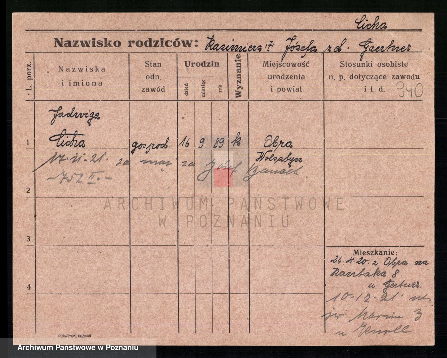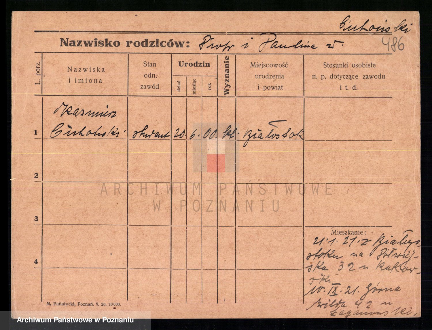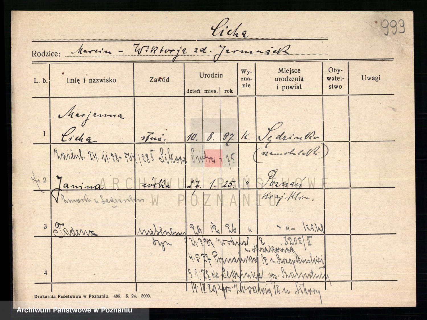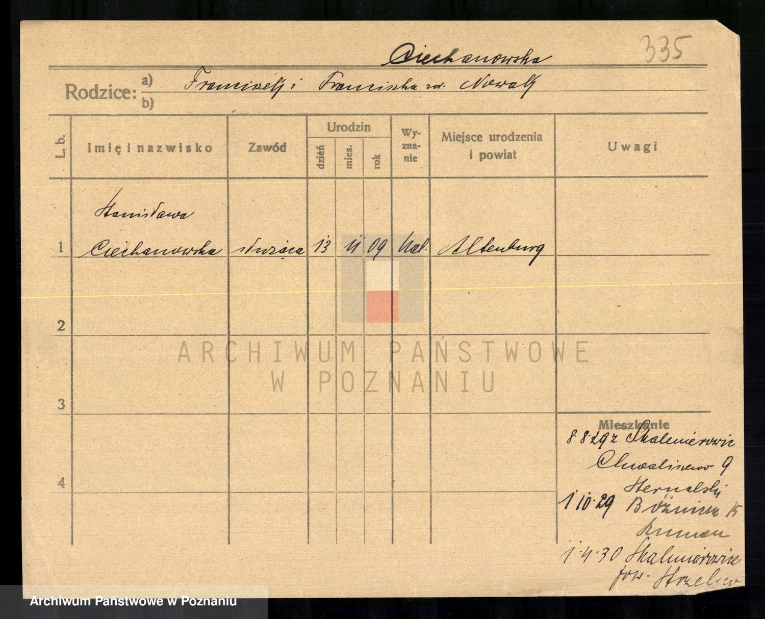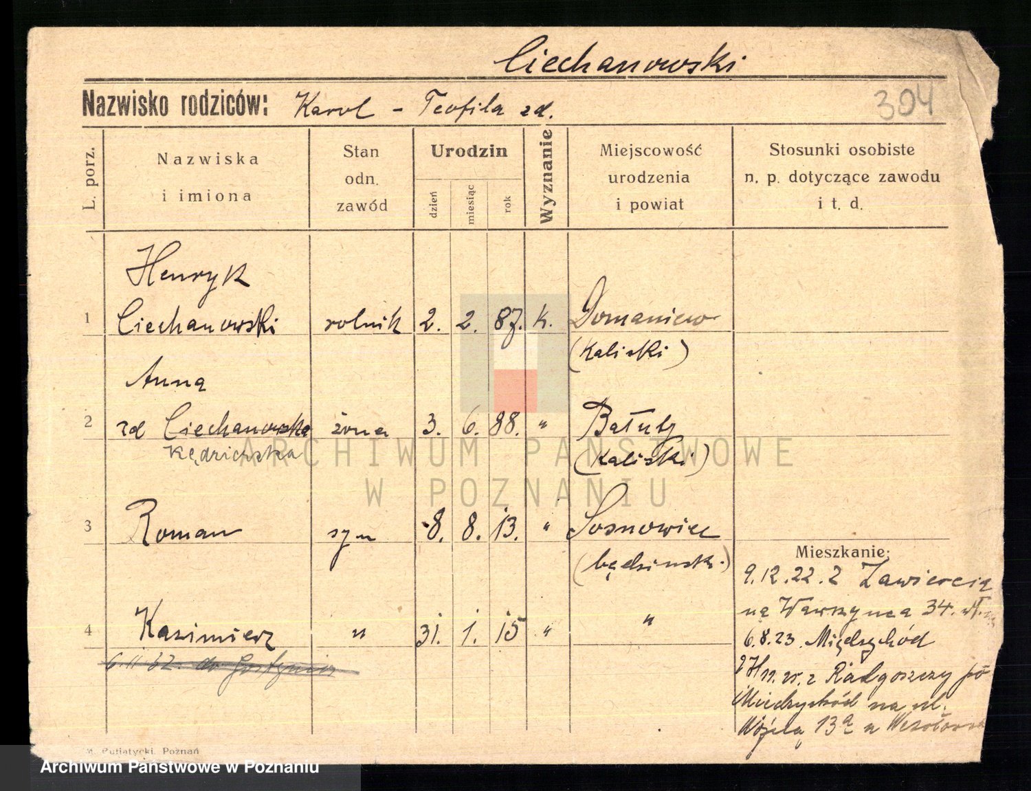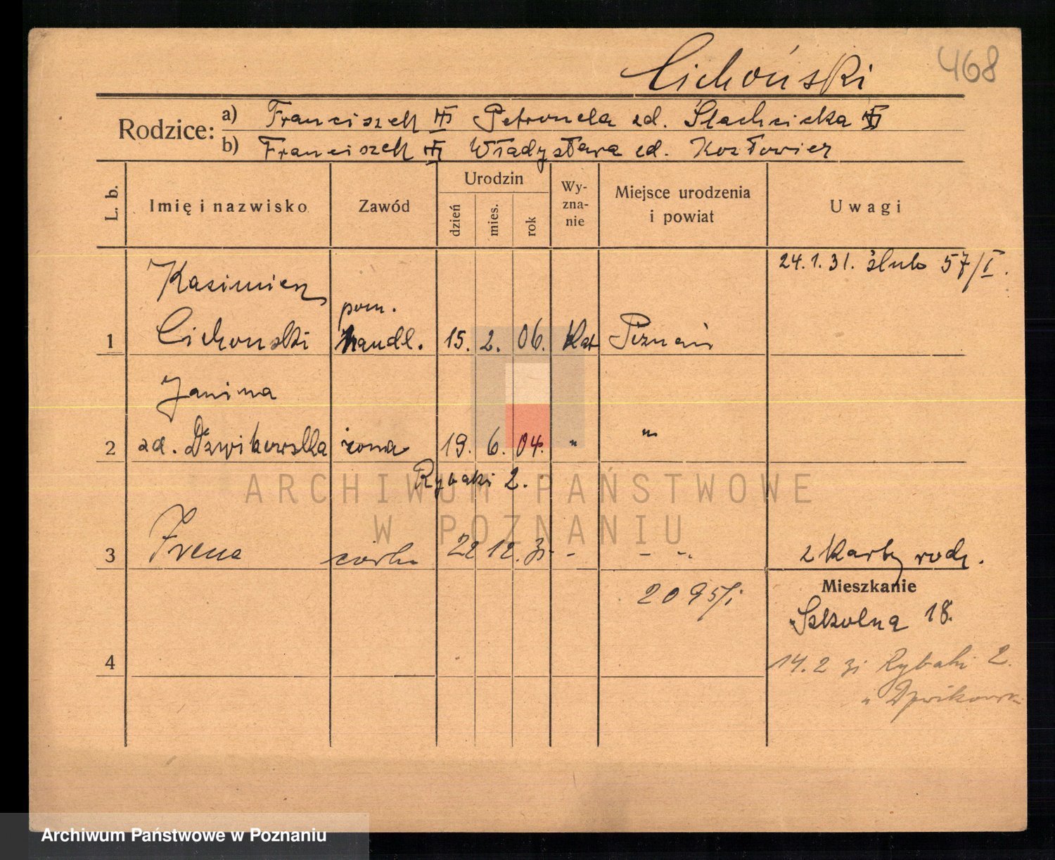 Podgląd karty osobowej dostępny jest po kliknięciu na nazwisko lub ikonkę karty. Można dokonywać powiększenia (ikony na górze) lub przechodzić między kolejnymi skanami (strzałki po bokach).