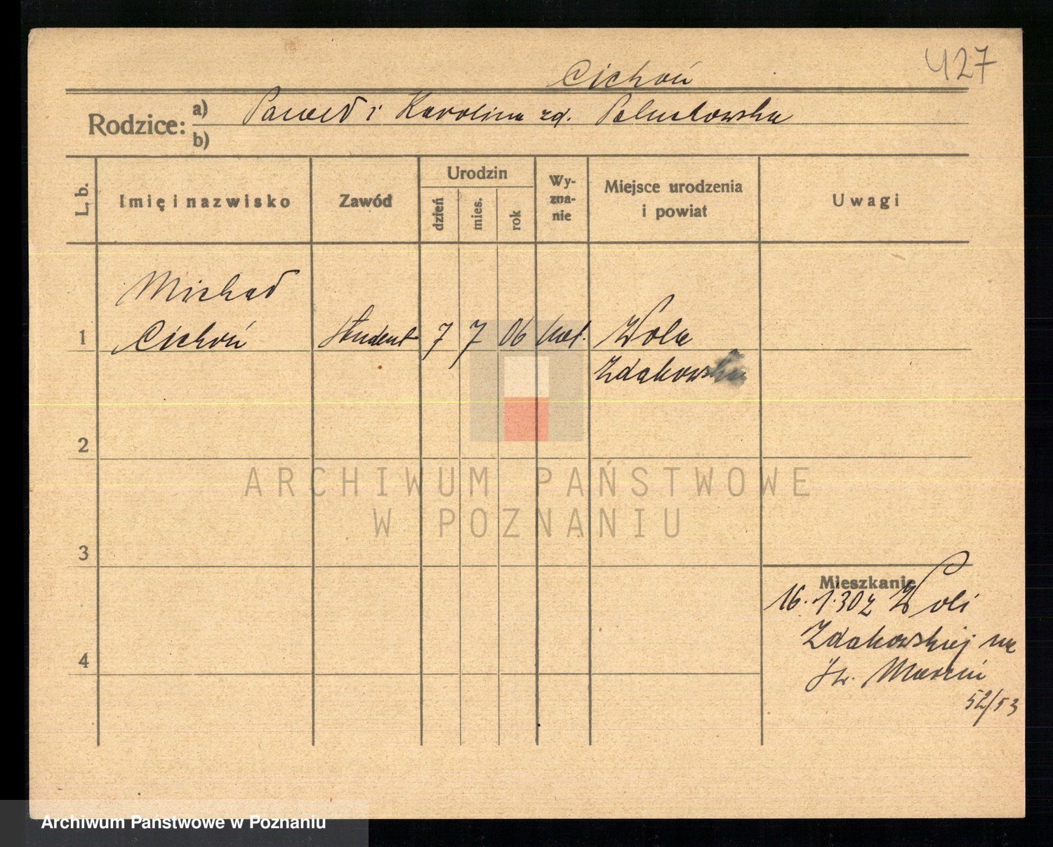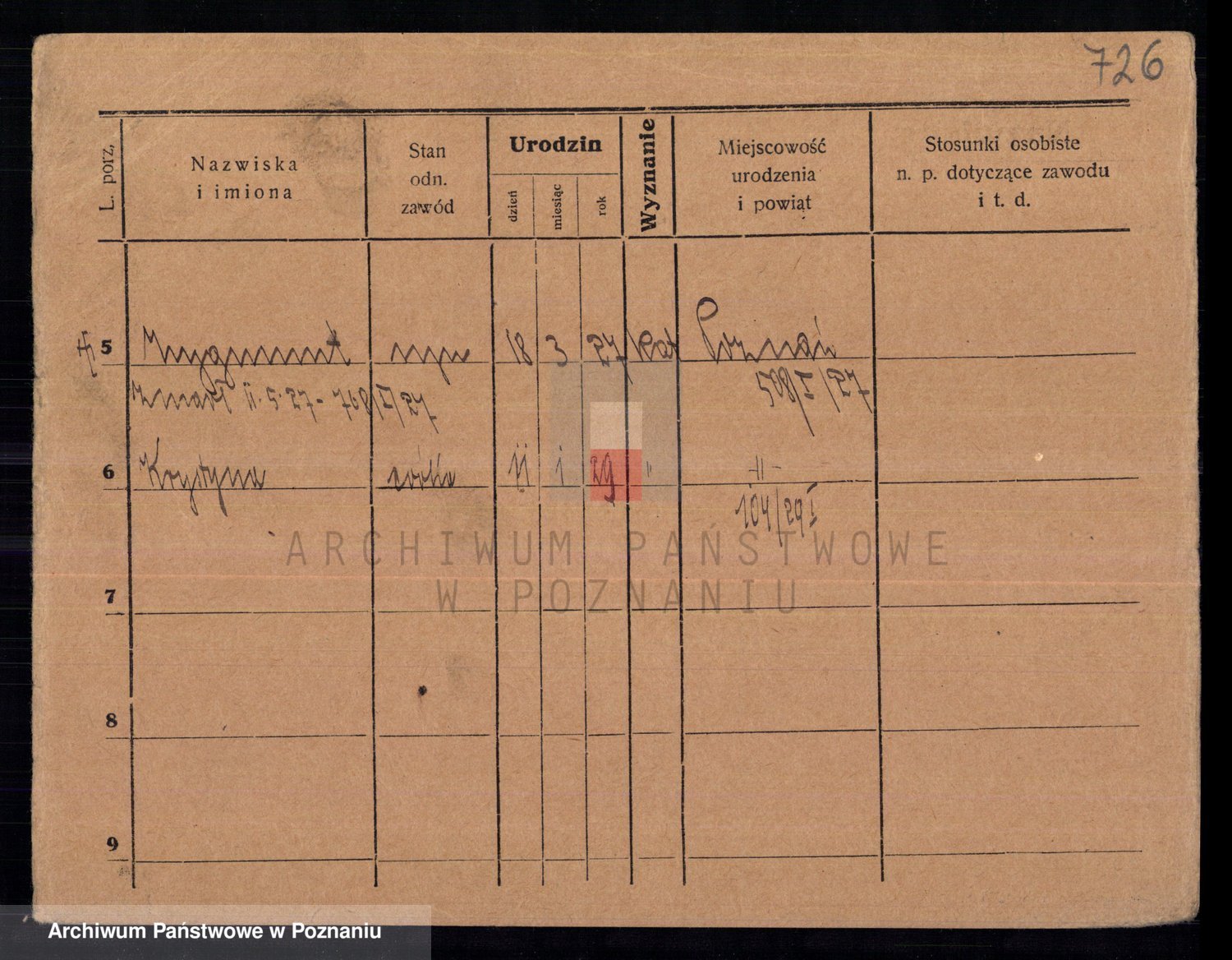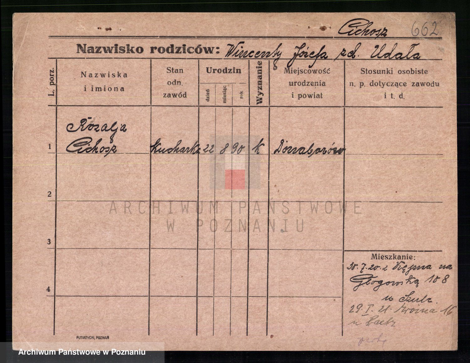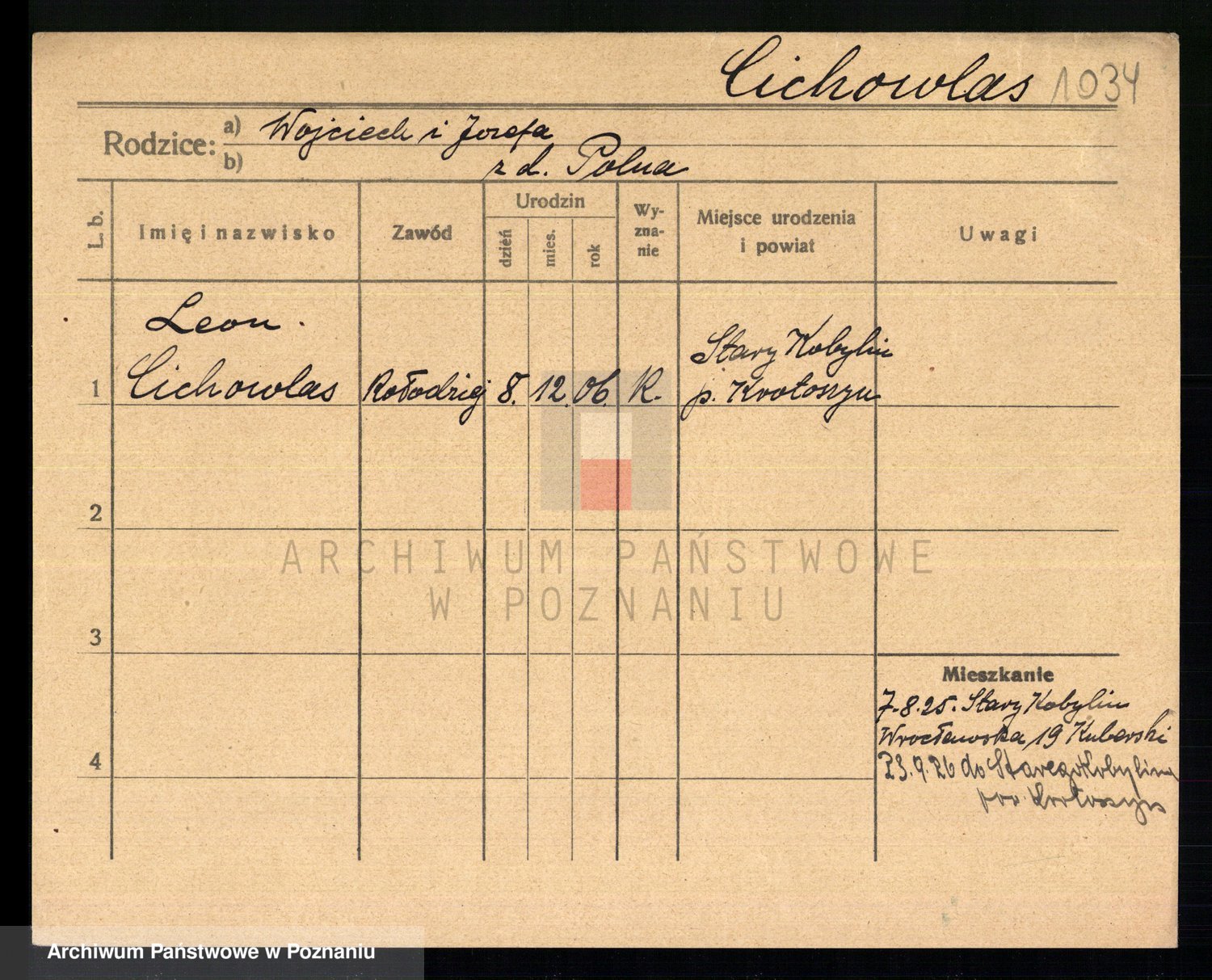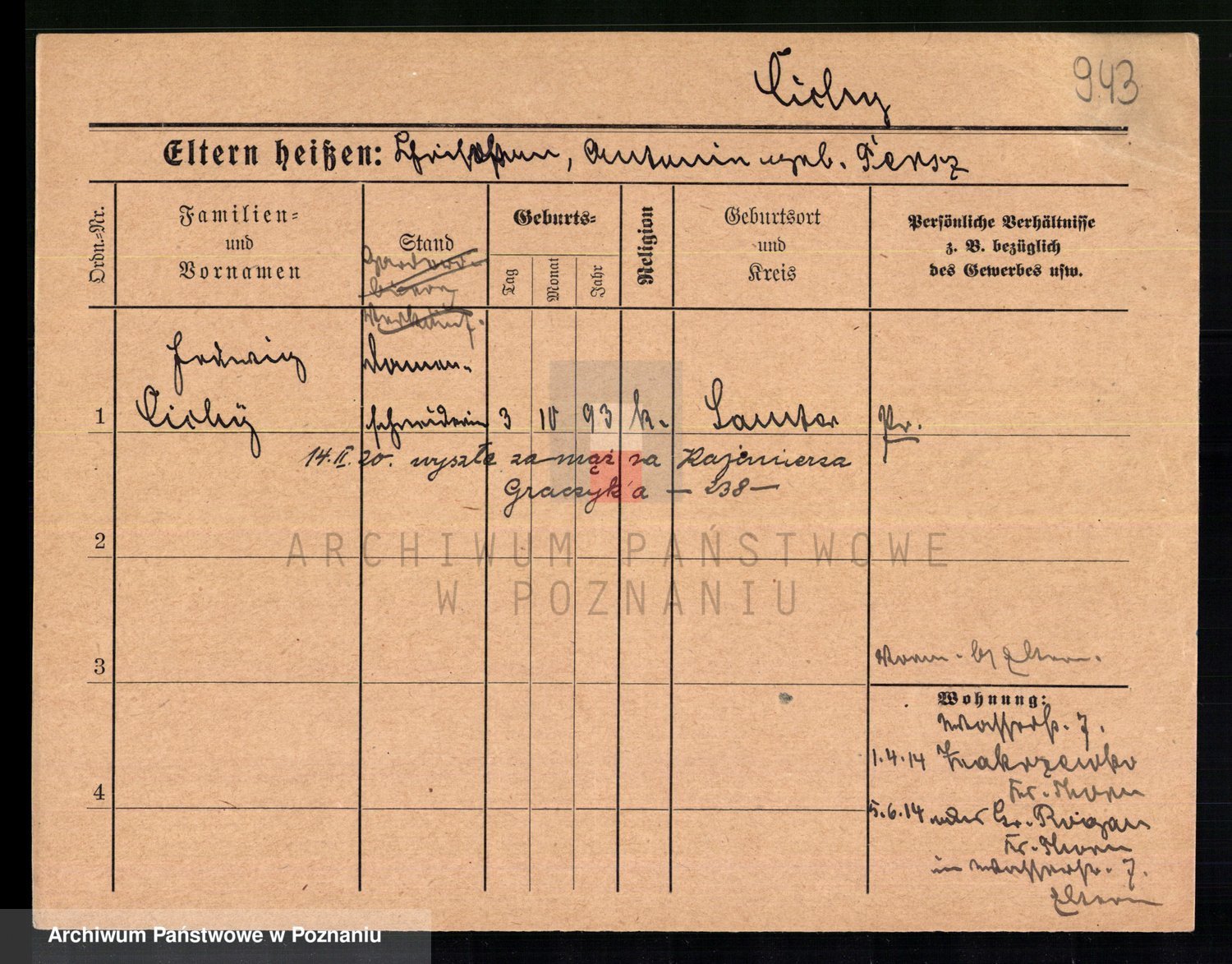 Podgląd karty osobowej dostępny jest po kliknięciu na nazwisko lub ikonkę karty. Można dokonywać powiększenia (ikony na górze) lub przechodzić między kolejnymi skanami (strzałki po bokach).