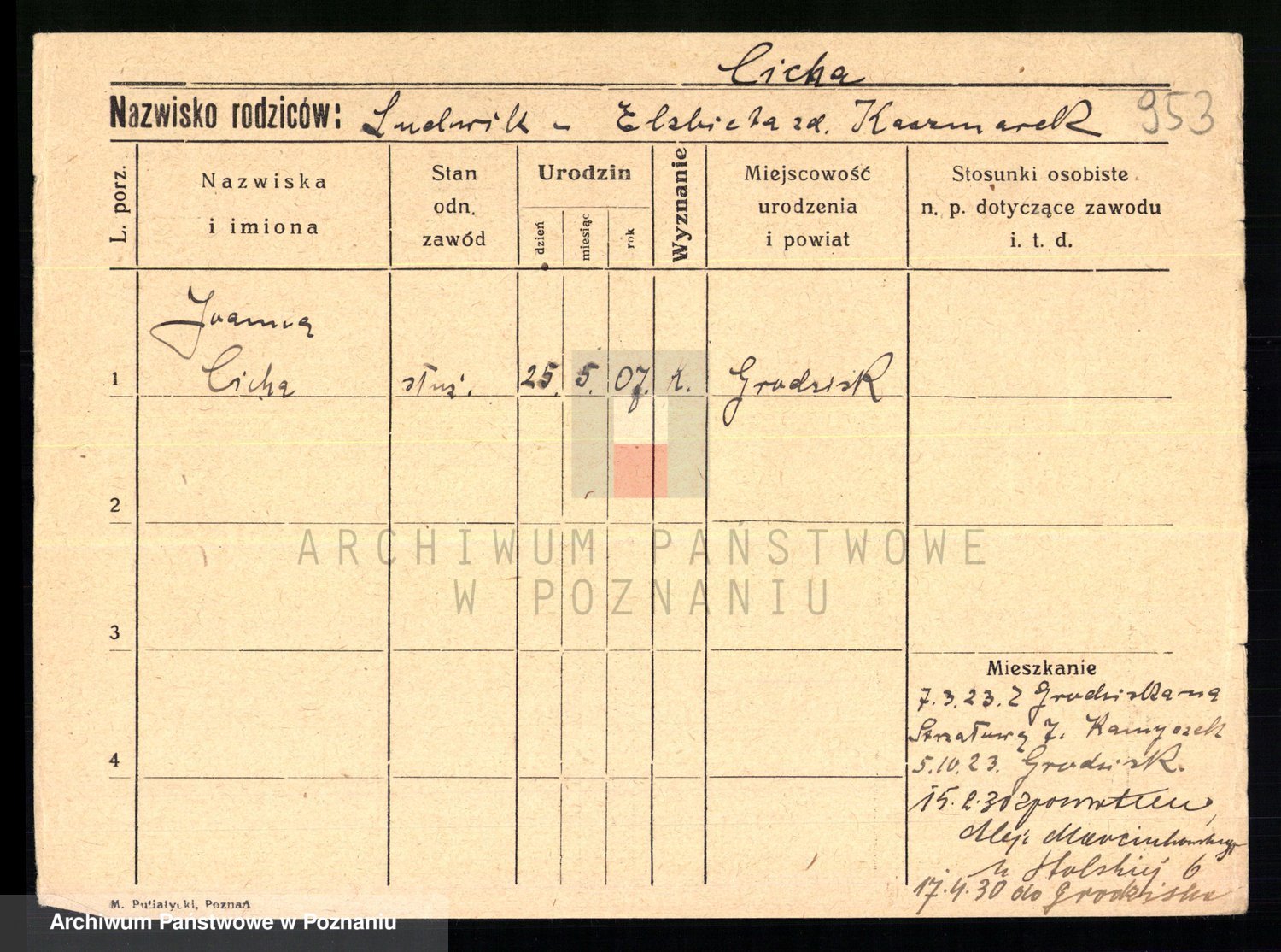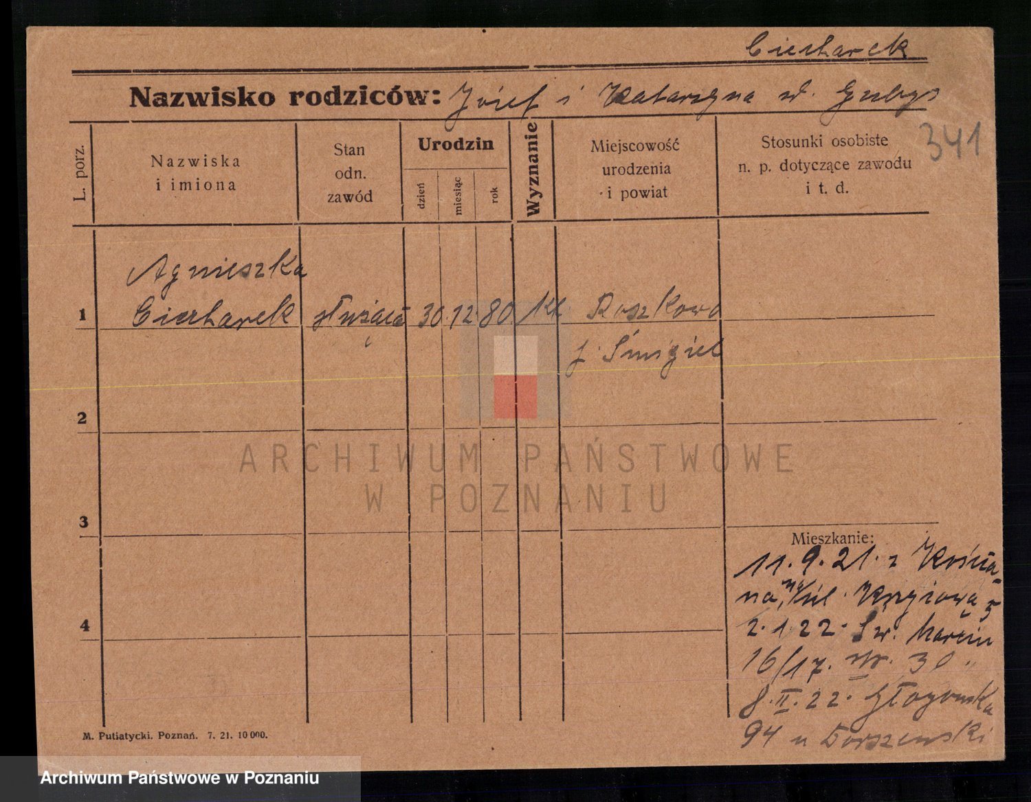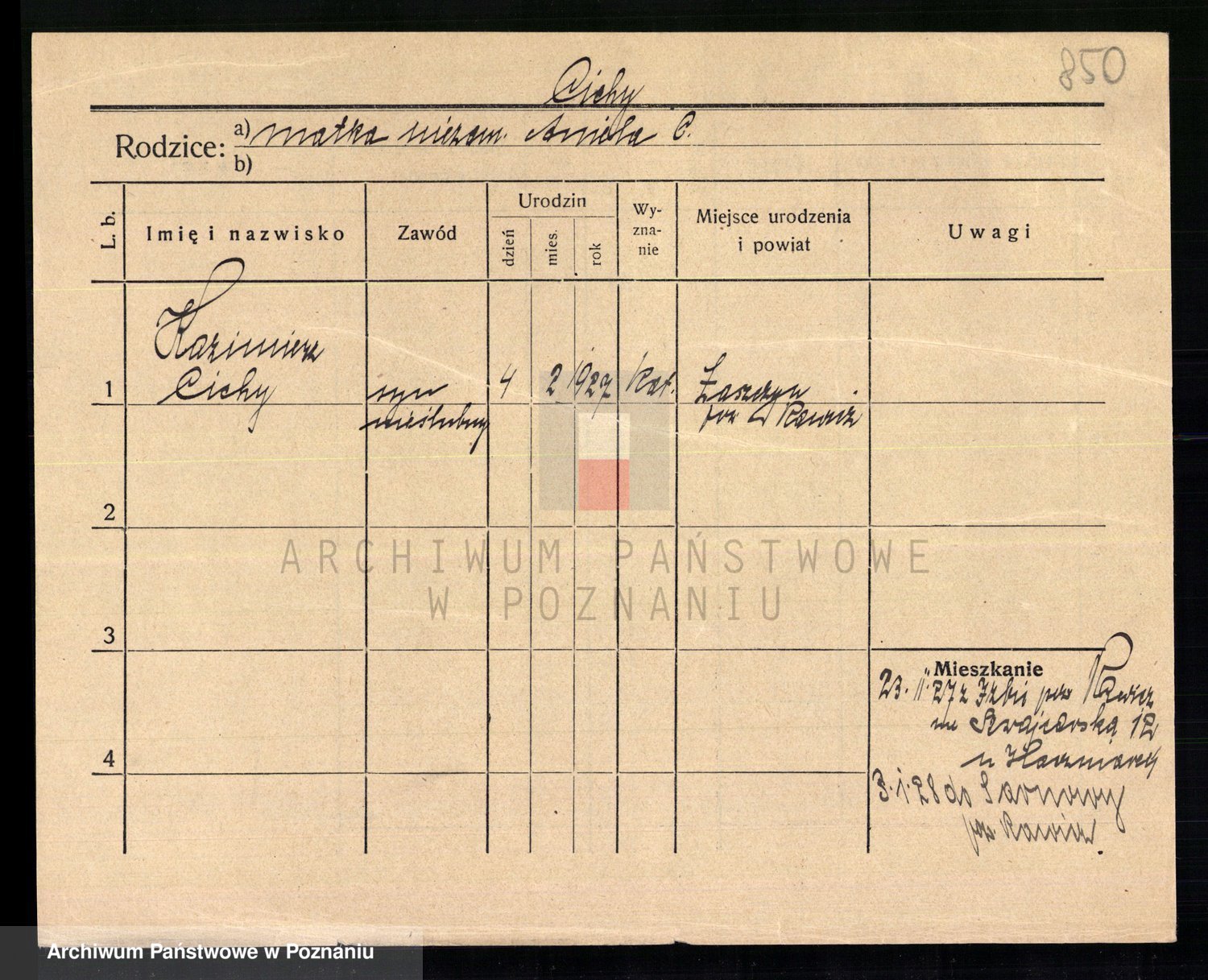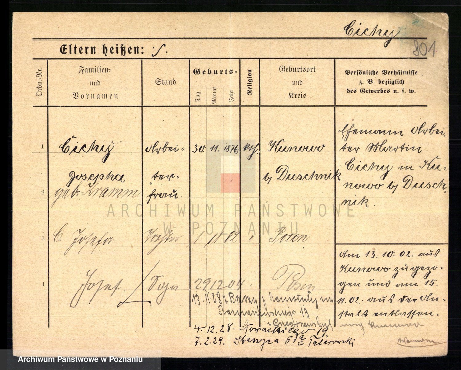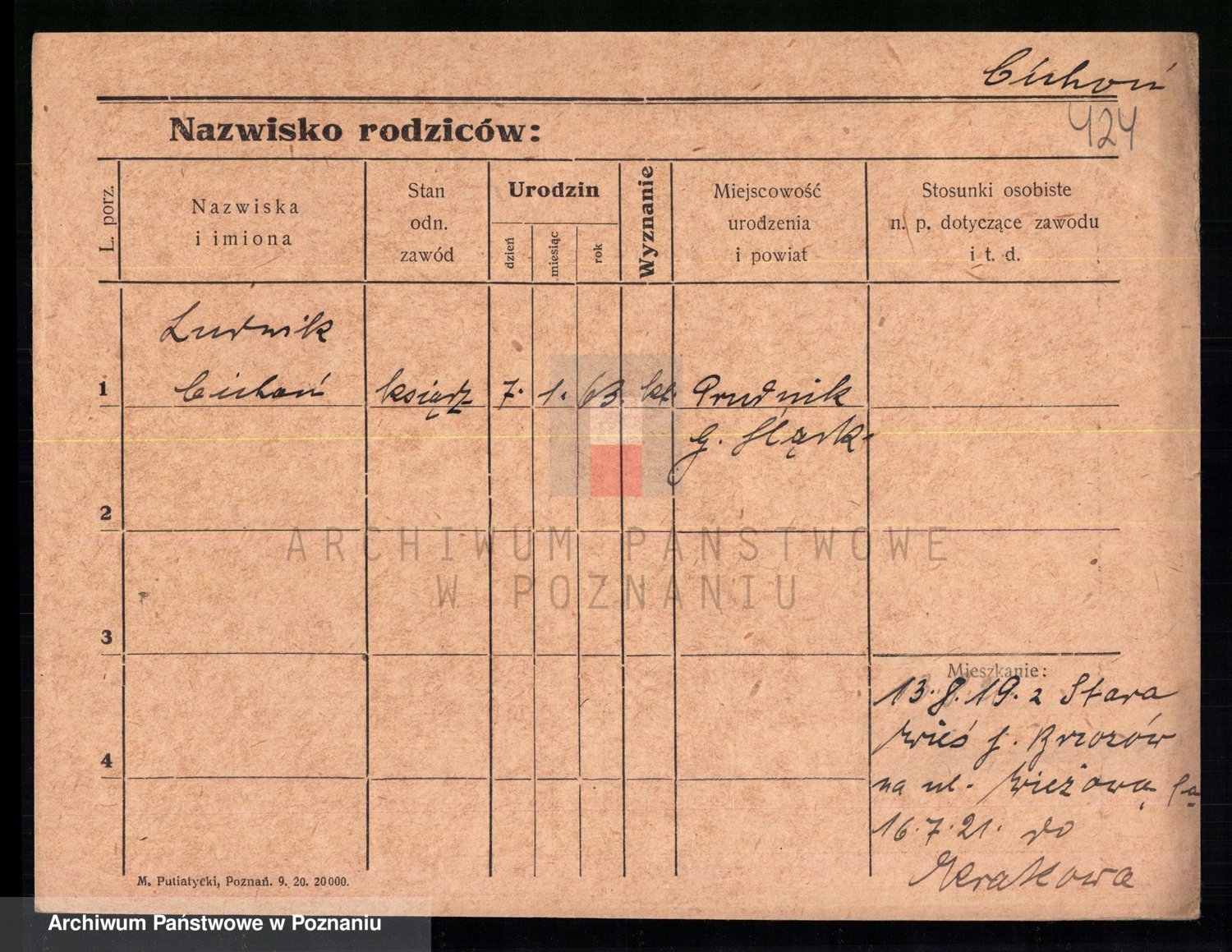 Podgląd karty osobowej dostępny jest po kliknięciu na nazwisko lub ikonkę karty. Można dokonywać powiększenia (ikony na górze) lub przechodzić między kolejnymi skanami (strzałki po bokach).