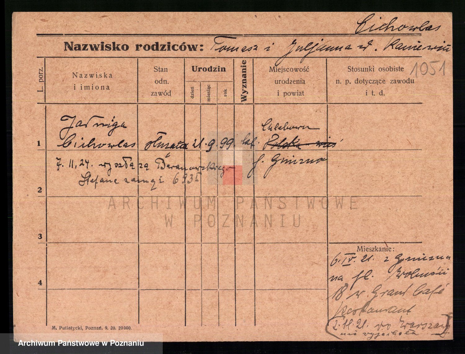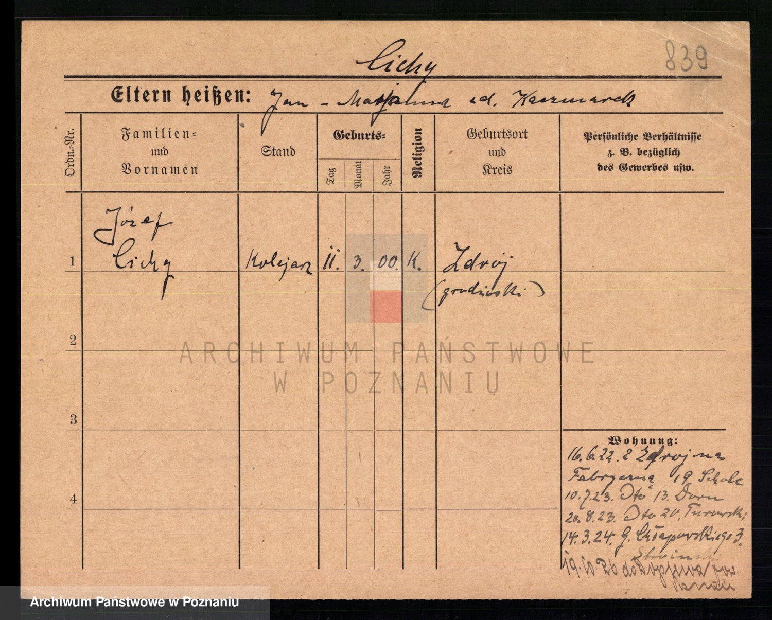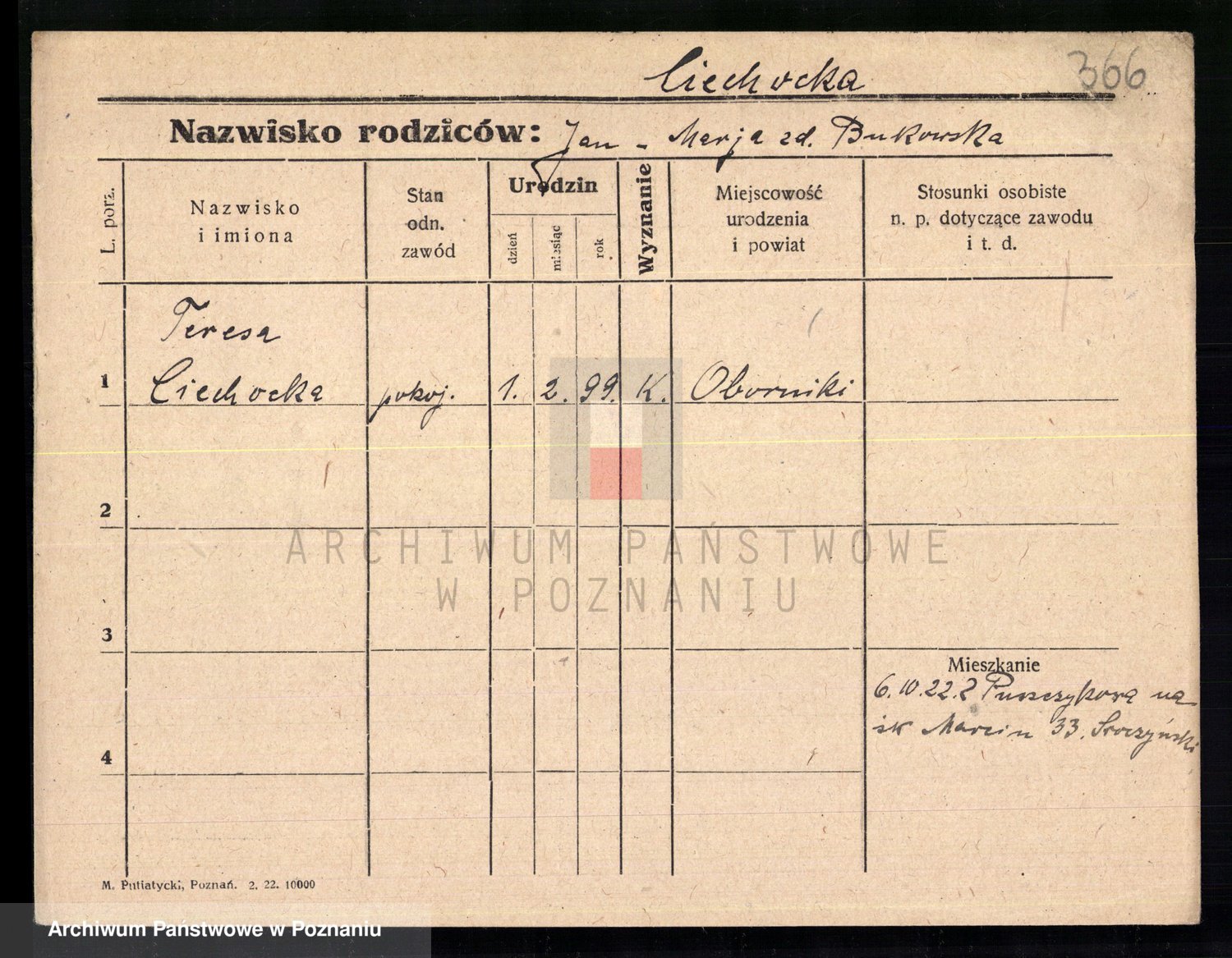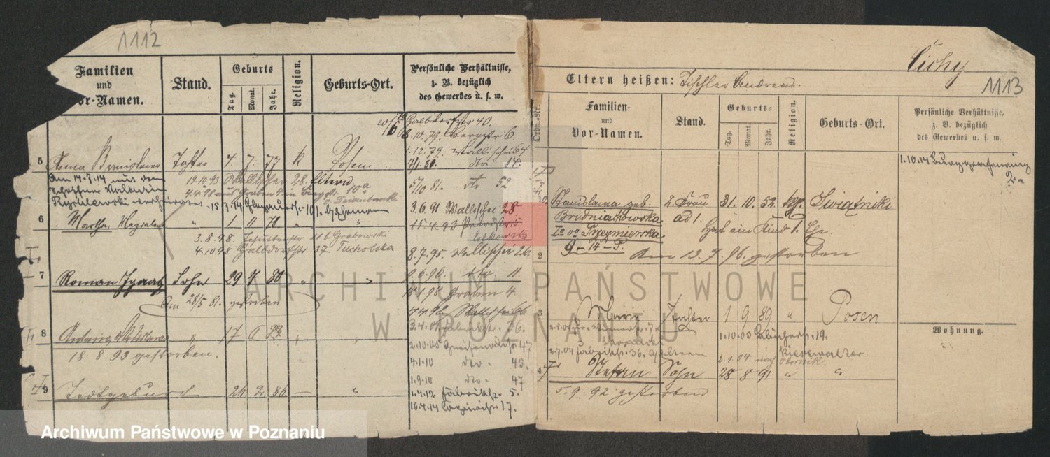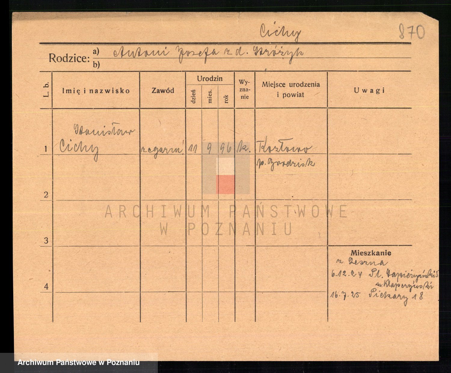 Podgląd karty osobowej dostępny jest po kliknięciu na nazwisko lub ikonkę karty. Można dokonywać powiększenia (ikony na górze) lub przechodzić między kolejnymi skanami (strzałki po bokach).