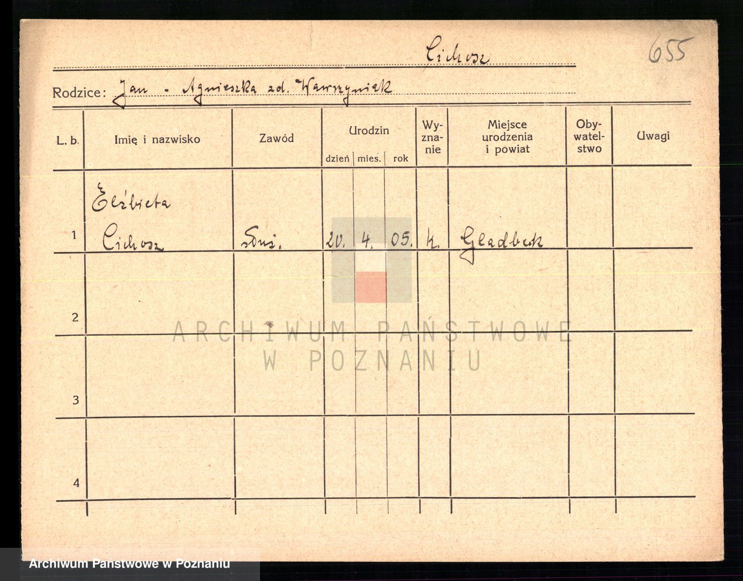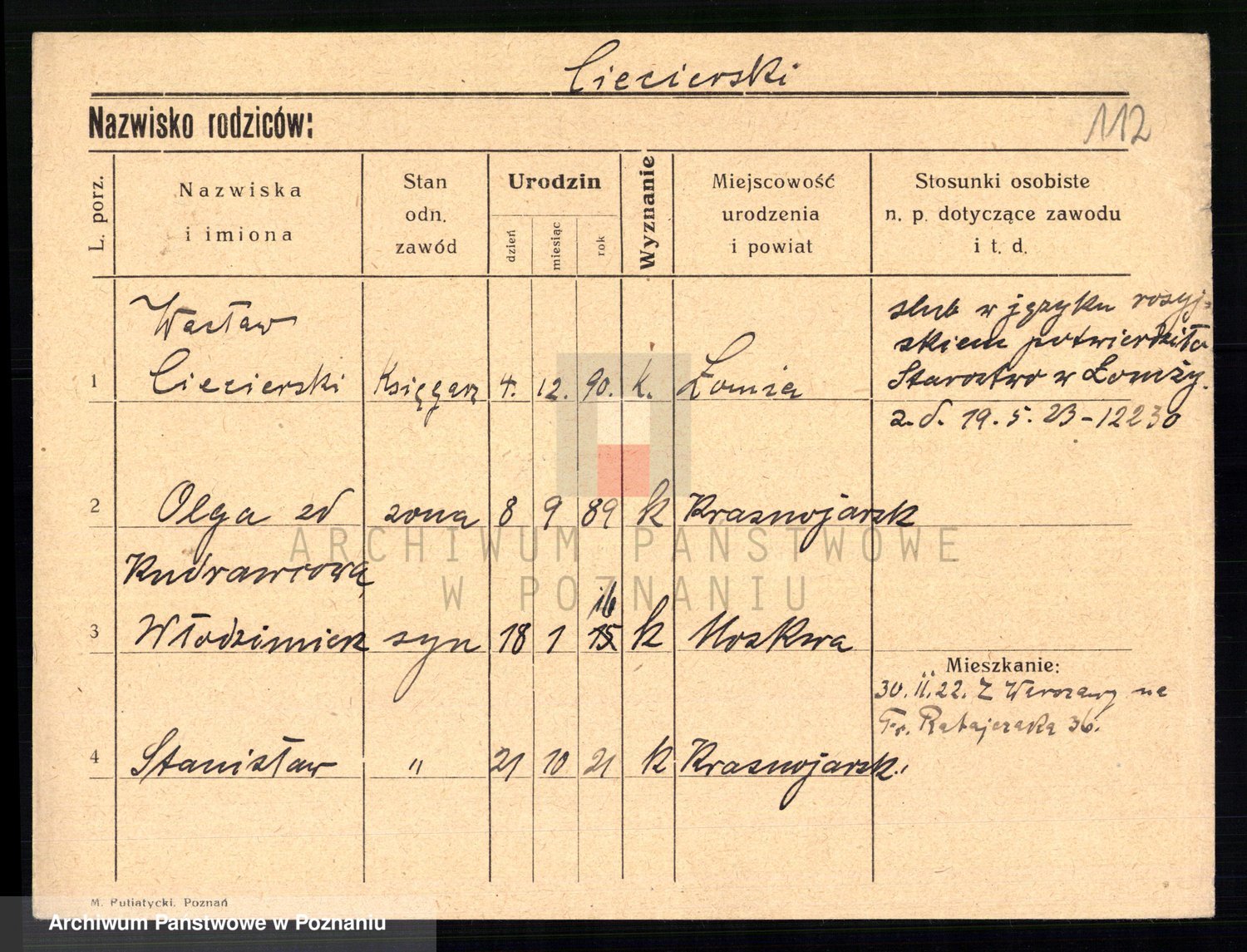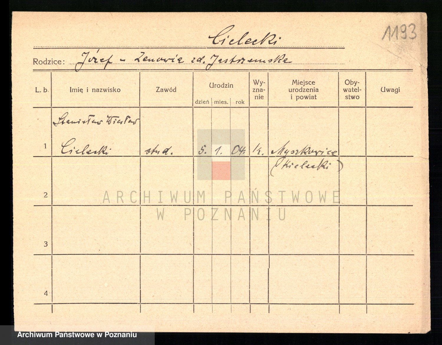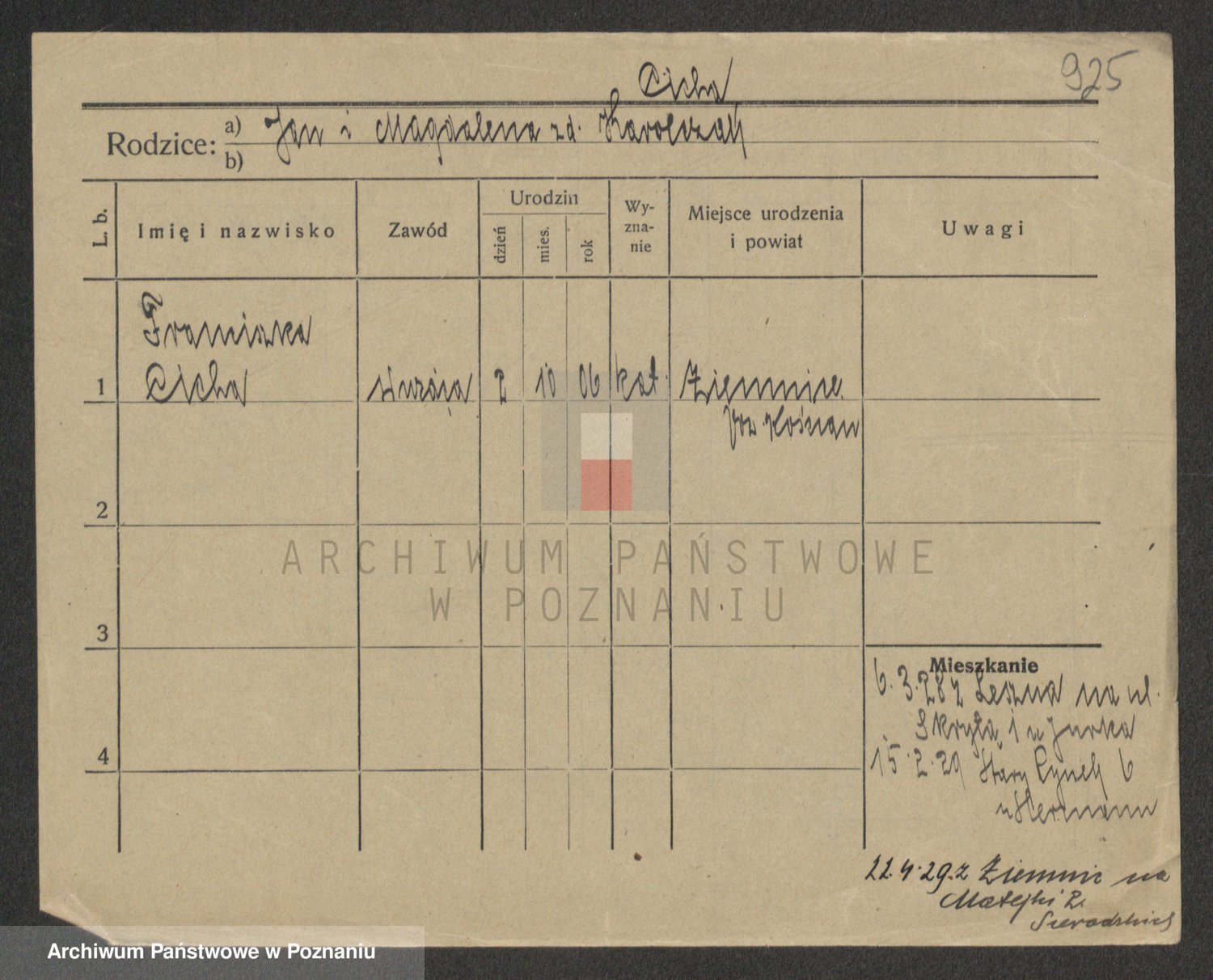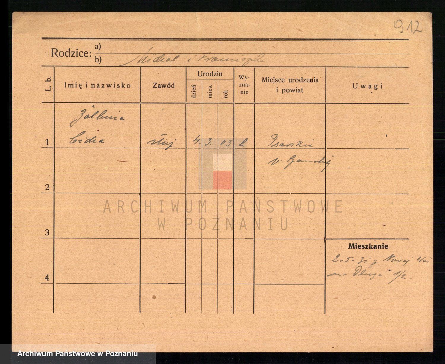 Podgląd karty osobowej dostępny jest po kliknięciu na nazwisko lub ikonkę karty. Można dokonywać powiększenia (ikony na górze) lub przechodzić między kolejnymi skanami (strzałki po bokach).