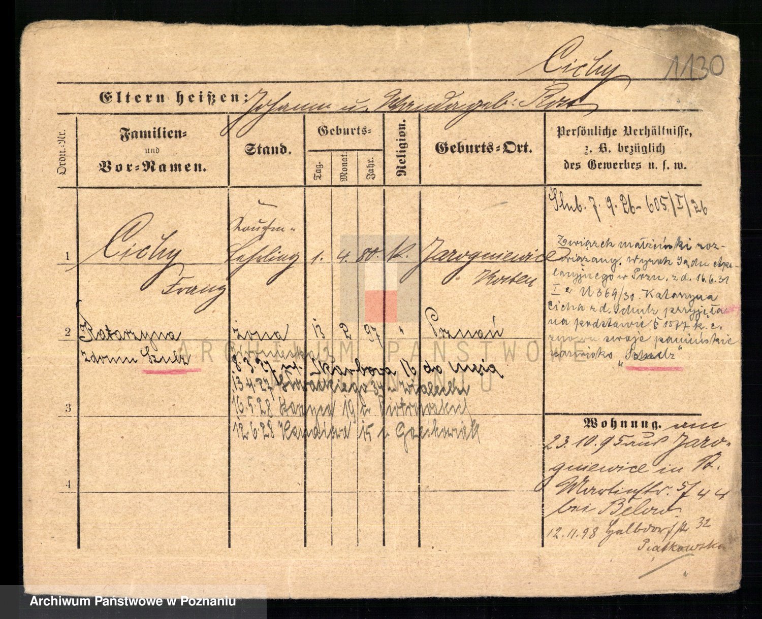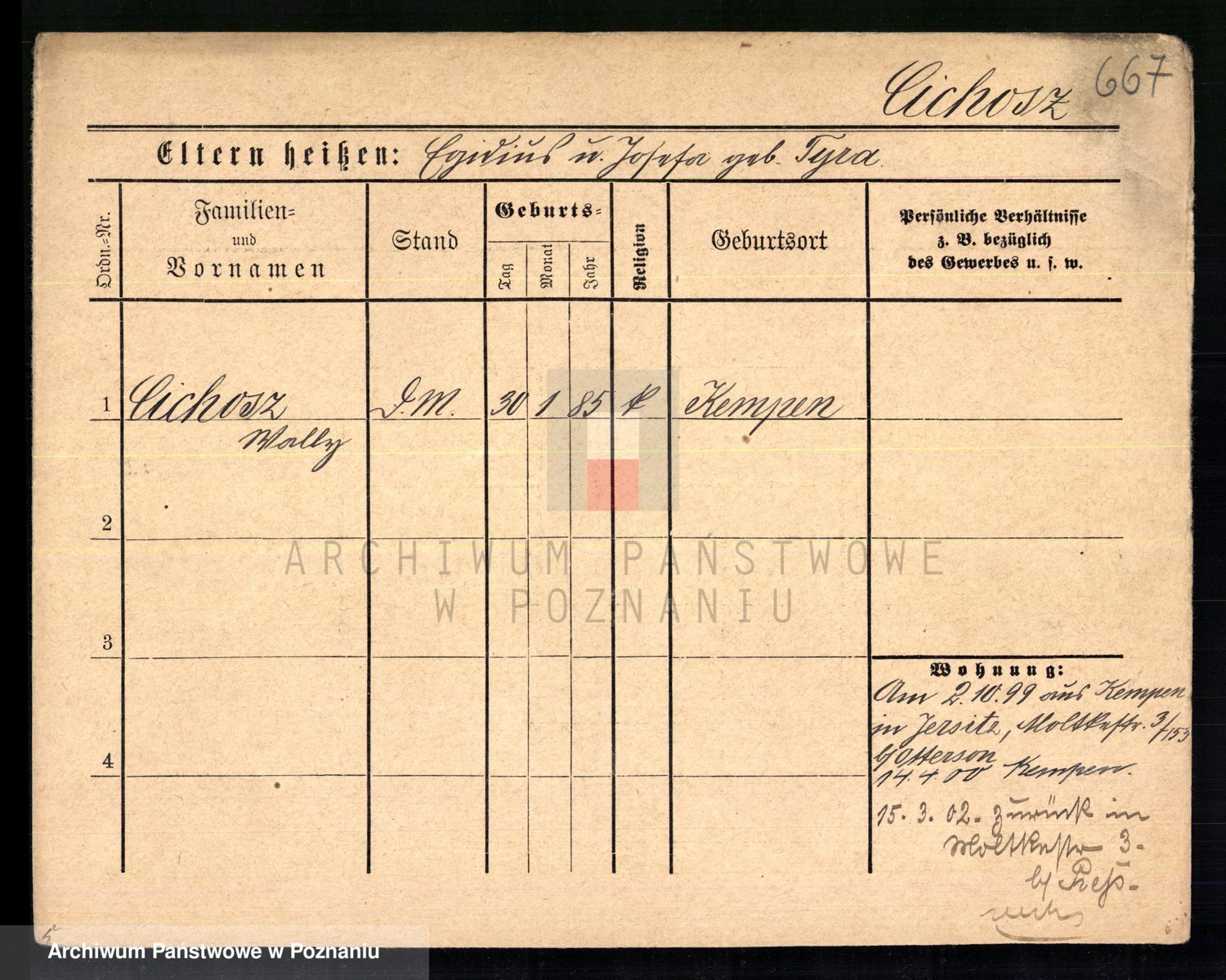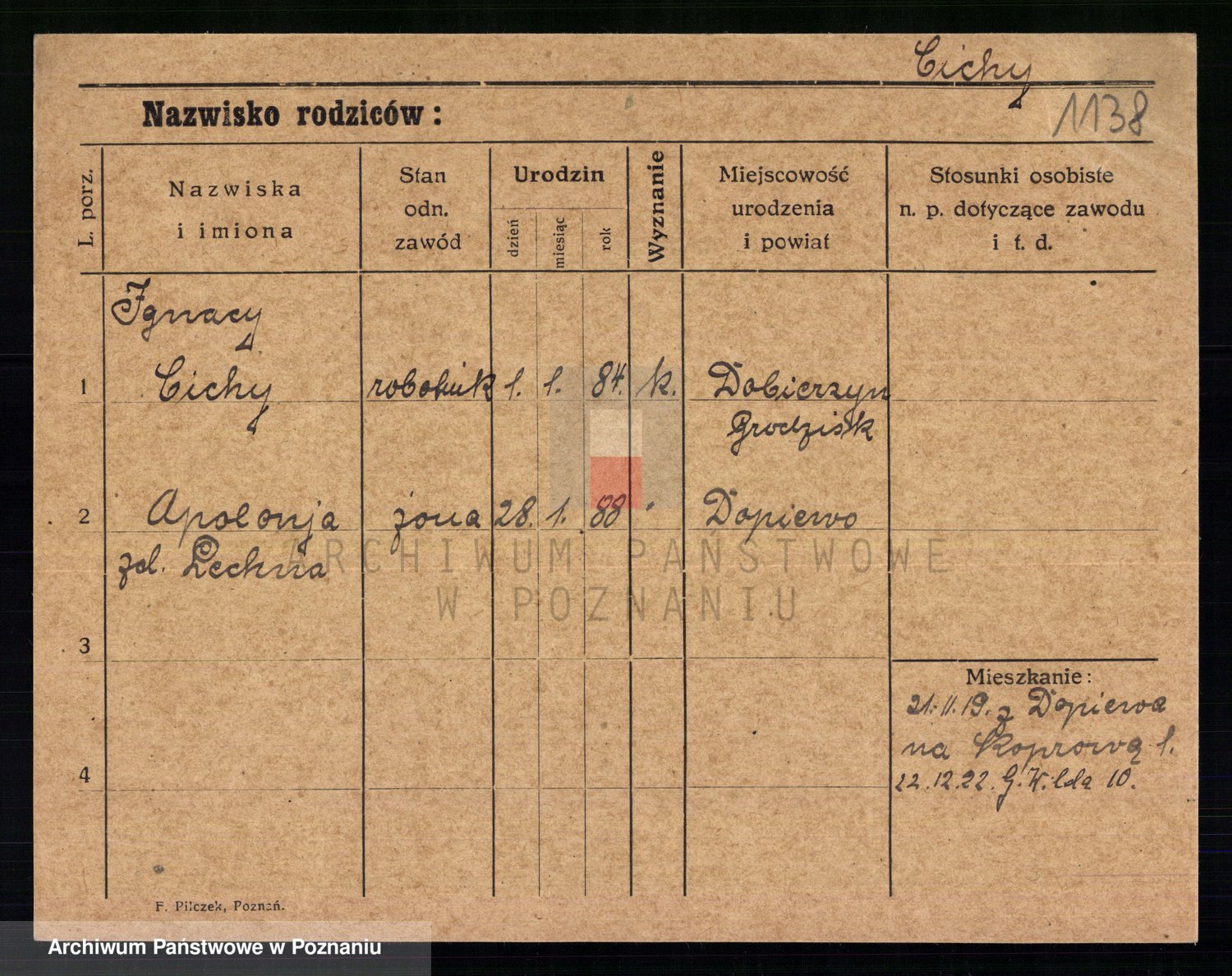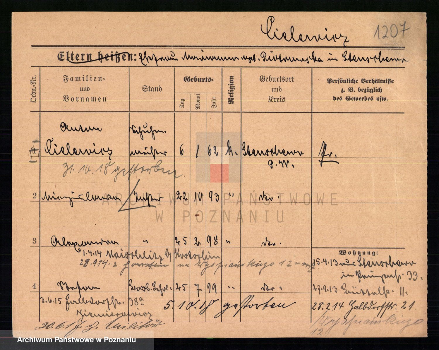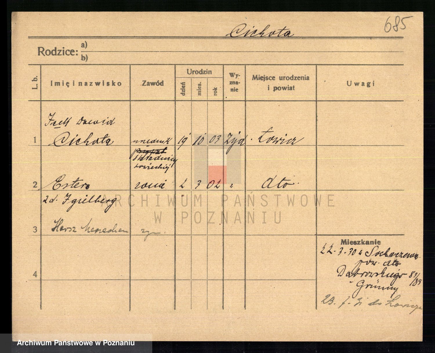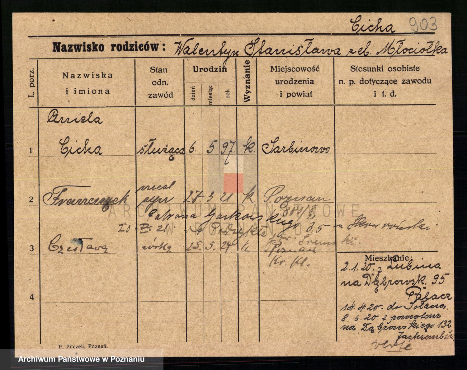 Podgląd karty osobowej dostępny jest po kliknięciu na nazwisko lub ikonkę karty. Można dokonywać powiększenia (ikony na górze) lub przechodzić między kolejnymi skanami (strzałki po bokach).