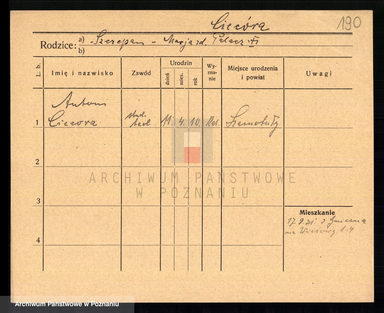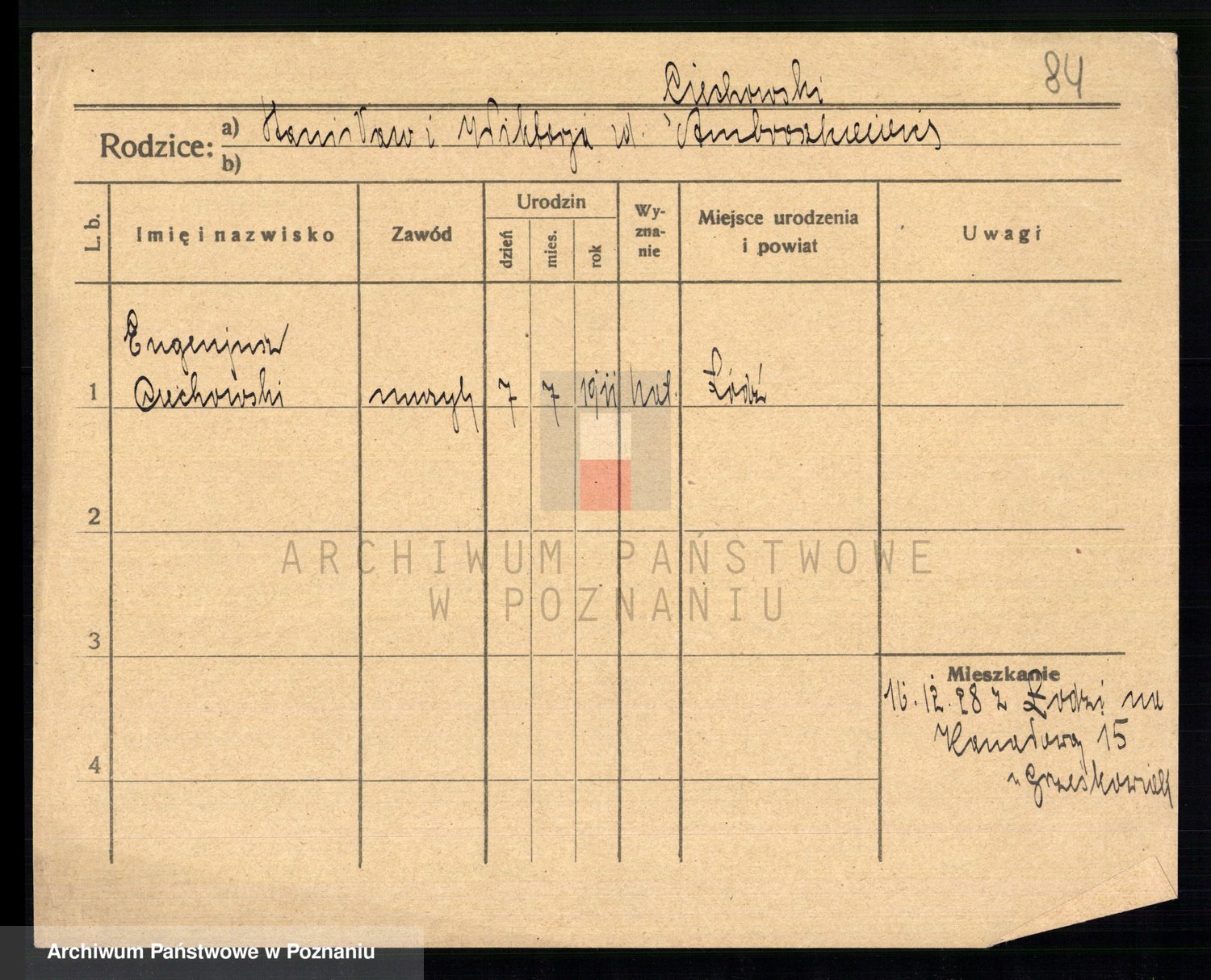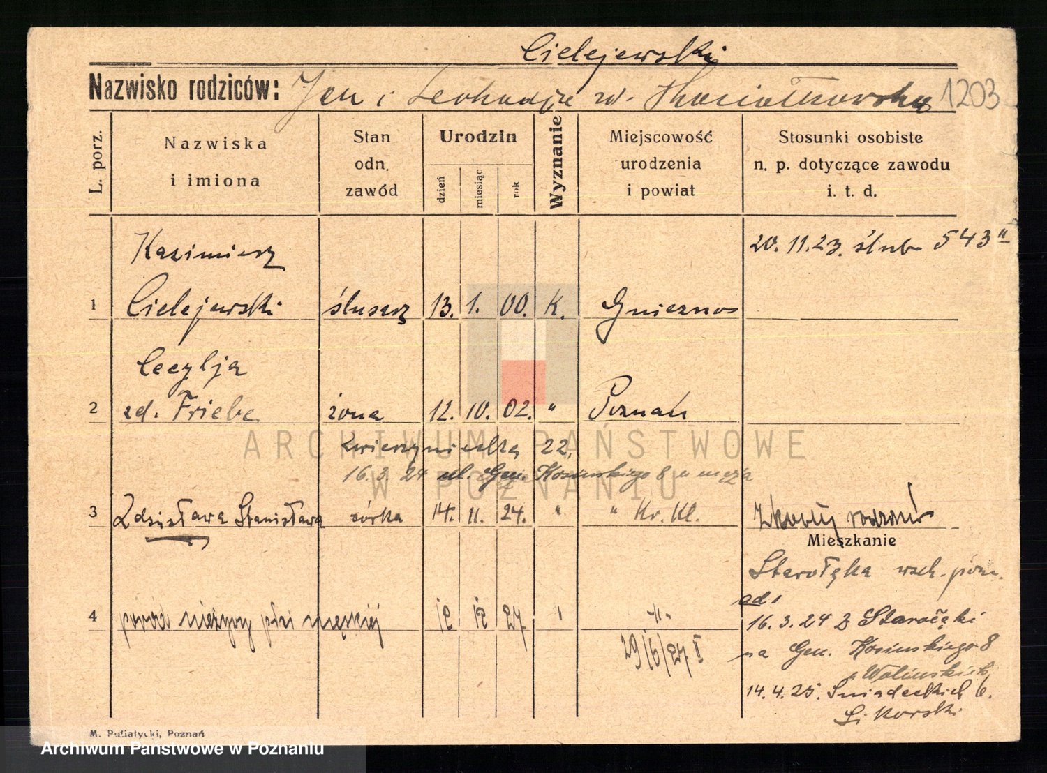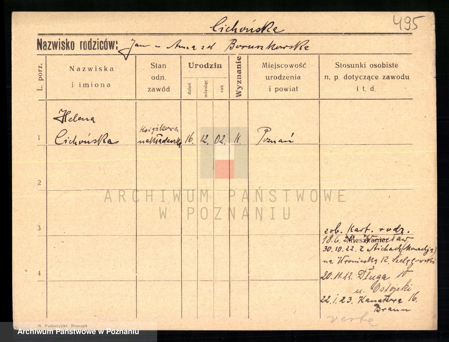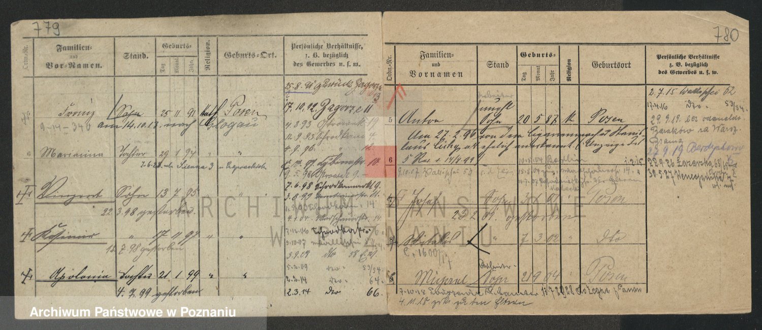 Podgląd karty osobowej dostępny jest po kliknięciu na nazwisko lub ikonkę karty. Można dokonywać powiększenia (ikony na górze) lub przechodzić między kolejnymi skanami (strzałki po bokach).