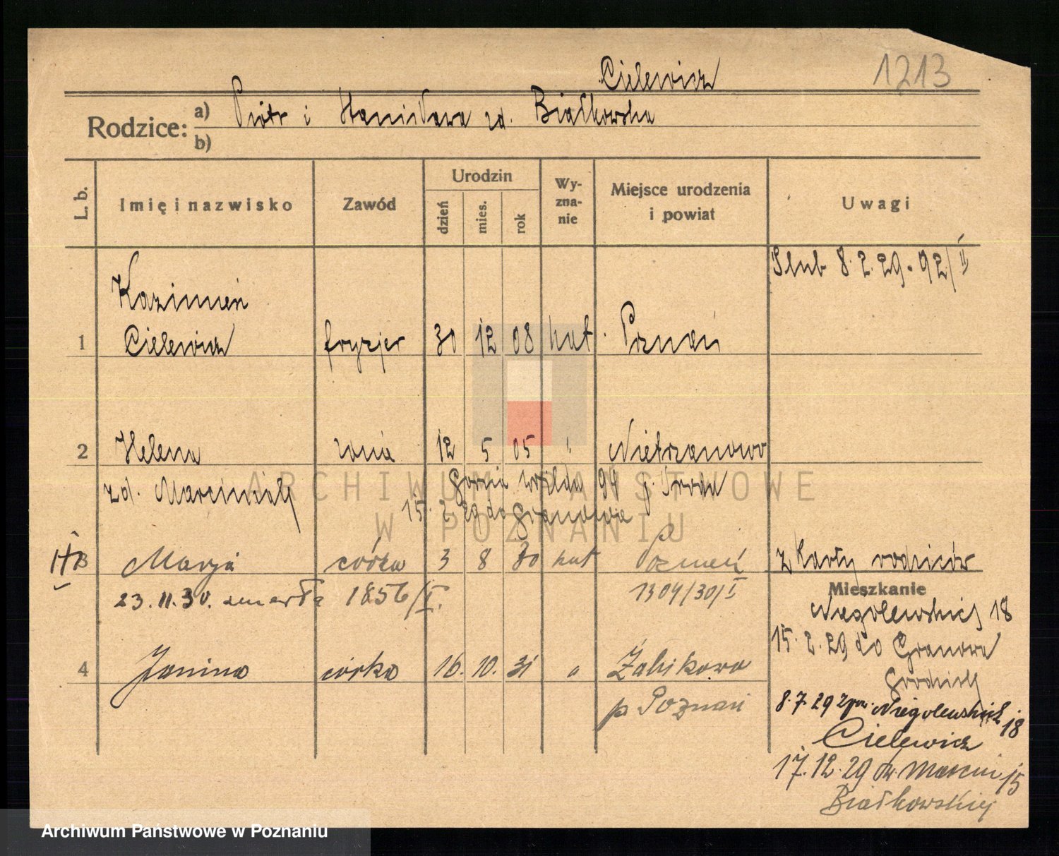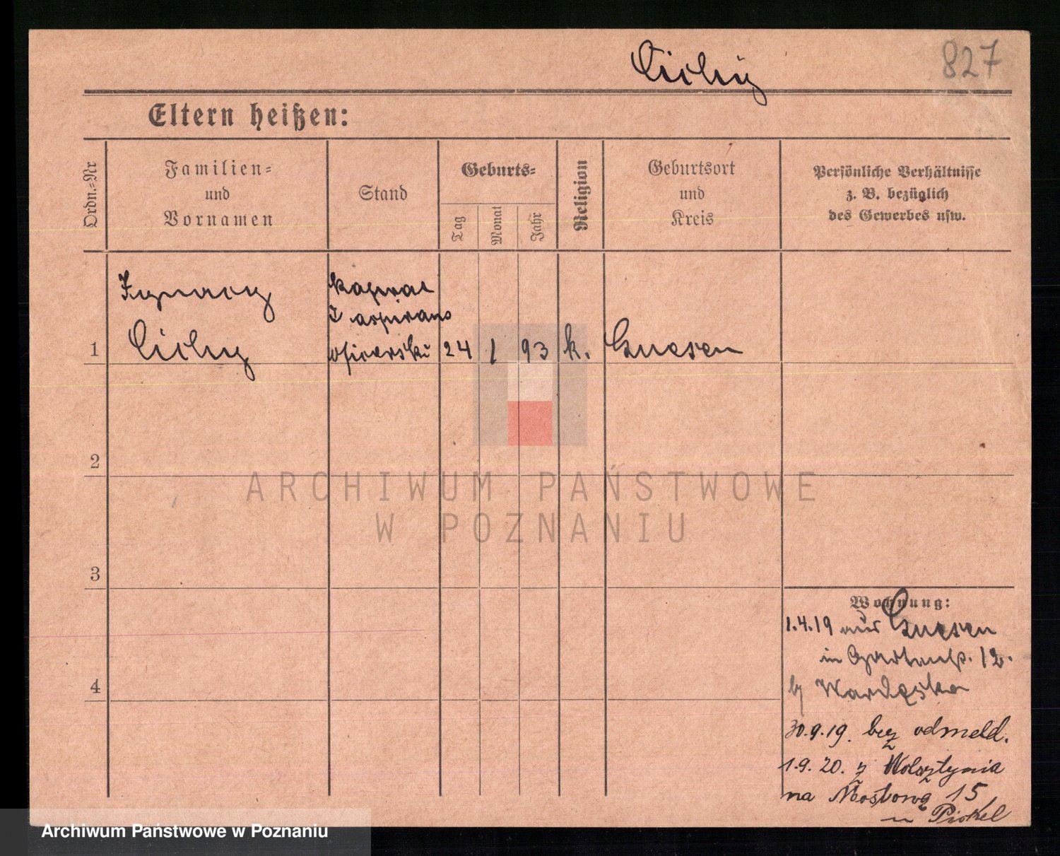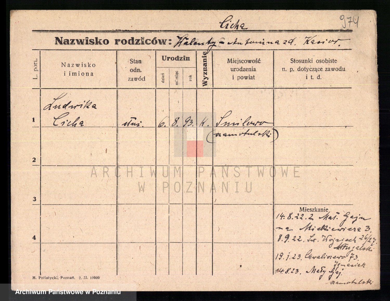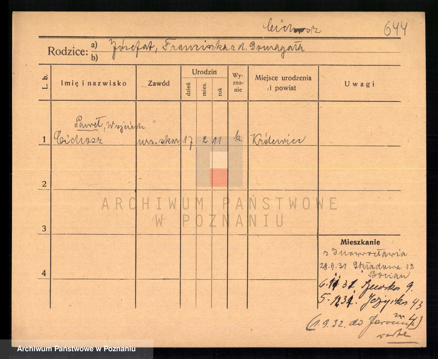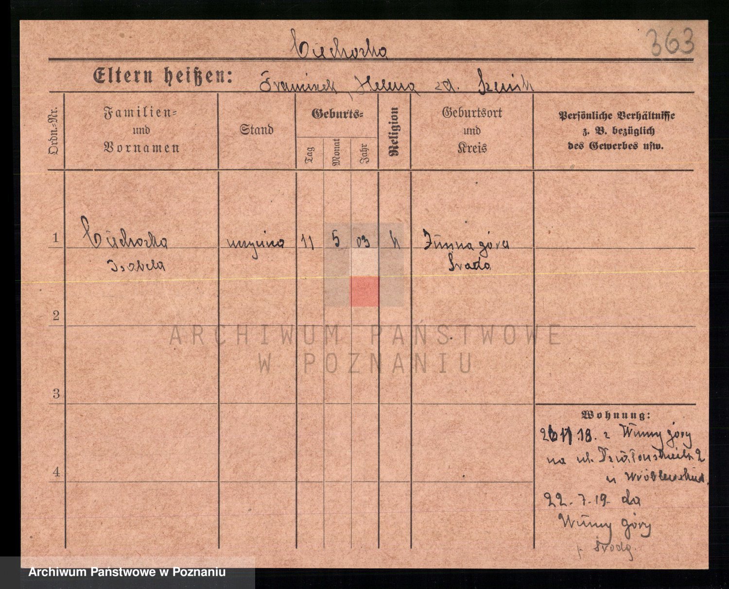 Podgląd karty osobowej dostępny jest po kliknięciu na nazwisko lub ikonkę karty. Można dokonywać powiększenia (ikony na górze) lub przechodzić między kolejnymi skanami (strzałki po bokach).