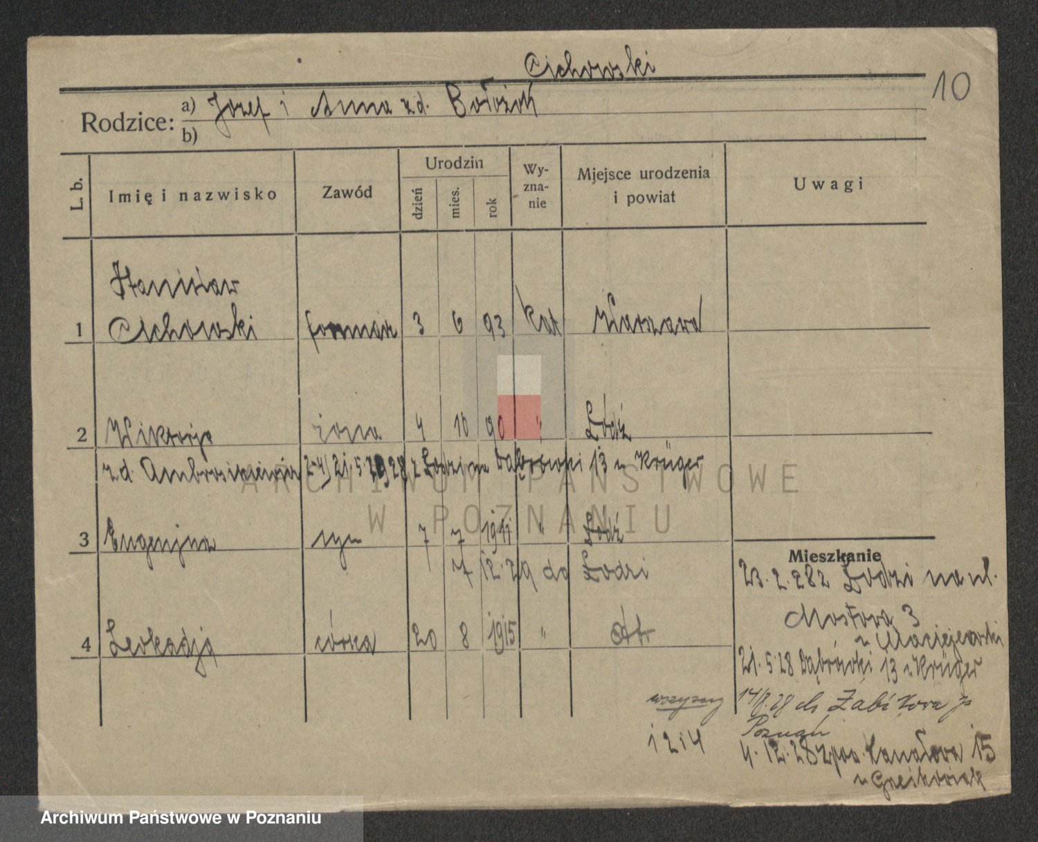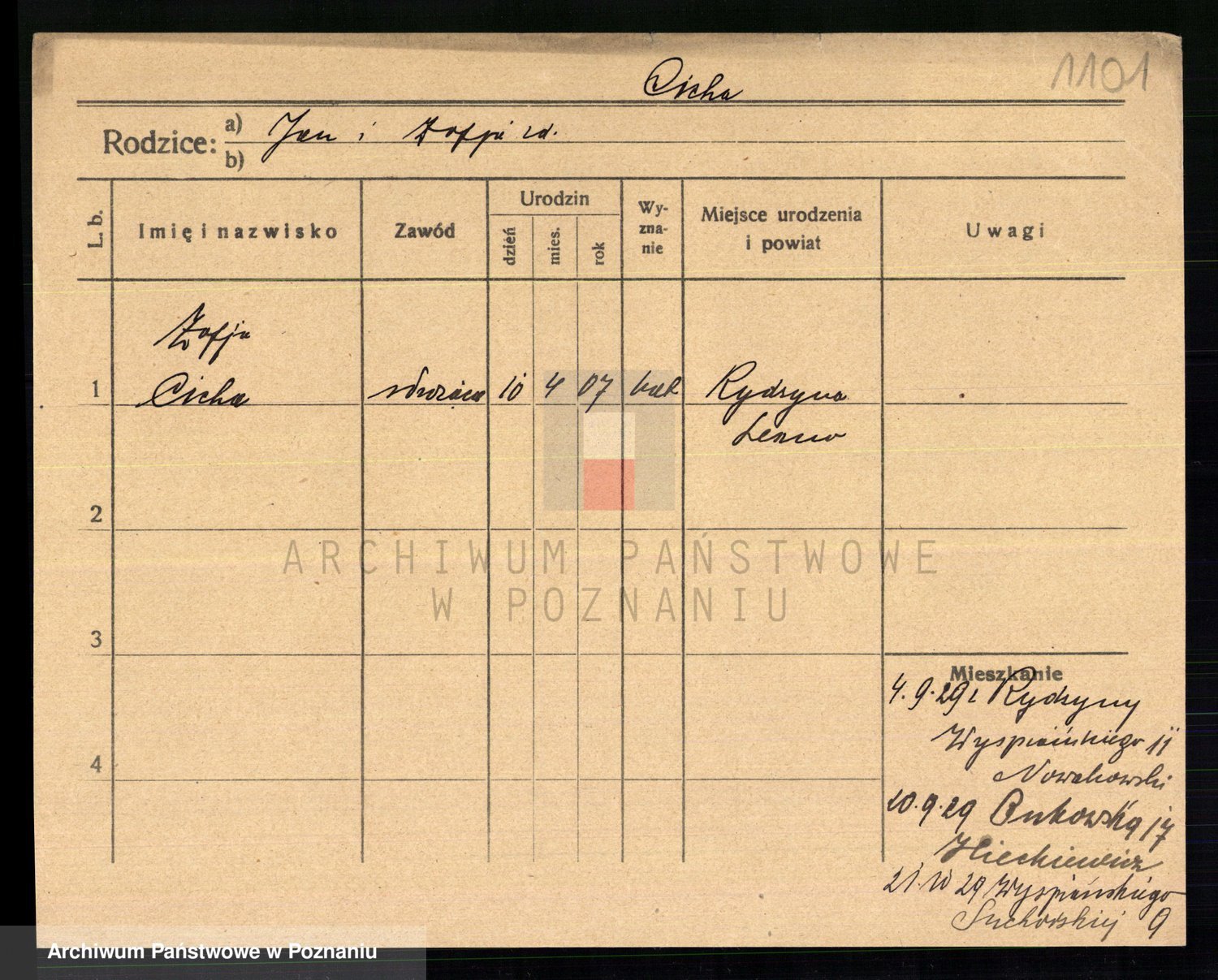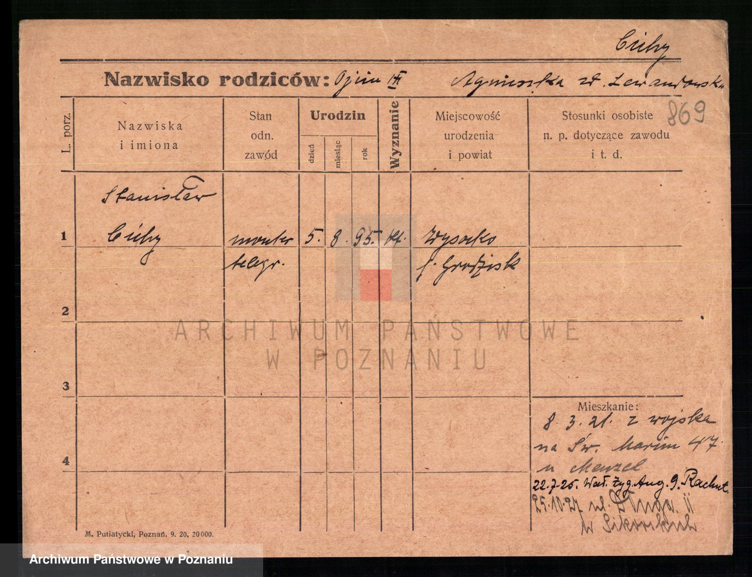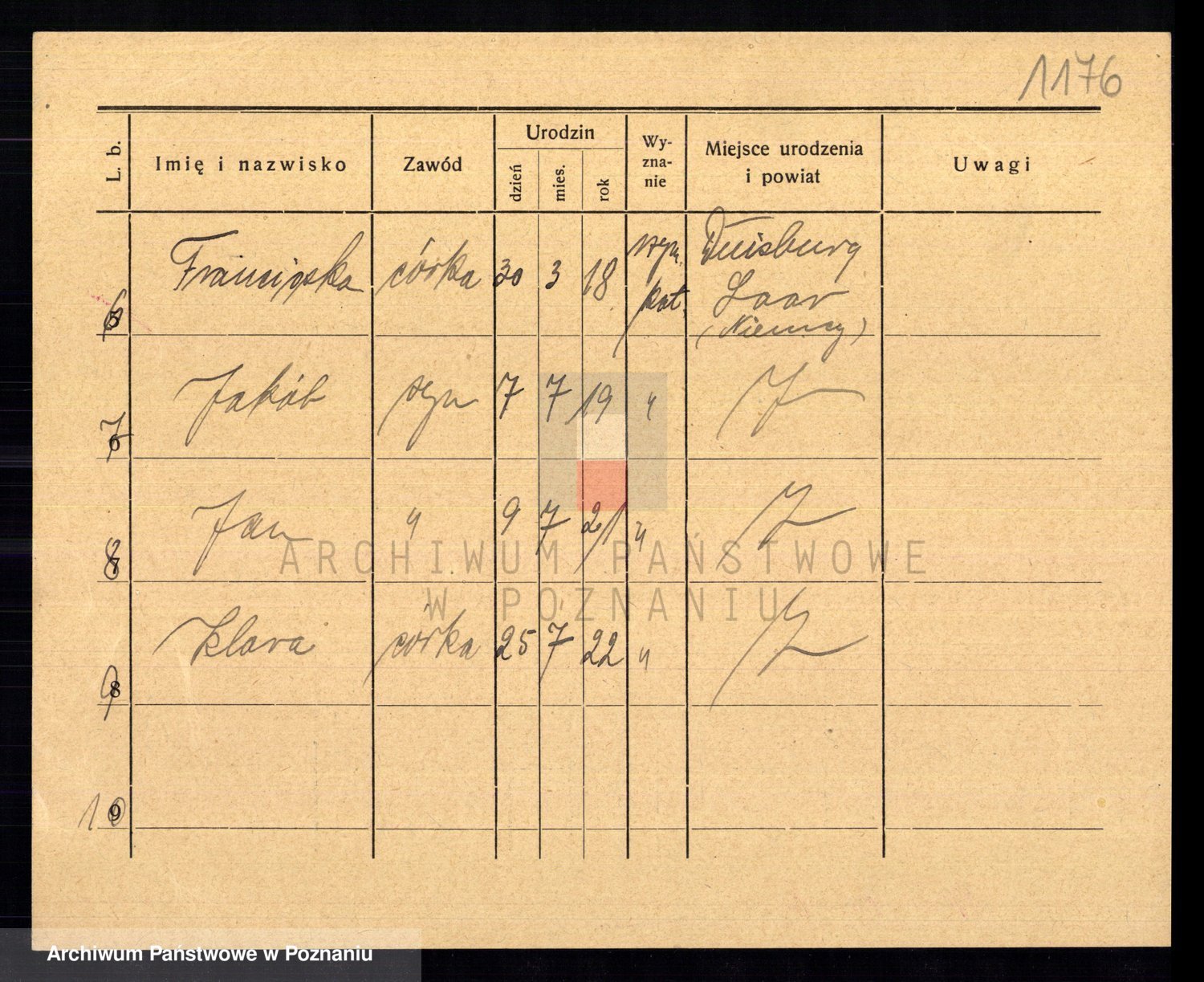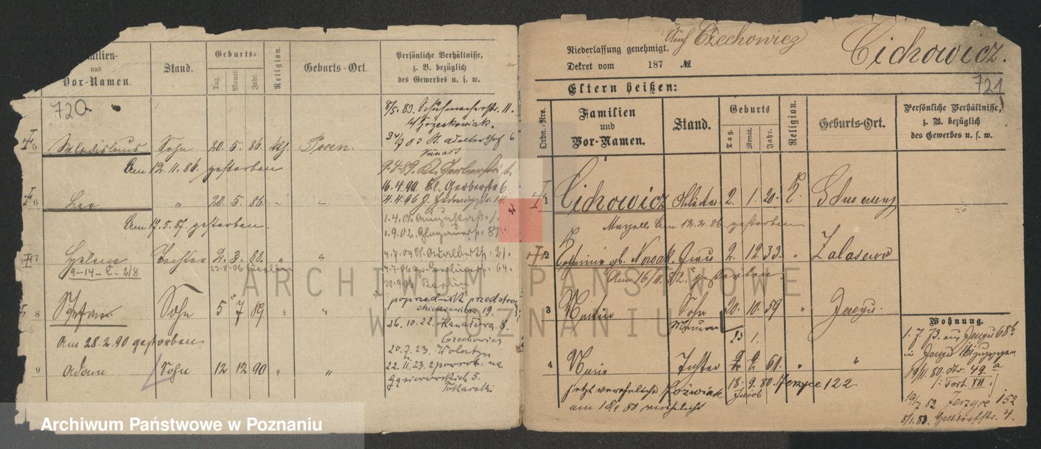 Podgląd karty osobowej dostępny jest po kliknięciu na nazwisko lub ikonkę karty. Można dokonywać powiększenia (ikony na górze) lub przechodzić między kolejnymi skanami (strzałki po bokach).