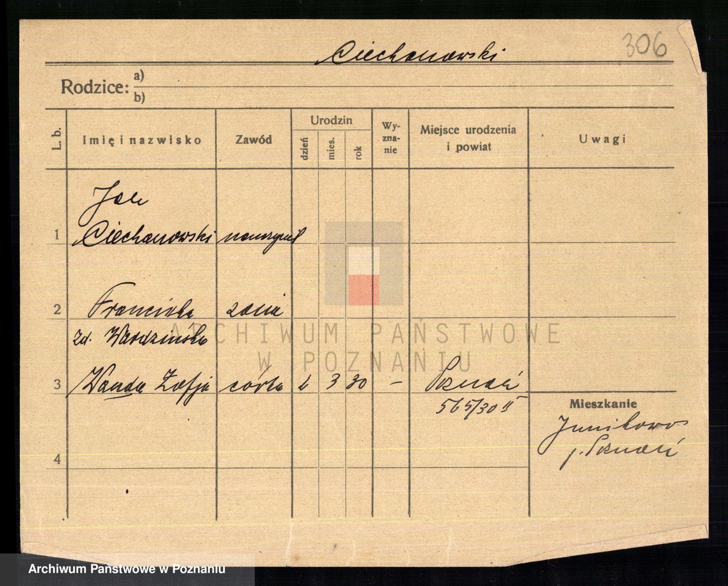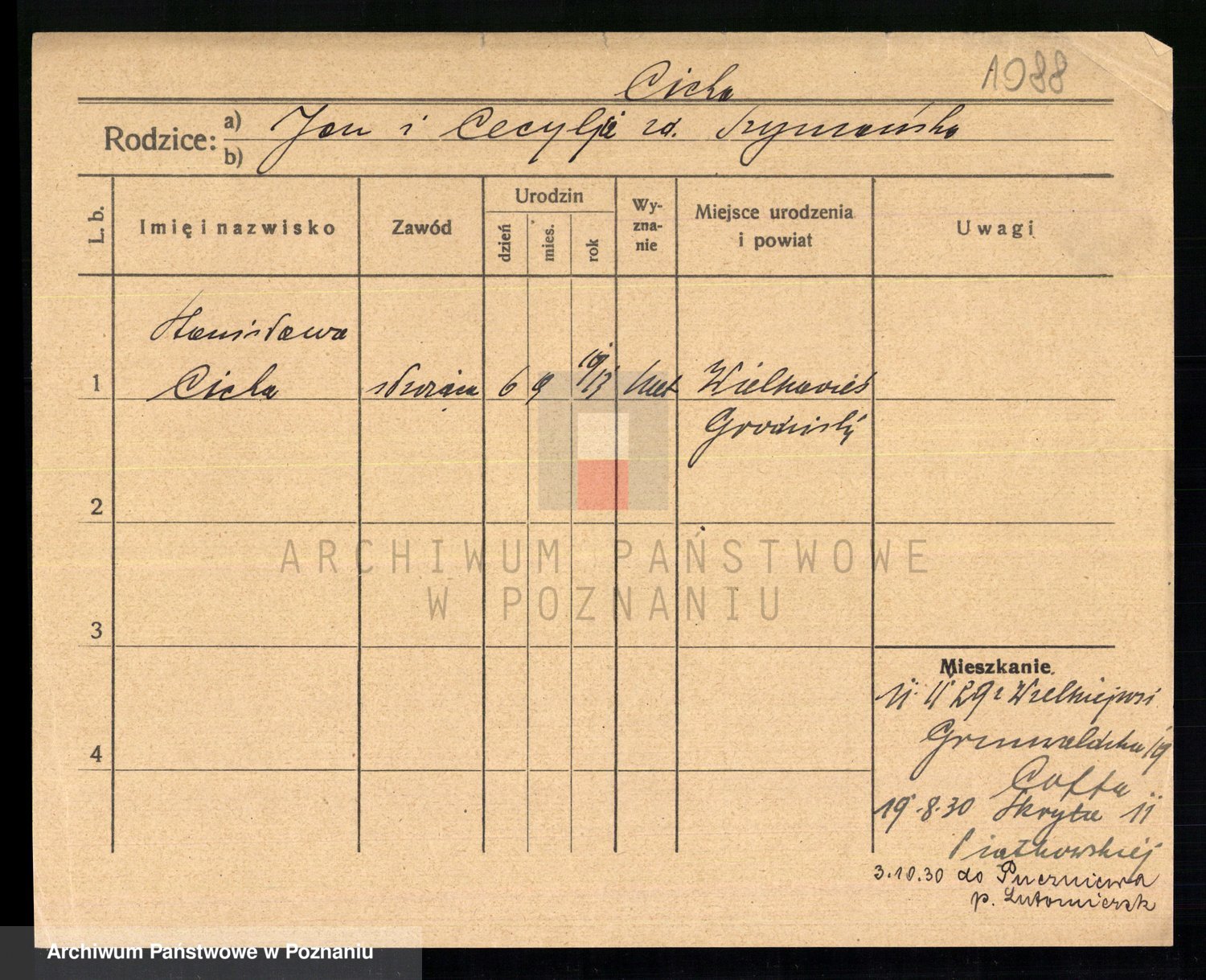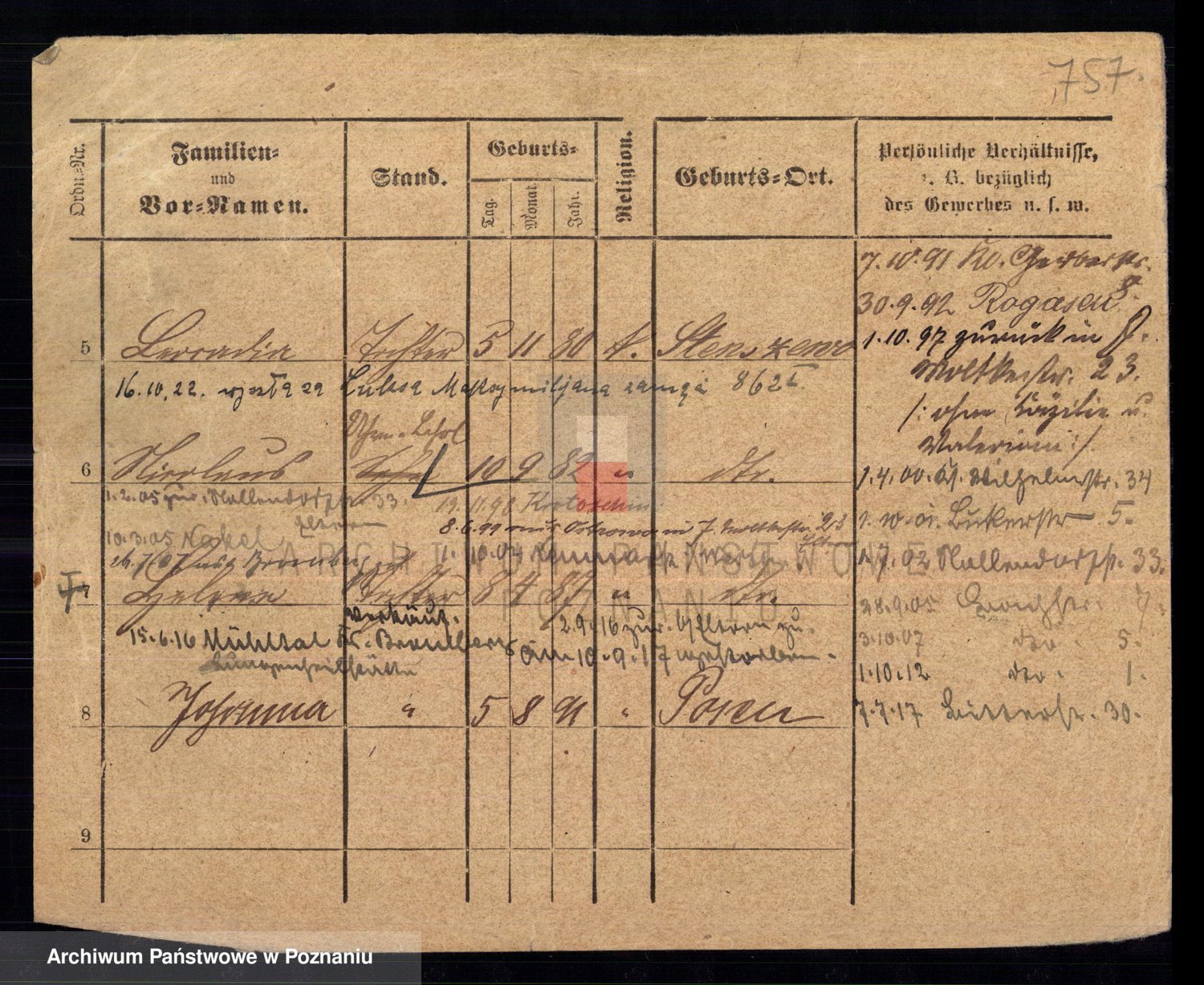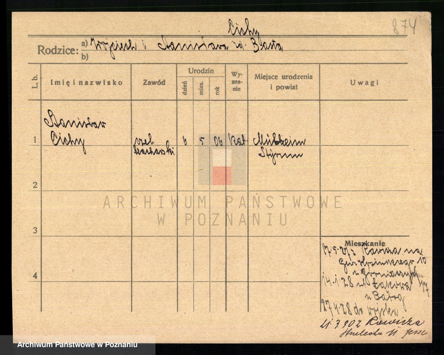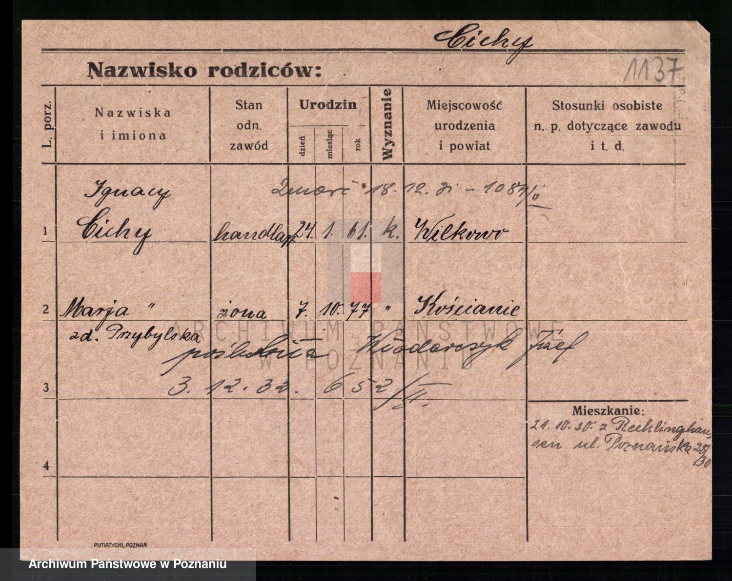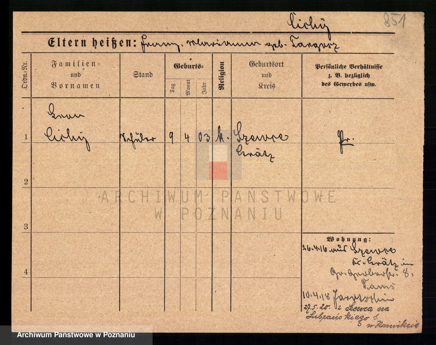 Podgląd karty osobowej dostępny jest po kliknięciu na nazwisko lub ikonkę karty. Można dokonywać powiększenia (ikony na górze) lub przechodzić między kolejnymi skanami (strzałki po bokach).
