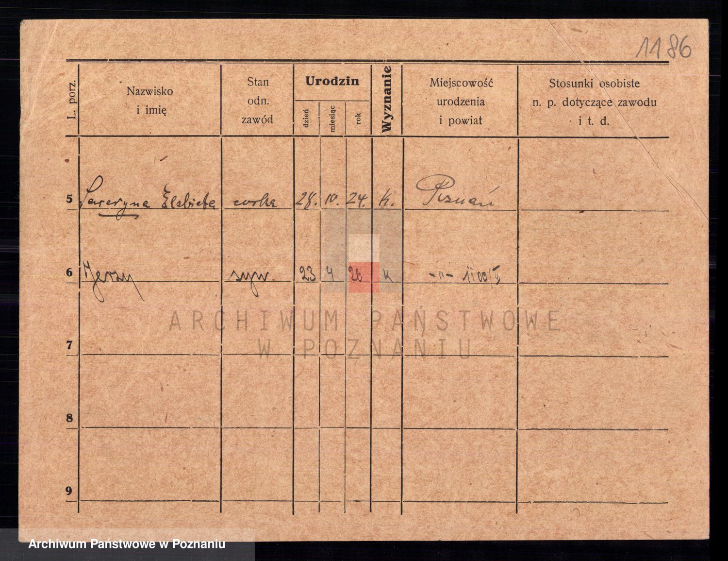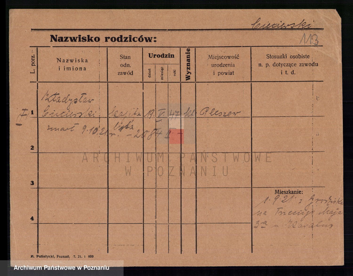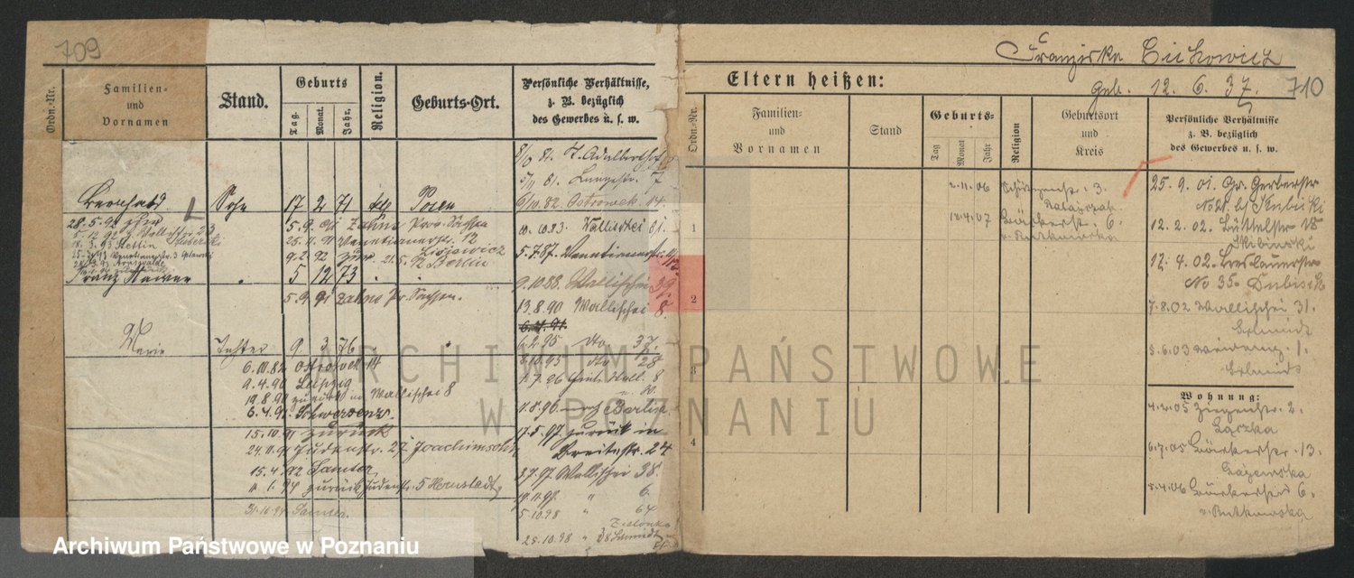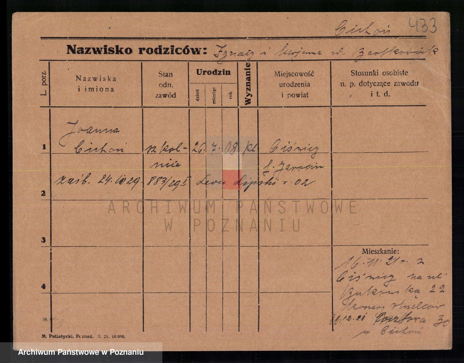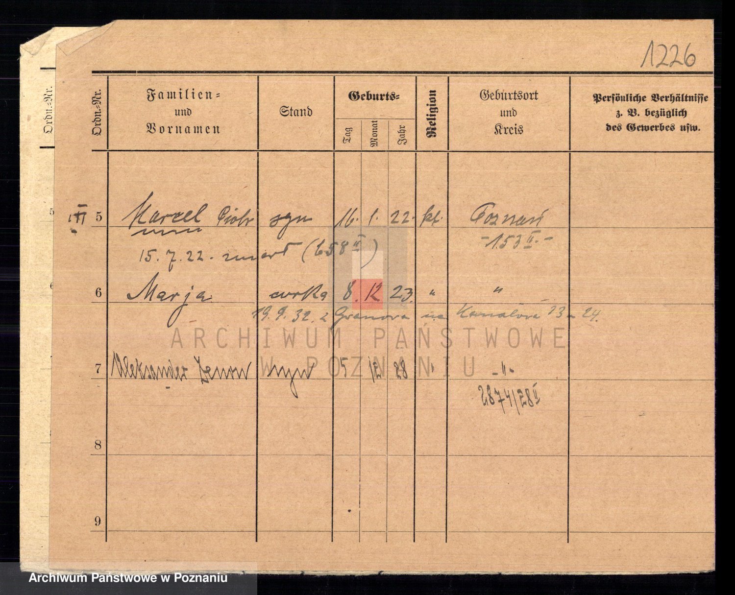 Podgląd karty osobowej dostępny jest po kliknięciu na nazwisko lub ikonkę karty. Można dokonywać powiększenia (ikony na górze) lub przechodzić między kolejnymi skanami (strzałki po bokach).