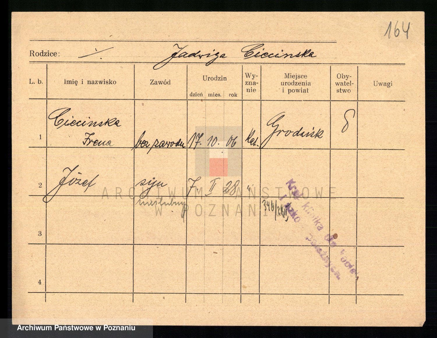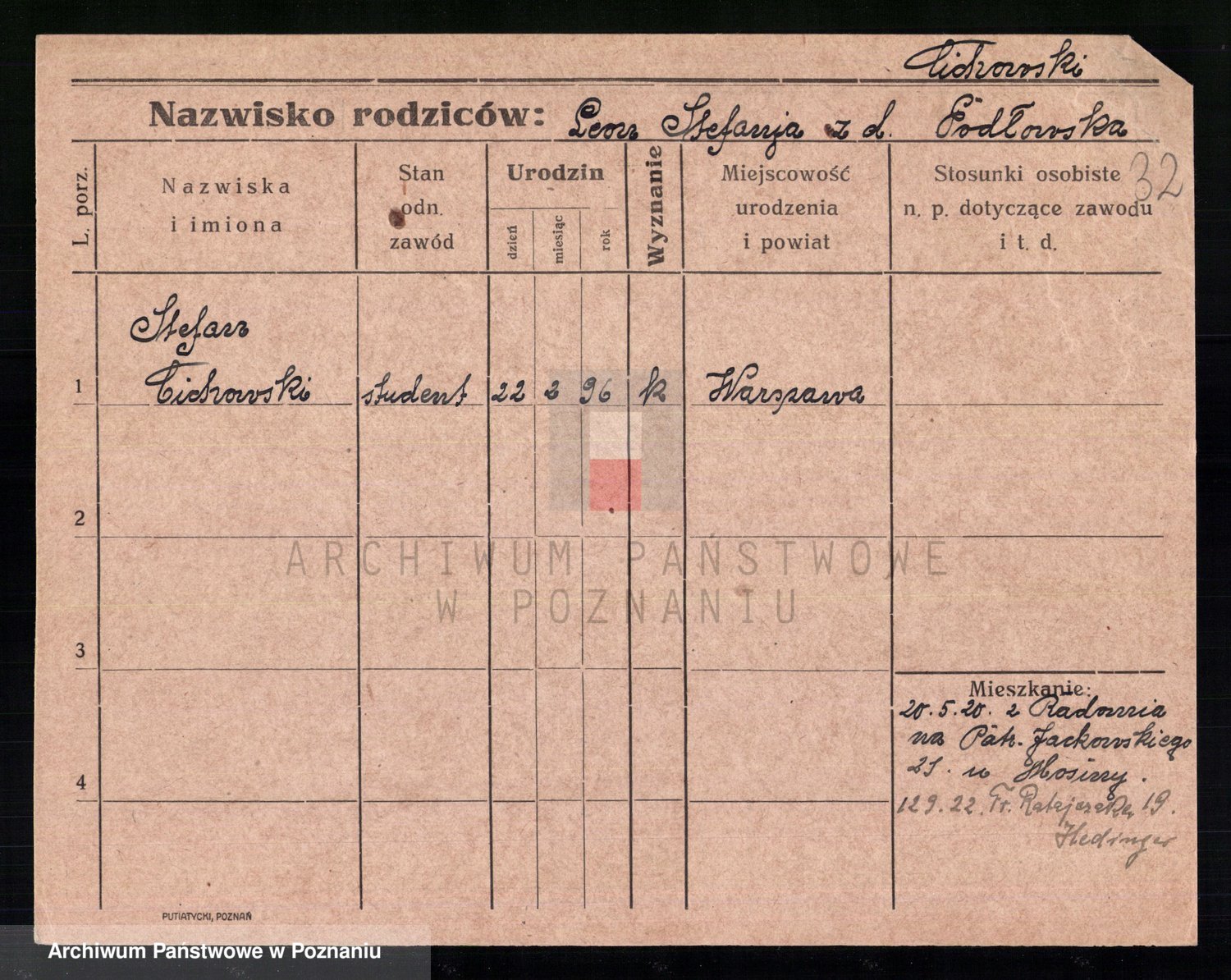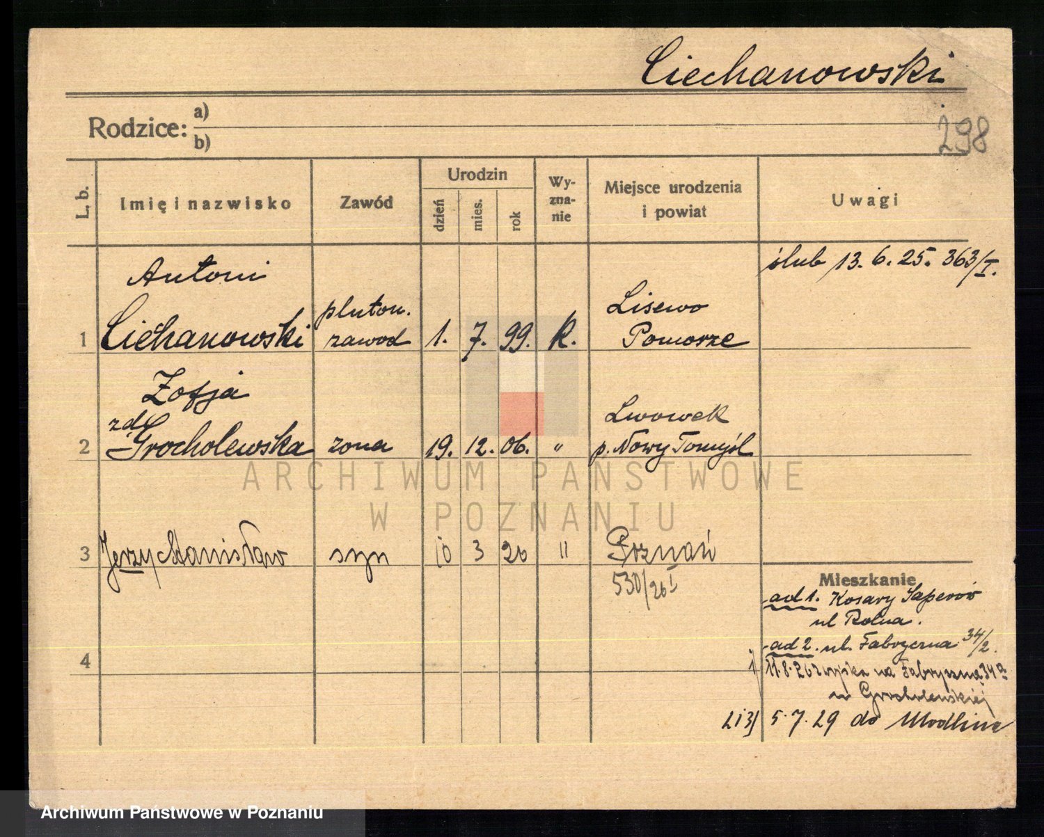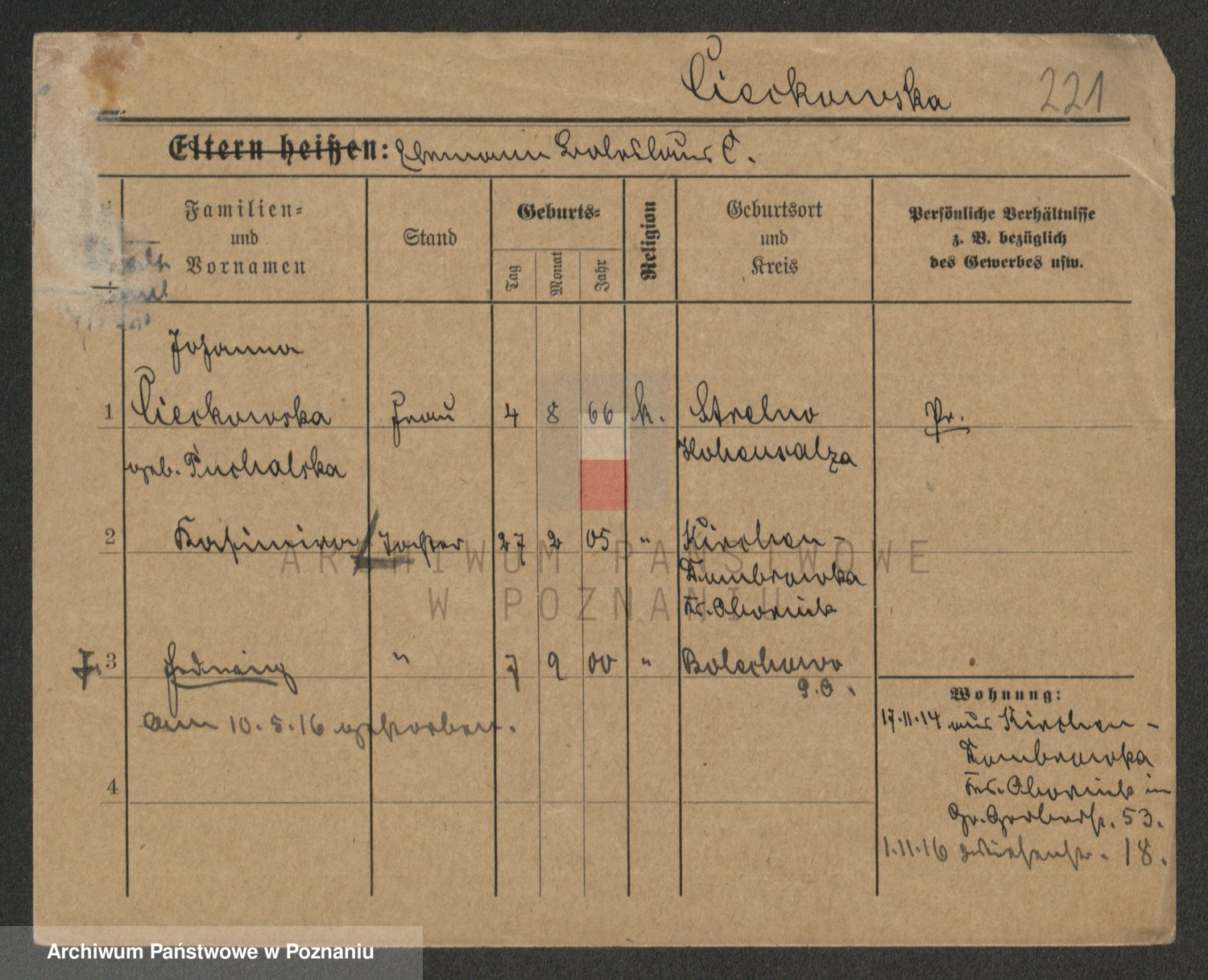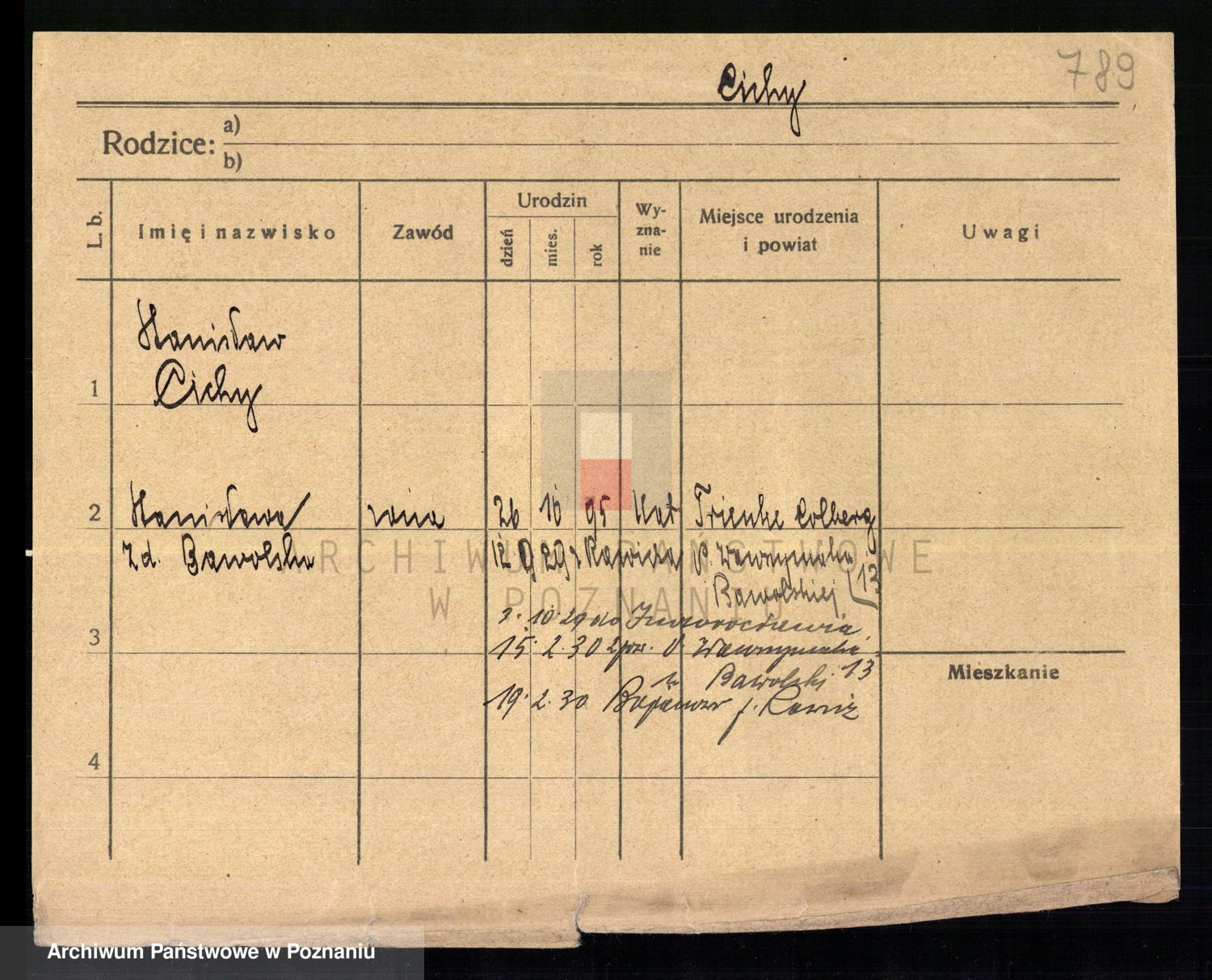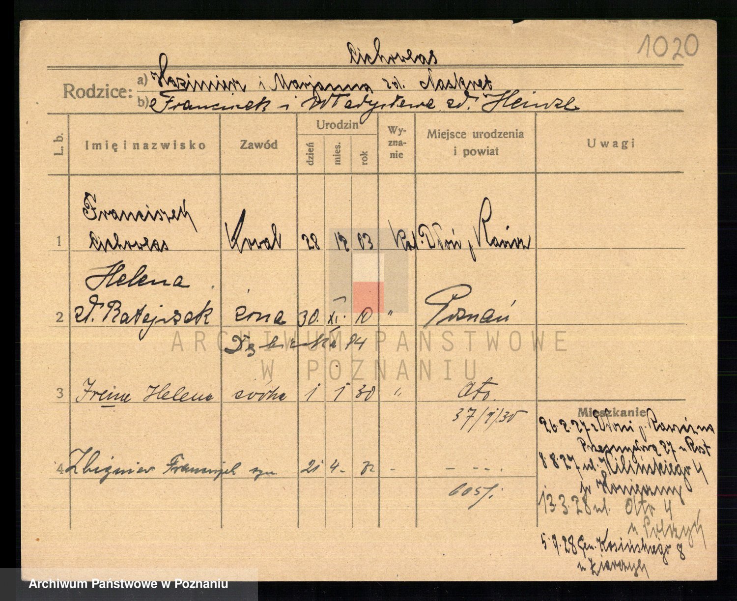 Podgląd karty osobowej dostępny jest po kliknięciu na nazwisko lub ikonkę karty. Można dokonywać powiększenia (ikony na górze) lub przechodzić między kolejnymi skanami (strzałki po bokach).