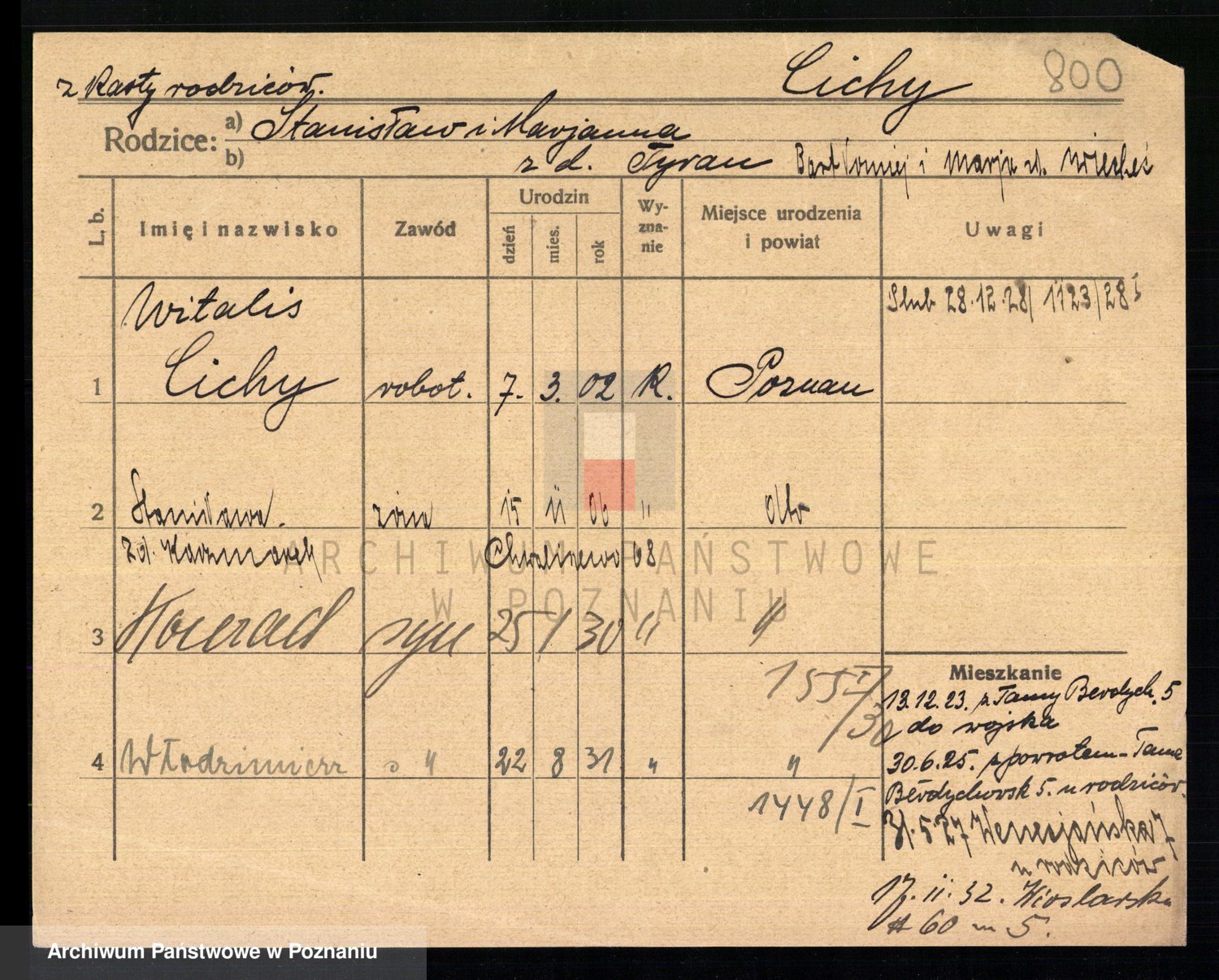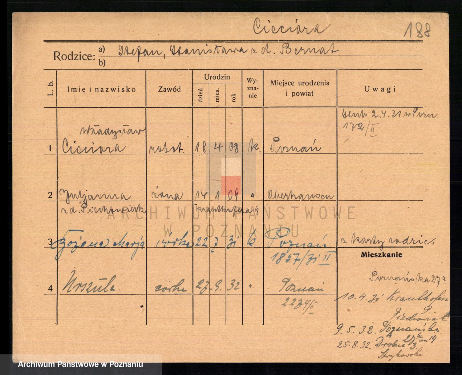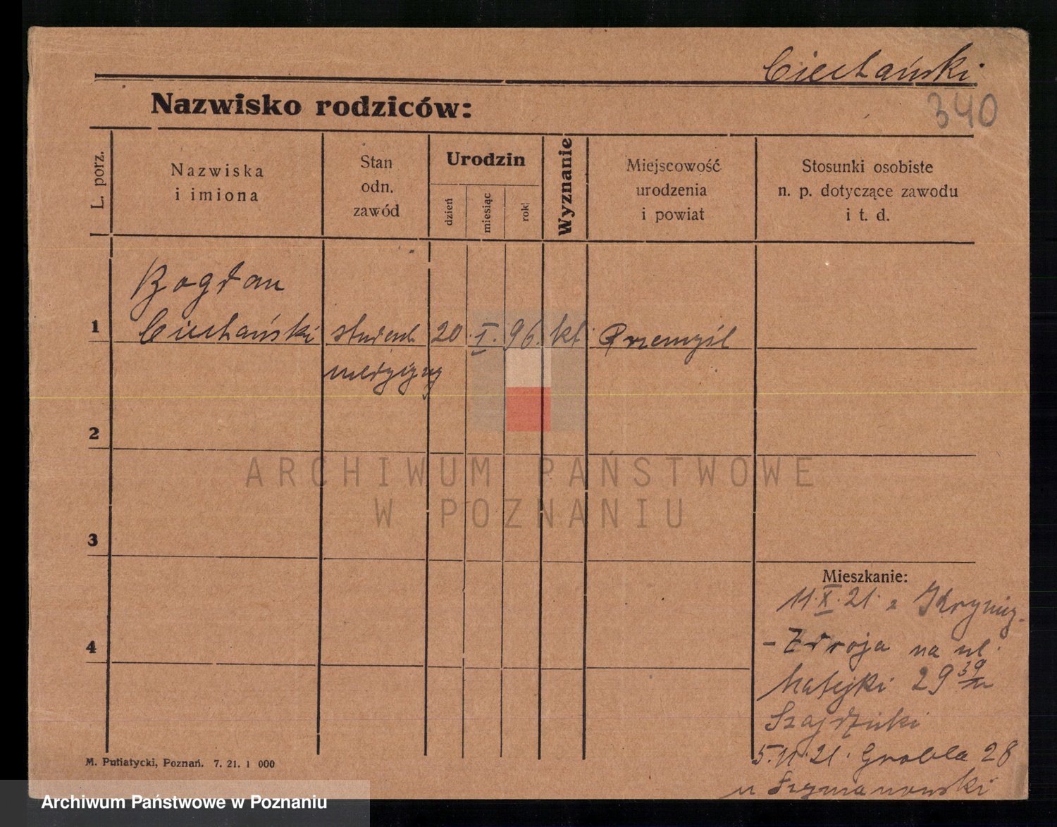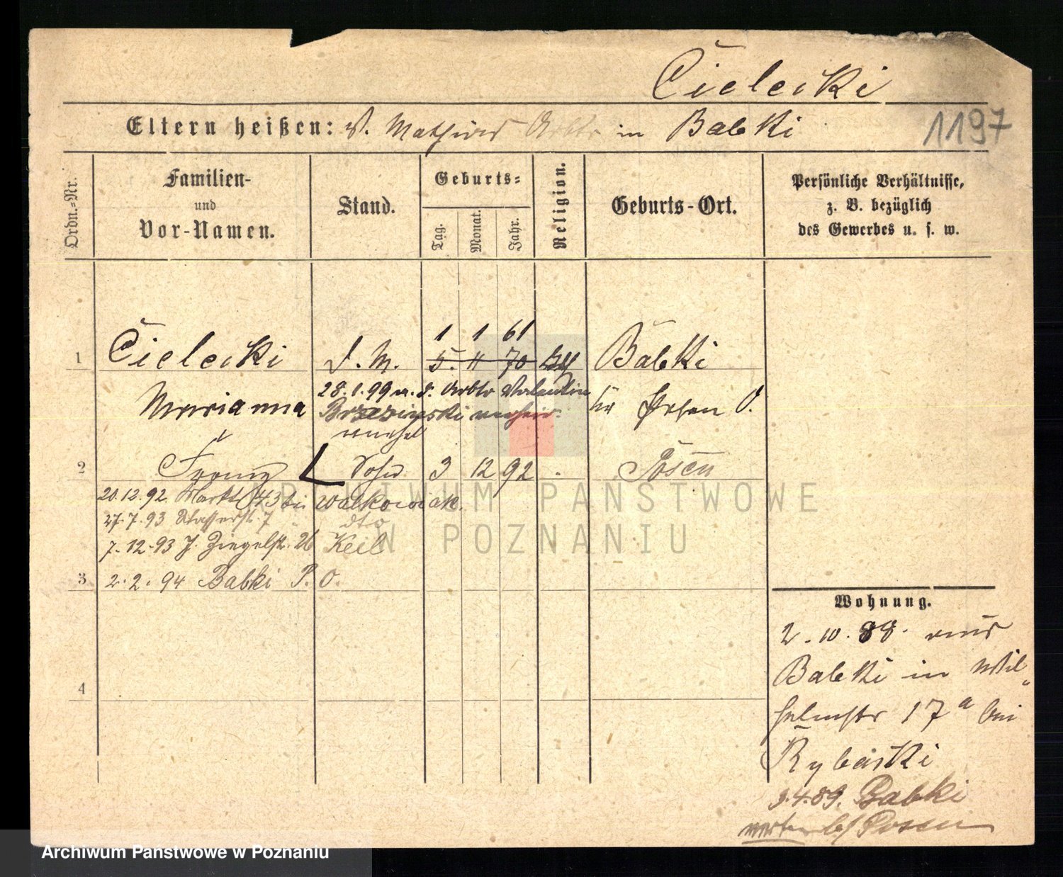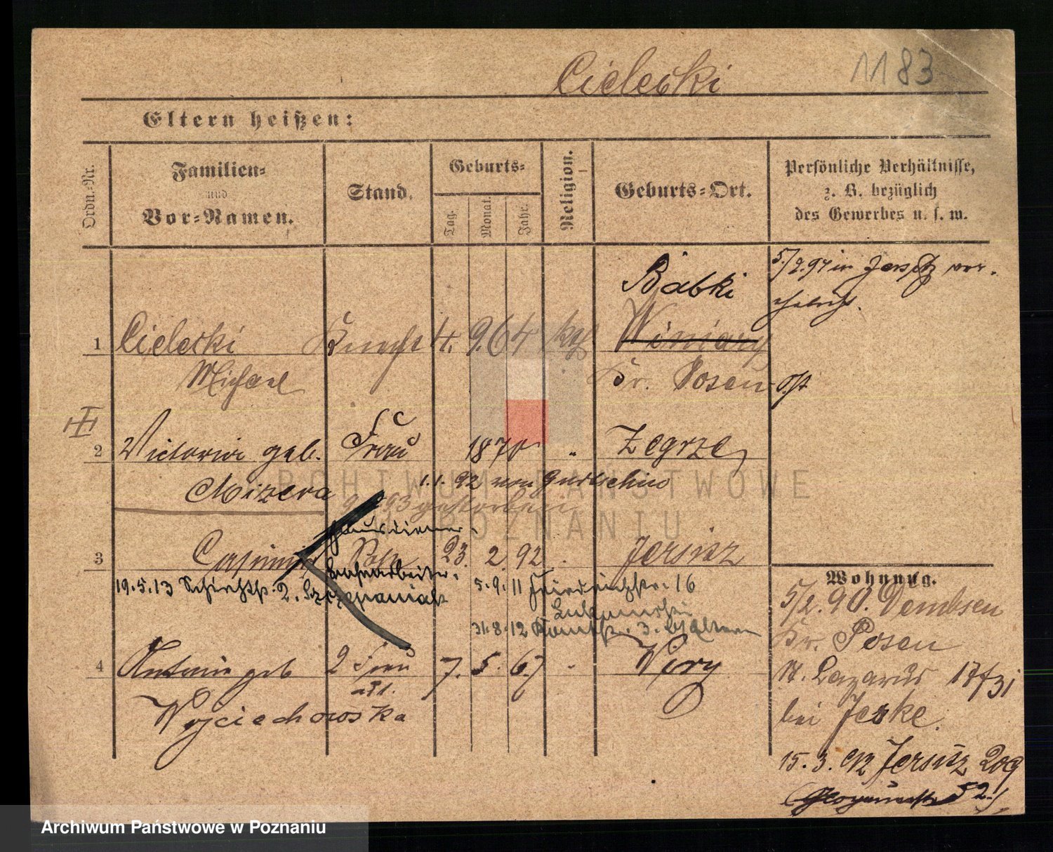 Podgląd karty osobowej dostępny jest po kliknięciu na nazwisko lub ikonkę karty. Można dokonywać powiększenia (ikony na górze) lub przechodzić między kolejnymi skanami (strzałki po bokach).