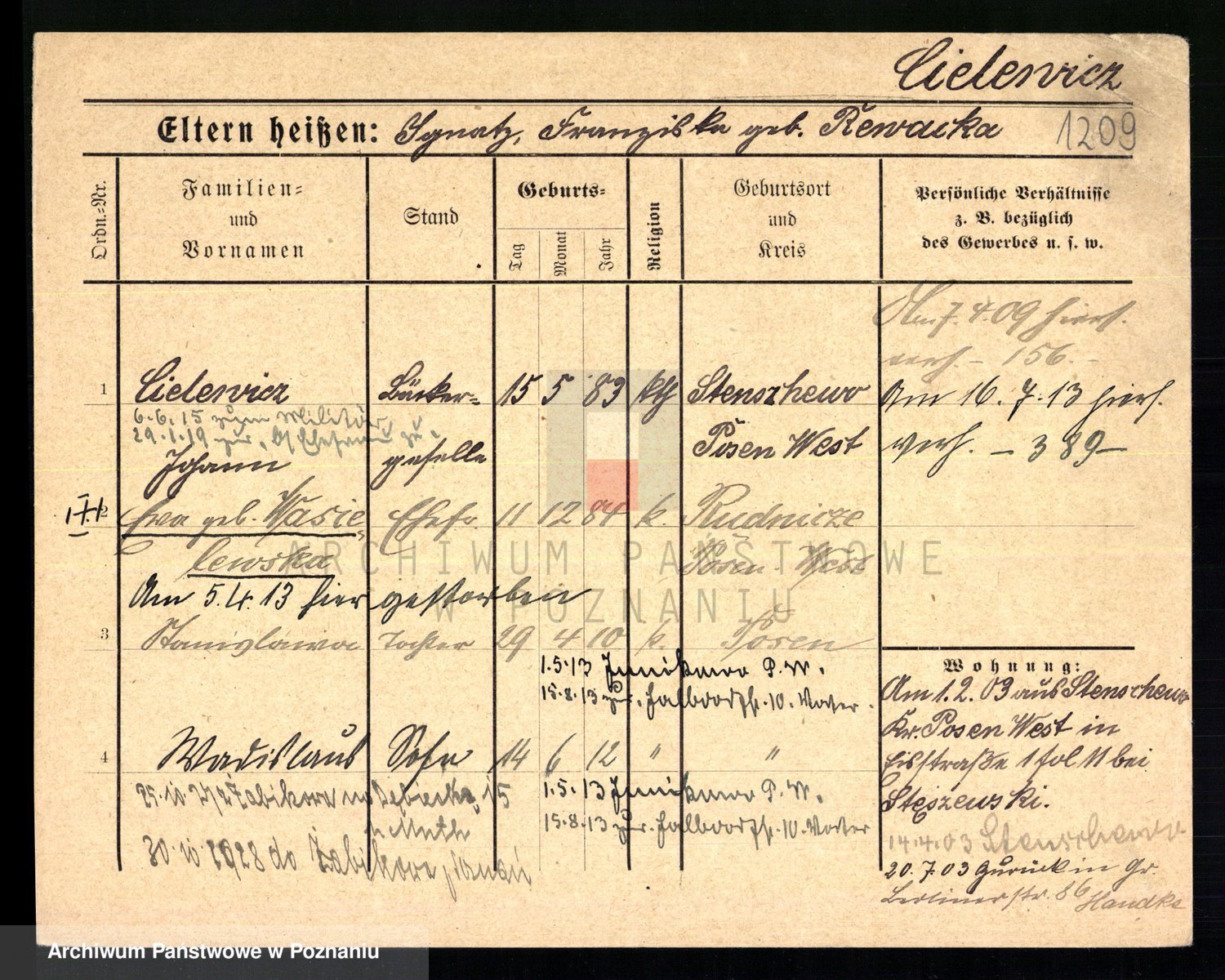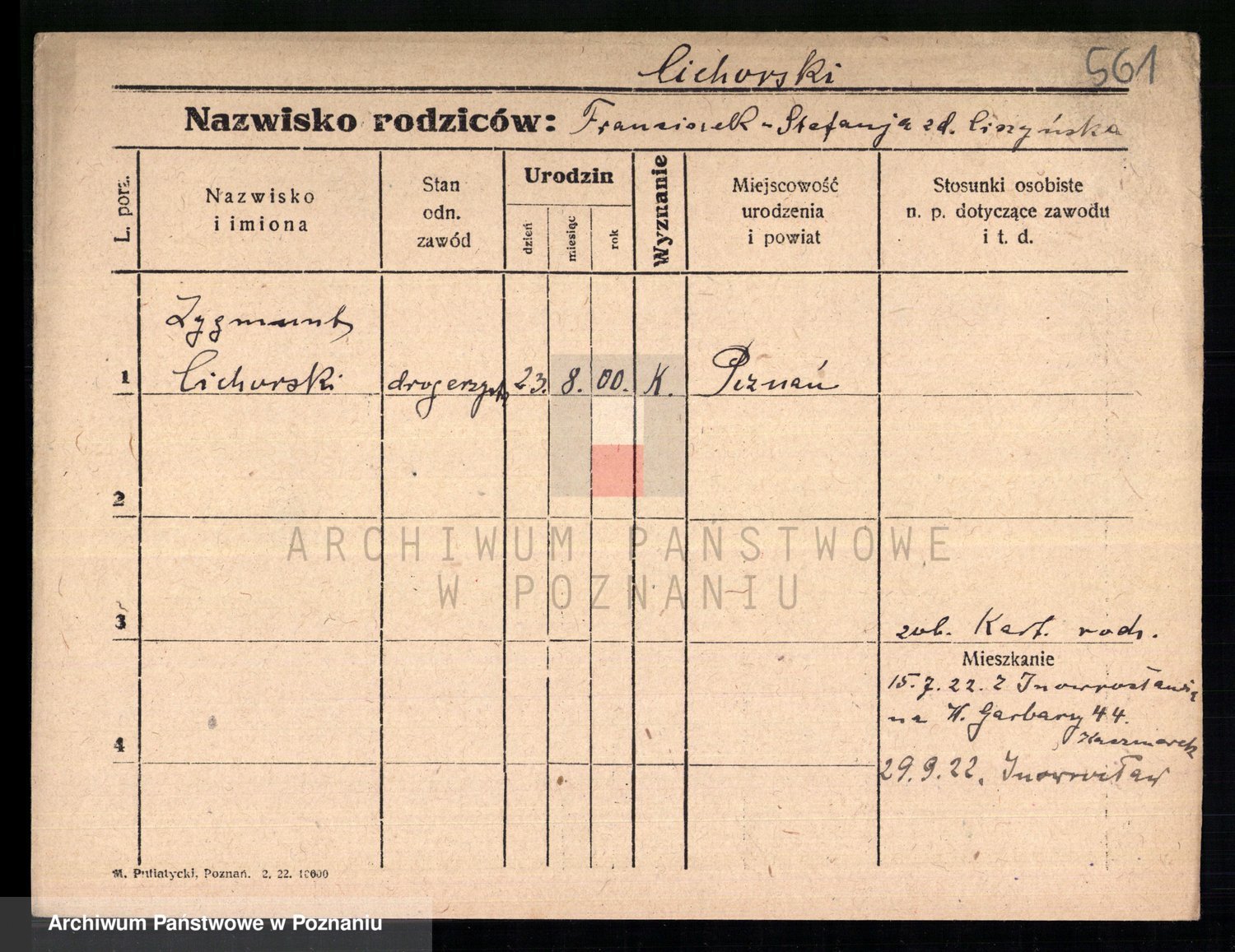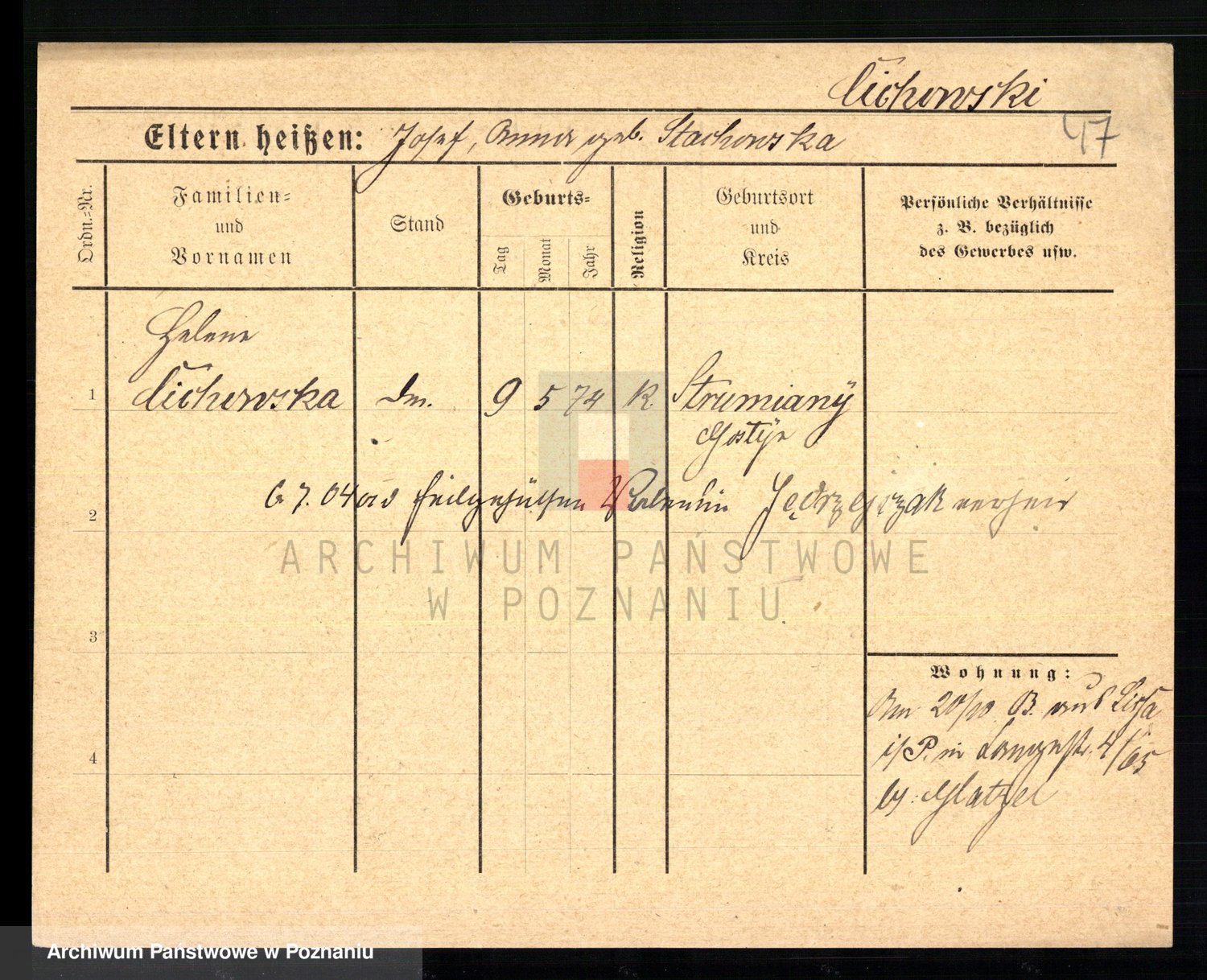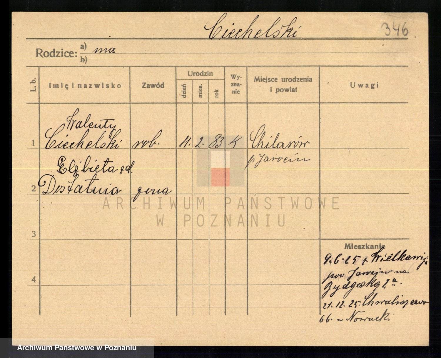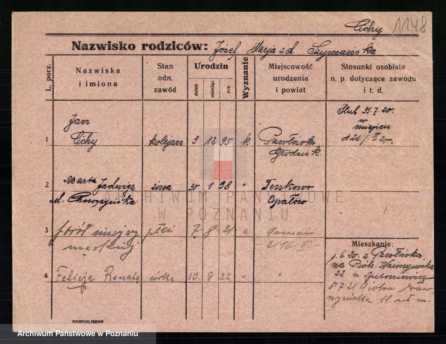 Podgląd karty osobowej dostępny jest po kliknięciu na nazwisko lub ikonkę karty. Można dokonywać powiększenia (ikony na górze) lub przechodzić między kolejnymi skanami (strzałki po bokach).
