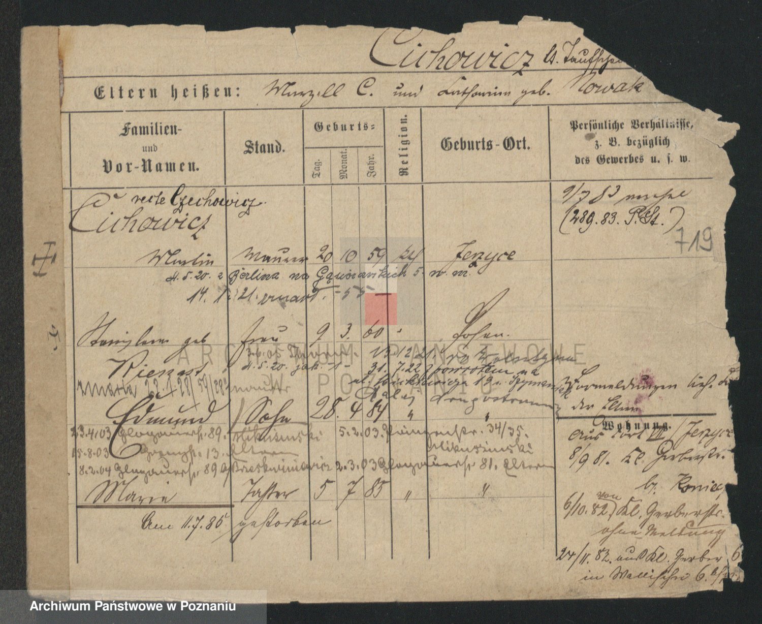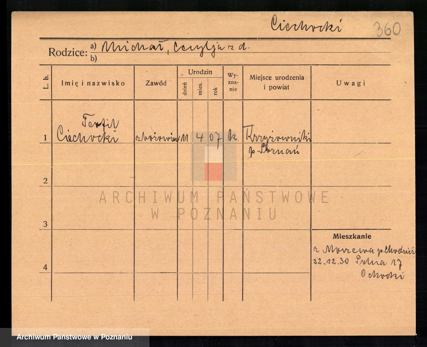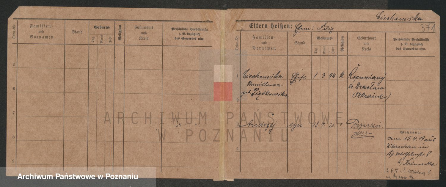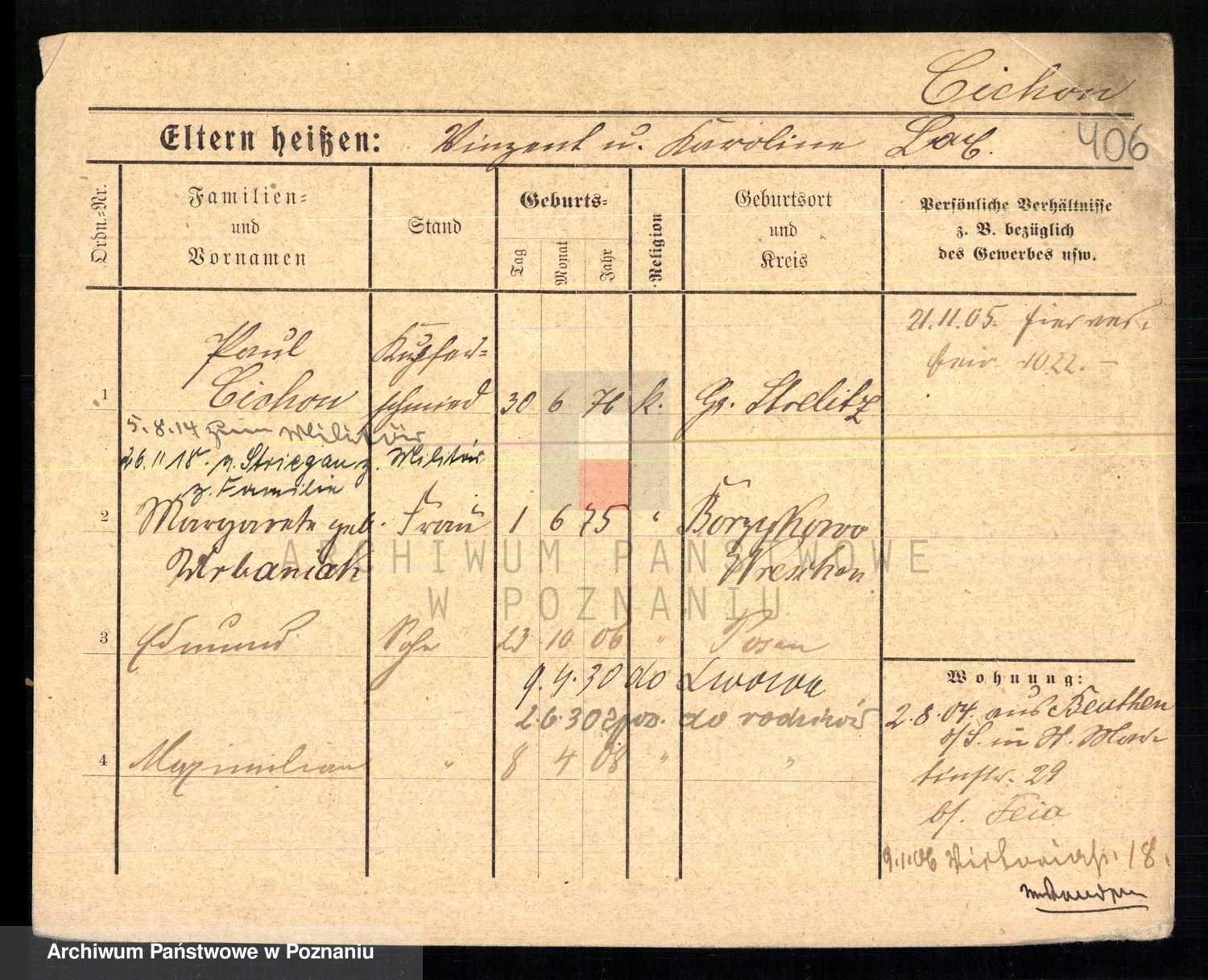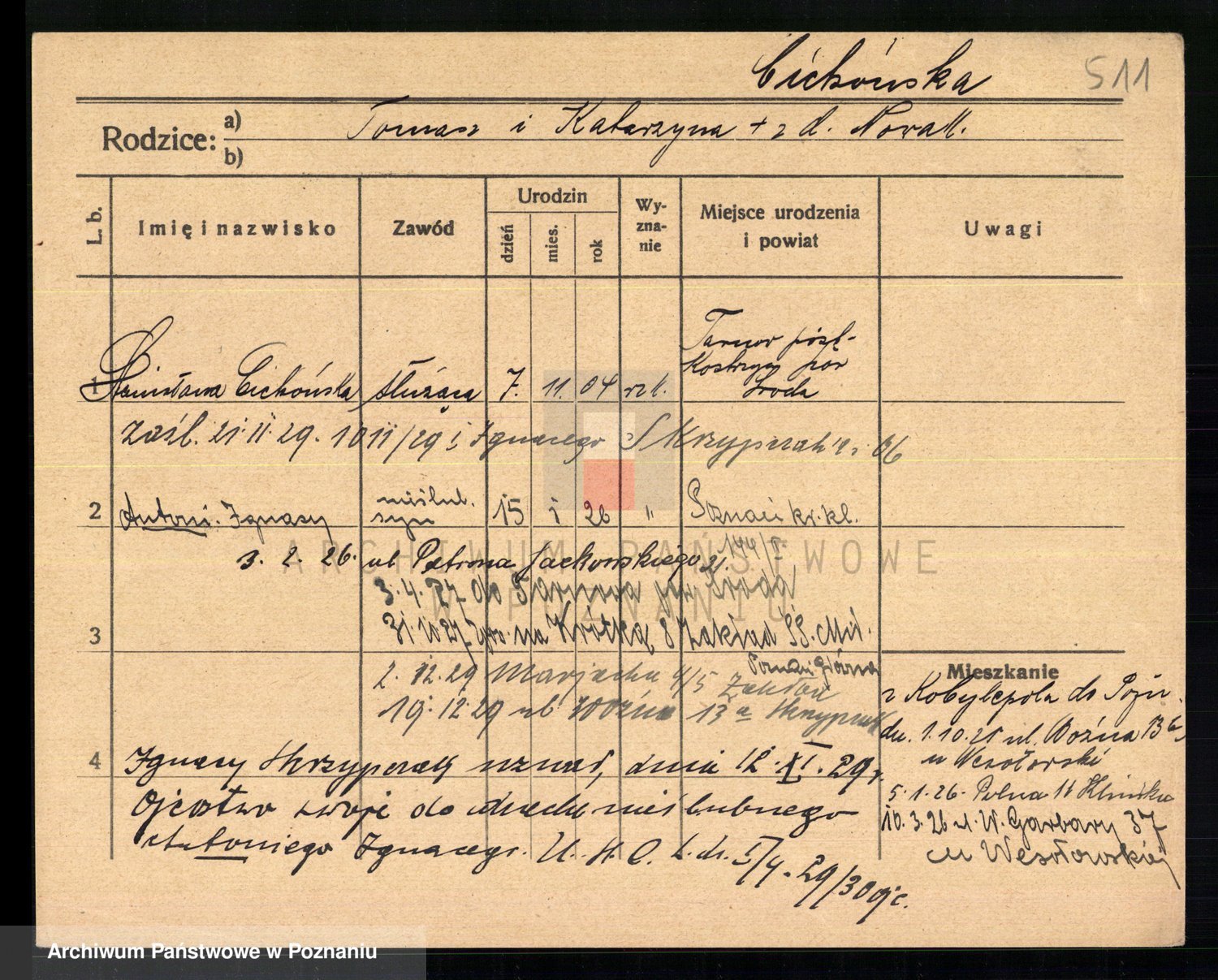 Podgląd karty osobowej dostępny jest po kliknięciu na nazwisko lub ikonkę karty. Można dokonywać powiększenia (ikony na górze) lub przechodzić między kolejnymi skanami (strzałki po bokach).