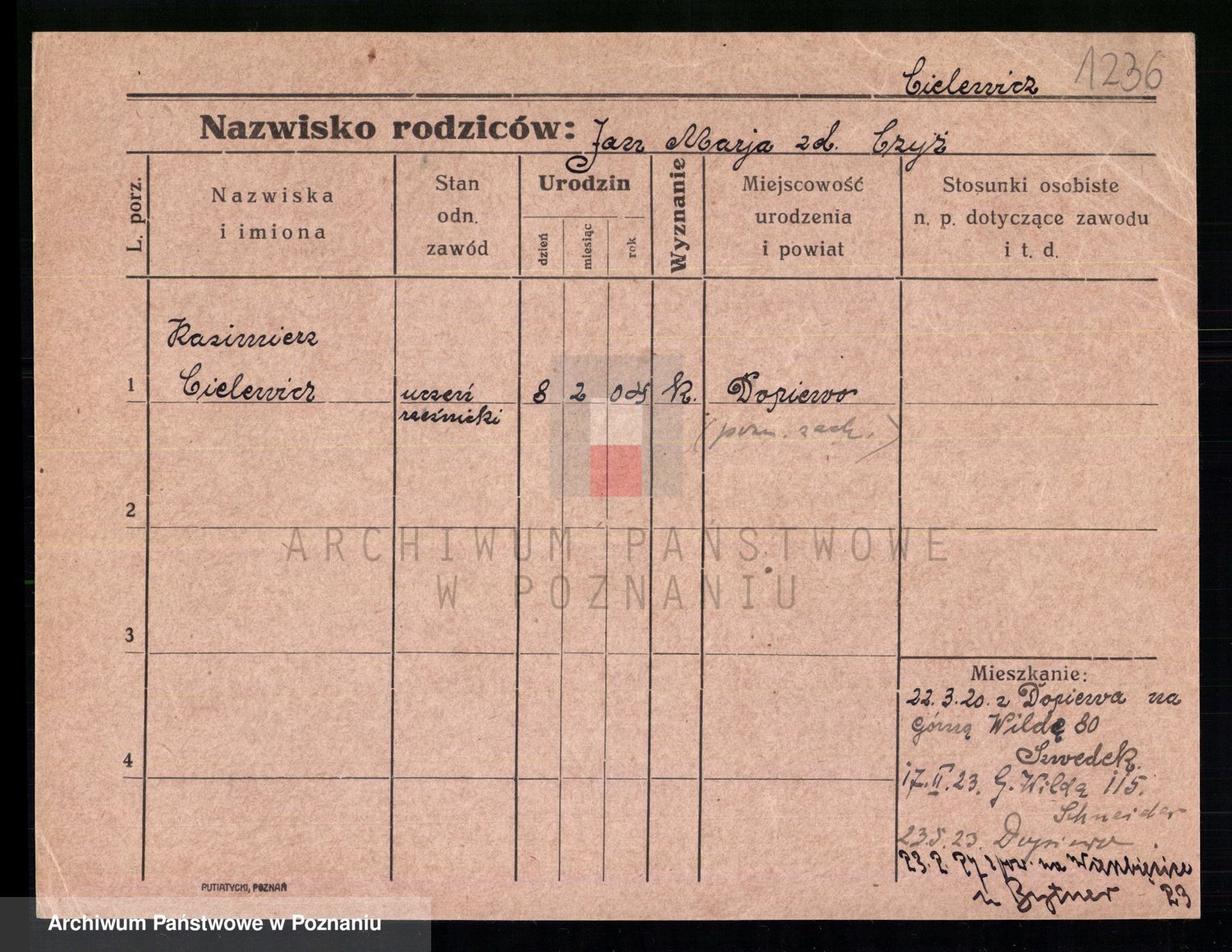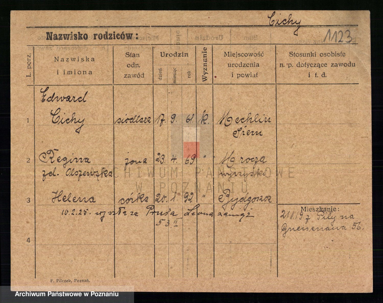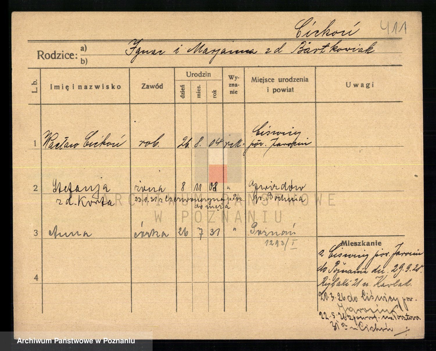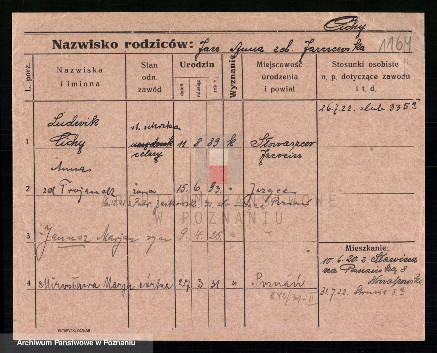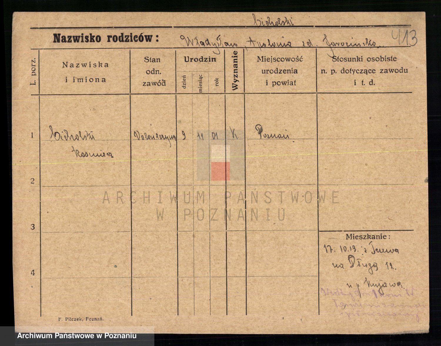 Podgląd karty osobowej dostępny jest po kliknięciu na nazwisko lub ikonkę karty. Można dokonywać powiększenia (ikony na górze) lub przechodzić między kolejnymi skanami (strzałki po bokach).
