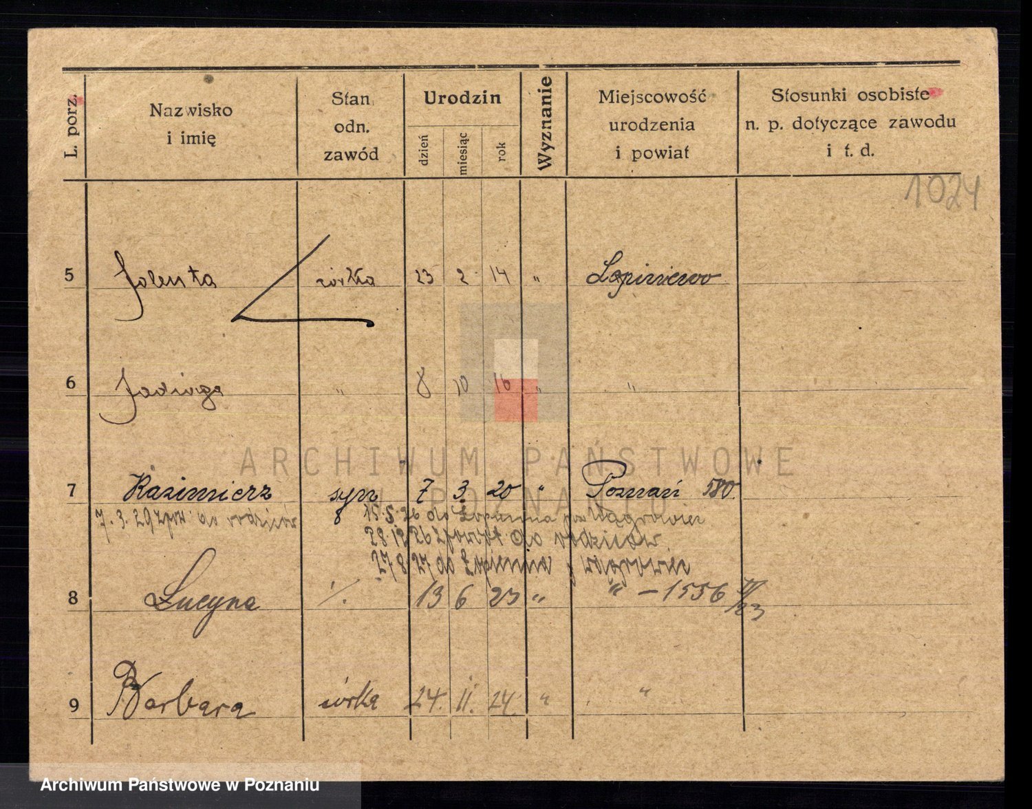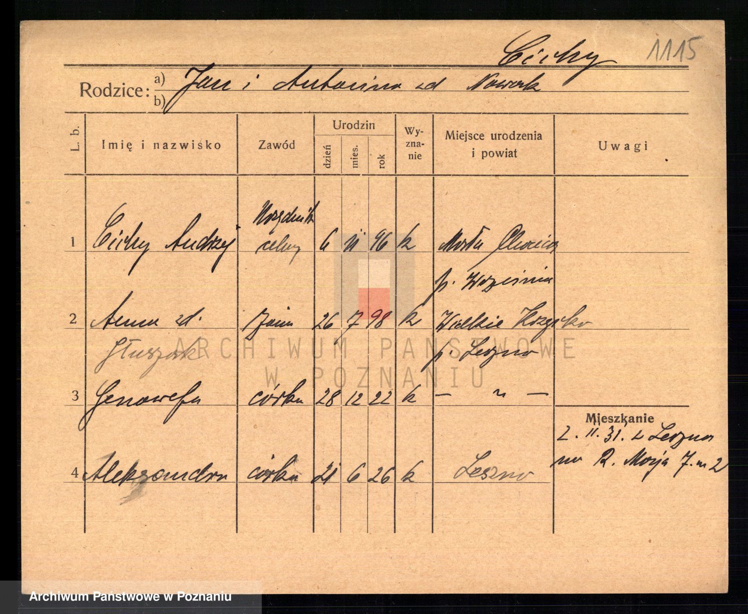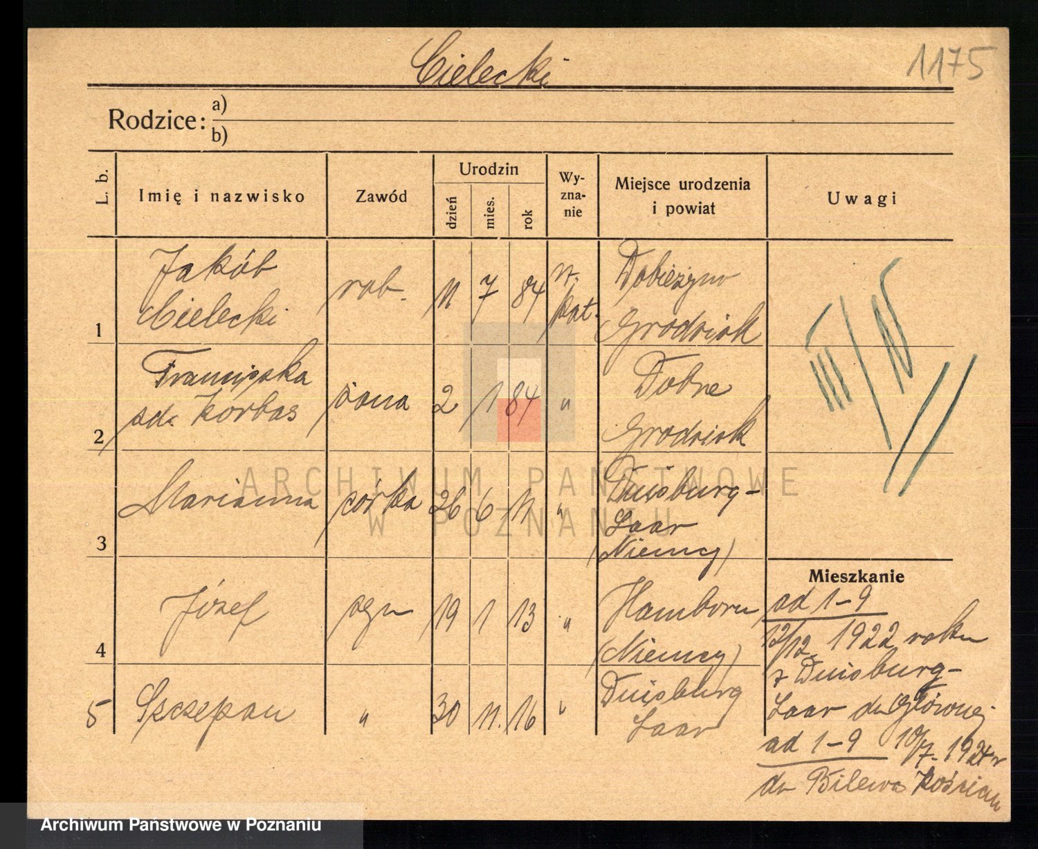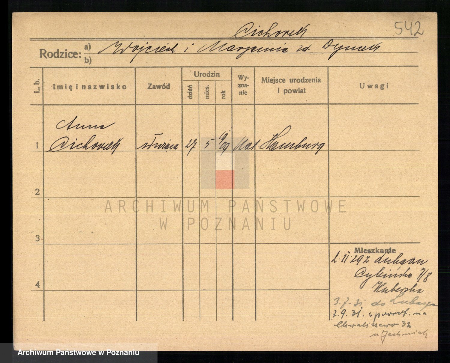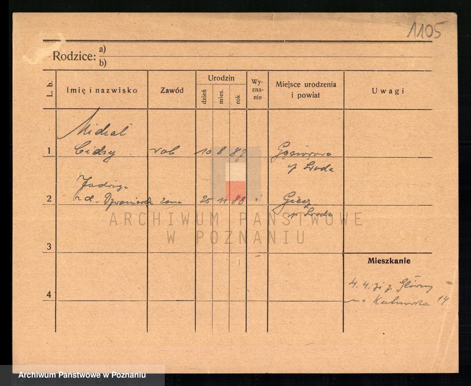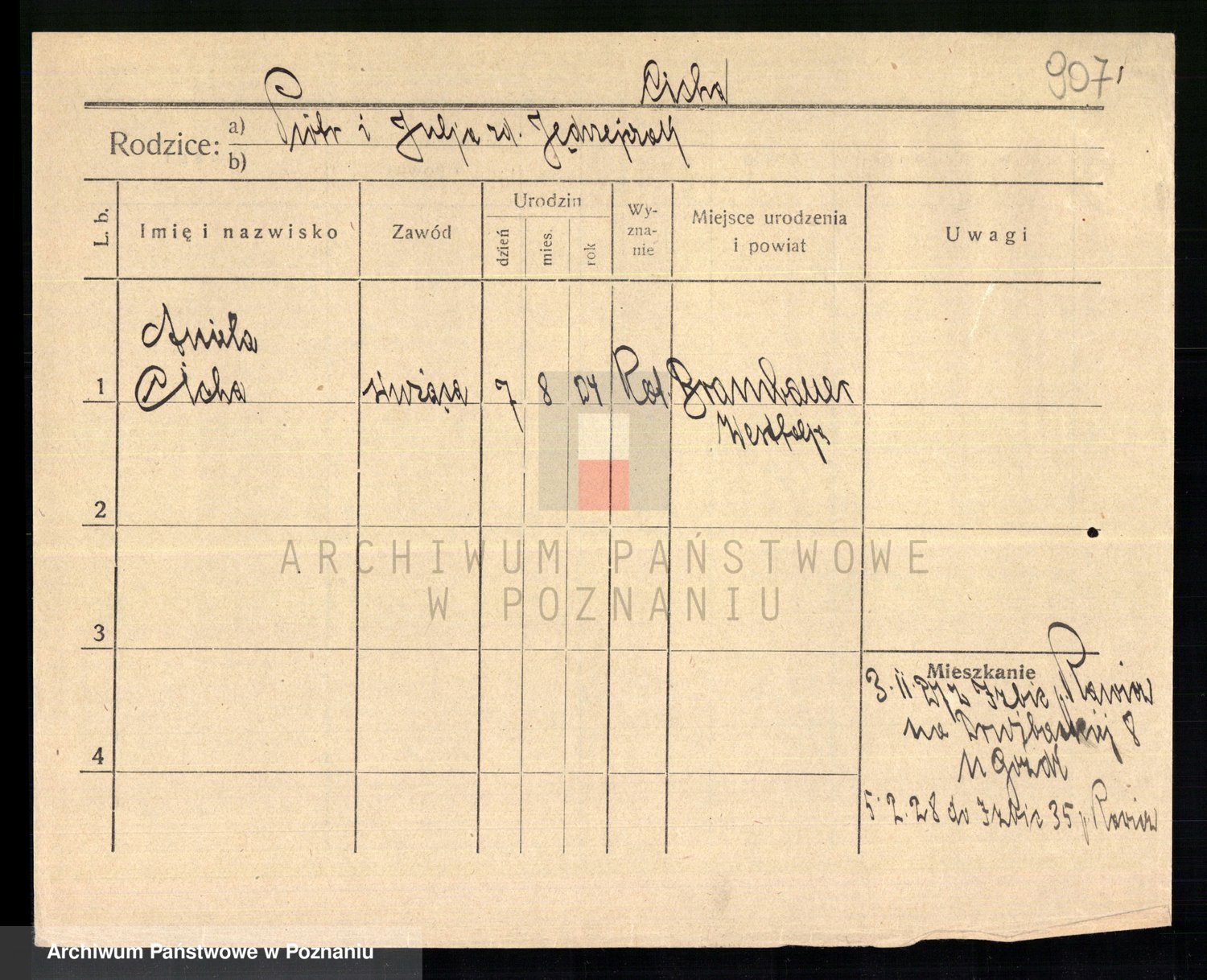 Podgląd karty osobowej dostępny jest po kliknięciu na nazwisko lub ikonkę karty. Można dokonywać powiększenia (ikony na górze) lub przechodzić między kolejnymi skanami (strzałki po bokach).