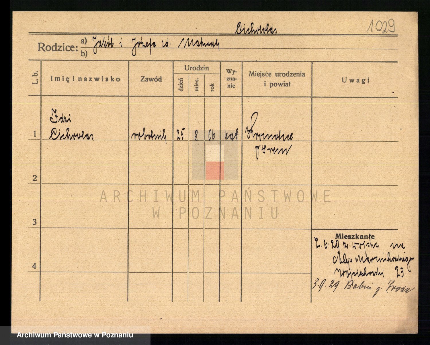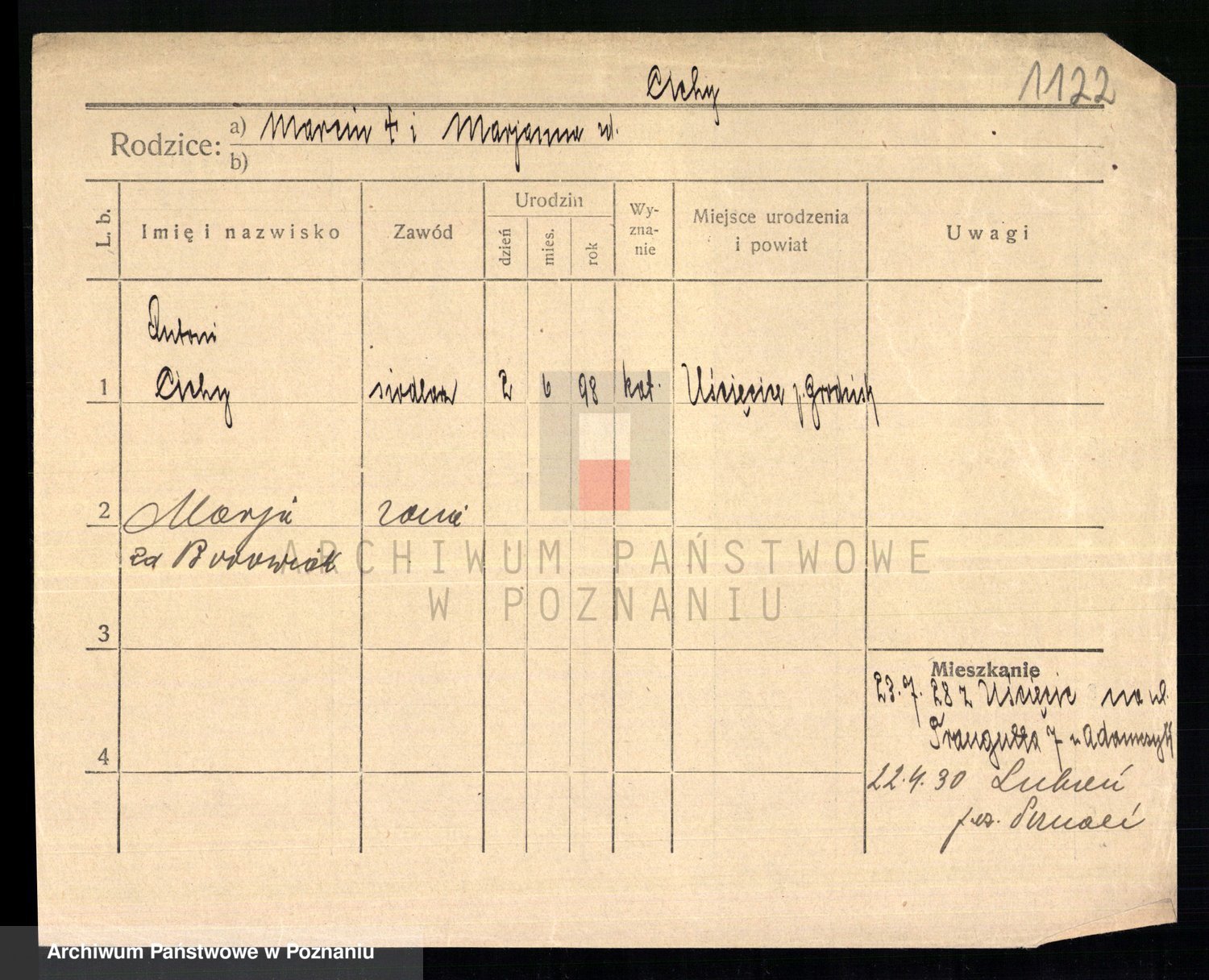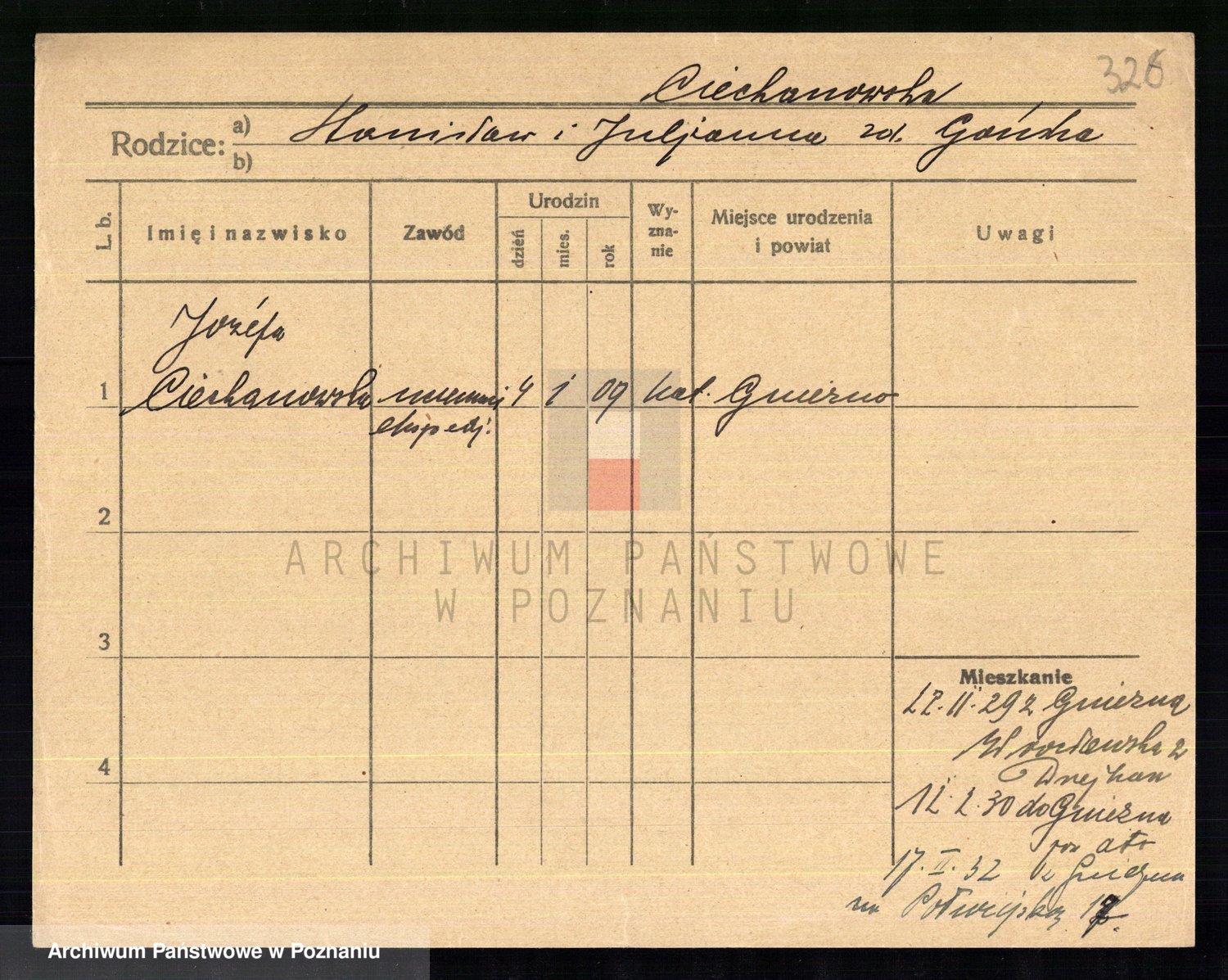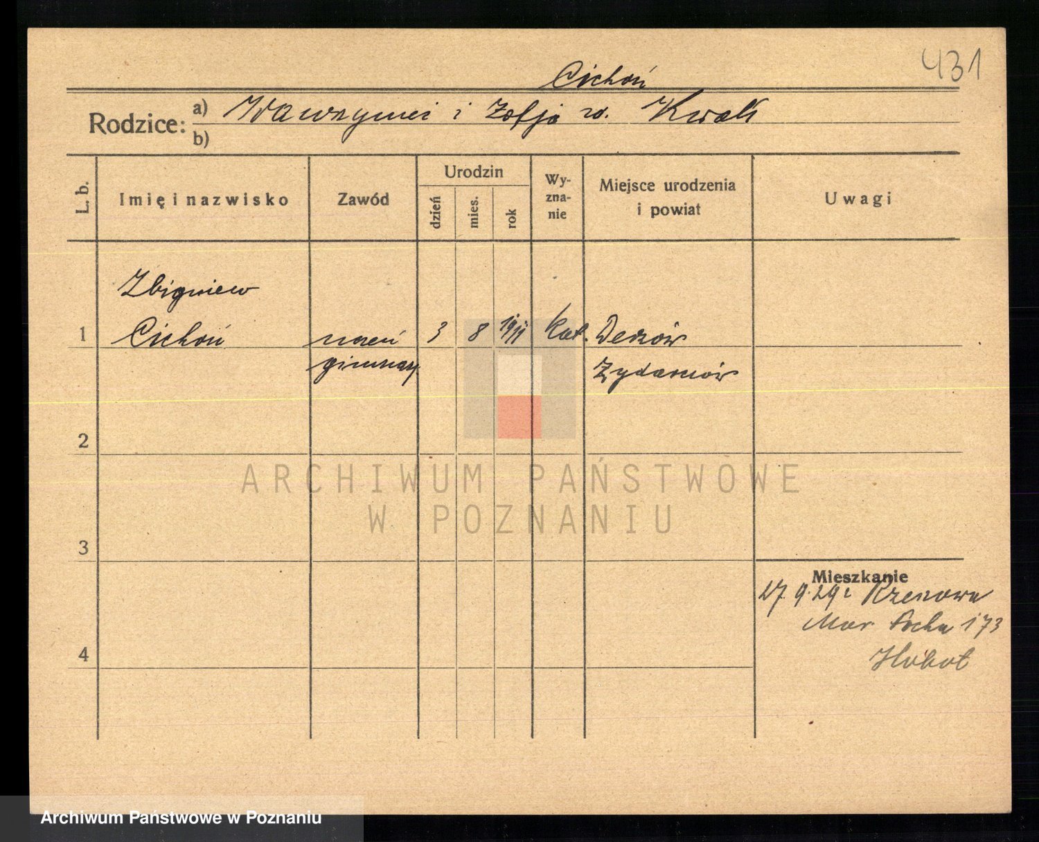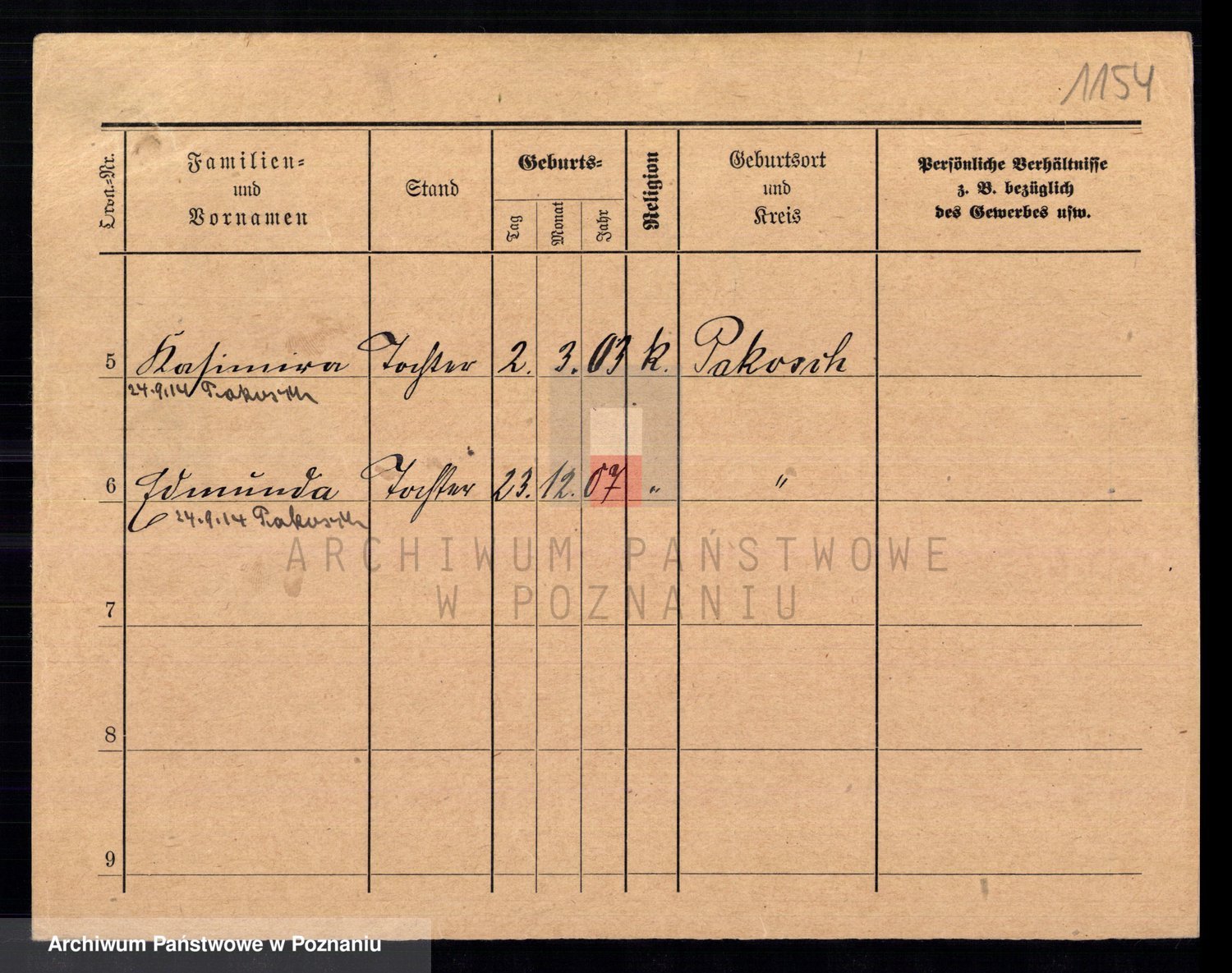Podgląd karty osobowej dostępny jest po kliknięciu na nazwisko lub ikonkę karty. Można dokonywać powiększenia (ikony na górze) lub przechodzić między kolejnymi skanami (strzałki po bokach).