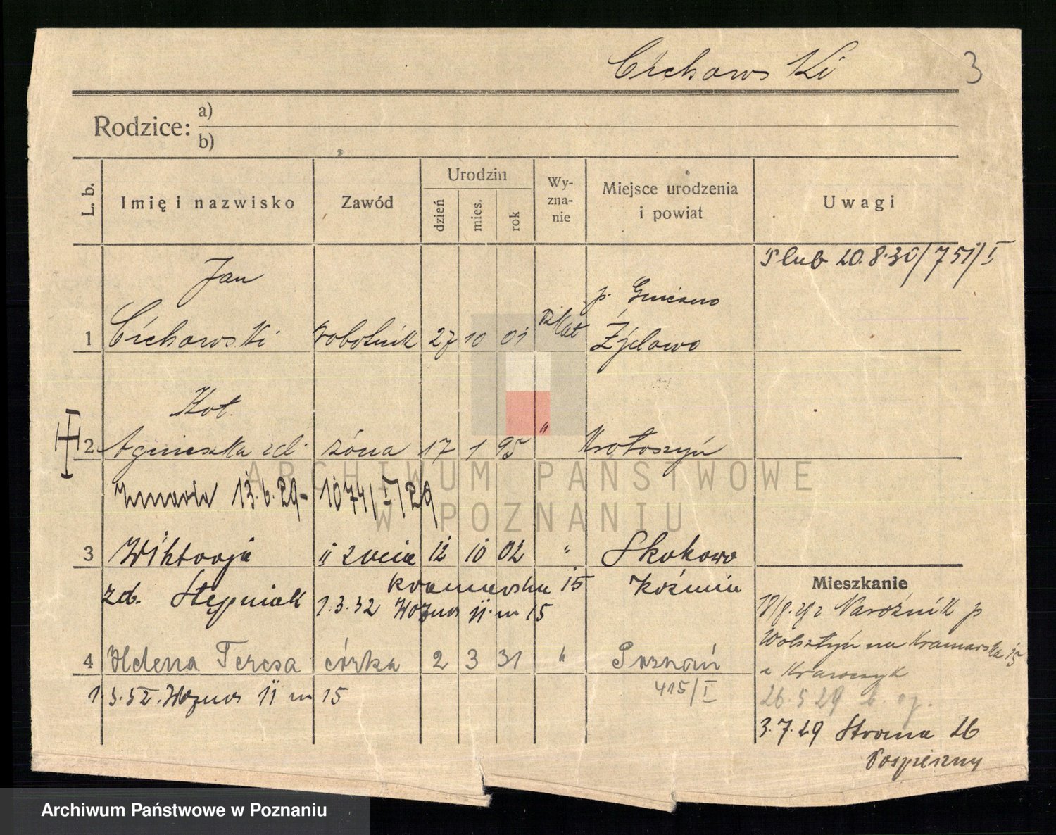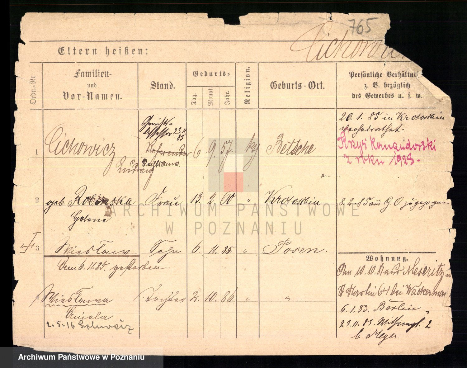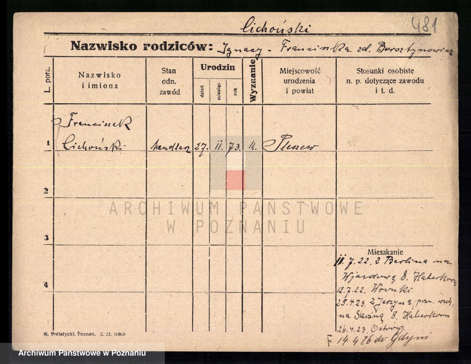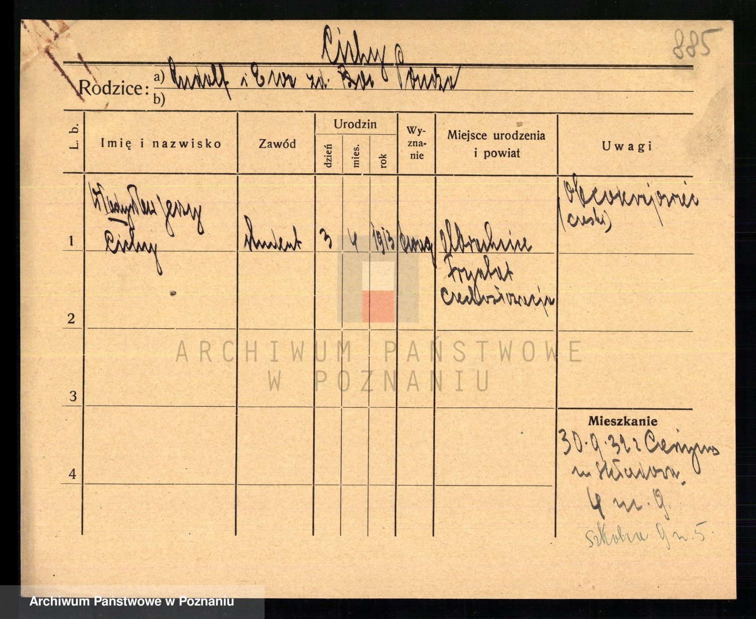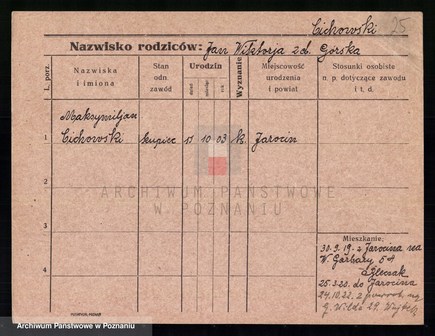Podgląd karty osobowej dostępny jest po kliknięciu na nazwisko lub ikonkę karty. Można dokonywać powiększenia (ikony na górze) lub przechodzić między kolejnymi skanami (strzałki po bokach).