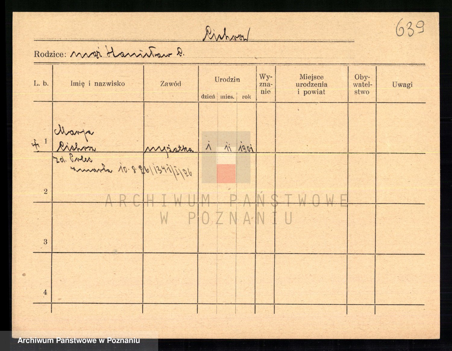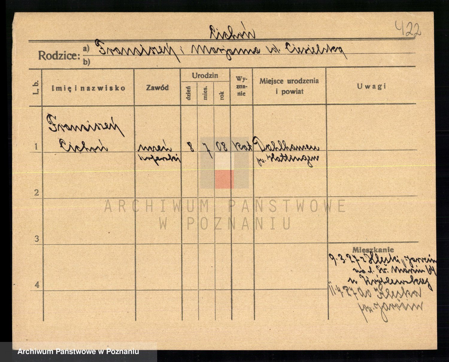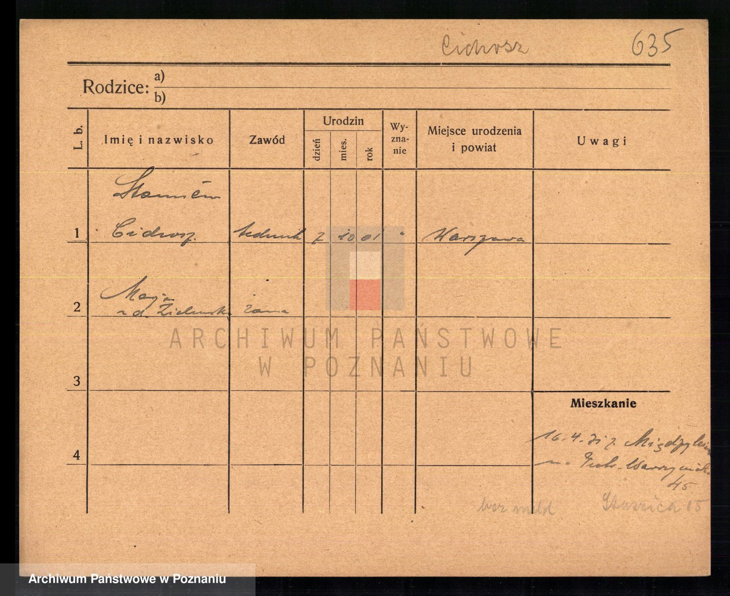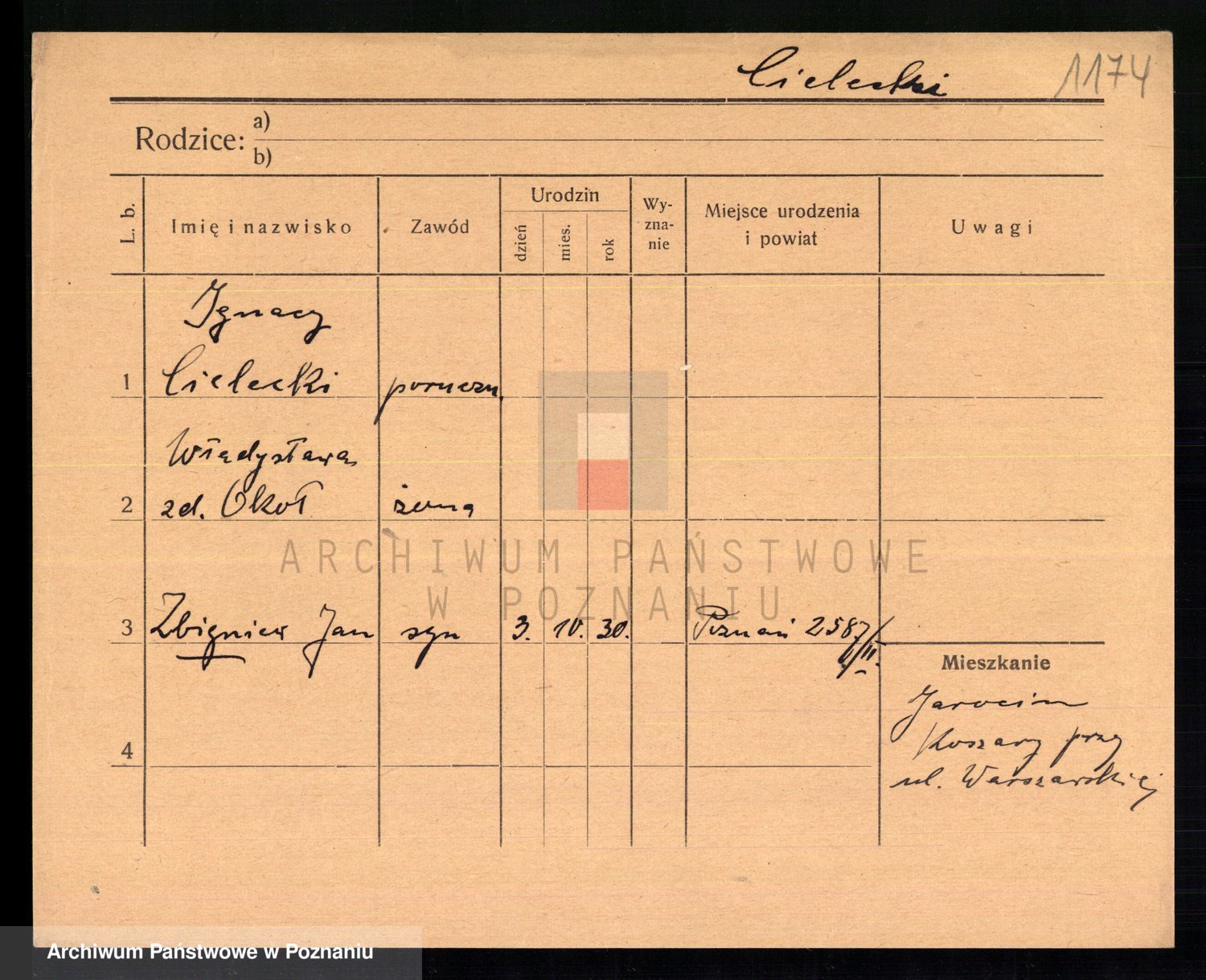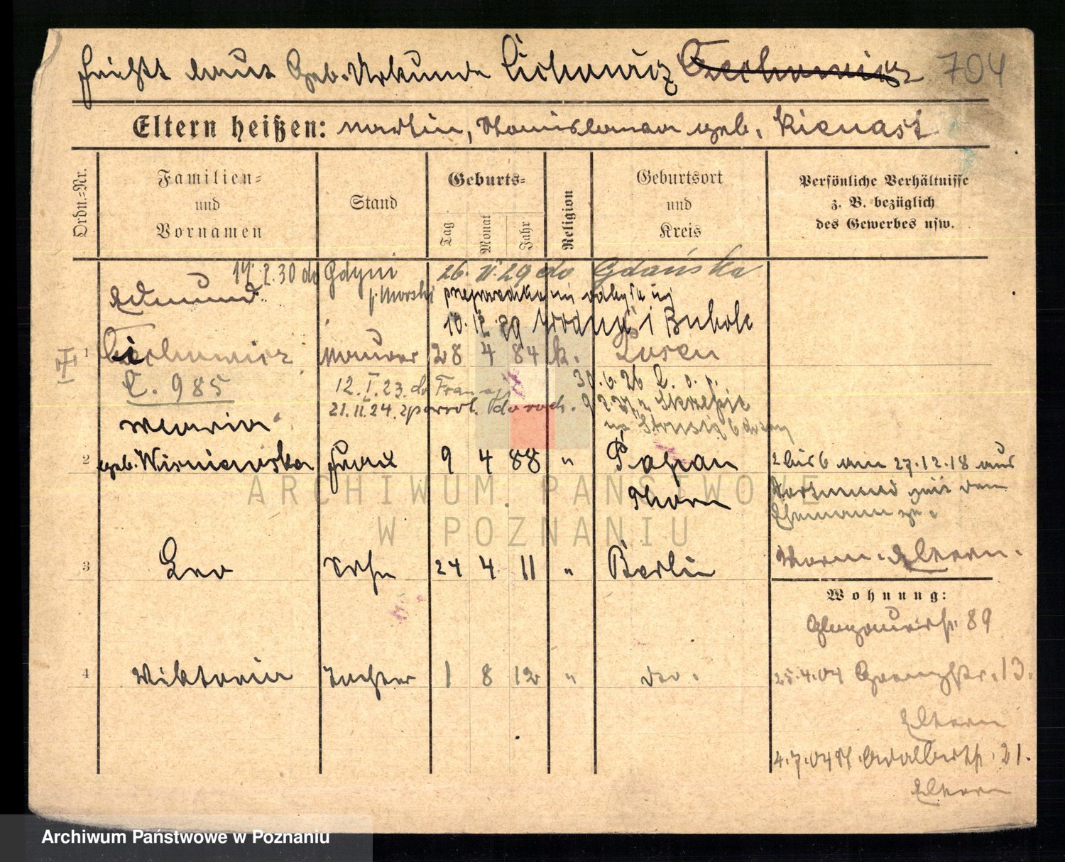 Podgląd karty osobowej dostępny jest po kliknięciu na nazwisko lub ikonkę karty. Można dokonywać powiększenia (ikony na górze) lub przechodzić między kolejnymi skanami (strzałki po bokach).