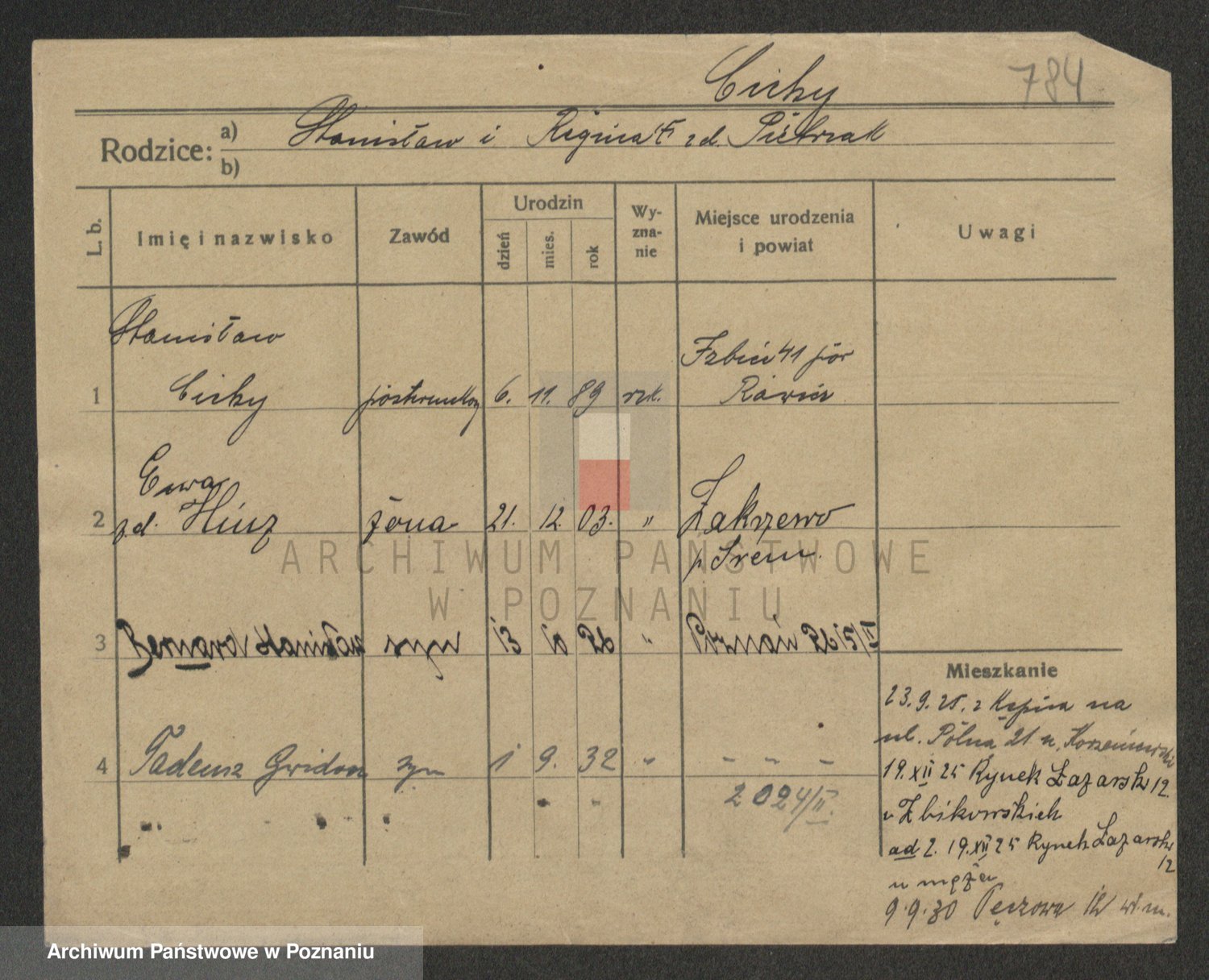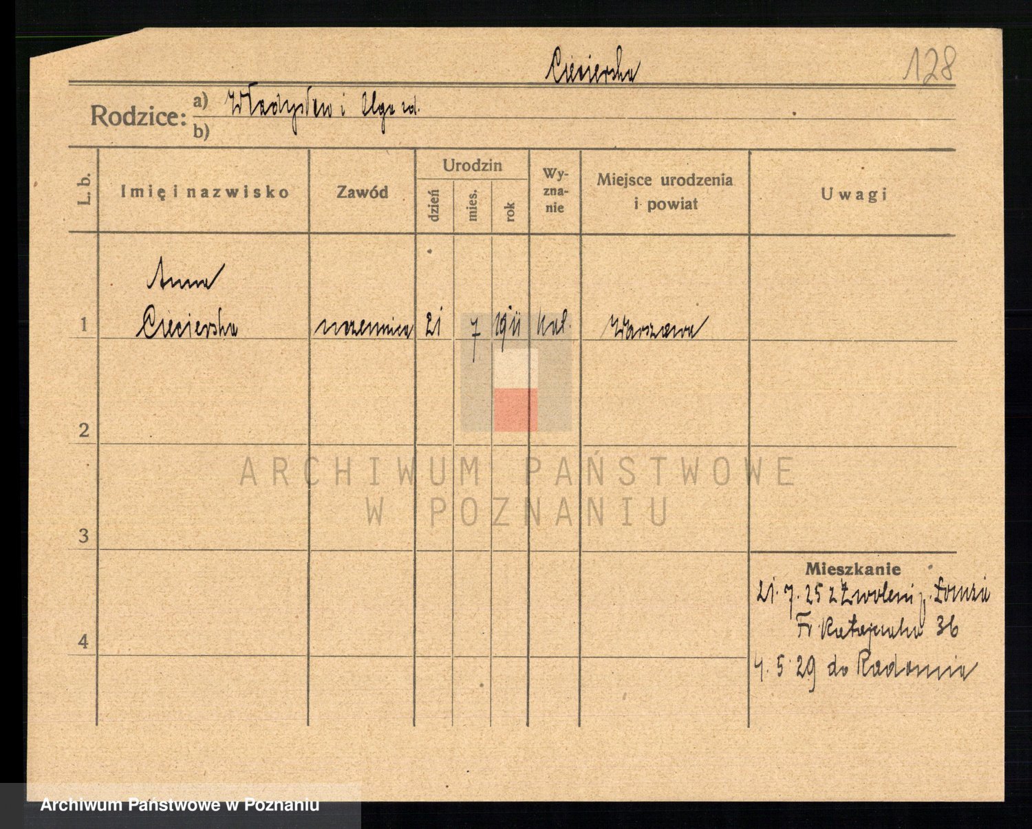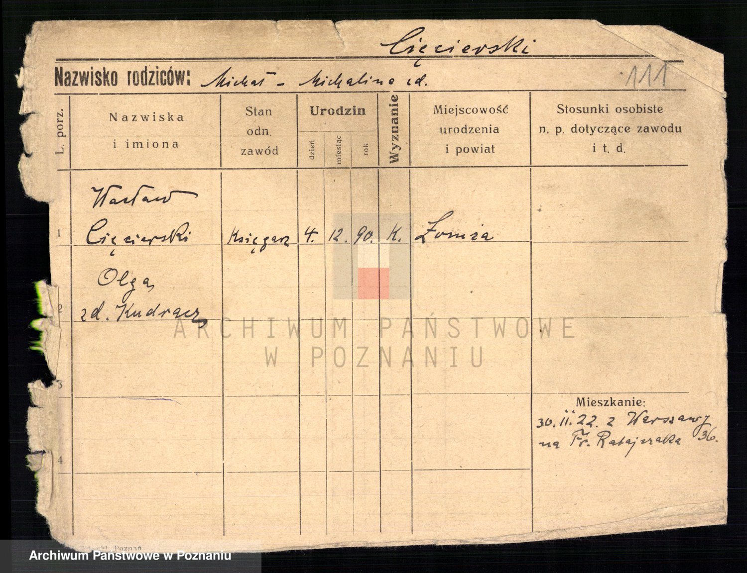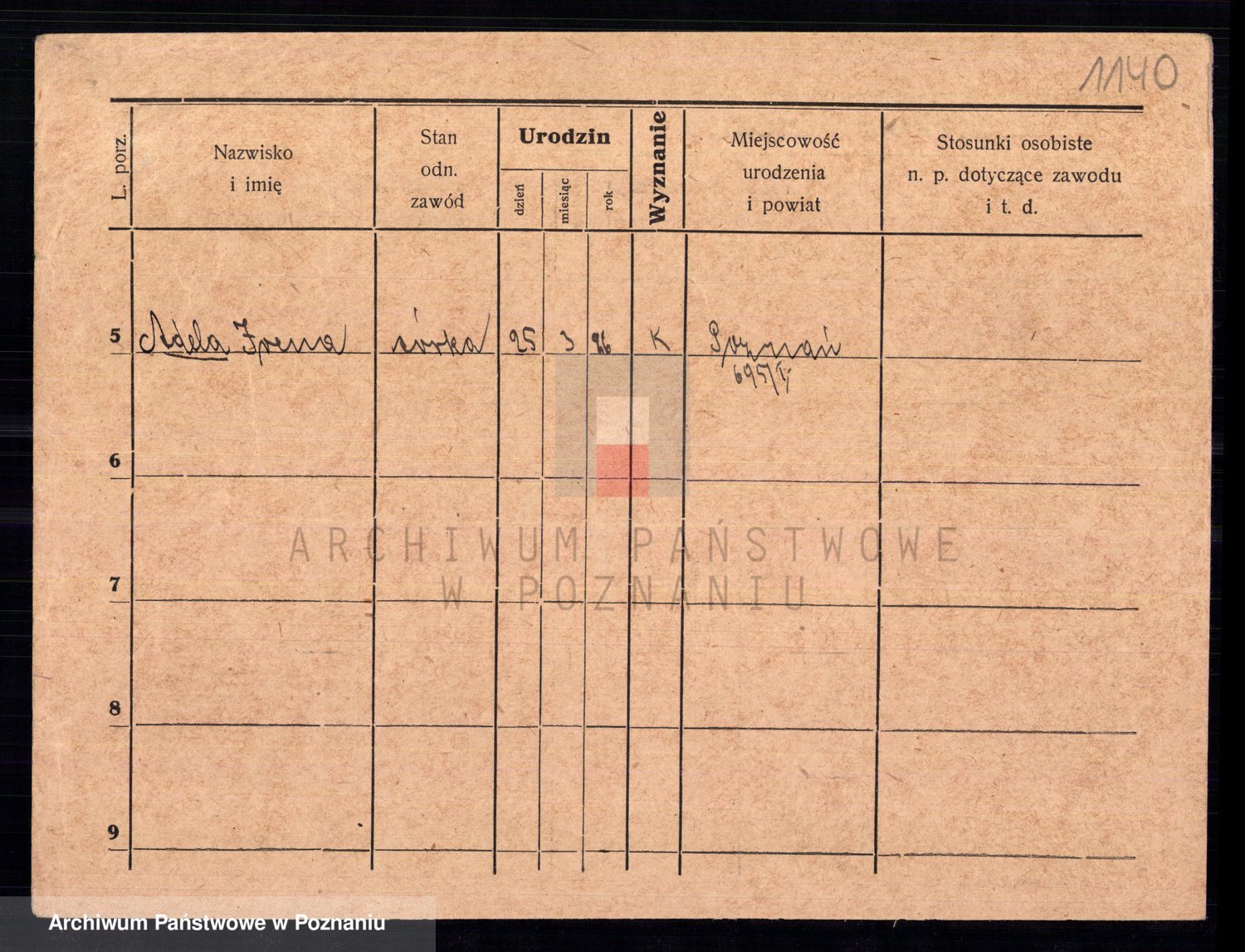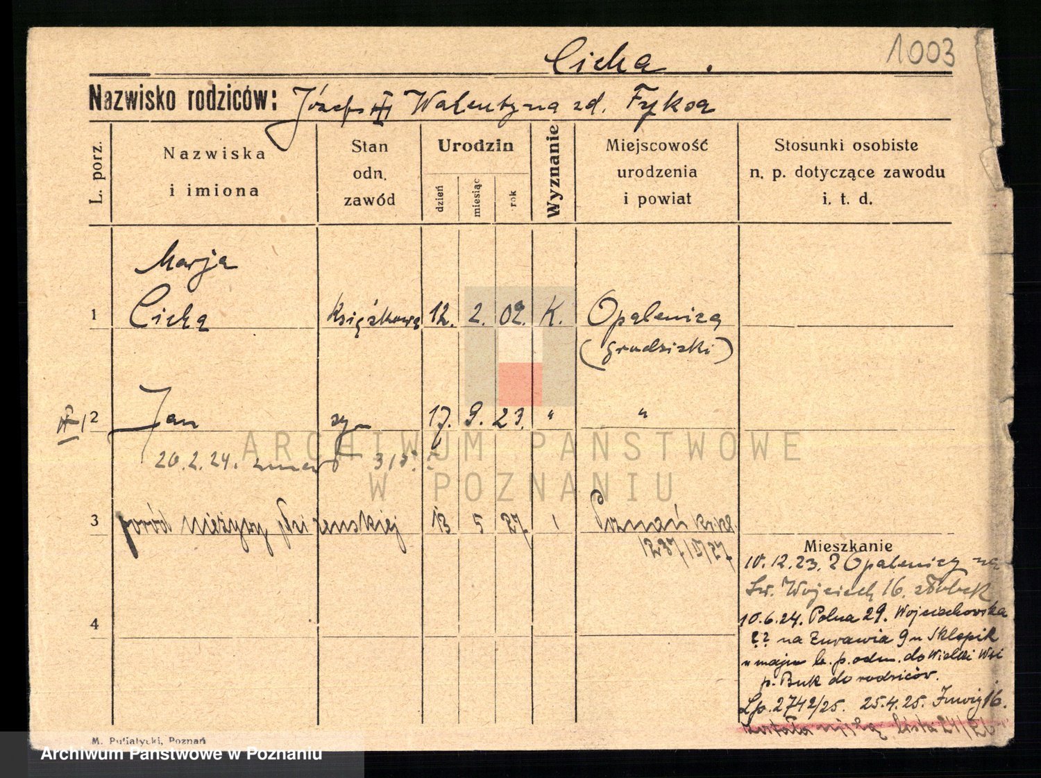 Podgląd karty osobowej dostępny jest po kliknięciu na nazwisko lub ikonkę karty. Można dokonywać powiększenia (ikony na górze) lub przechodzić między kolejnymi skanami (strzałki po bokach).
