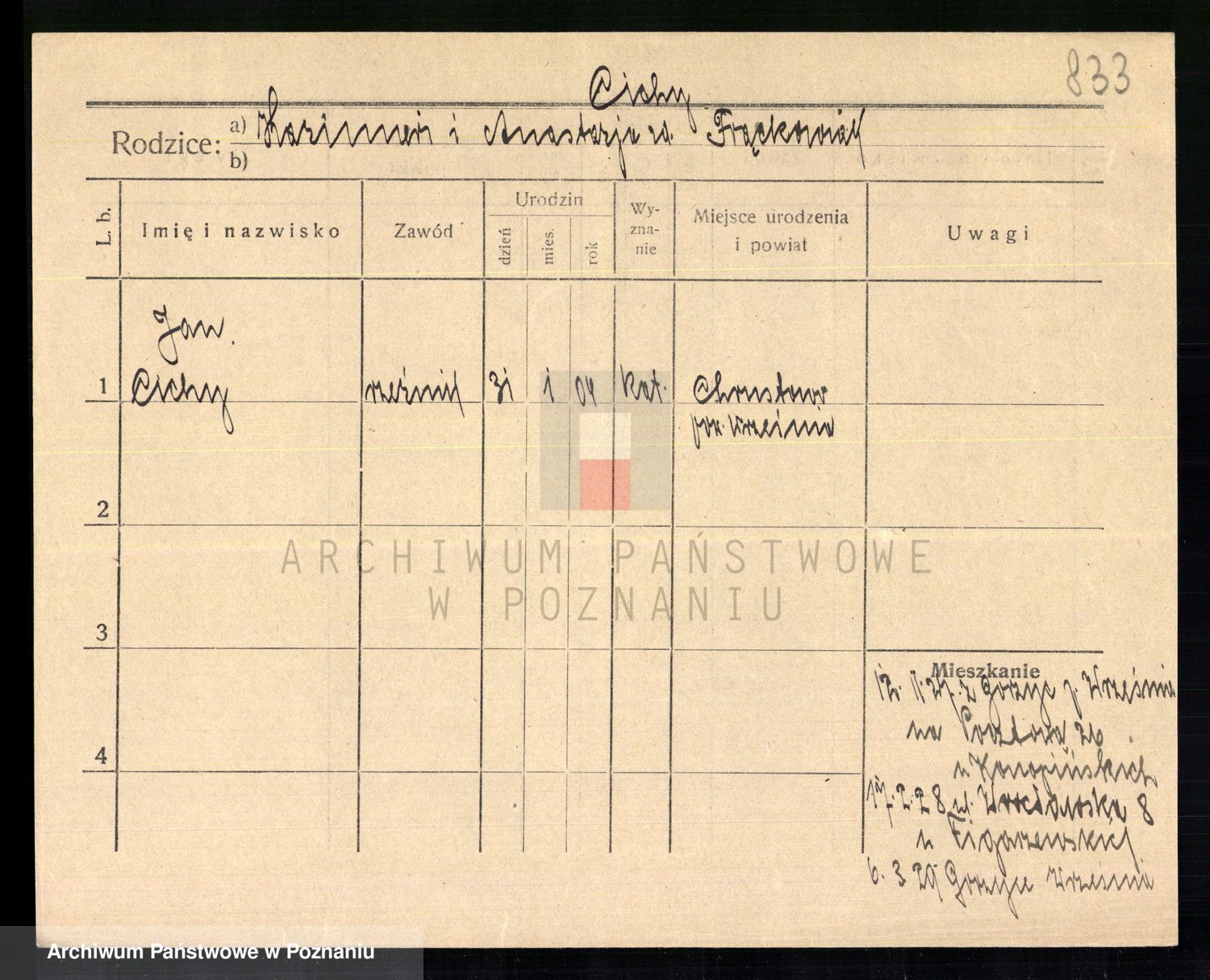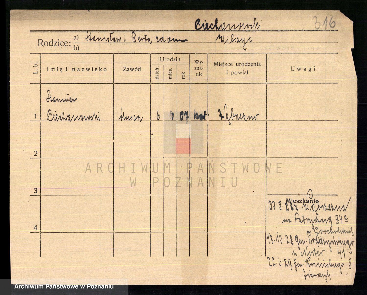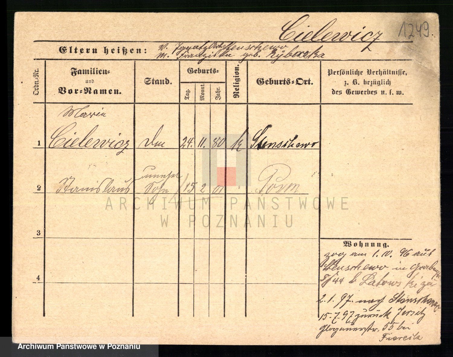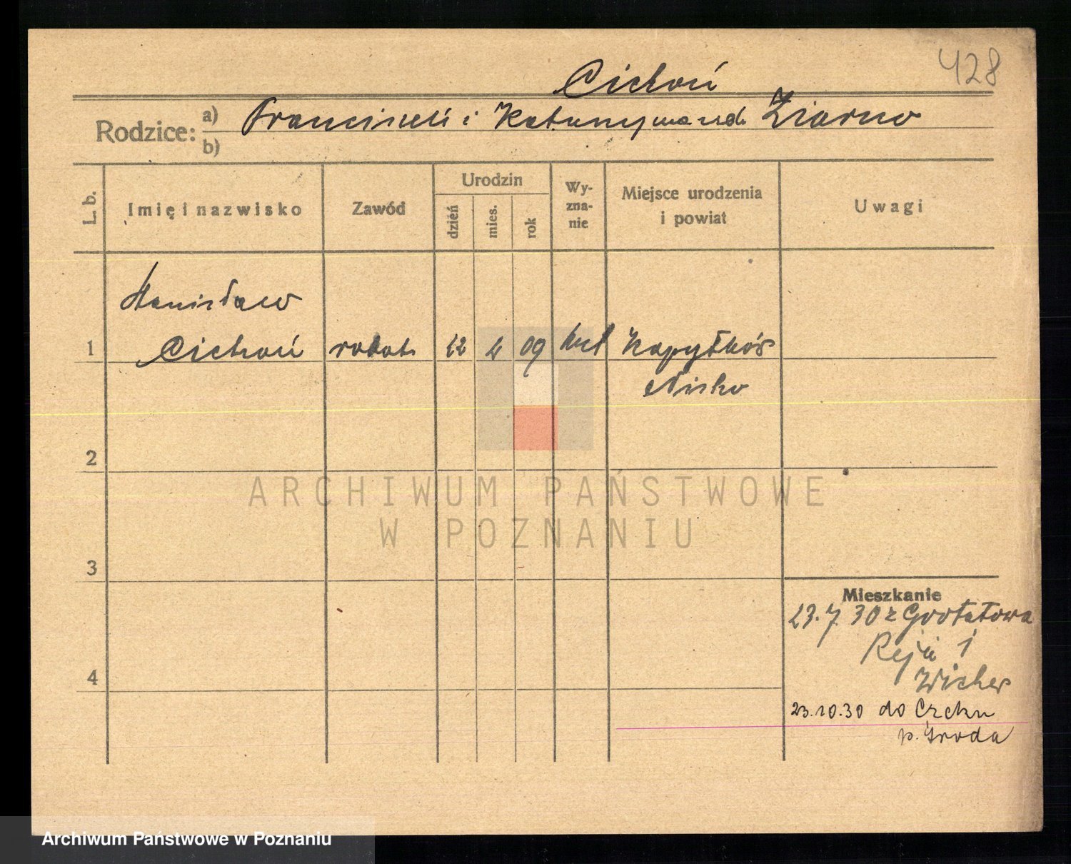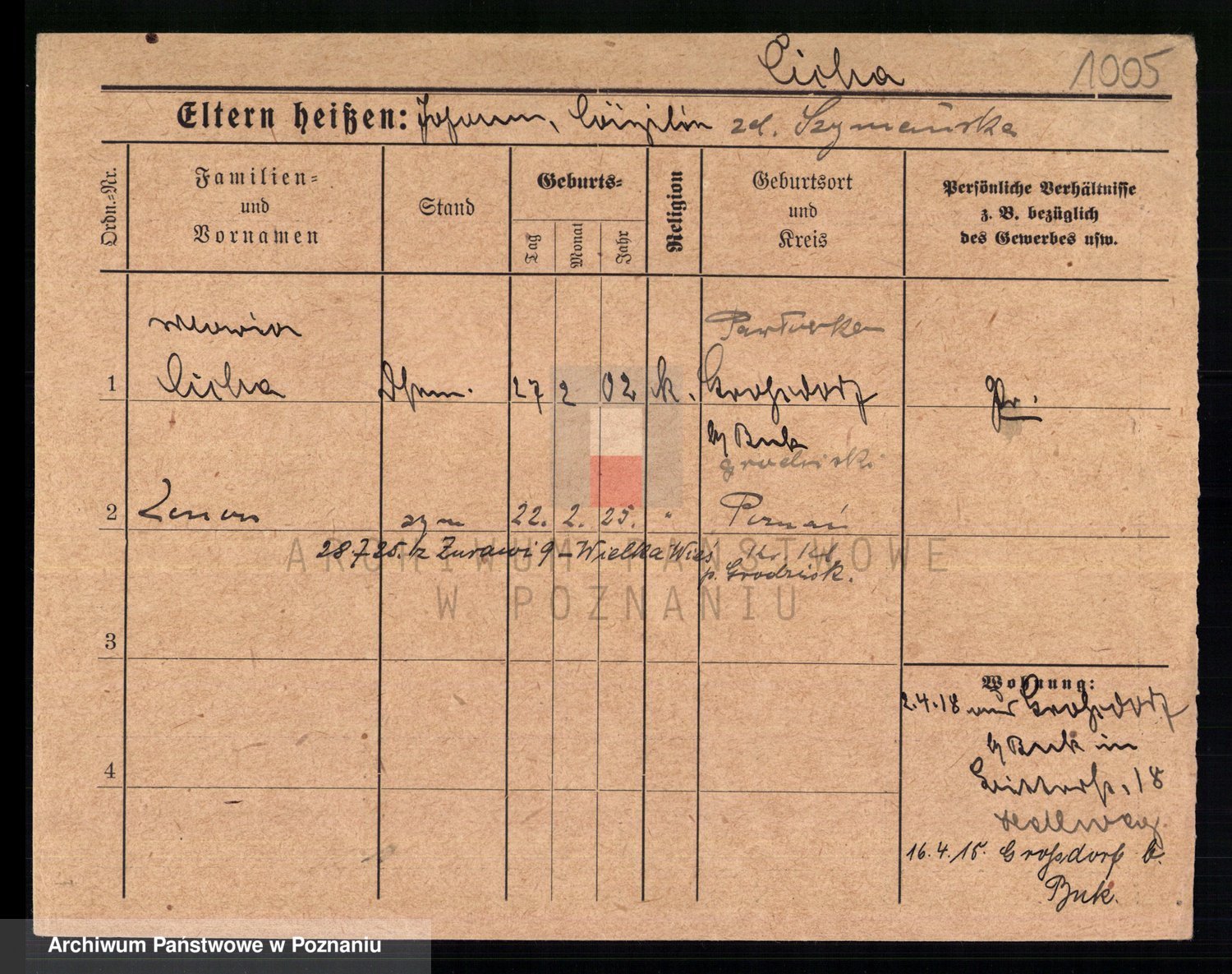 Podgląd karty osobowej dostępny jest po kliknięciu na nazwisko lub ikonkę karty. Można dokonywać powiększenia (ikony na górze) lub przechodzić między kolejnymi skanami (strzałki po bokach).
