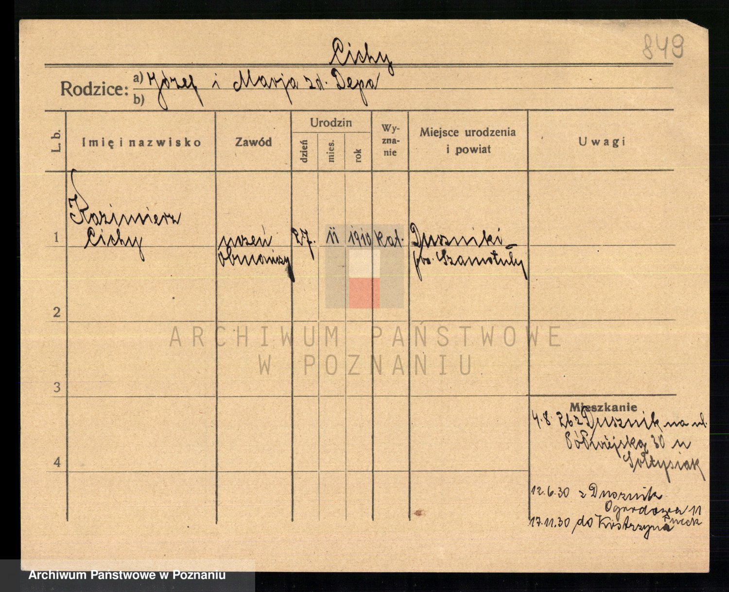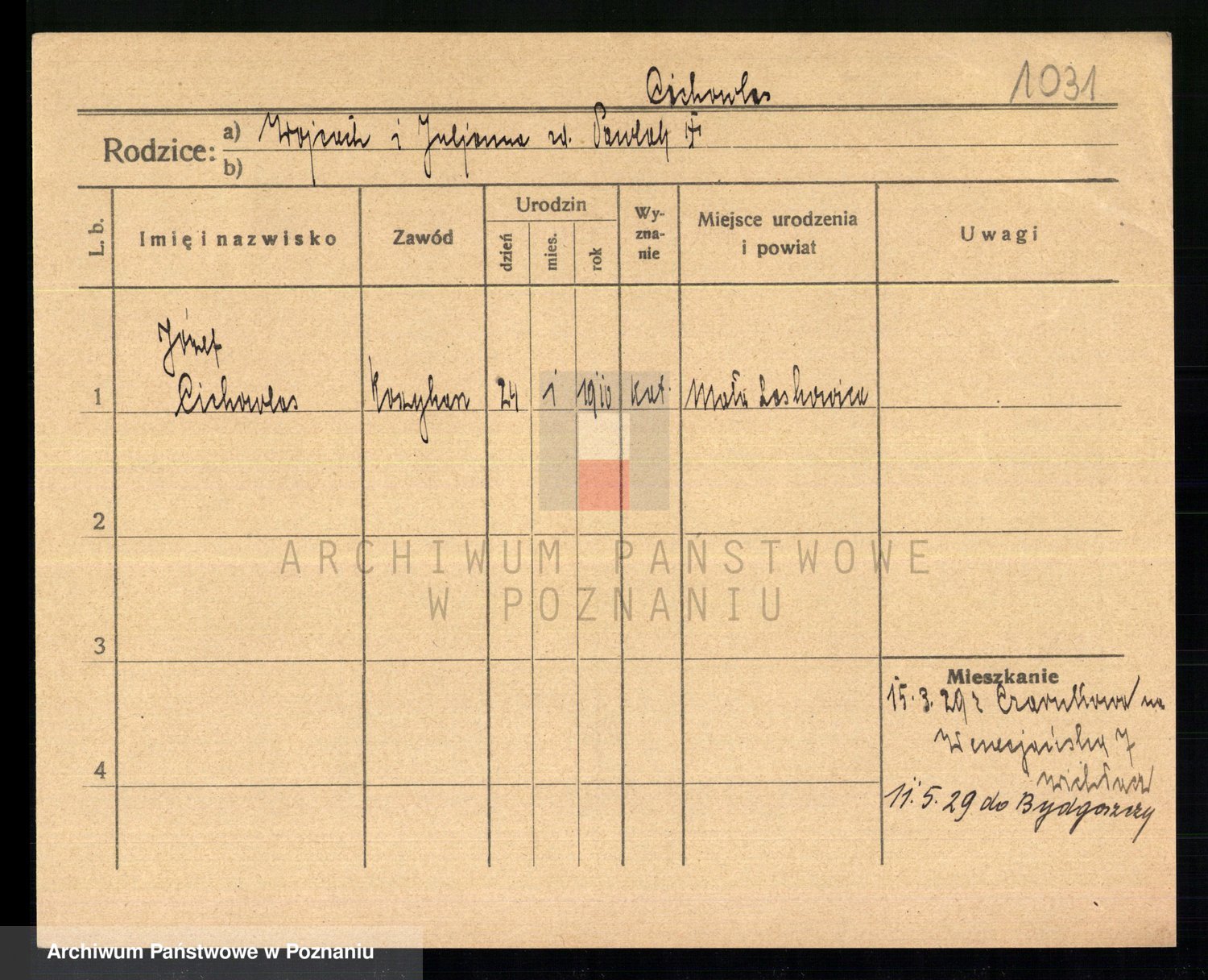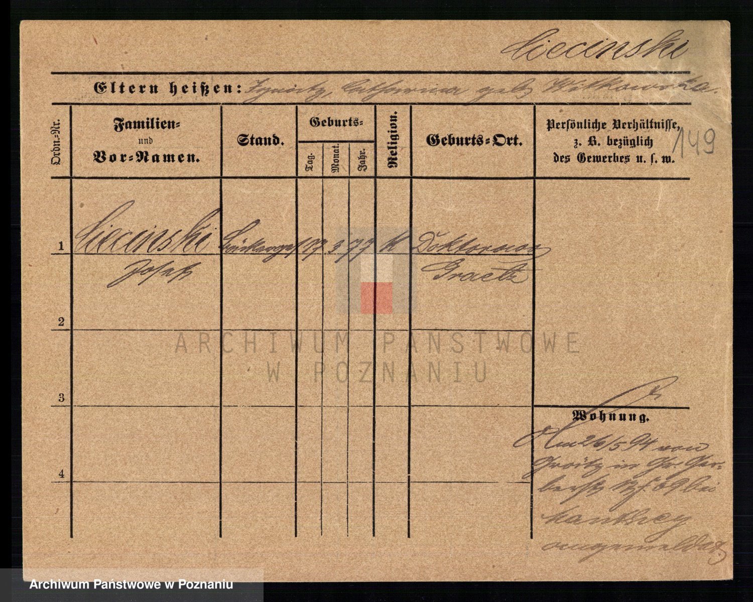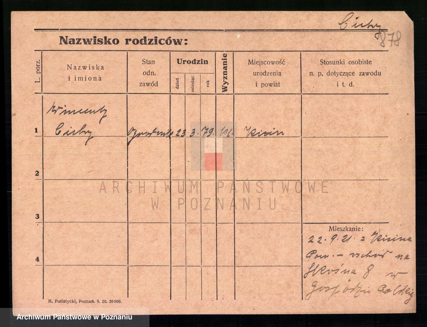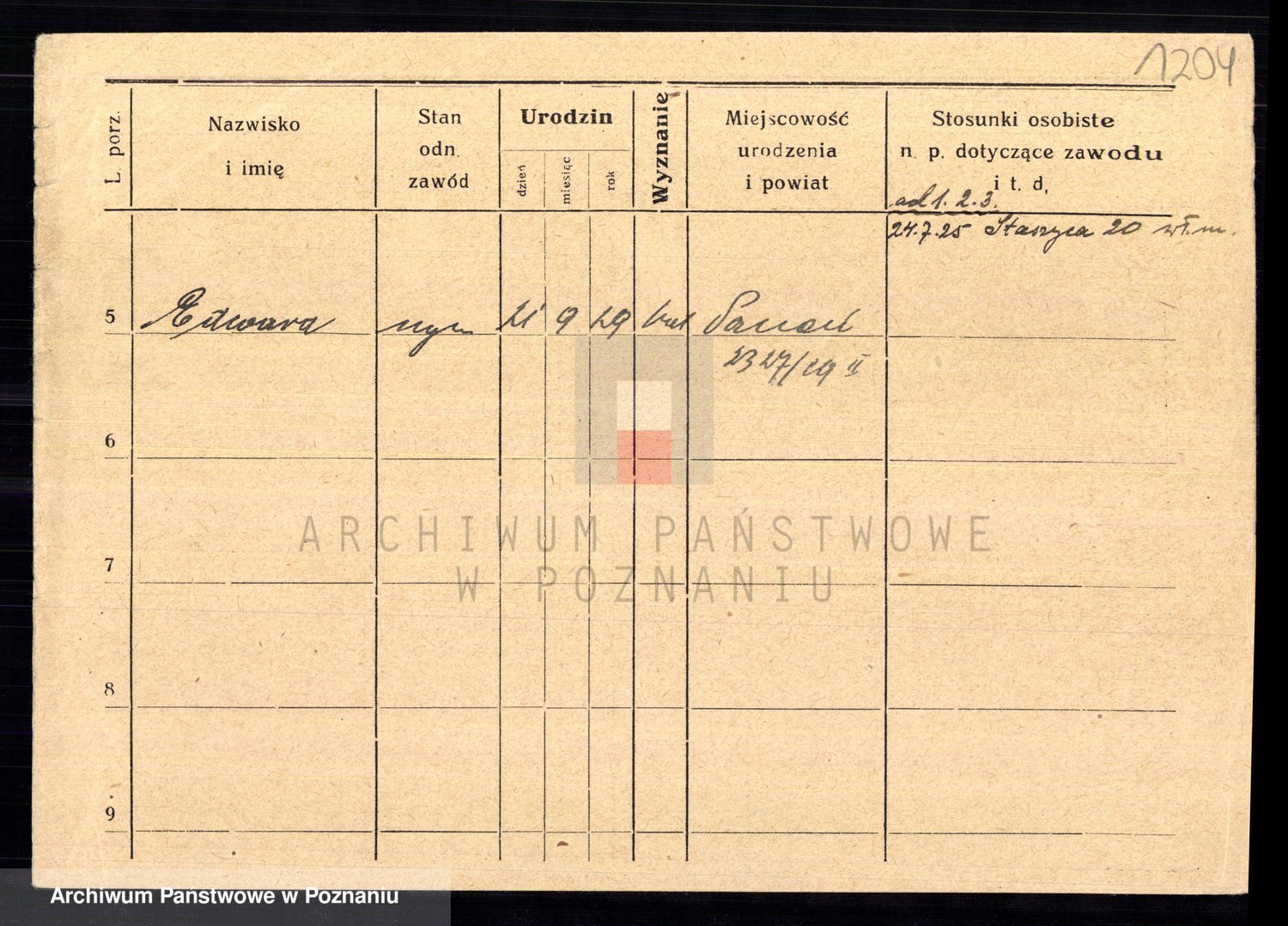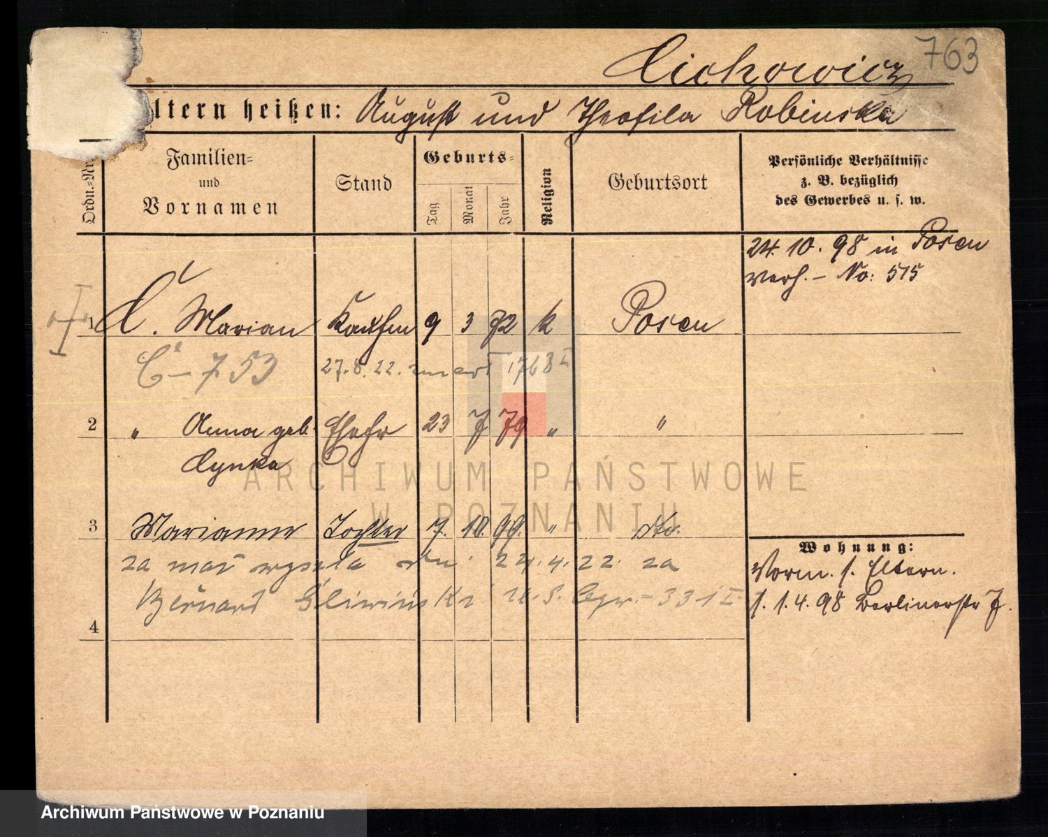 Podgląd karty osobowej dostępny jest po kliknięciu na nazwisko lub ikonkę karty. Można dokonywać powiększenia (ikony na górze) lub przechodzić między kolejnymi skanami (strzałki po bokach).