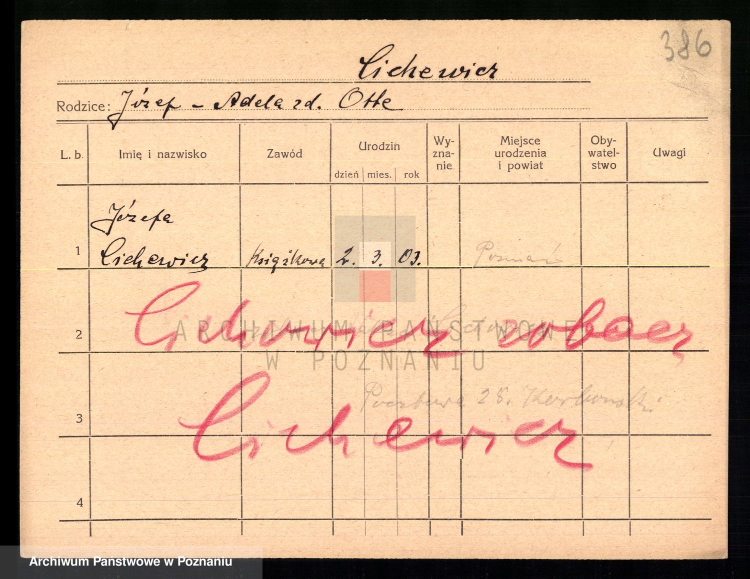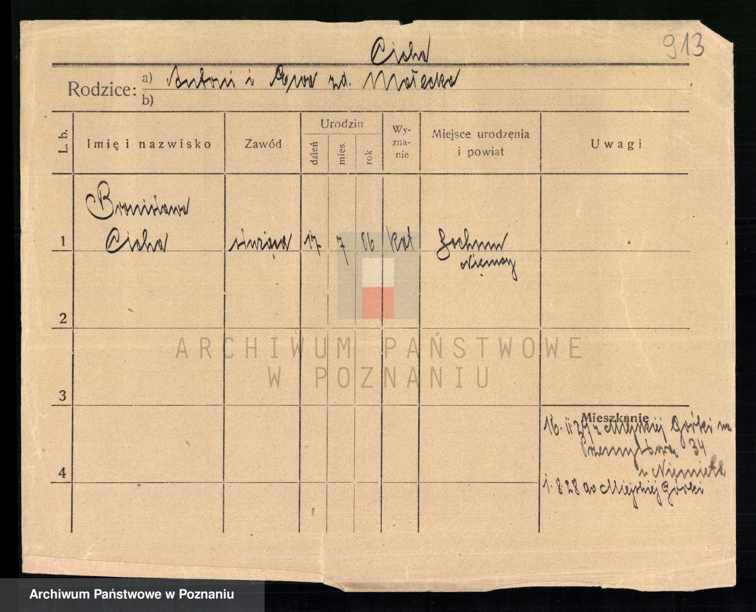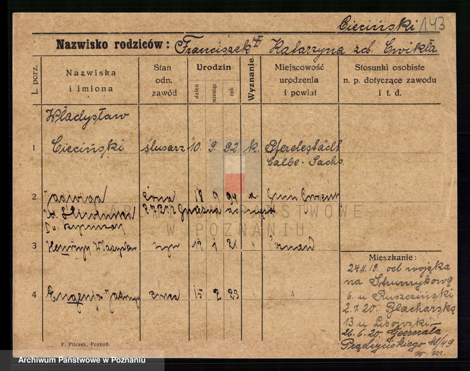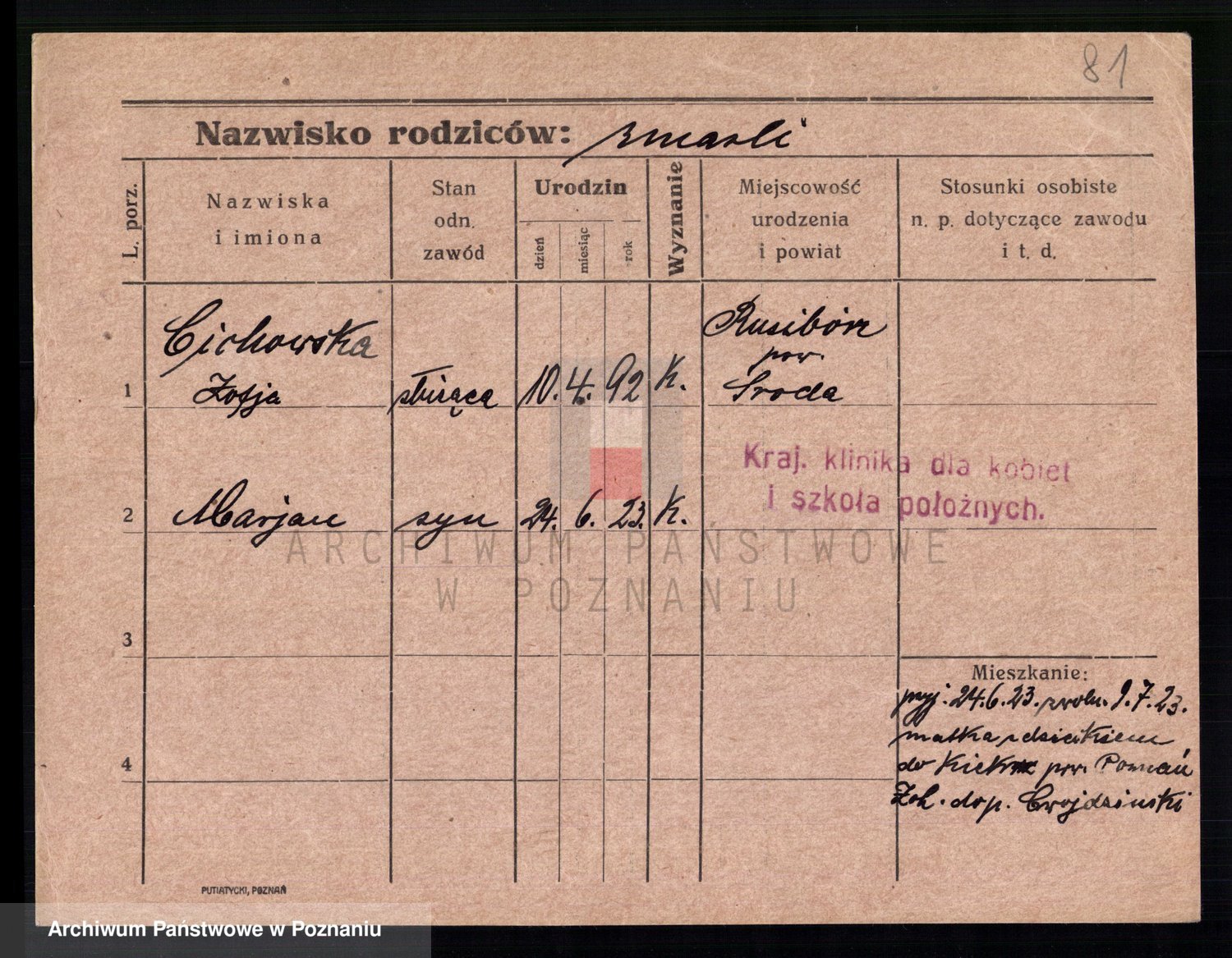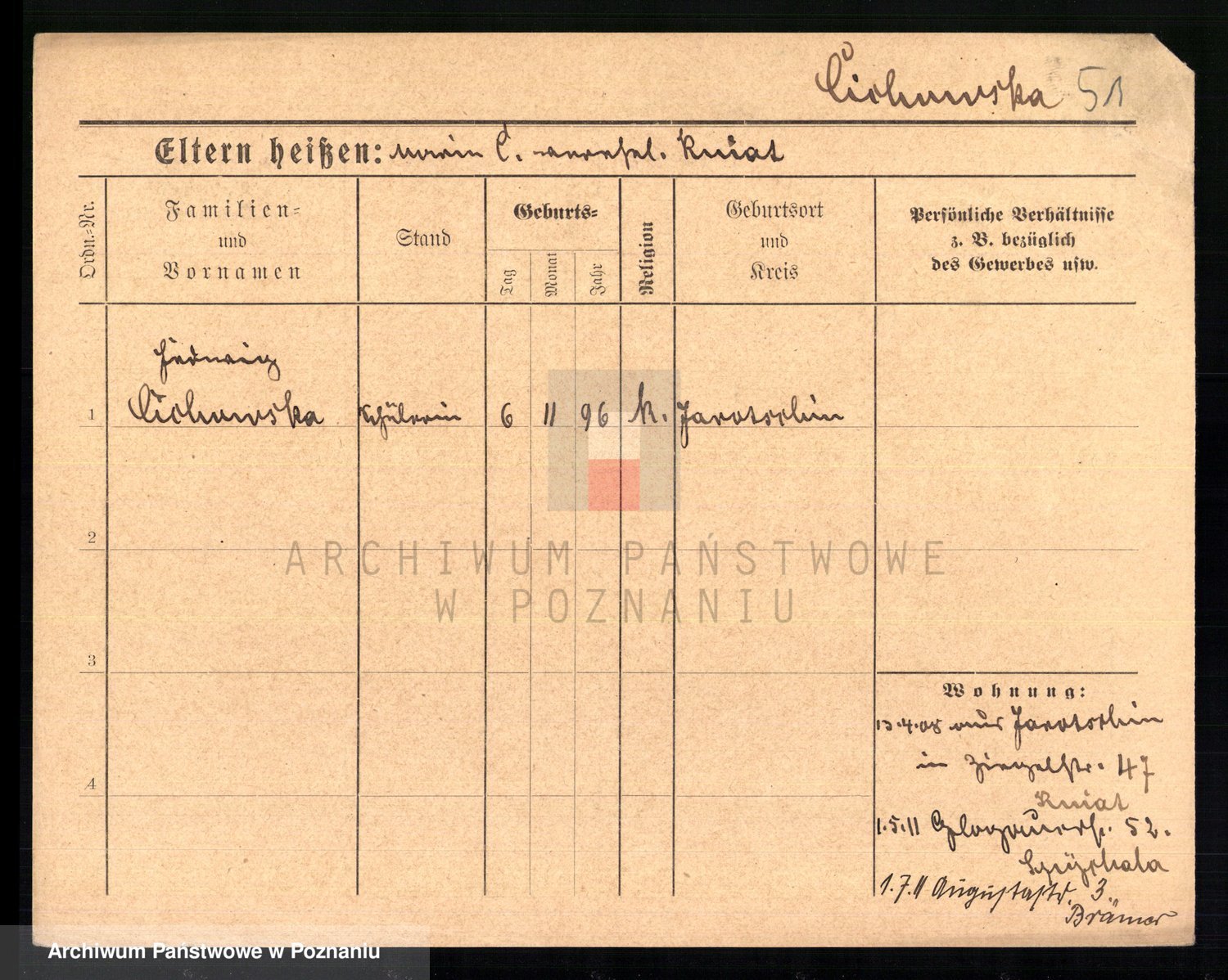 Podgląd karty osobowej dostępny jest po kliknięciu na nazwisko lub ikonkę karty. Można dokonywać powiększenia (ikony na górze) lub przechodzić między kolejnymi skanami (strzałki po bokach).