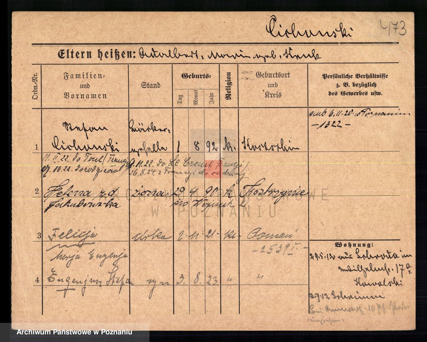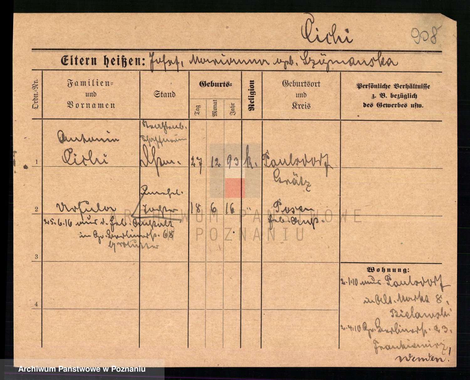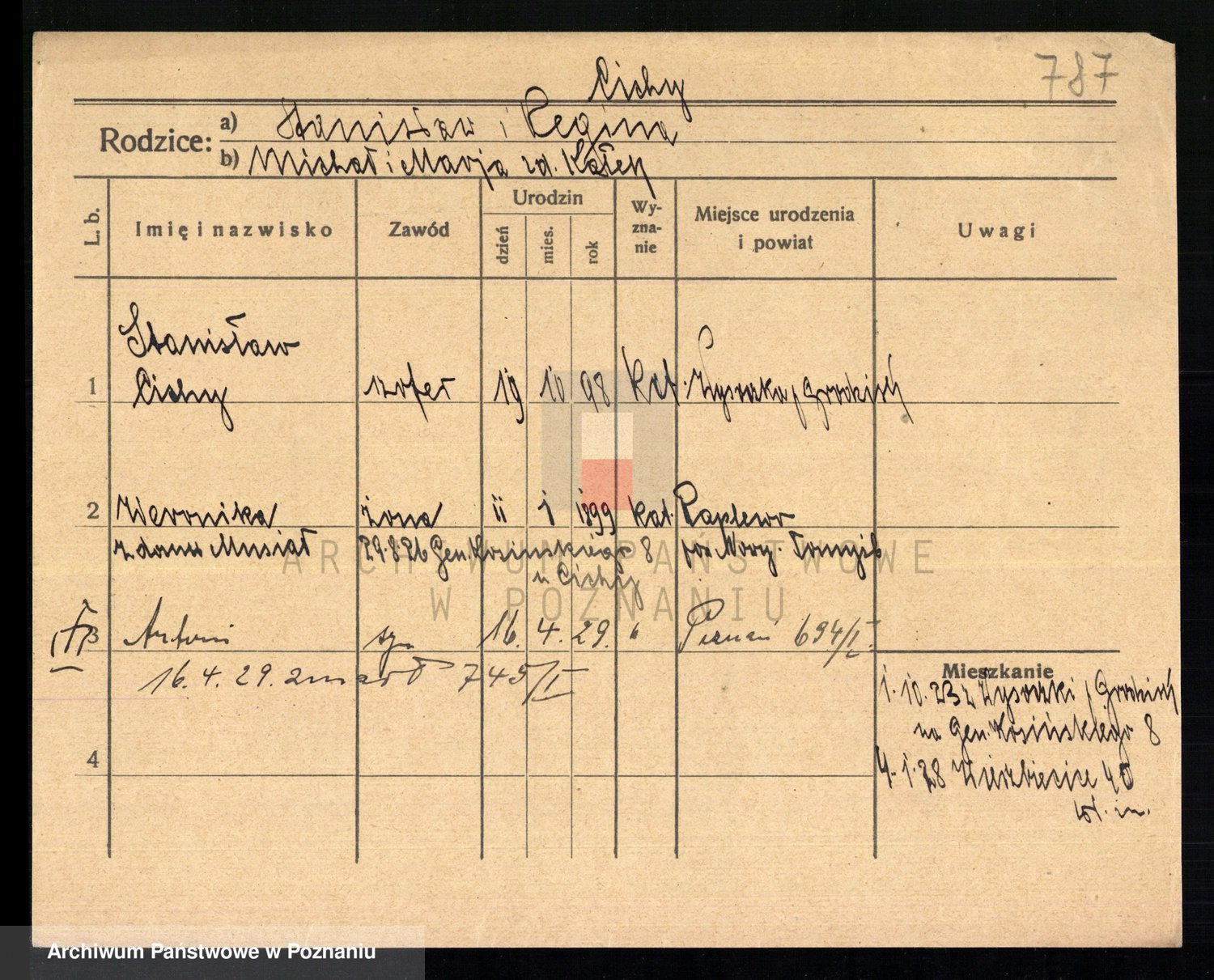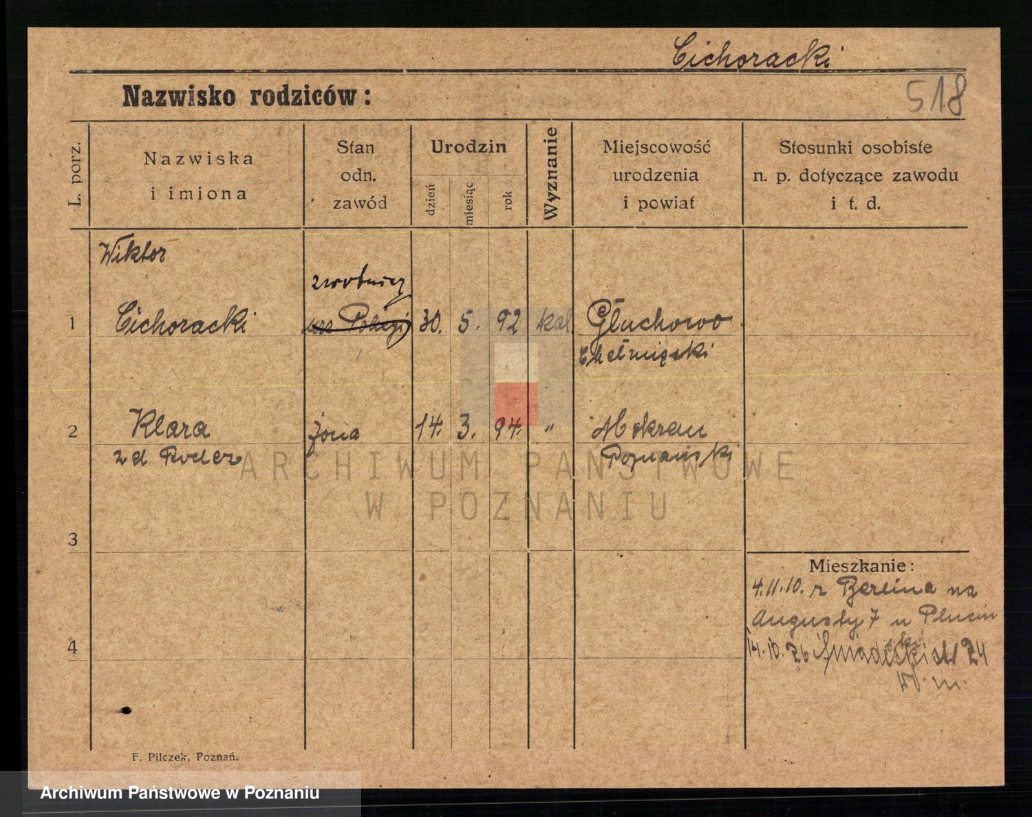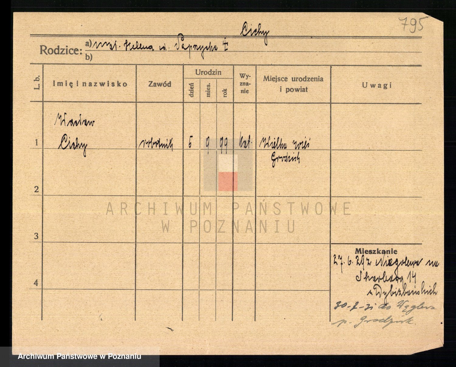 Podgląd karty osobowej dostępny jest po kliknięciu na nazwisko lub ikonkę karty. Można dokonywać powiększenia (ikony na górze) lub przechodzić między kolejnymi skanami (strzałki po bokach).