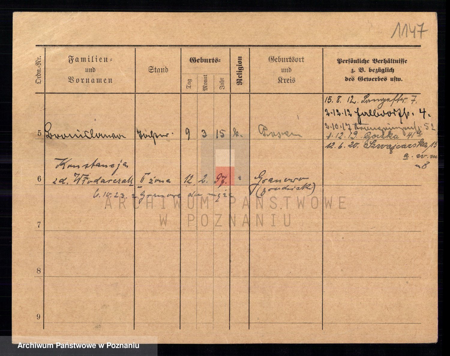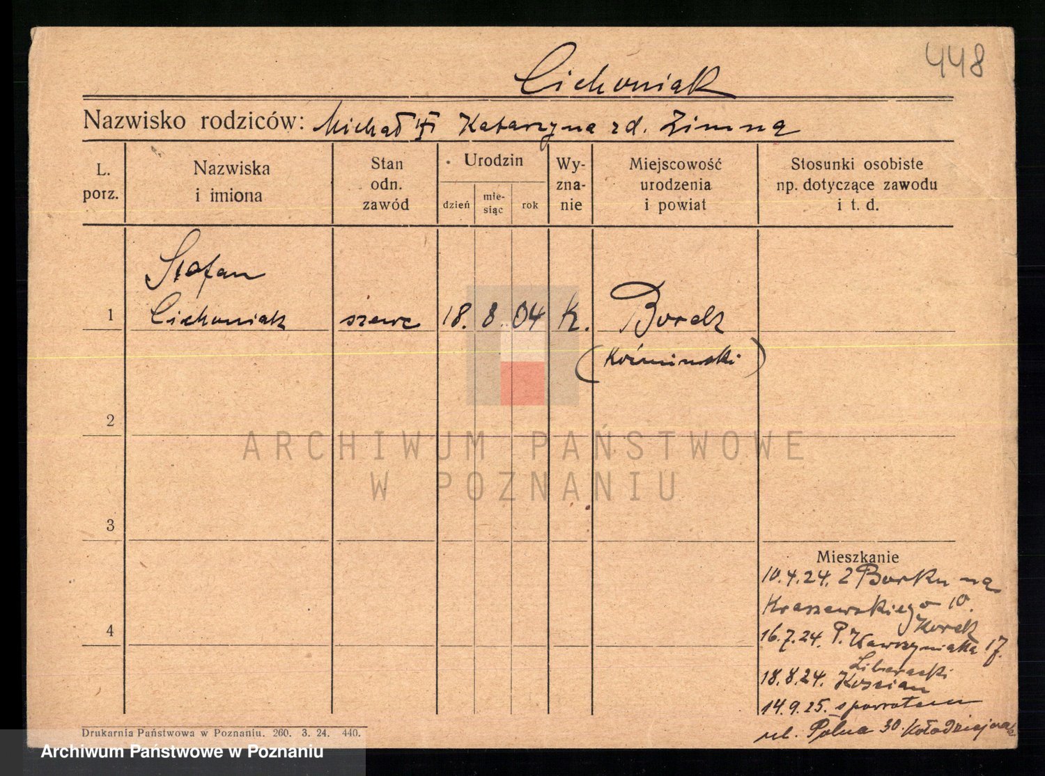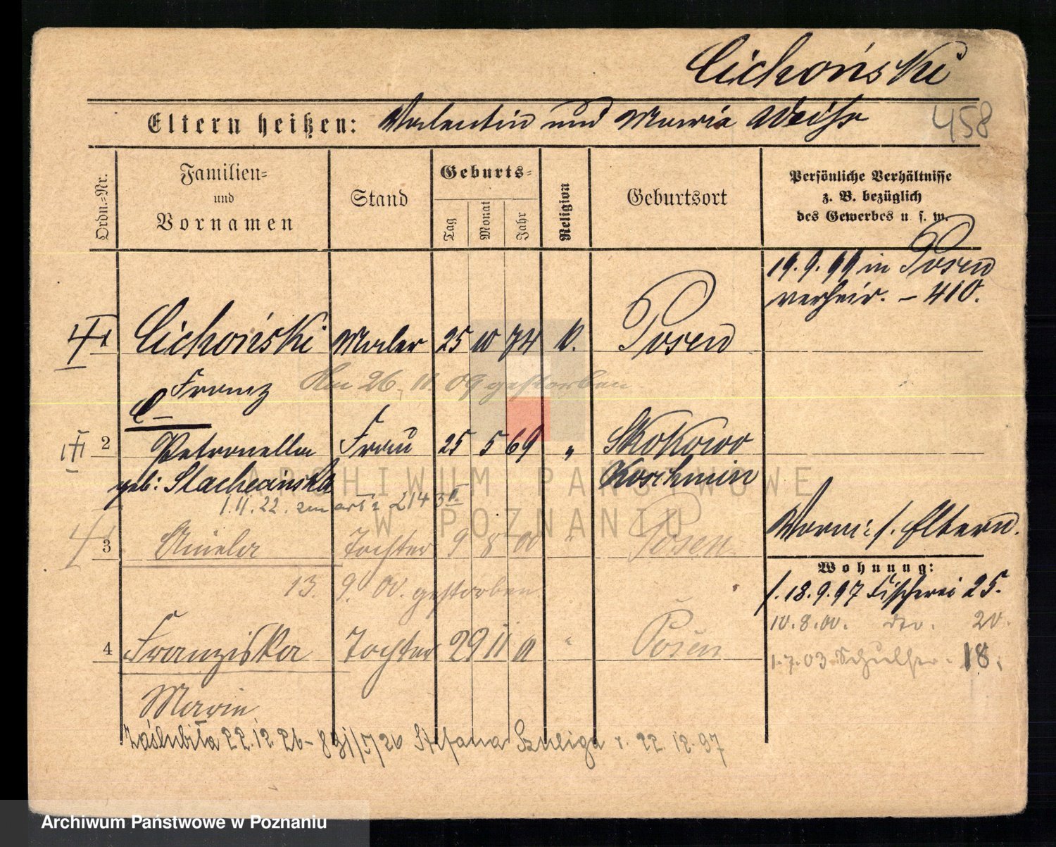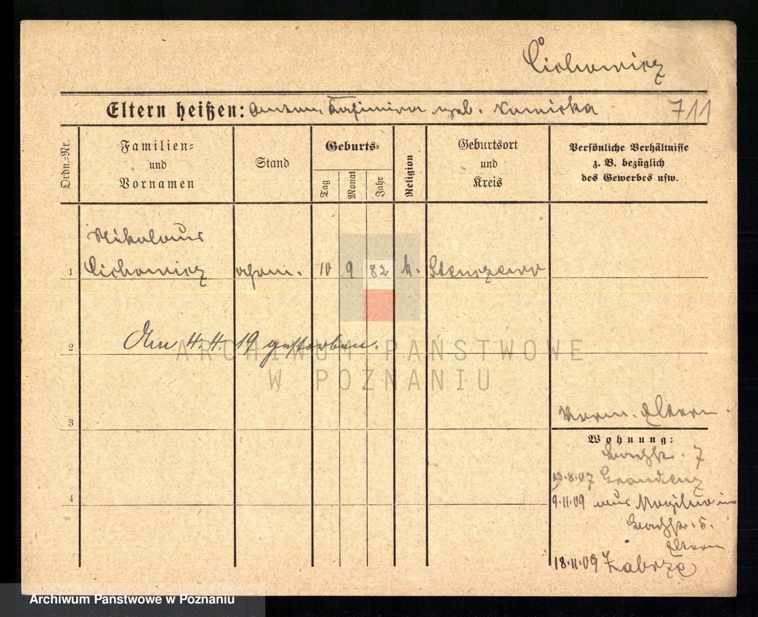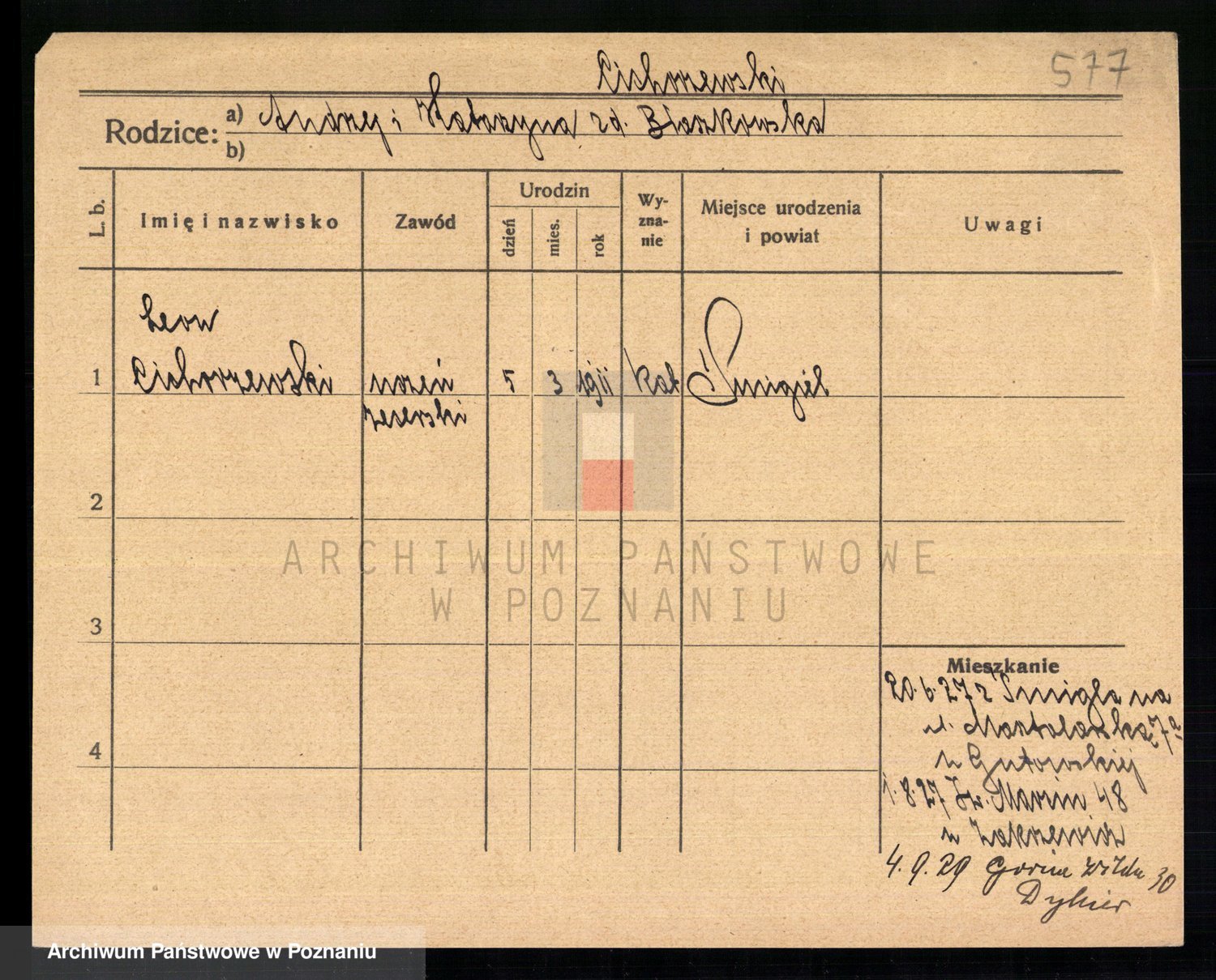 Podgląd karty osobowej dostępny jest po kliknięciu na nazwisko lub ikonkę karty. Można dokonywać powiększenia (ikony na górze) lub przechodzić między kolejnymi skanami (strzałki po bokach).