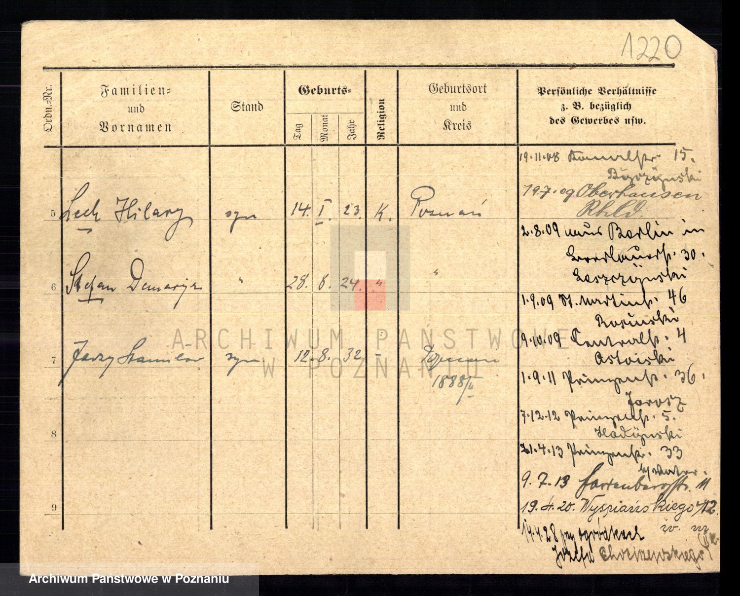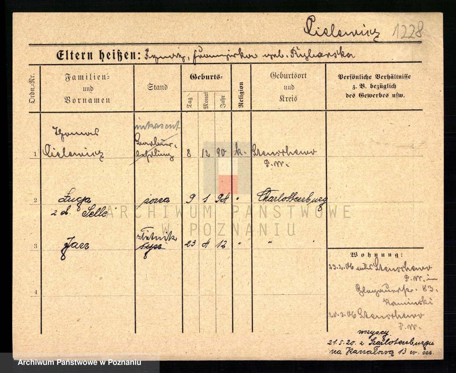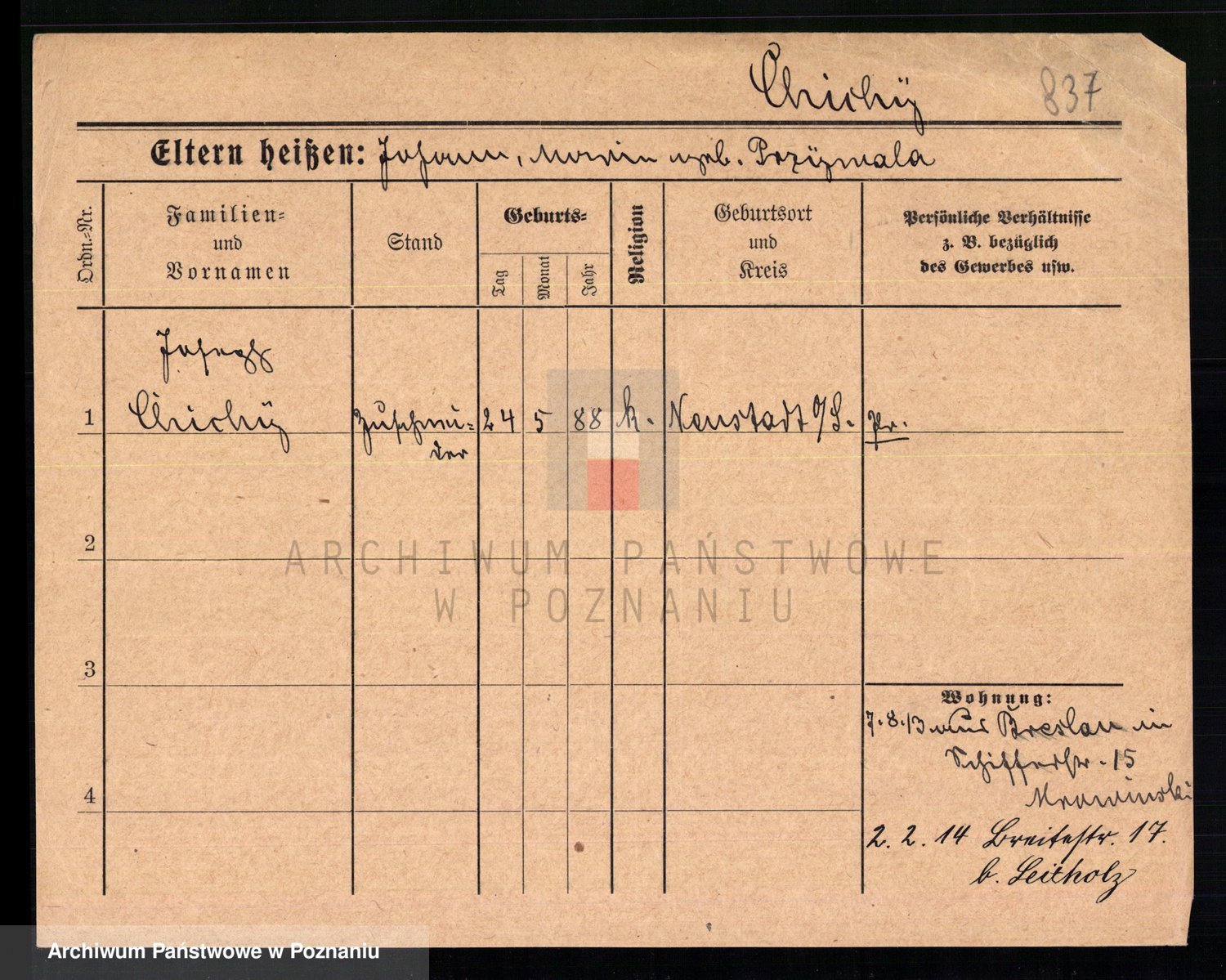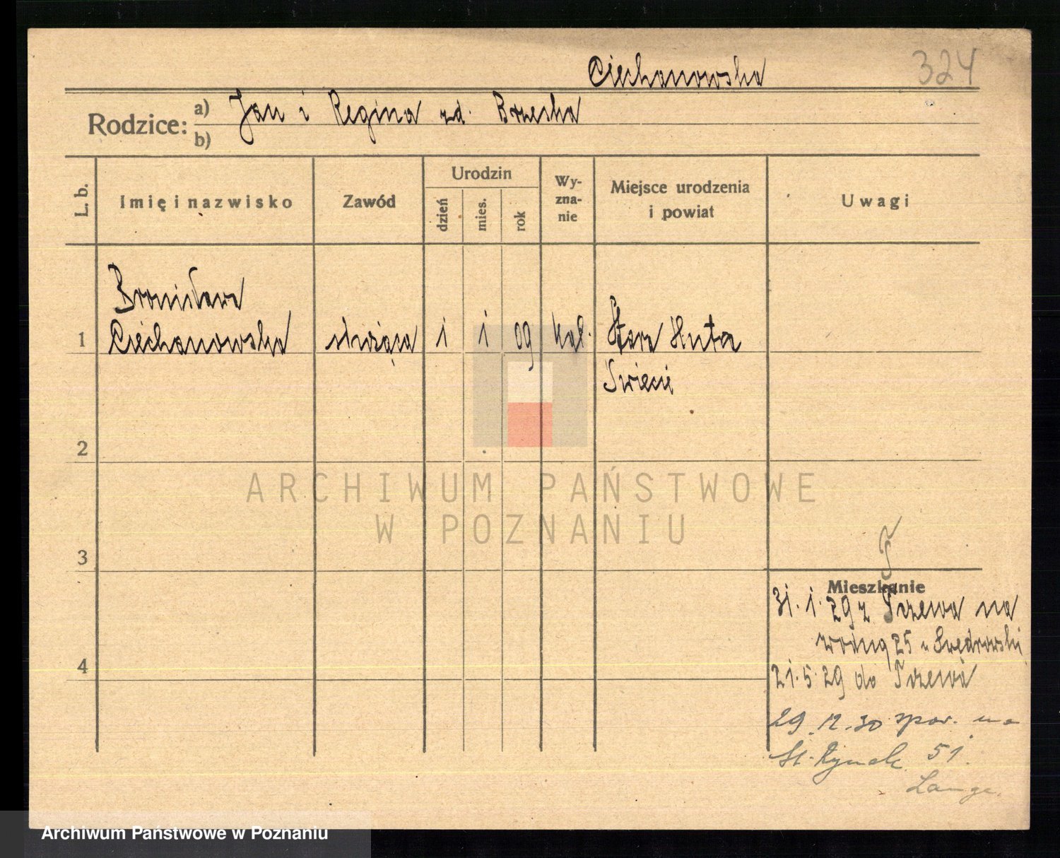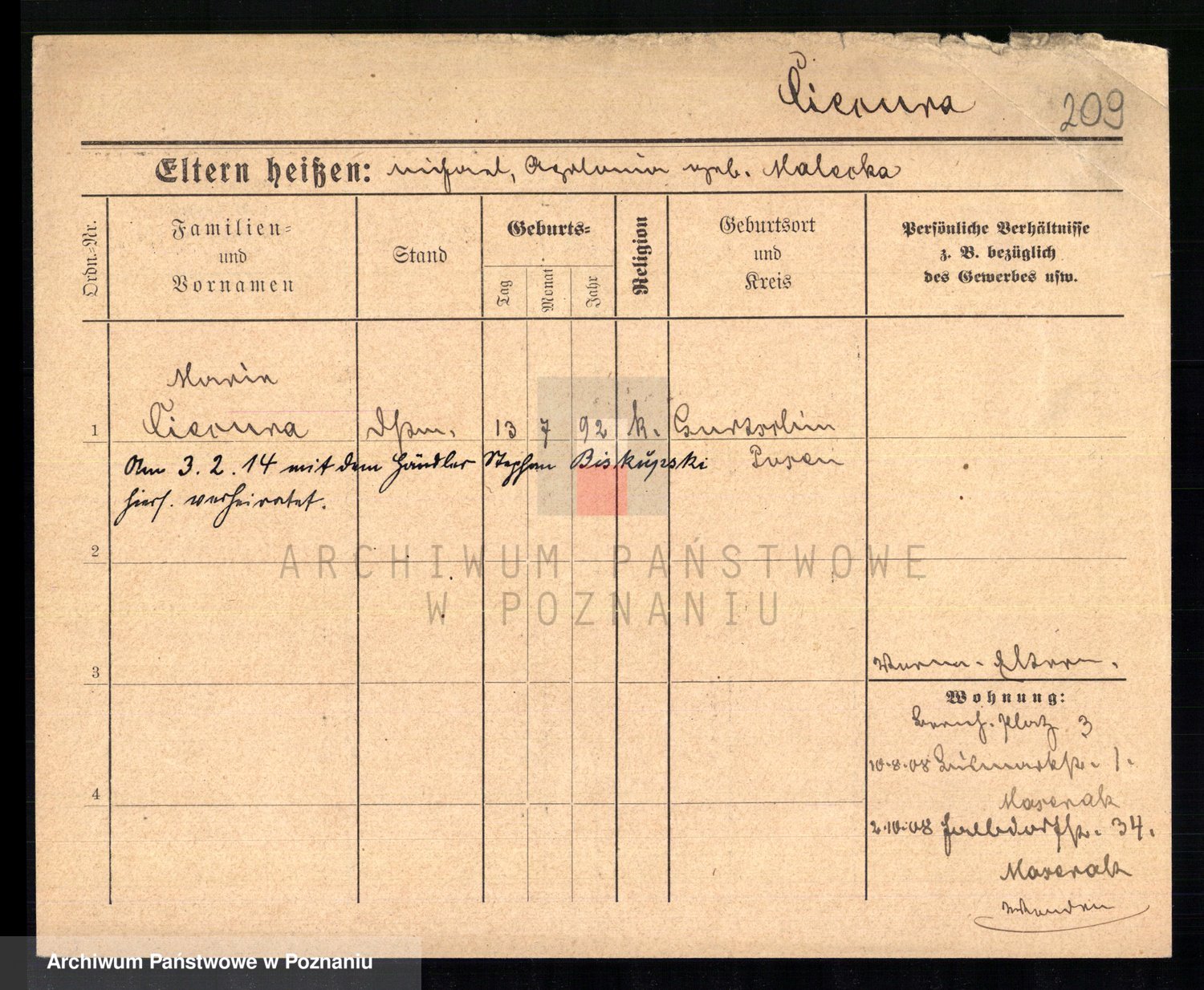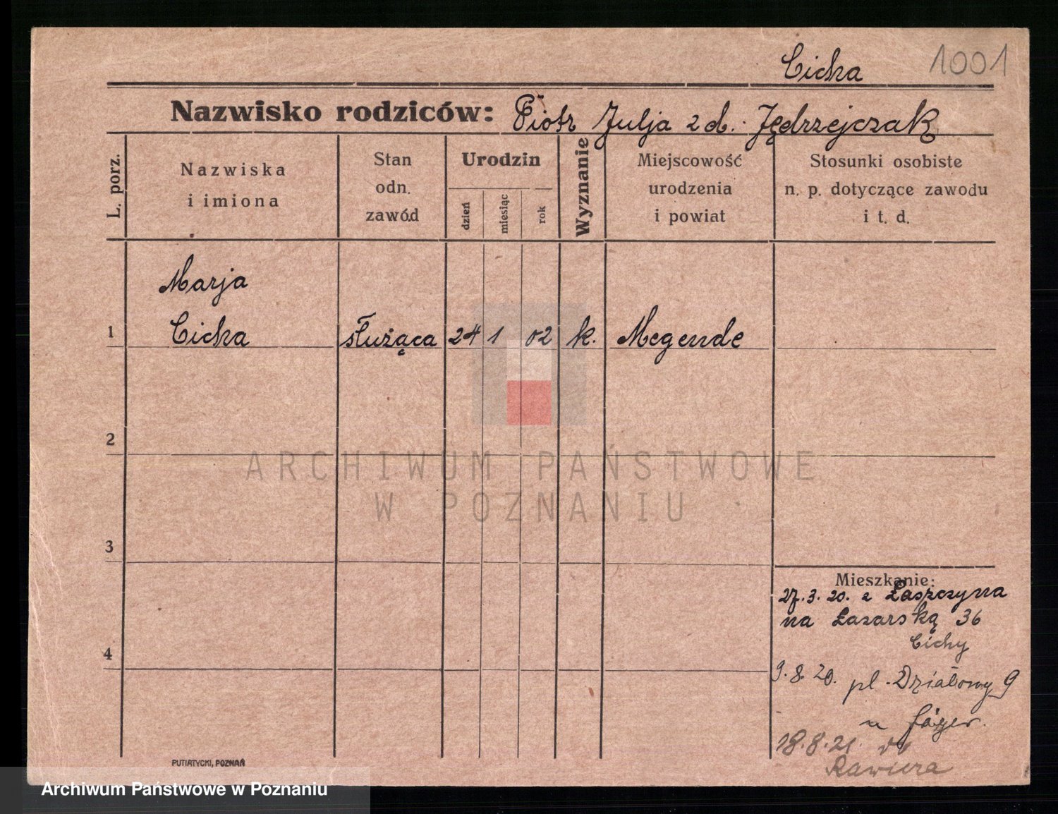 Podgląd karty osobowej dostępny jest po kliknięciu na nazwisko lub ikonkę karty. Można dokonywać powiększenia (ikony na górze) lub przechodzić między kolejnymi skanami (strzałki po bokach).
