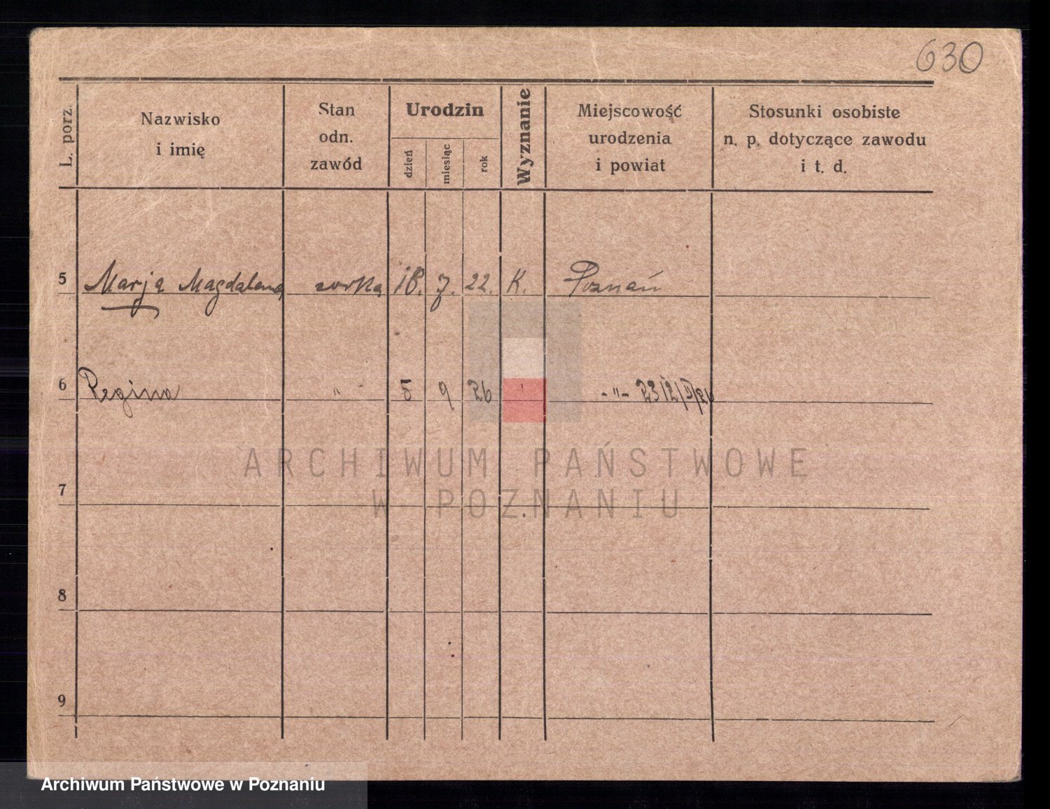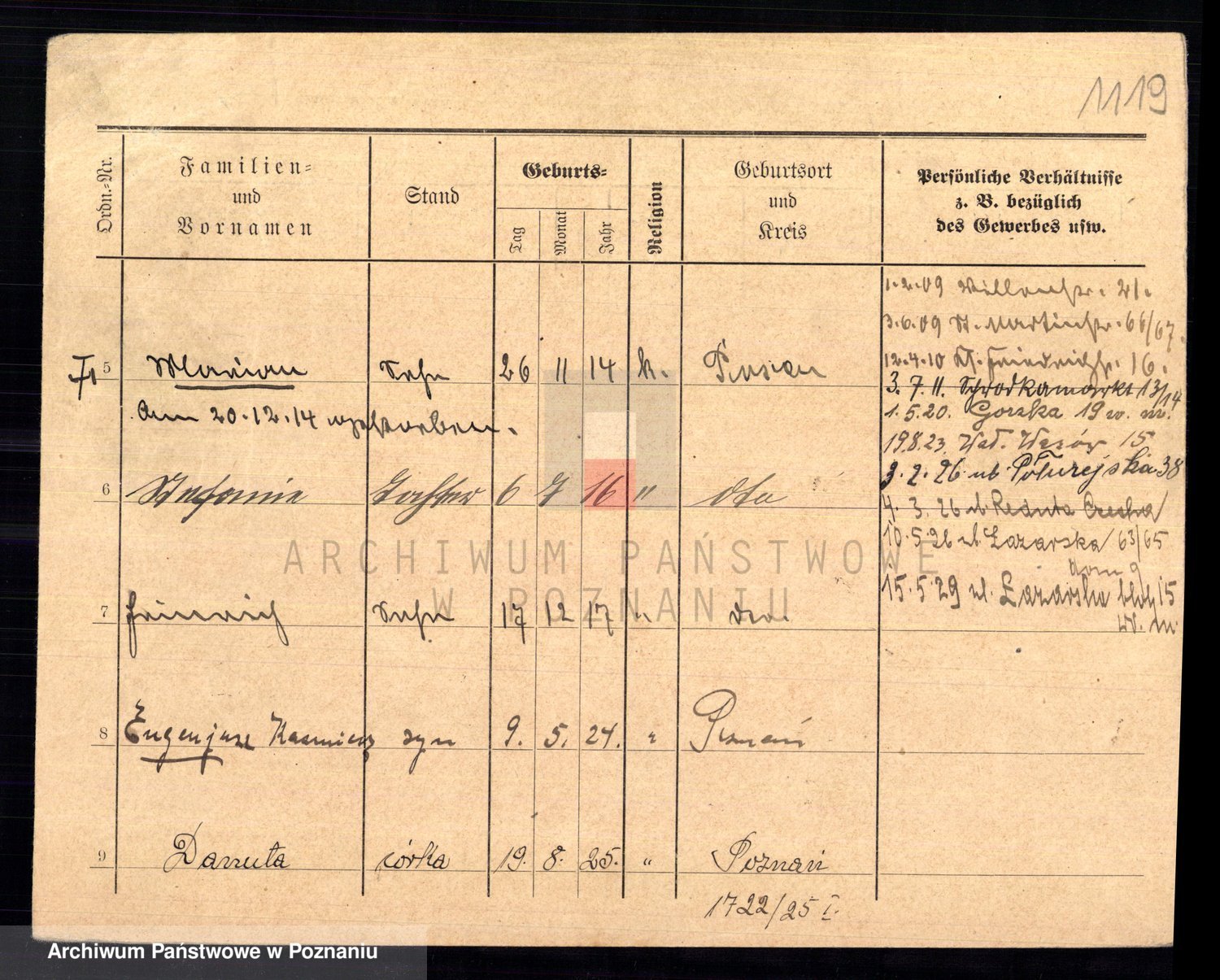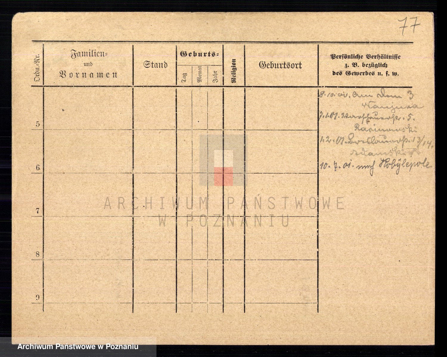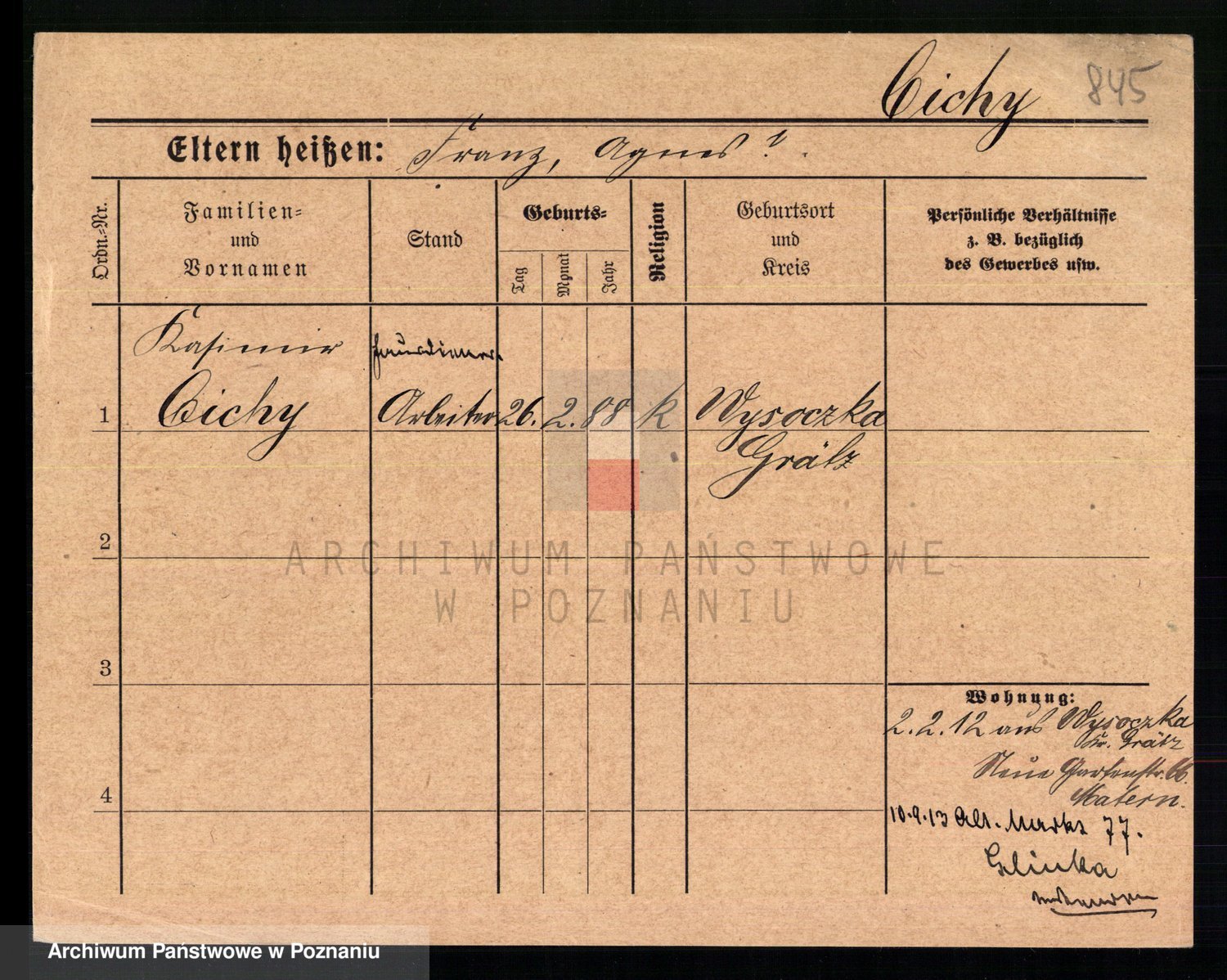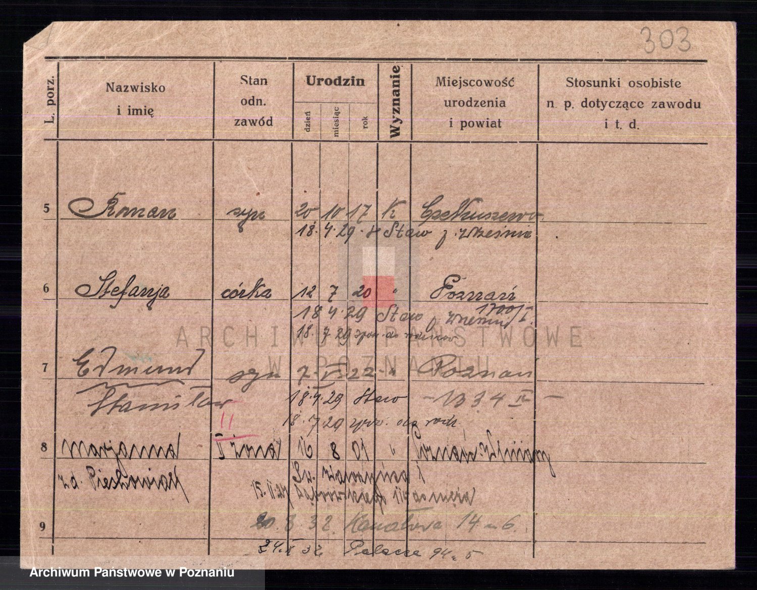 Podgląd karty osobowej dostępny jest po kliknięciu na nazwisko lub ikonkę karty. Można dokonywać powiększenia (ikony na górze) lub przechodzić między kolejnymi skanami (strzałki po bokach).