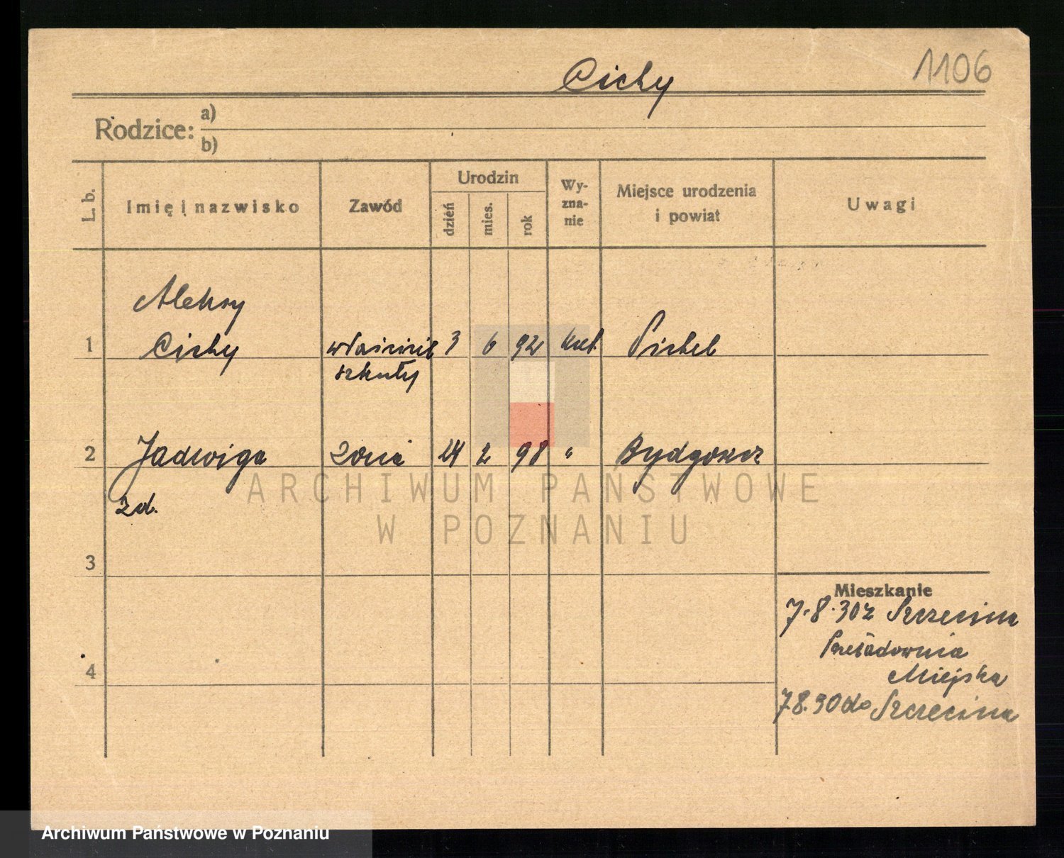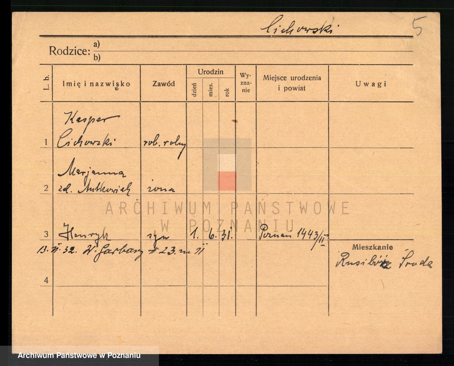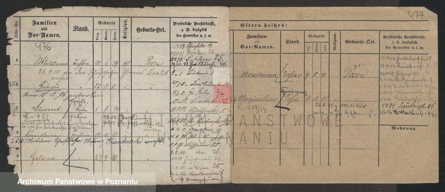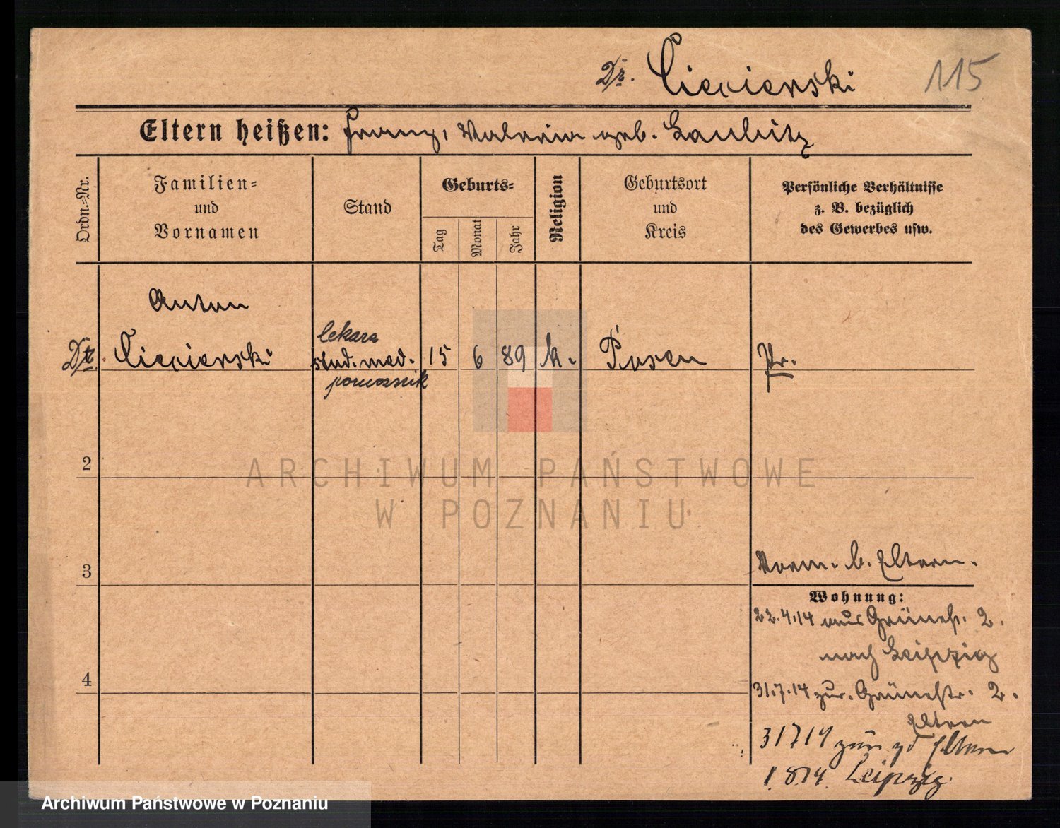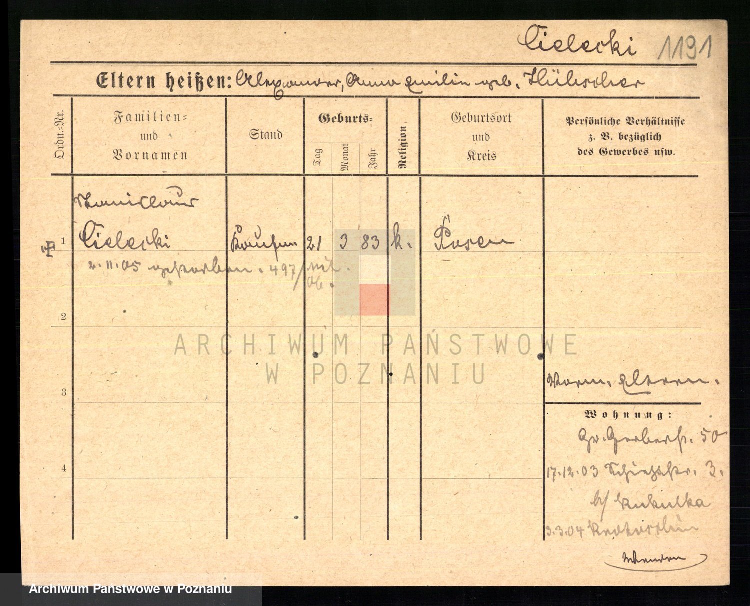 Podgląd karty osobowej dostępny jest po kliknięciu na nazwisko lub ikonkę karty. Można dokonywać powiększenia (ikony na górze) lub przechodzić między kolejnymi skanami (strzałki po bokach).