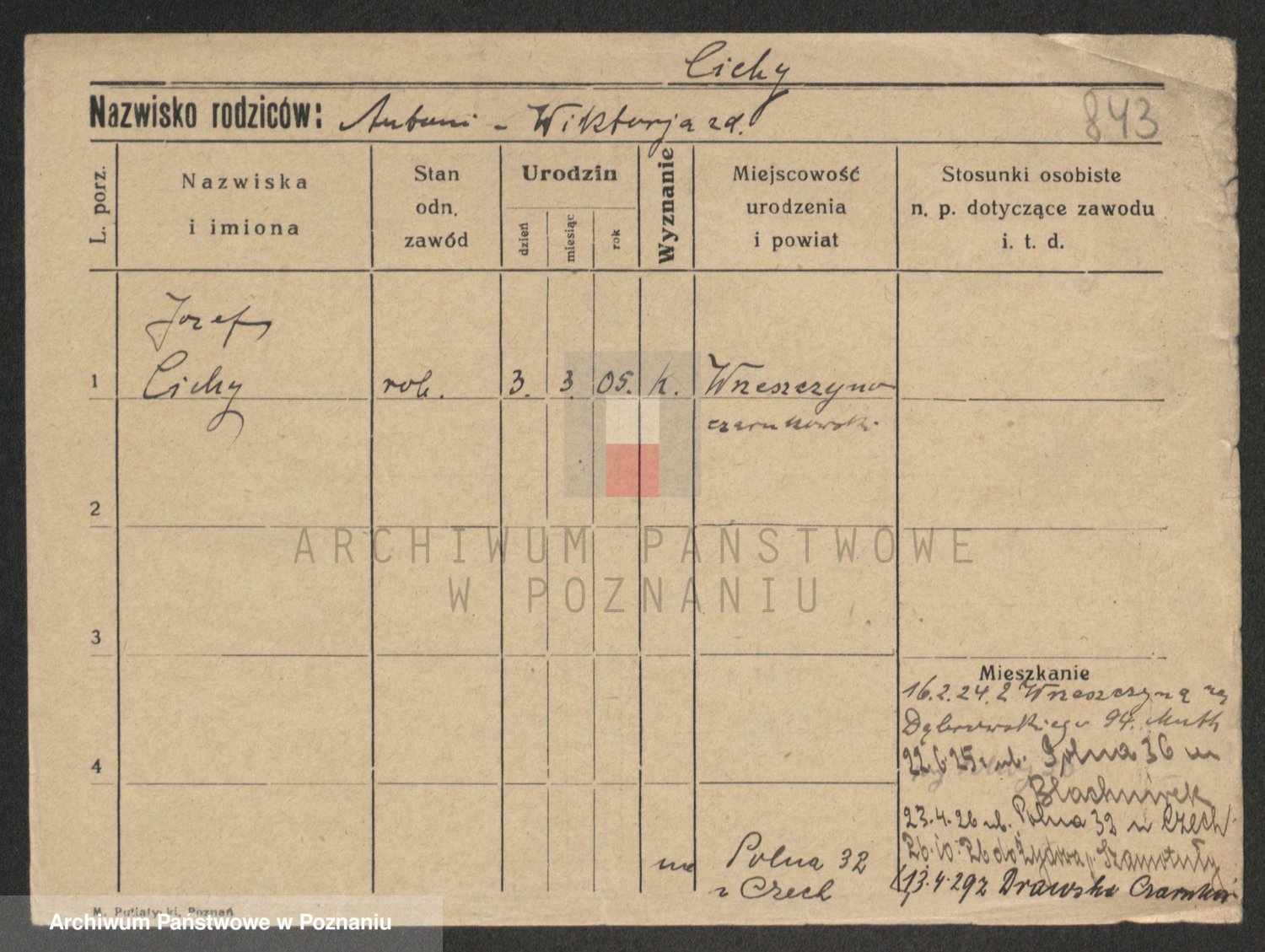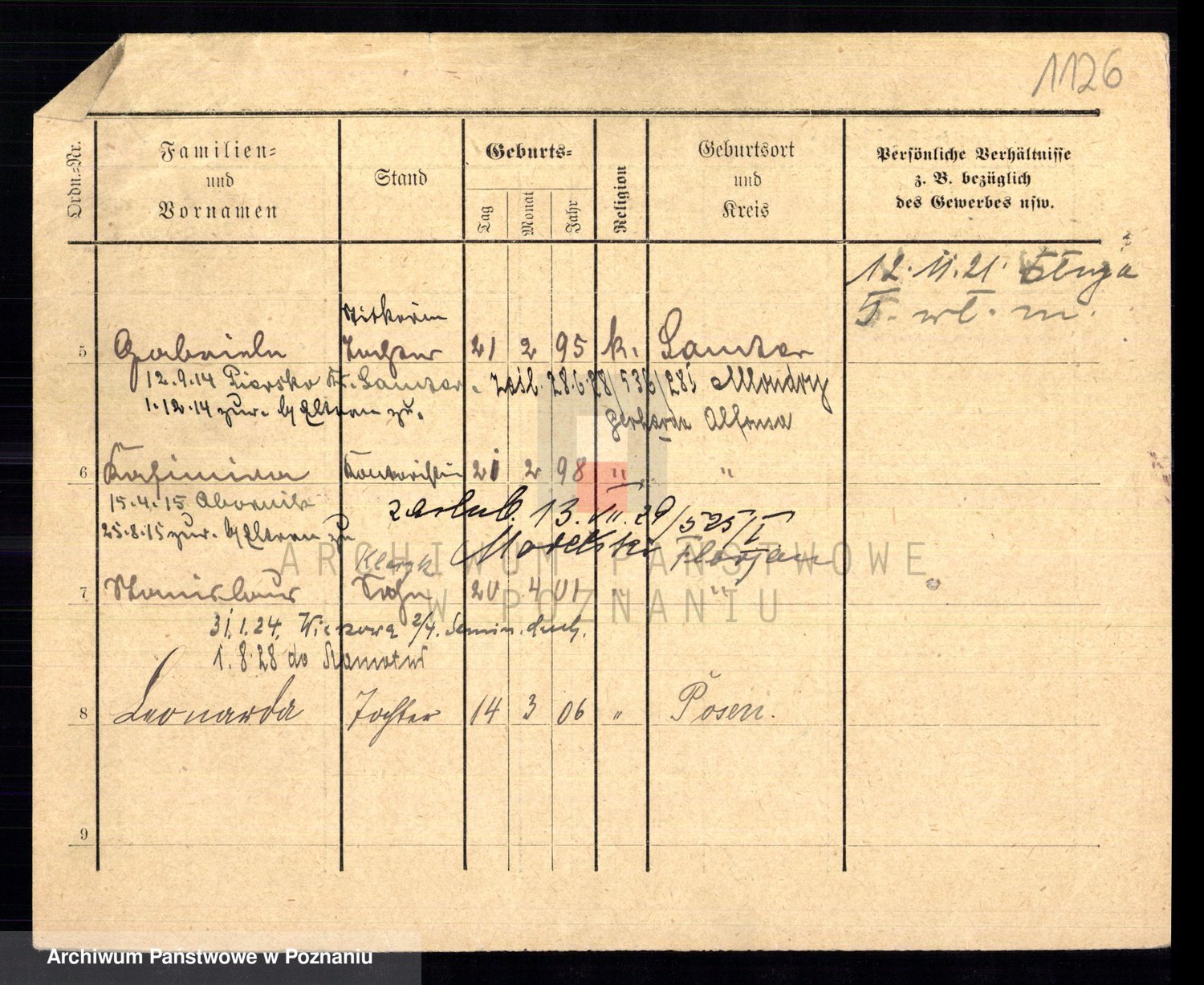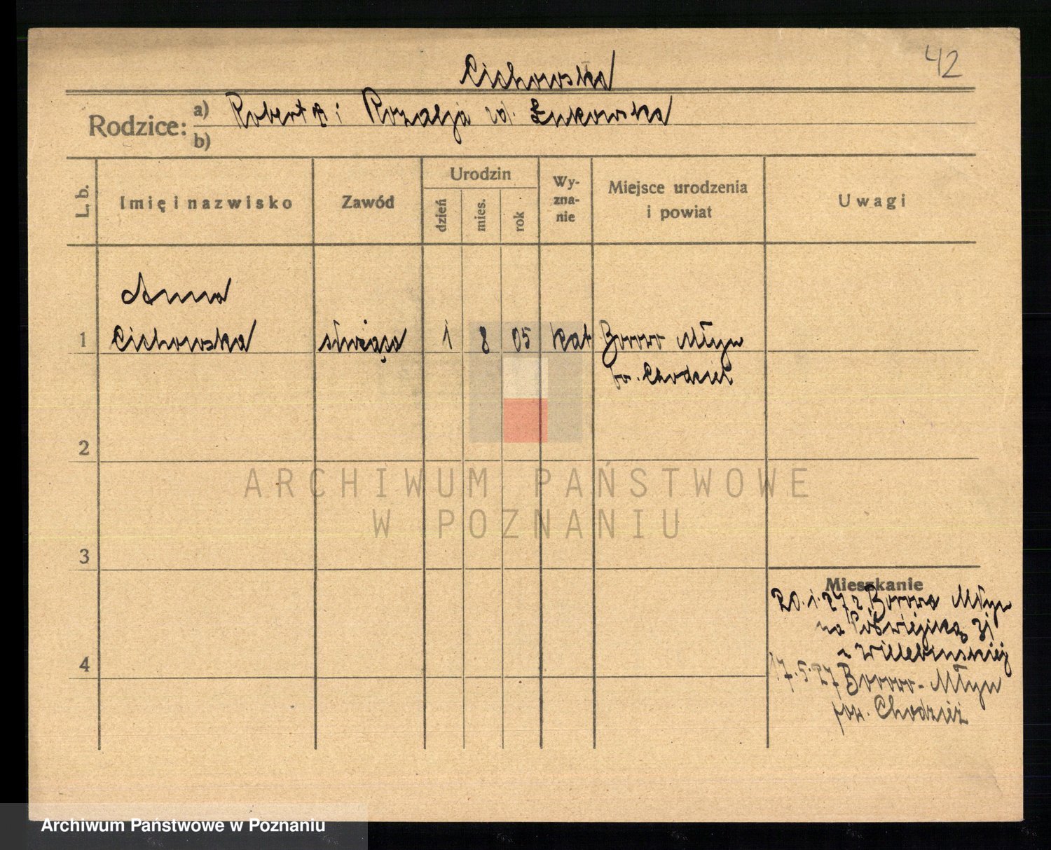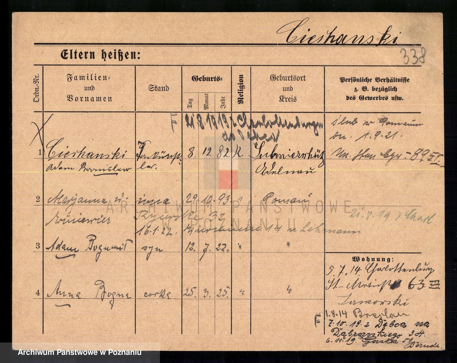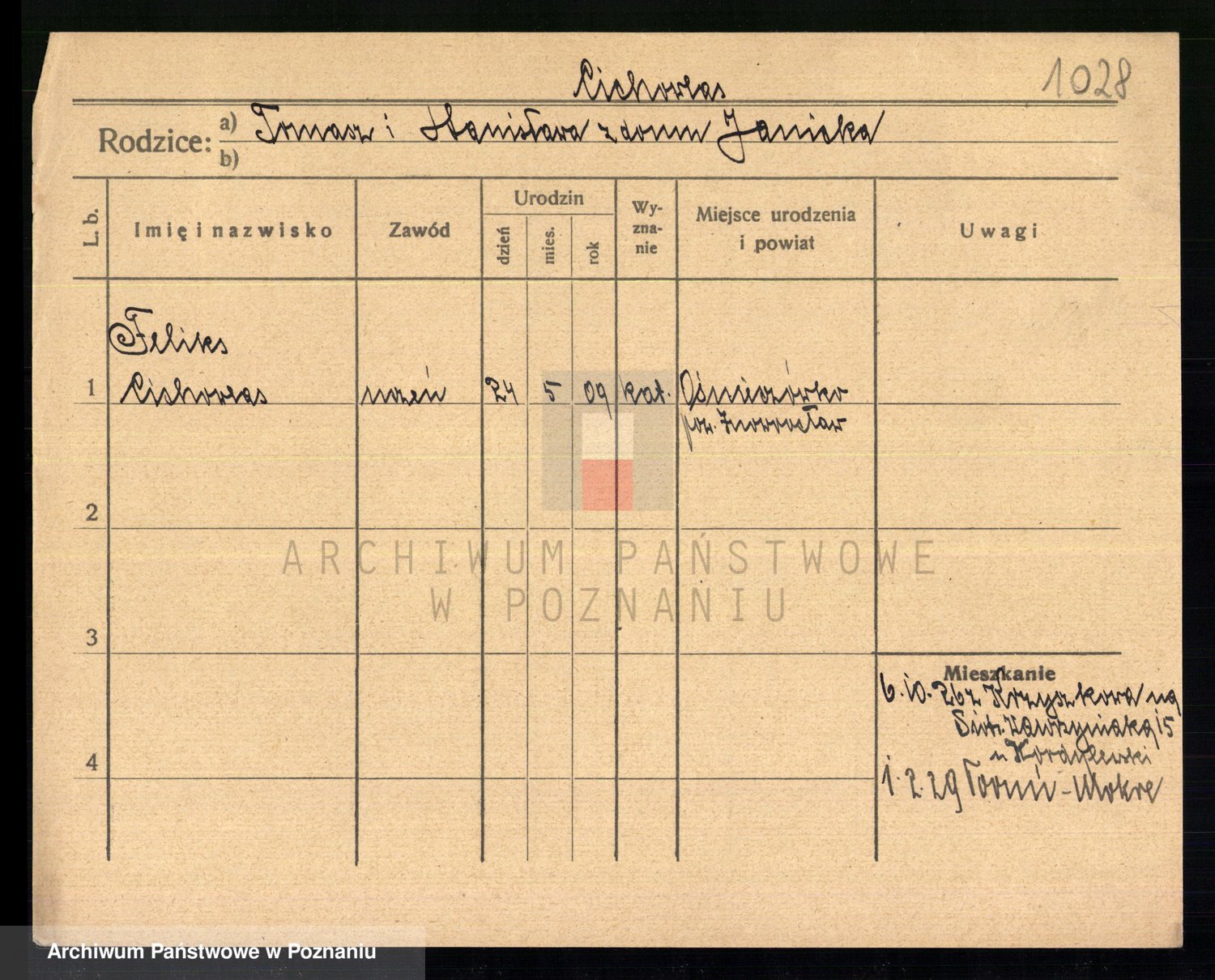 Podgląd karty osobowej dostępny jest po kliknięciu na nazwisko lub ikonkę karty. Można dokonywać powiększenia (ikony na górze) lub przechodzić między kolejnymi skanami (strzałki po bokach).