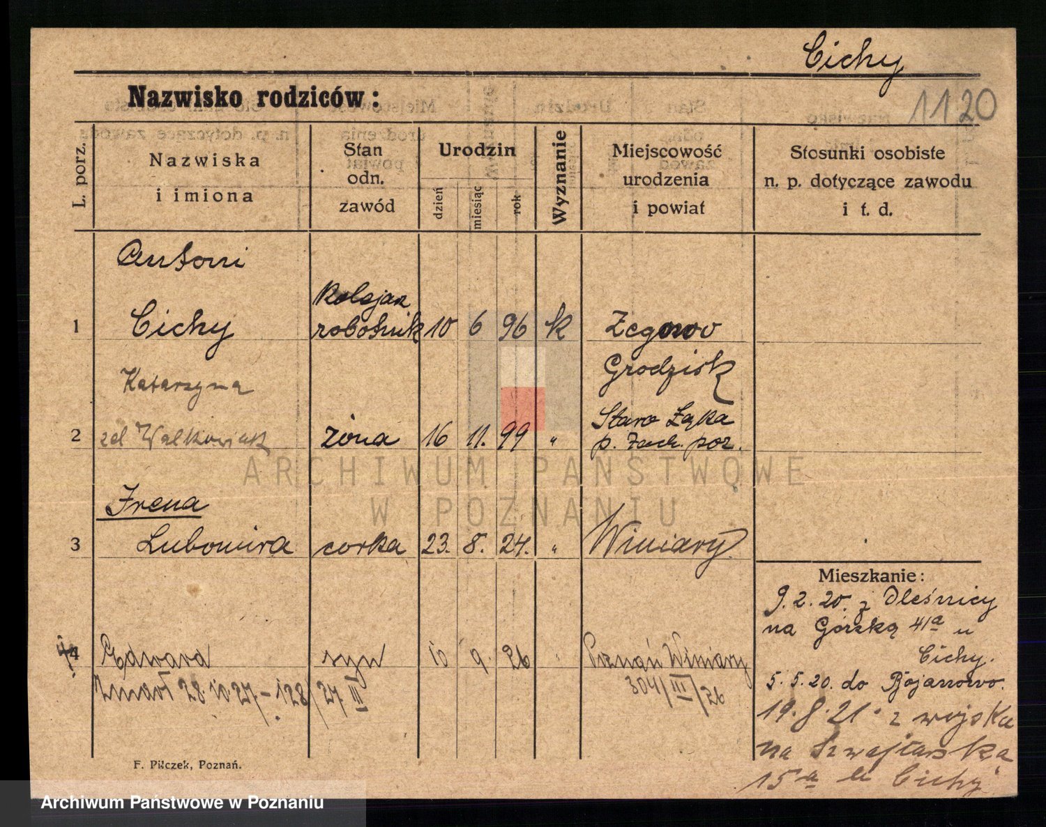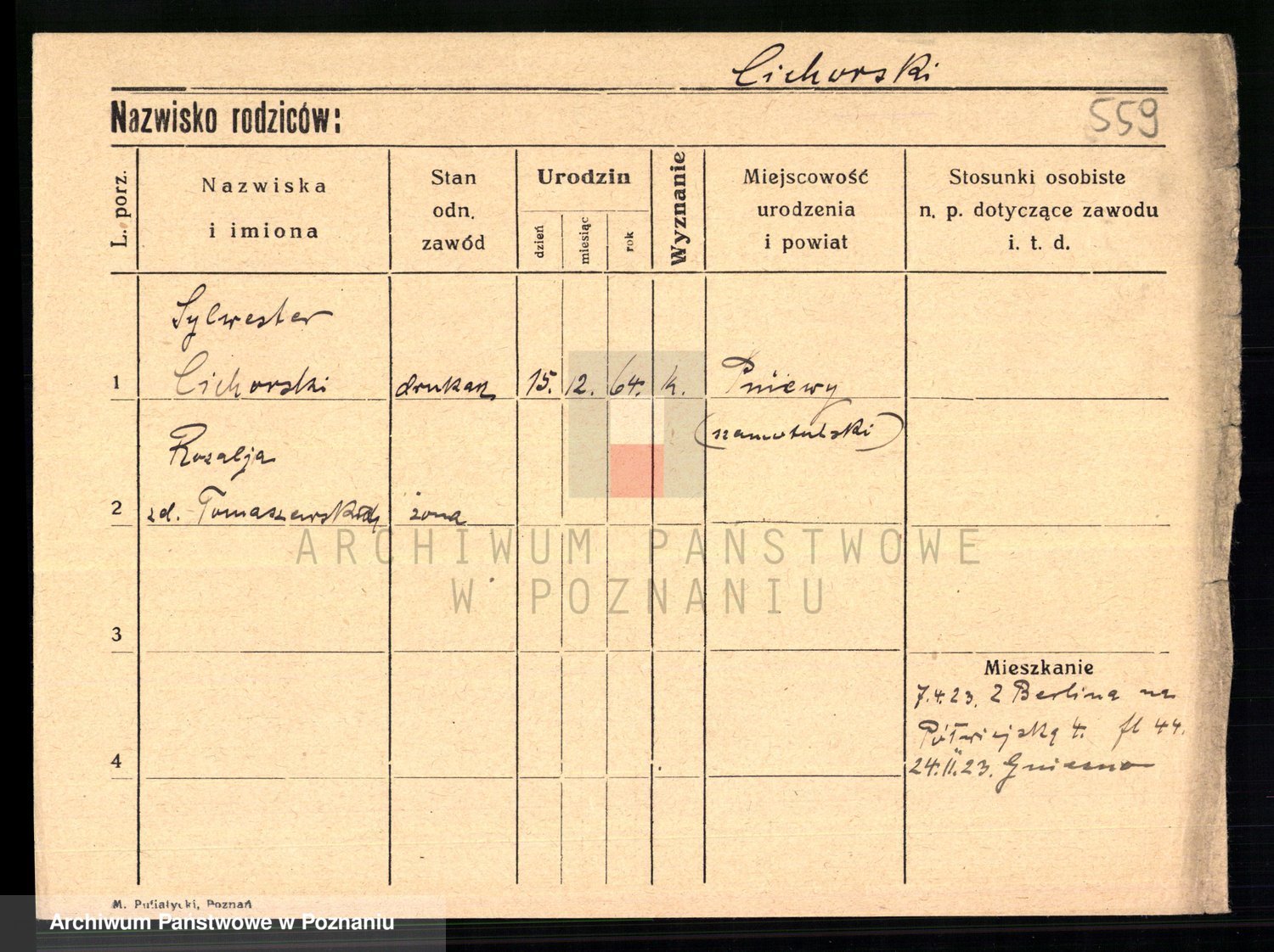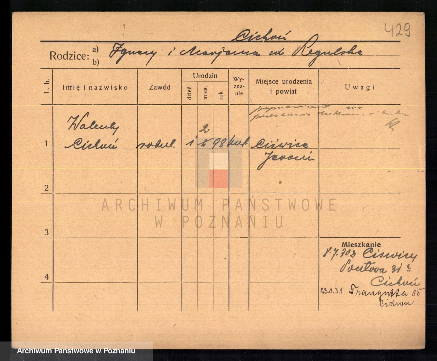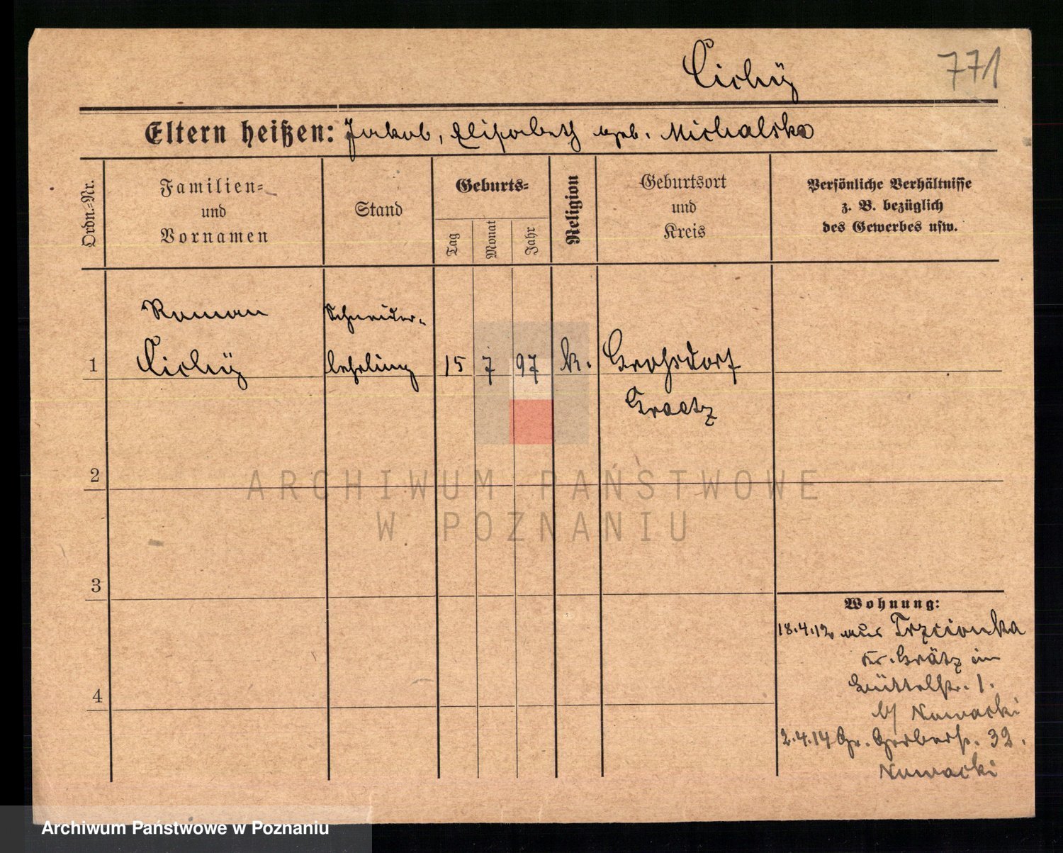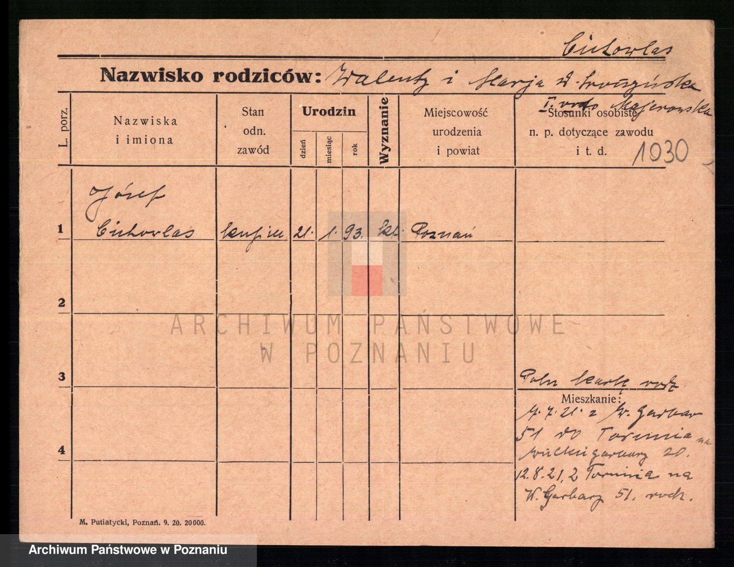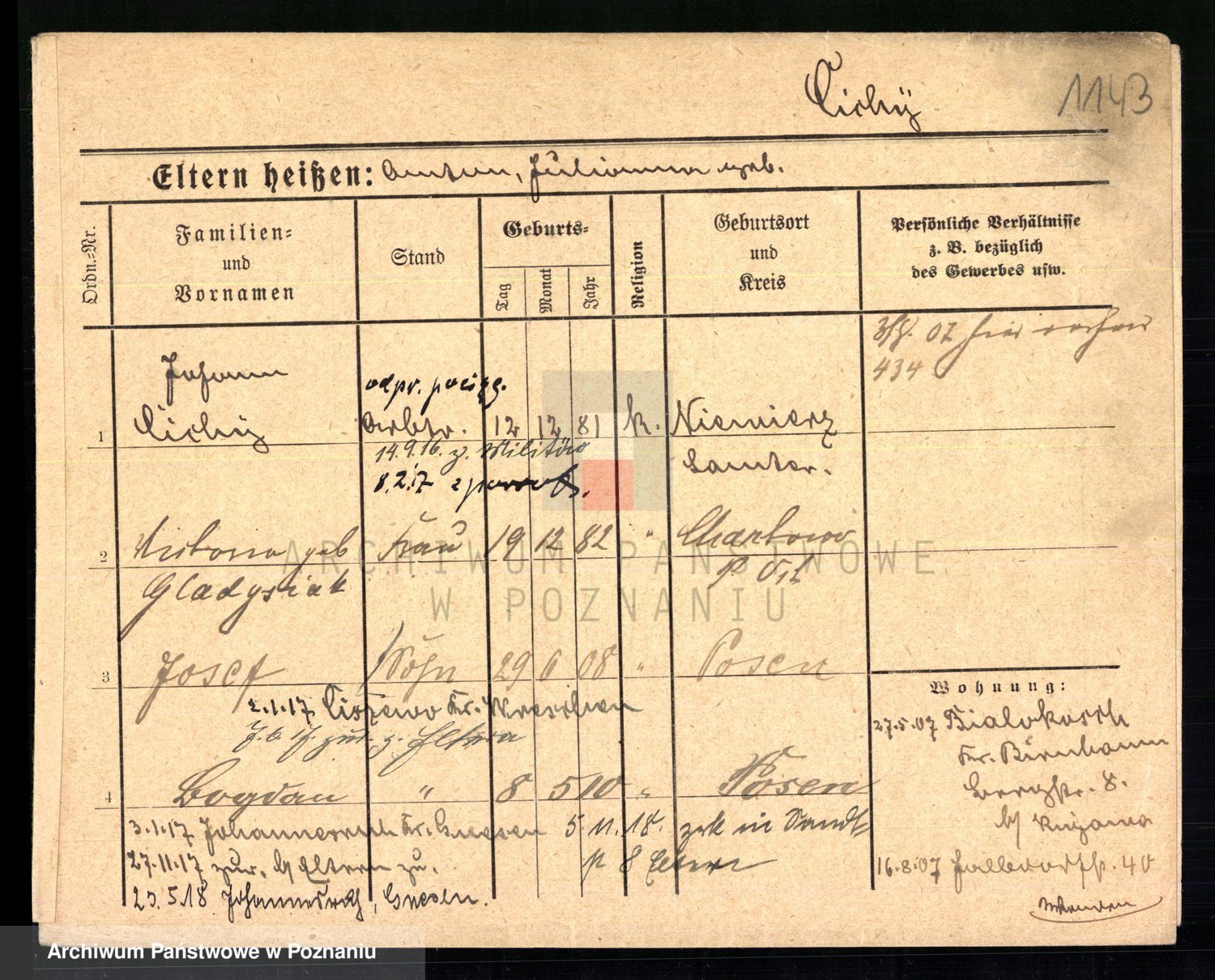 Podgląd karty osobowej dostępny jest po kliknięciu na nazwisko lub ikonkę karty. Można dokonywać powiększenia (ikony na górze) lub przechodzić między kolejnymi skanami (strzałki po bokach).