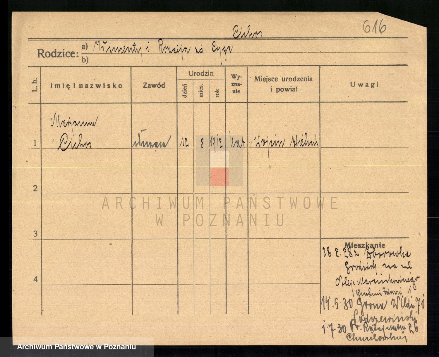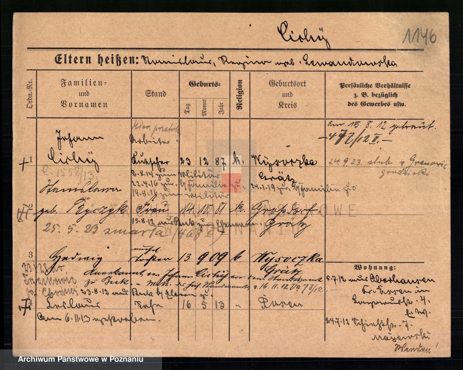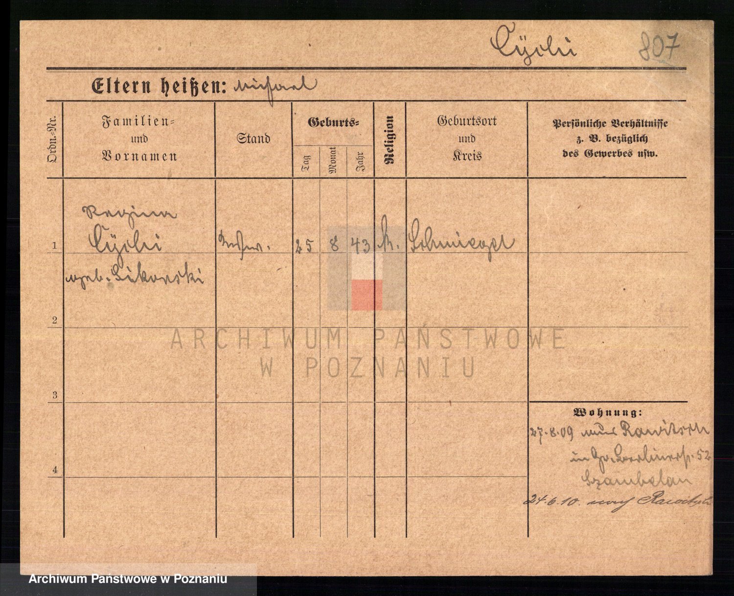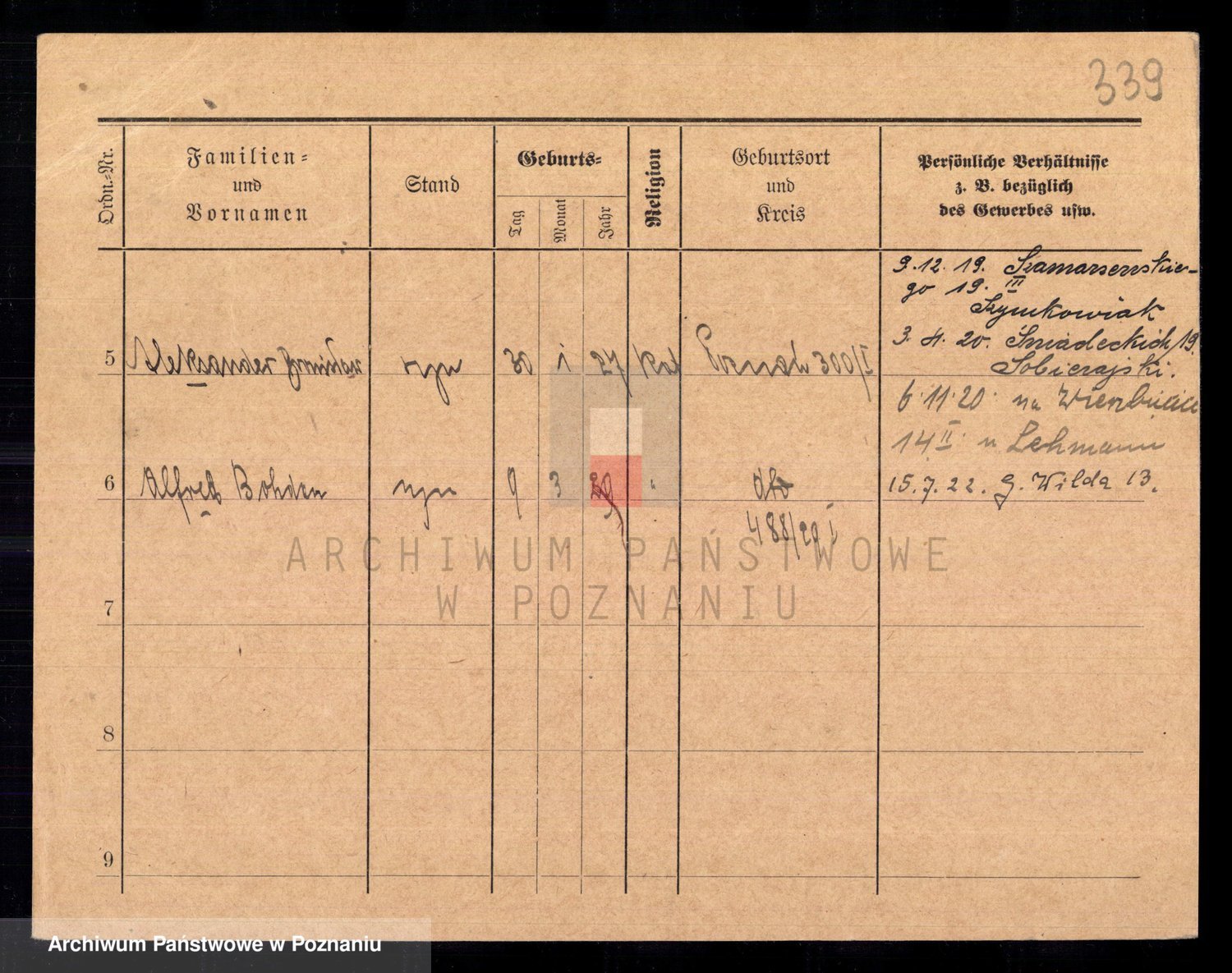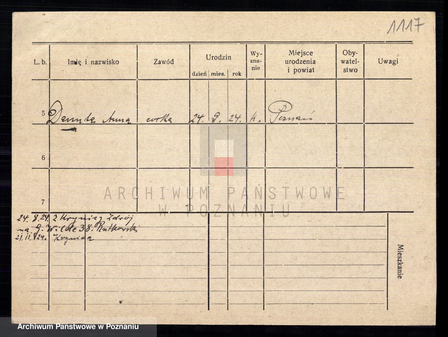 Podgląd karty osobowej dostępny jest po kliknięciu na nazwisko lub ikonkę karty. Można dokonywać powiększenia (ikony na górze) lub przechodzić między kolejnymi skanami (strzałki po bokach).