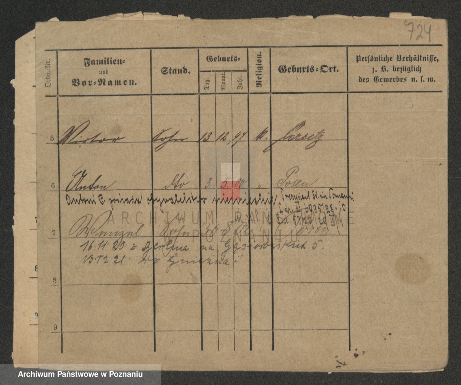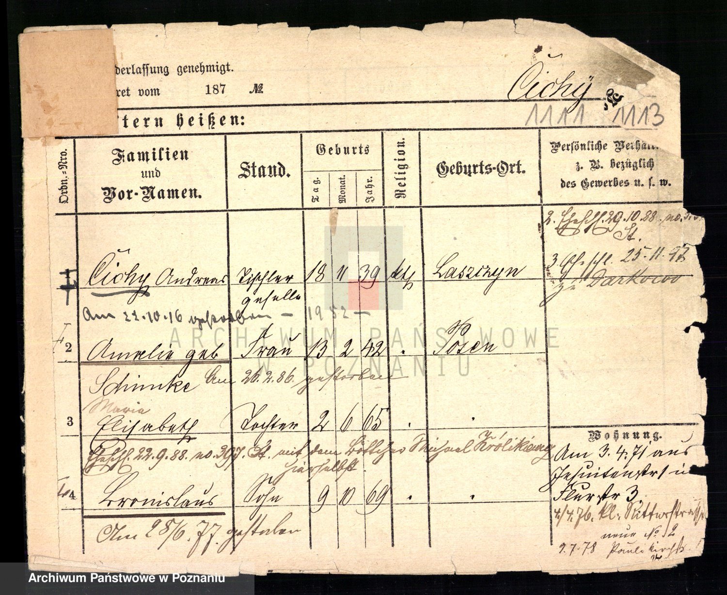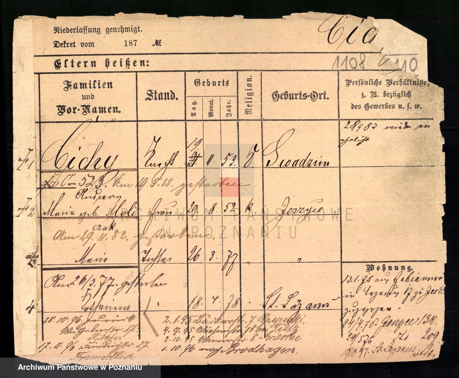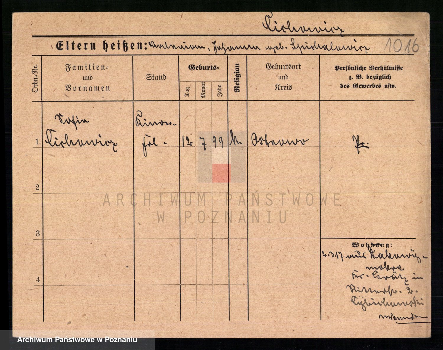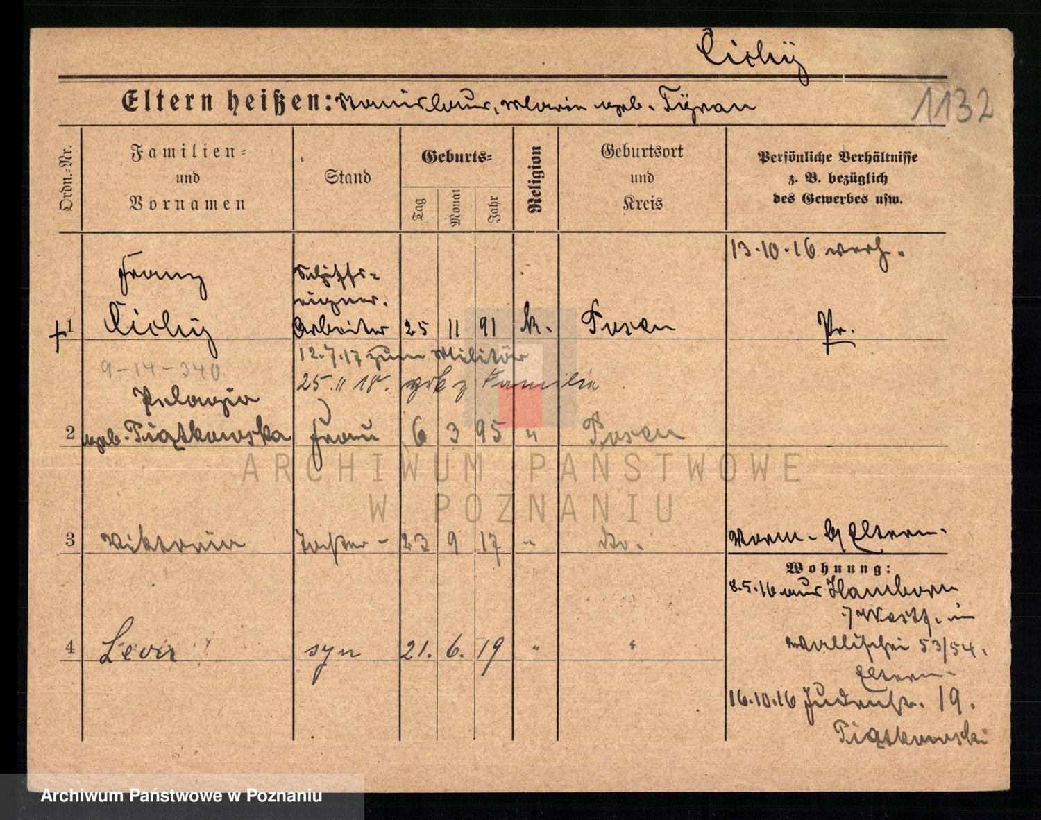 Podgląd karty osobowej dostępny jest po kliknięciu na nazwisko lub ikonkę karty. Można dokonywać powiększenia (ikony na górze) lub przechodzić między kolejnymi skanami (strzałki po bokach).