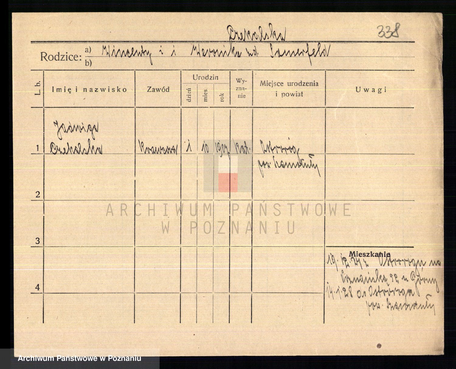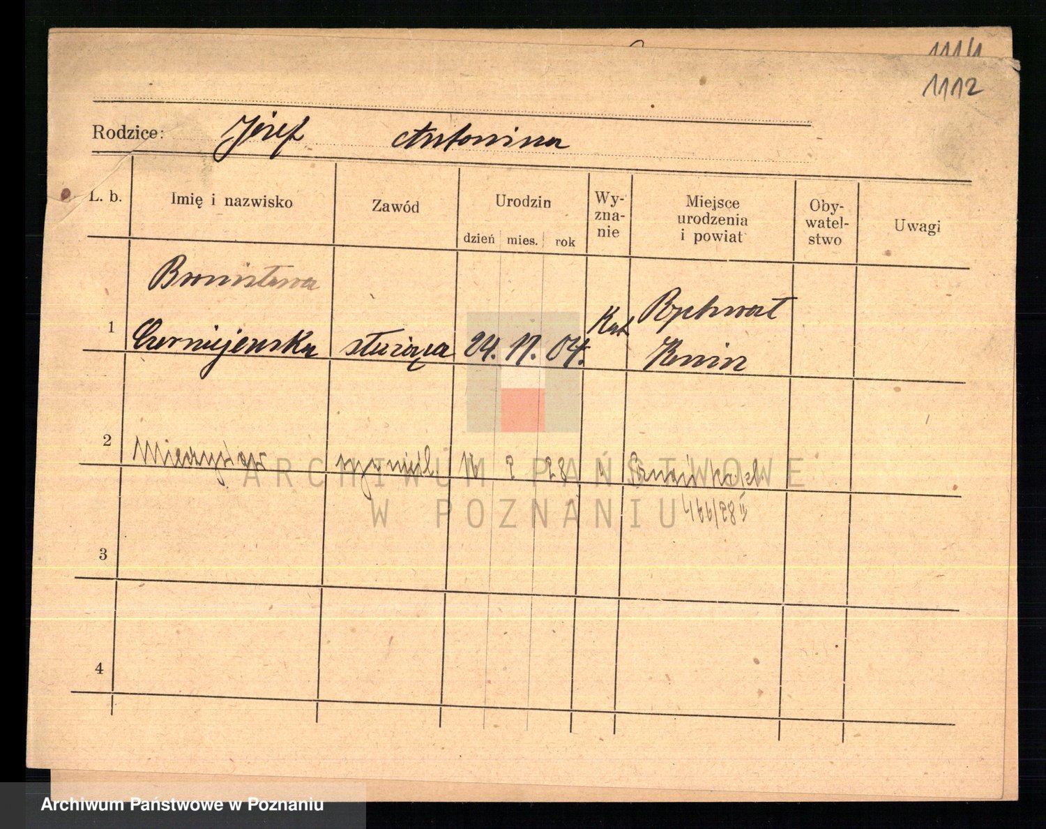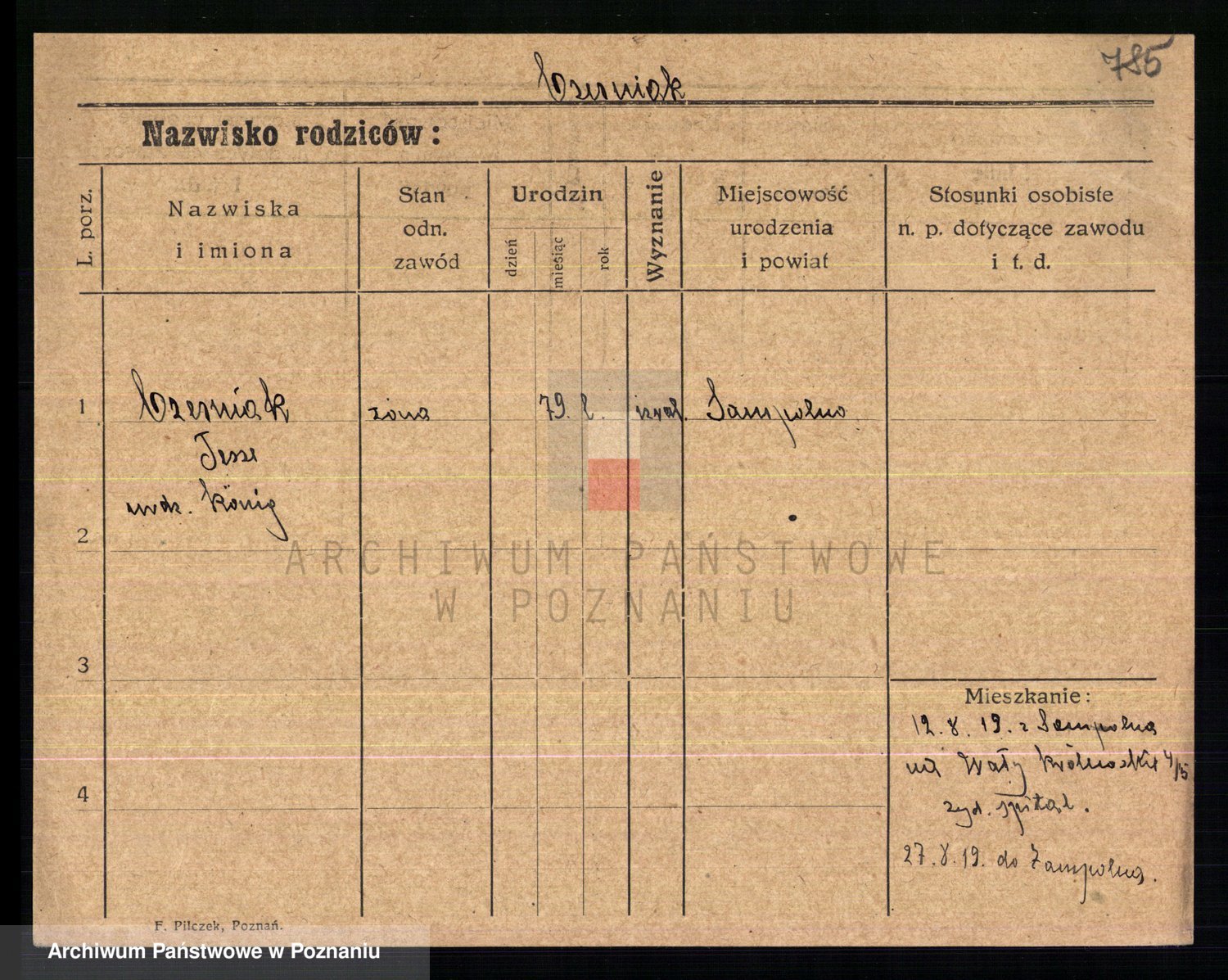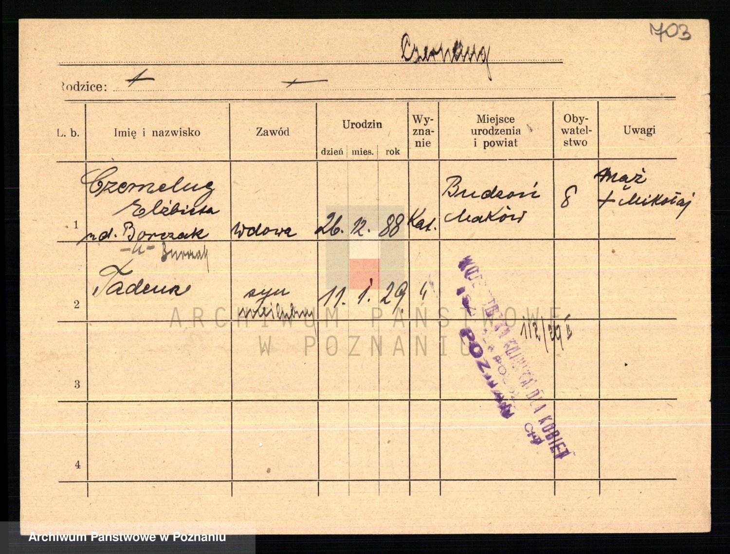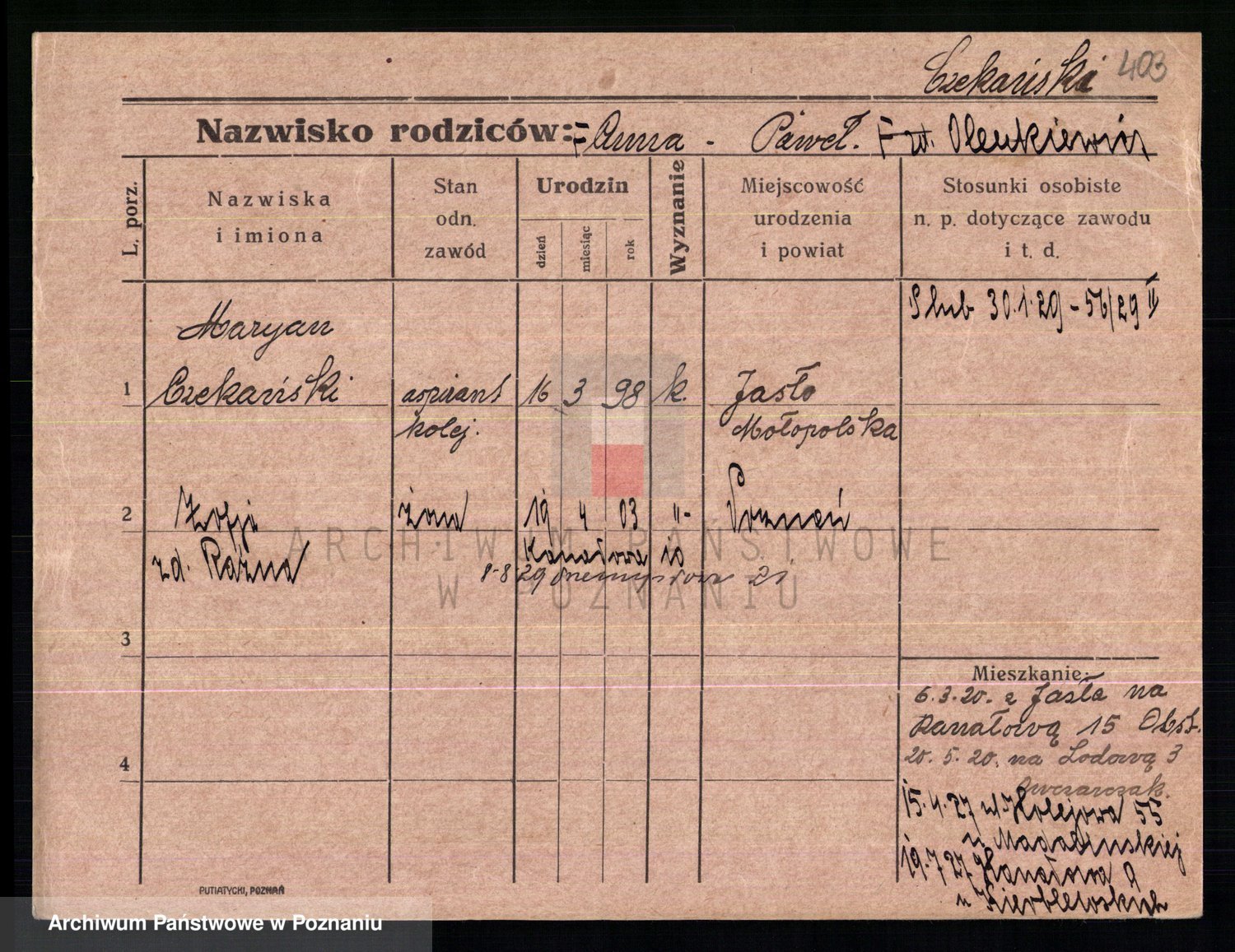 Podgląd karty osobowej dostępny jest po kliknięciu na nazwisko lub ikonkę karty. Można dokonywać powiększenia (ikony na górze) lub przechodzić między kolejnymi skanami (strzałki po bokach).