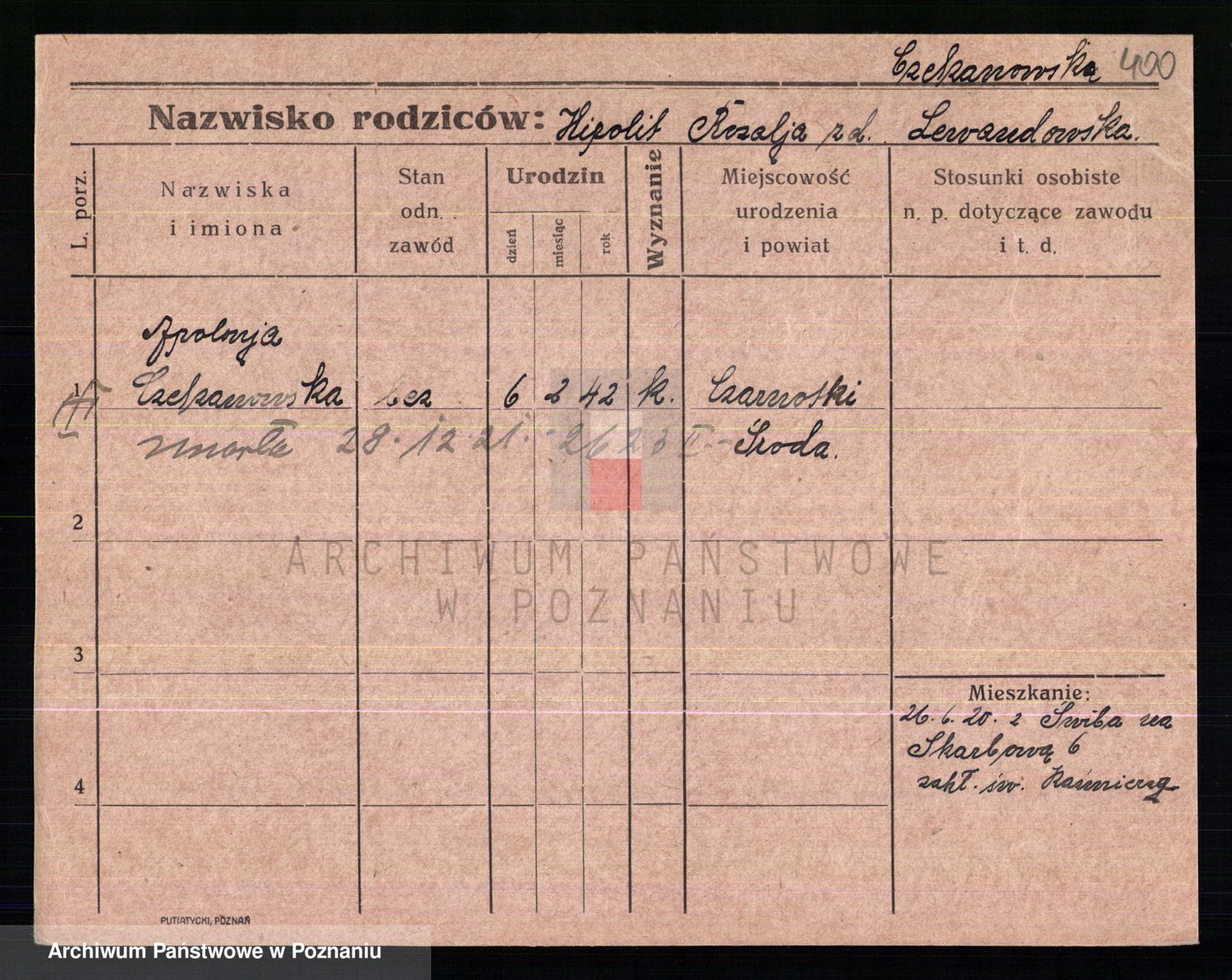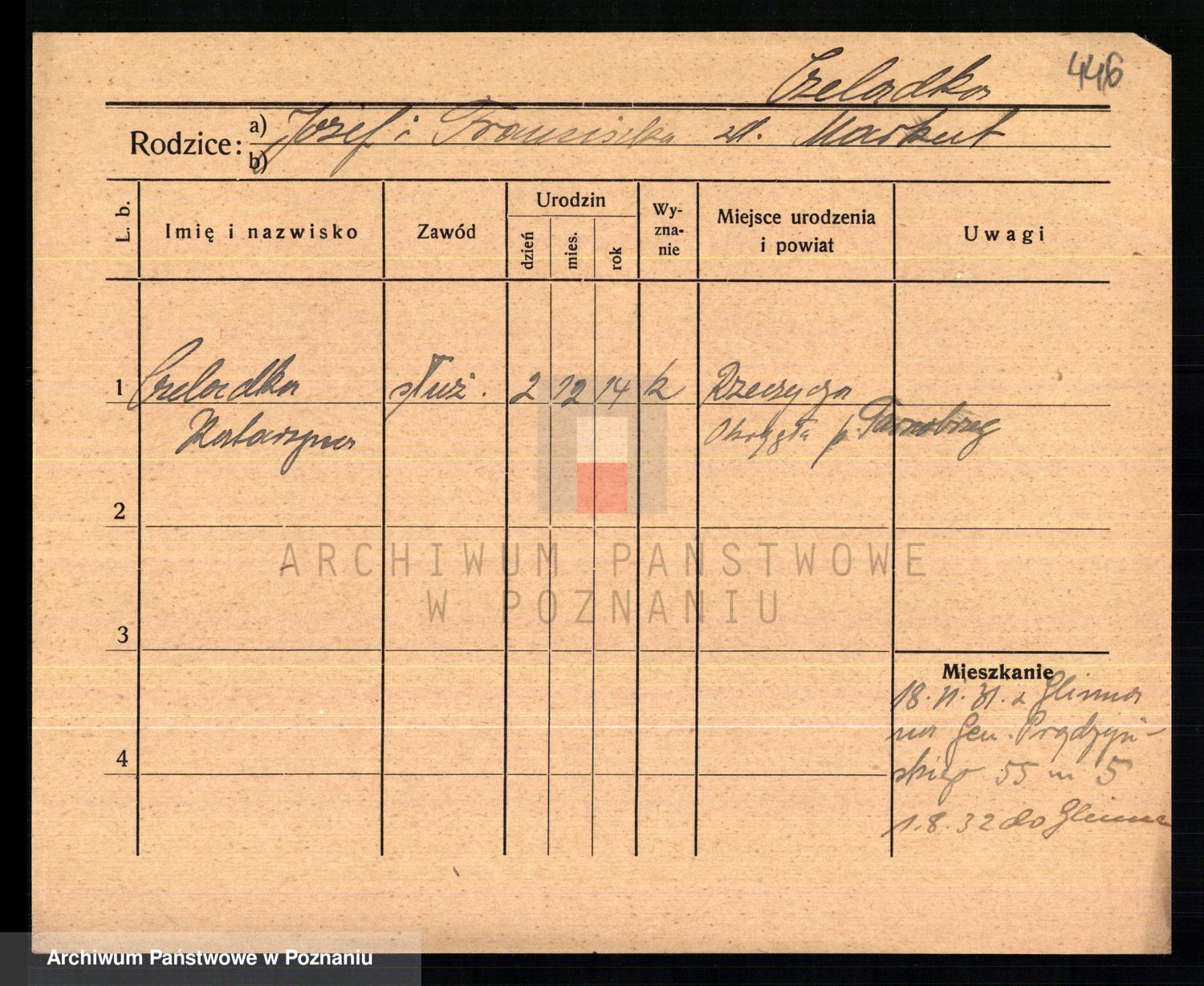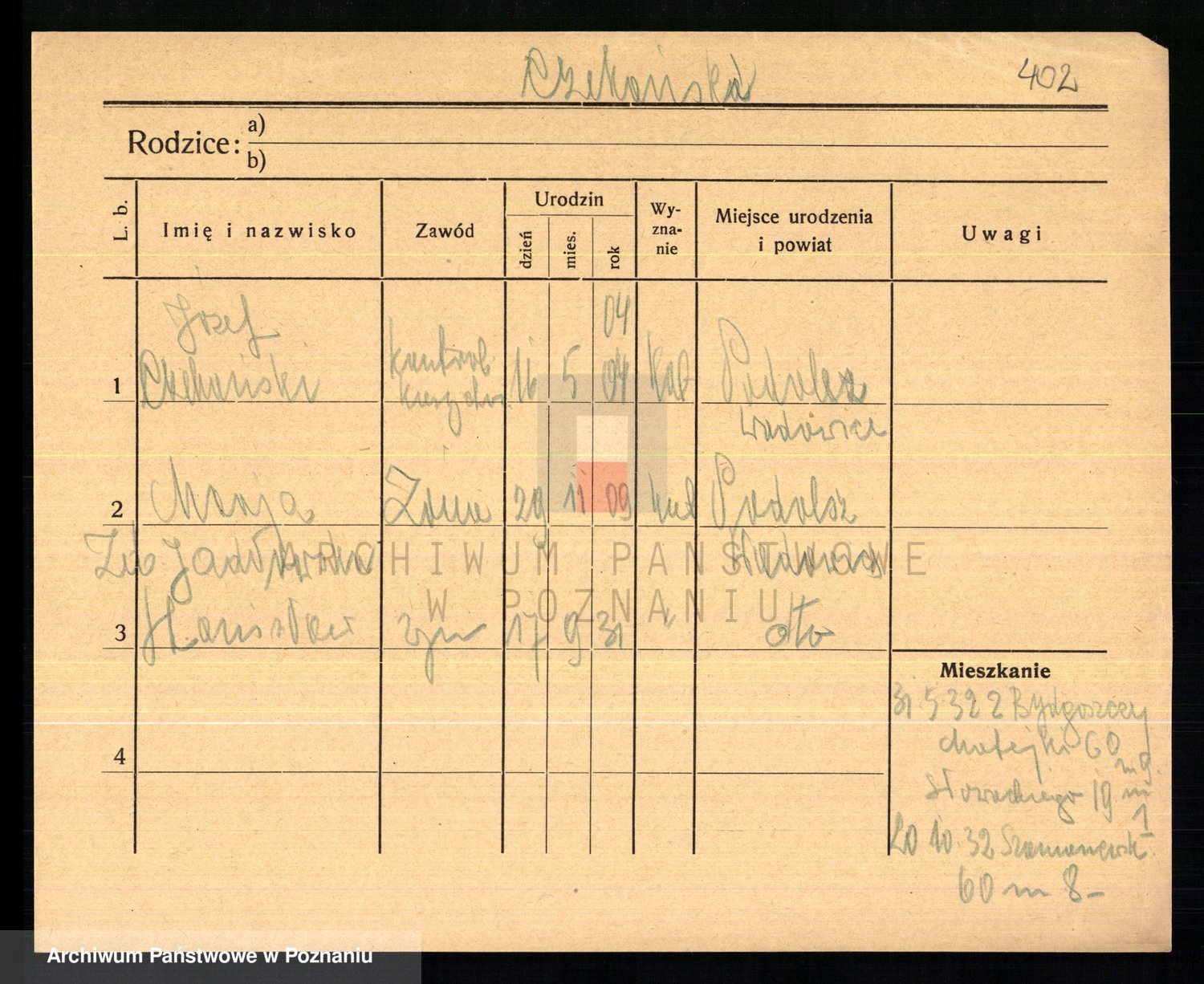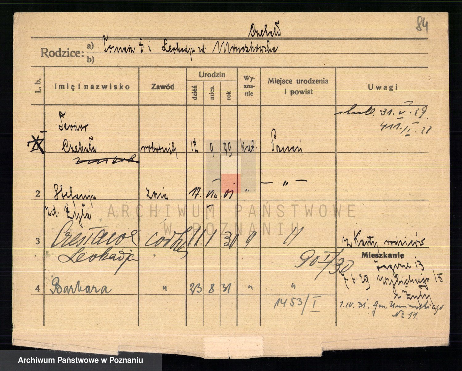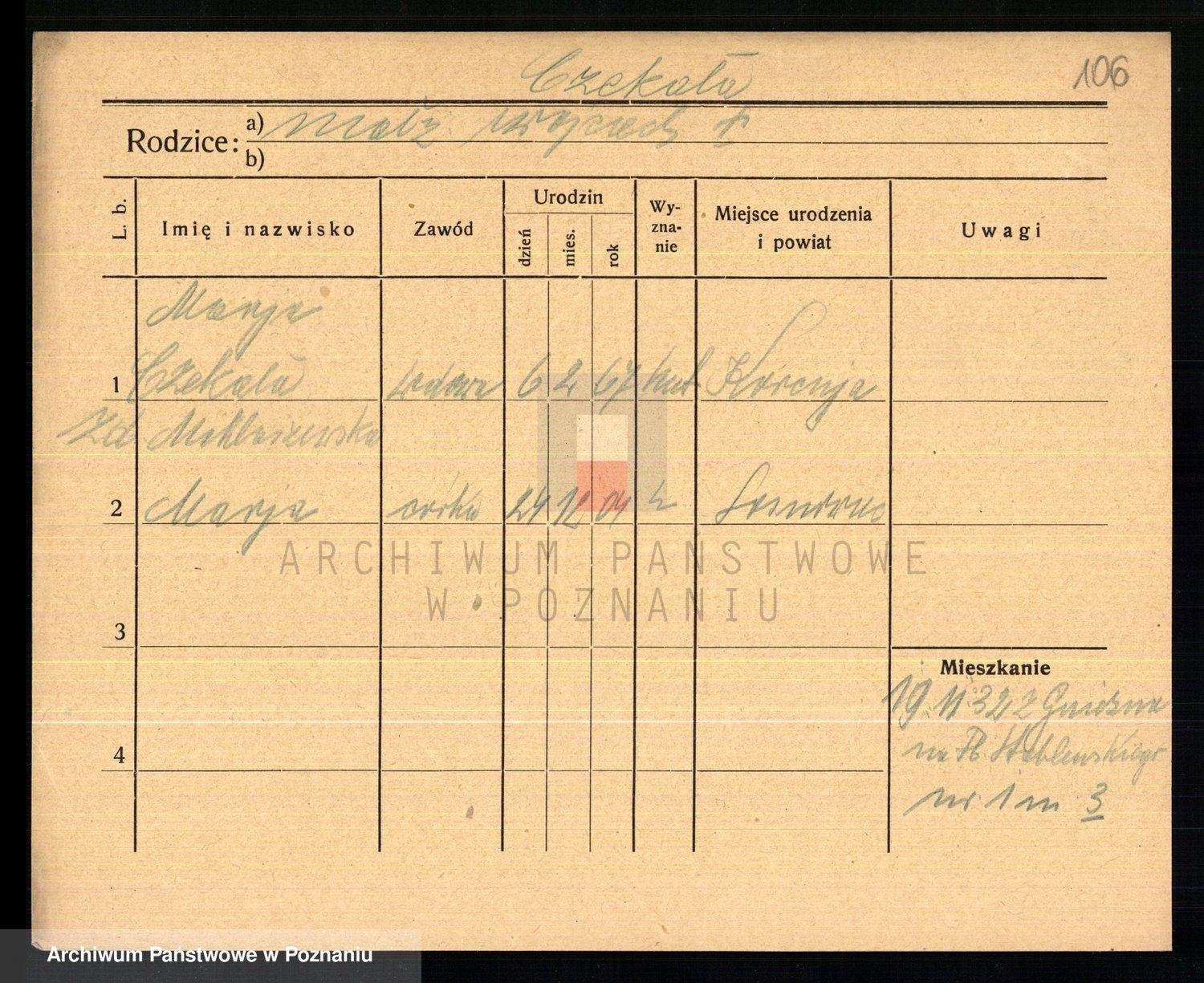 Podgląd karty osobowej dostępny jest po kliknięciu na nazwisko lub ikonkę karty. Można dokonywać powiększenia (ikony na górze) lub przechodzić między kolejnymi skanami (strzałki po bokach).