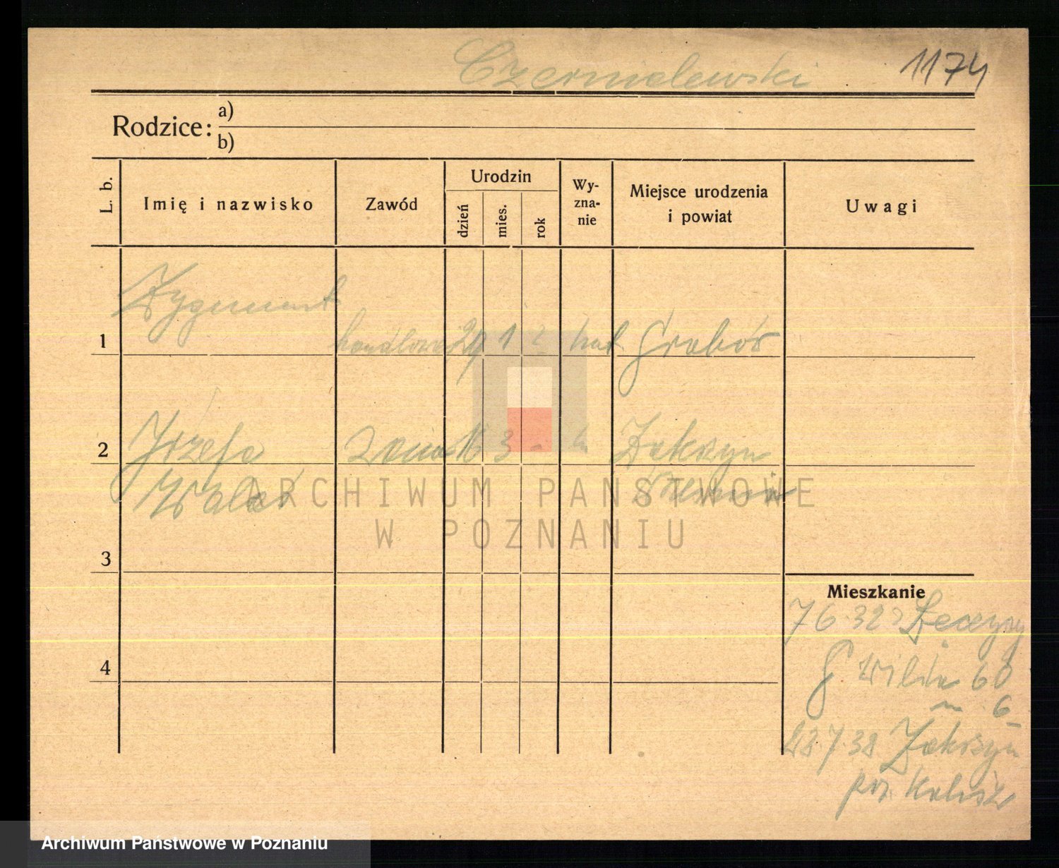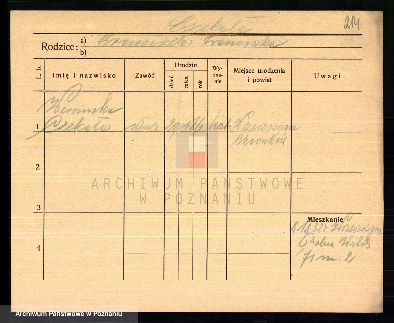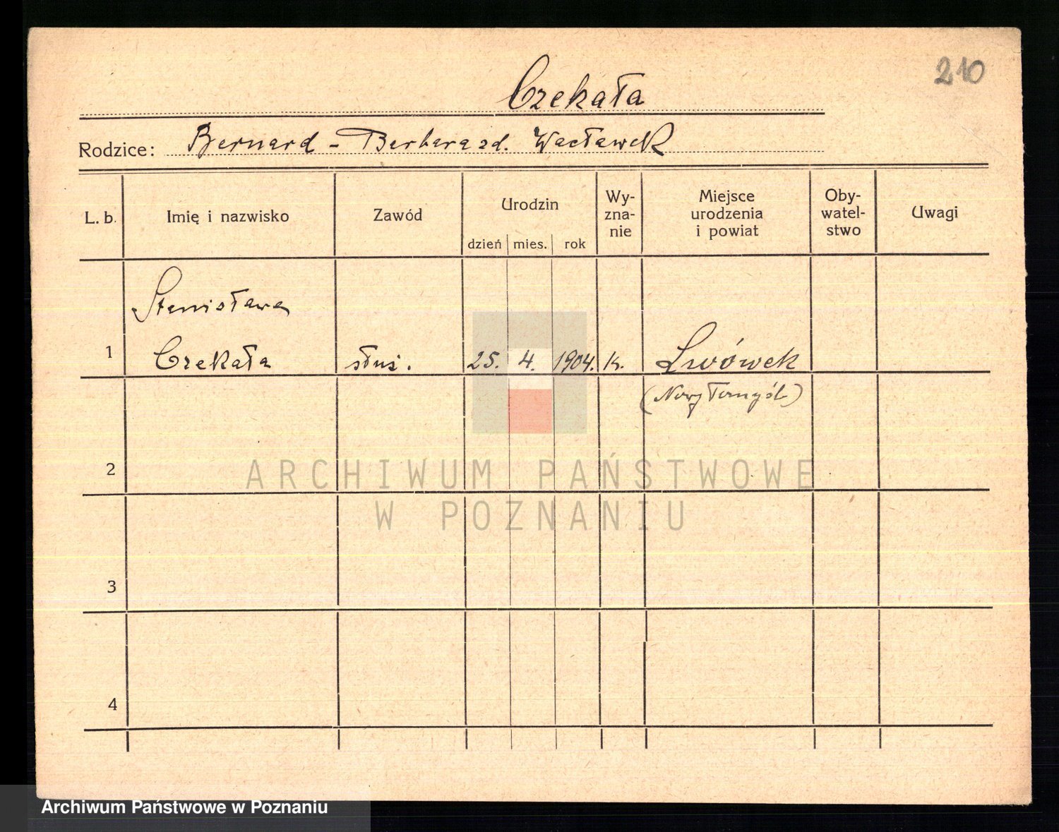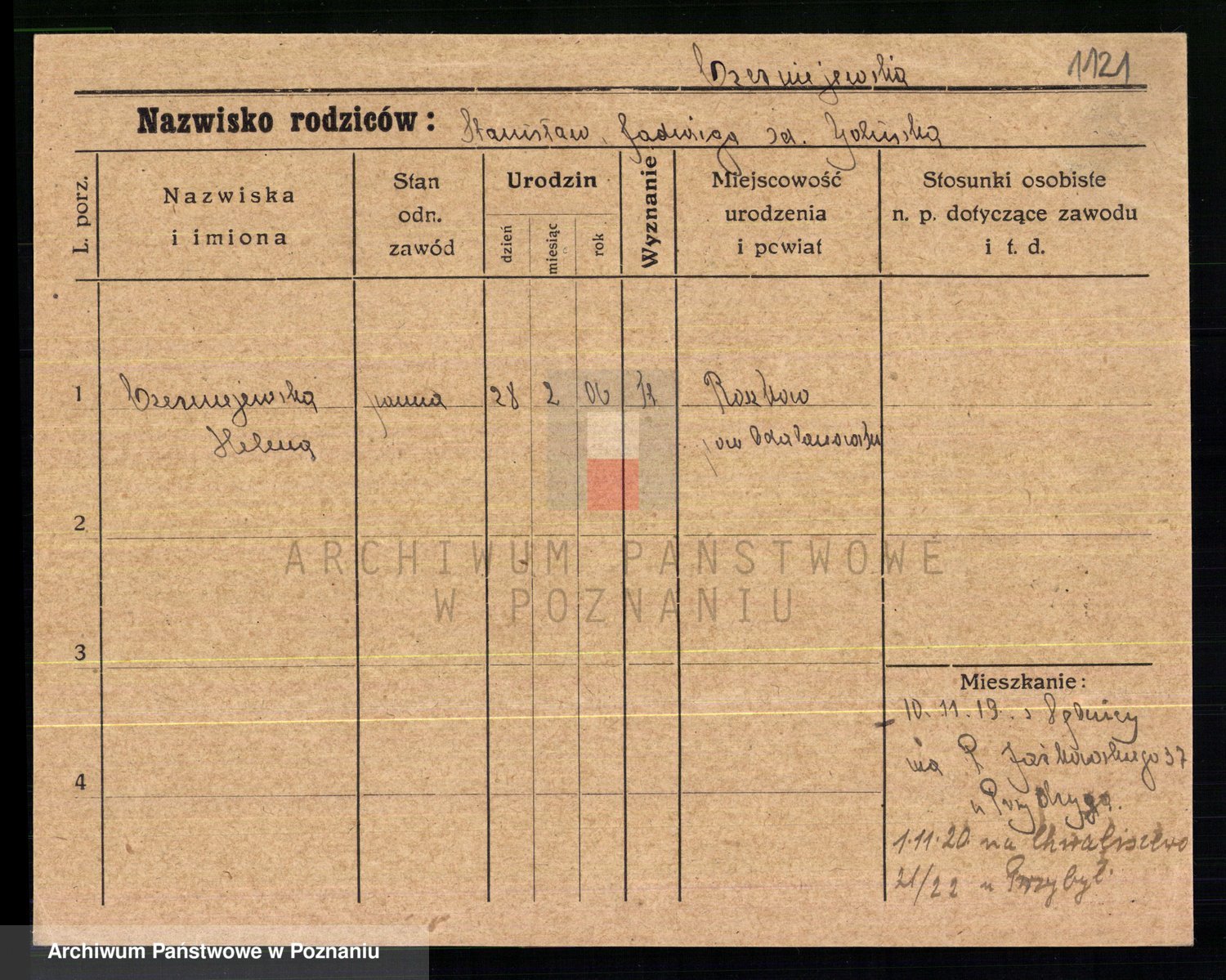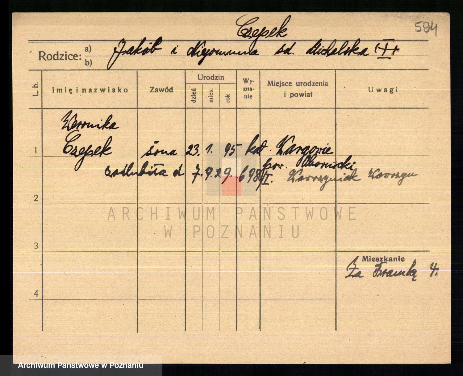 Podgląd karty osobowej dostępny jest po kliknięciu na nazwisko lub ikonkę karty. Można dokonywać powiększenia (ikony na górze) lub przechodzić między kolejnymi skanami (strzałki po bokach).