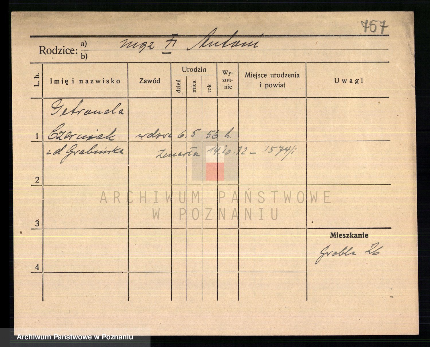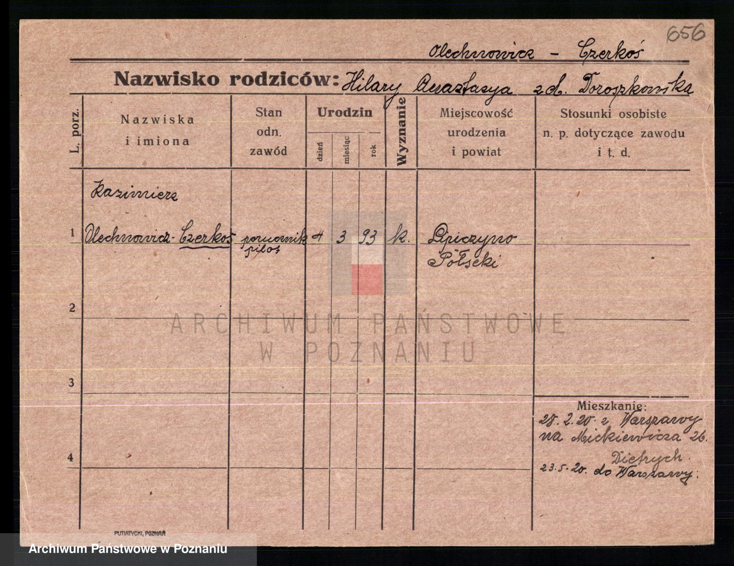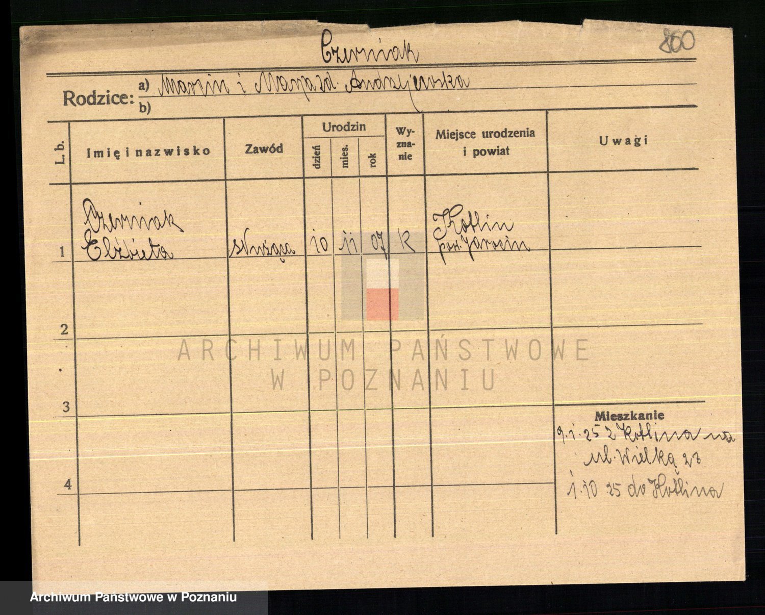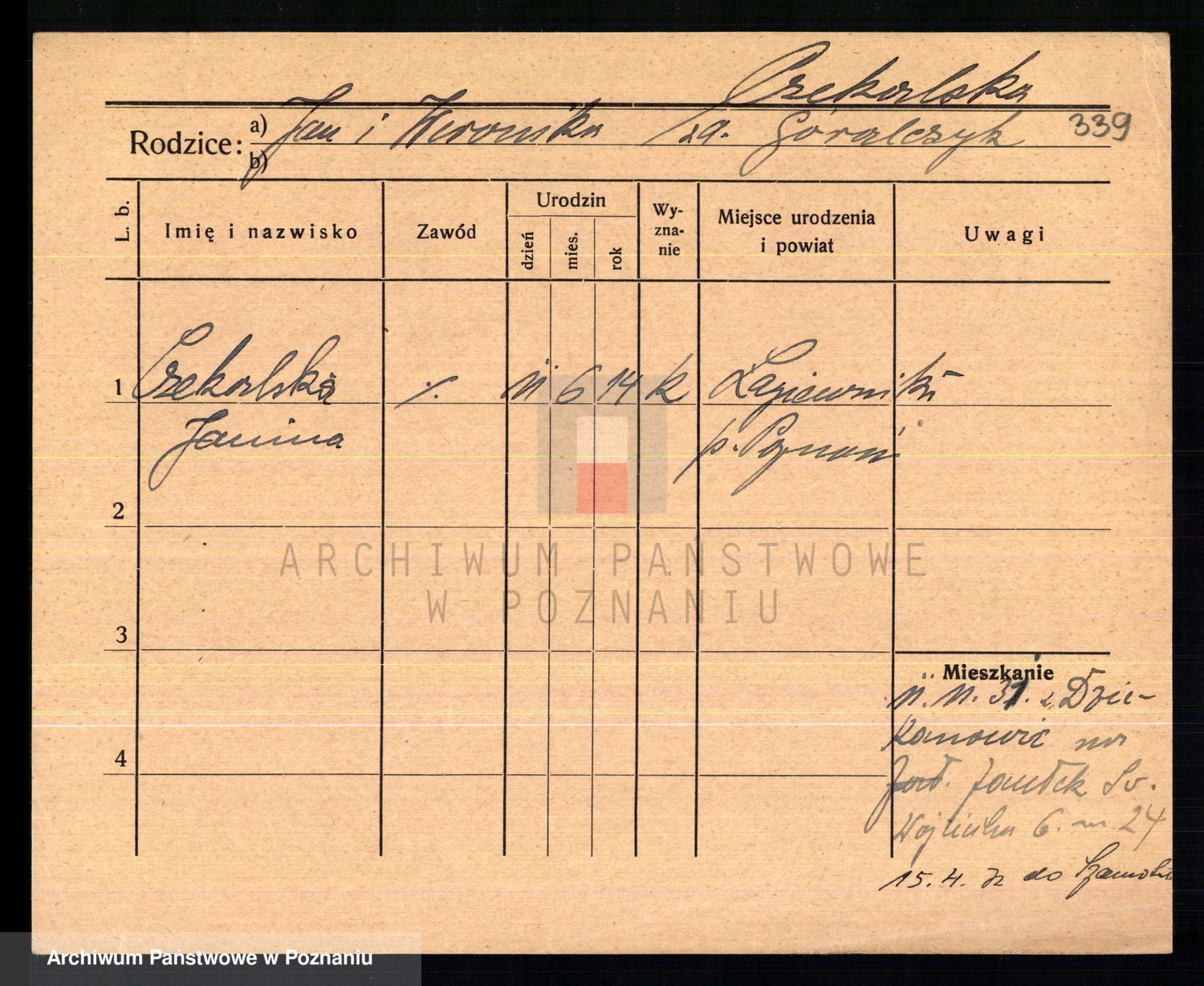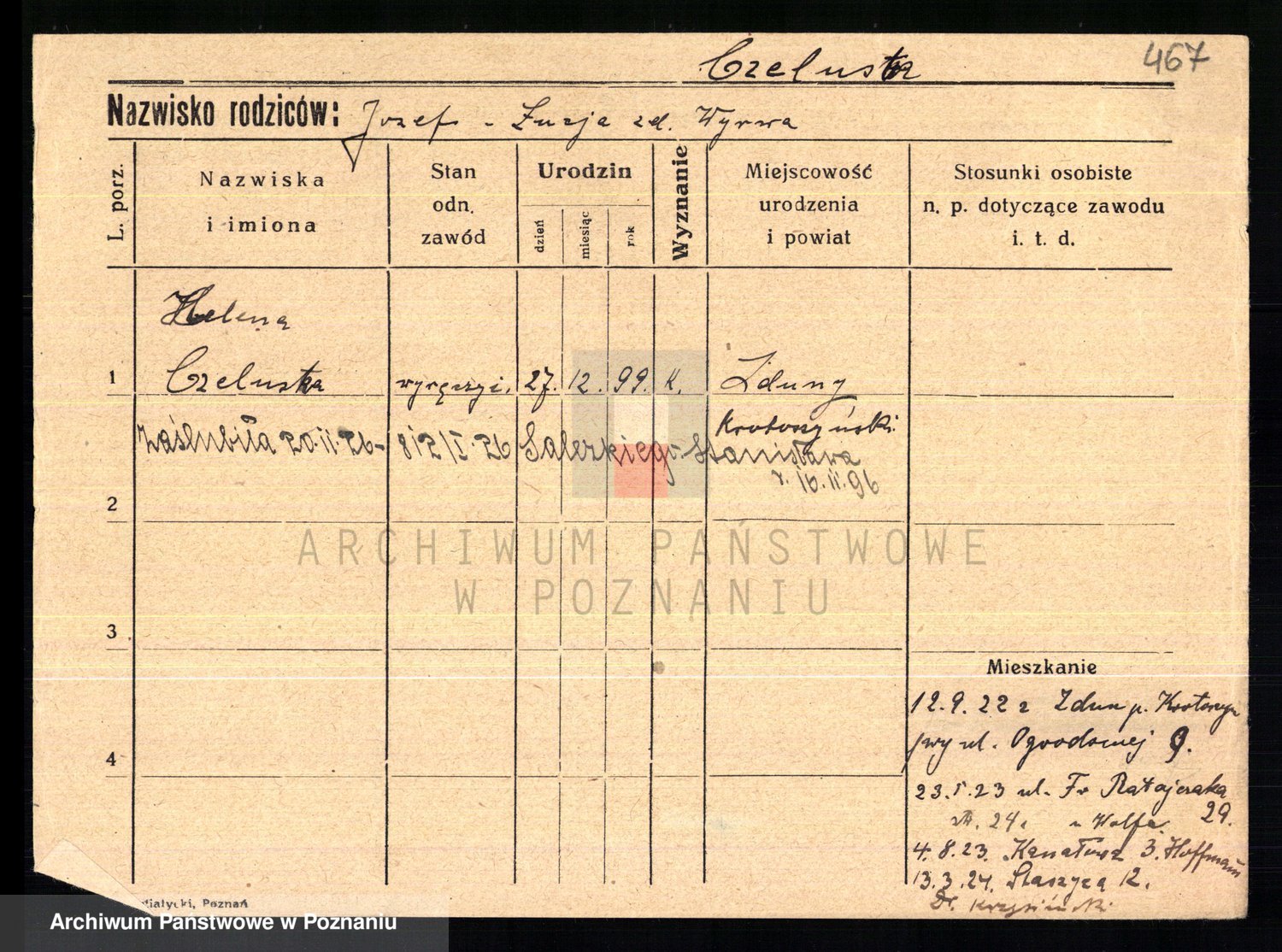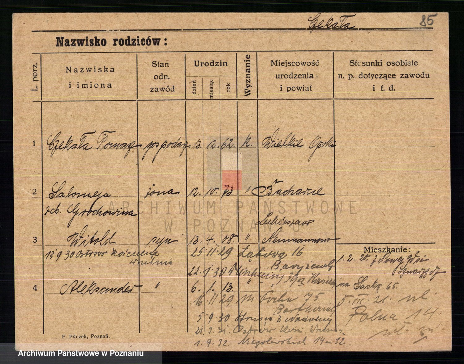 Podgląd karty osobowej dostępny jest po kliknięciu na nazwisko lub ikonkę karty. Można dokonywać powiększenia (ikony na górze) lub przechodzić między kolejnymi skanami (strzałki po bokach).
